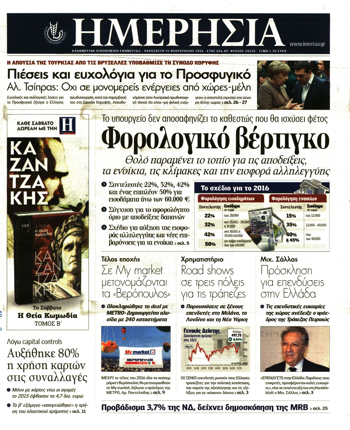 Οι οικονομικές εφημερίδες 19/2/2016 Enikos Newsroom 04:56, Παρασκευή 19 Φεβρουαρίου 2016 Media Διαβάστε τα σημερινά πρωτοσέλιδα των οικονομκών εφημερίδων: ΟΙΚΟΝΟΜΙΚΕΣ ΕΦΗΜΕΡΙΔΕΣ ΠΡΩΤΟΣΕΛΙΔΑ Μοιράσου το: σχολίασε κι εσύ (0 σχόλια) Ακολουθήστε το enikos.gr στο Google News και μάθετε πρώτοι όλες τις ειδήσεις Δείτε όλες τις τελευταίες ειδήσεις από την Ελλάδα και τον Κόσμο στο enikos.gr Ειδήσεις Ροή Ειδήσεων 55 λεπτά πριν Δίκη Βαλυράκη: Καταθέτει ο βασικός αυτόπτης μάρτυρας – «Δέχτηκα πιέσεις να μη μιλήσω, πήγα να ψωνίσω και αυτοκίνητο με χτύπησε στο πόδι» 2 ώρες πριν Γιώργος Μαζωνάκης: «Δεν ζήτησα χρήματα, παρά μόνο ηθική δικαίωση» – Οι πρώτες δηλώσεις του 22χρονου μετά την κατάθεση της μήνυσης 45 λεπτά πριν Ώρα αποφάσεων για τους αγρότες – Ξεκίνησε η πανελλαδική σύσκεψη μπλόκων στις Σέρρες – ΦΩΤΟ 5 ώρες πριν Συναγερμός και στην Ελλάδα για τη «σούπερ γρίπη»: Πόσο σοβαρή είναι και ποιοι θεωρούνται πιο ευάλωτοι – 3 ειδικοί μιλούν στο enikos.gr 2 ώρες πριν Γαλλία: Η οργή των αγροτών – Αναμένεται η ομιλία του Μακρόν, τα τρακτέρ συγκεντρώνονται μαζικά στις Βρυξέλλες 6 ώρες πριν Τα 4 ζώδια που λαμβάνουν ένα ισχυρό σημάδι από το σύμπαν – «Αποκαλύπτεται κάτι που μπορεί να αλλάξει τη ζωή μας» 5 ώρες πριν Αν κάνετε συνεχώς αυτά τα 8 πράγματα με τα κατοικίδιά σας, σας λείπει η ανθρώπινη επαφή 1 ώρα πριν Αυτό που κρύβεται κάτω από τη Γροιλανδία θα μπορούσε να ανατρέψει όσα γνωρίζουμε για την άνοδο της στάθμης των θαλασσών 1 ημέρα πριν 20 χρόνια τα Χριστούγεννα ξεκινούν στα Public με μεγάλη ποικιλία σε δώρα! 4 λεπτά πριν Ευλογιά αιγοπροβάτων: Νέες αποζημιώσεις ύψους 26 εκατ. ευρώ σε κτηνοτρόφους – Η κατανομή ανά Περιφέρεια 8 λεπτά πριν Το Σπίτι Δίπλα Στο Ποτάμι: Το καθηλωτικό τελευταίο επεισόδιο για το 2025 απόψε στις 22:30 13 λεπτά πριν Βραζιλία: Νεκρή 25χρονη influencer που έπεσε από τον 10ο όροφο έπειτα από καβγά με τον σύζυγό της – Συνελήφθη ο 40χρονος – ΒΙΝΤΕΟ-σοκ 17 λεπτά πριν Μεσολόγγι: Εγκατέλειψαν κουτάβια δίπλα από αυλάκι – Τα έσωσε η Πυροσβεστική – ΒΙΝΤΕΟ 22 λεπτά πριν Τσουκαλάς: Η κυβέρνηση του «δεν ξέρω-δεν είδα-δεν άκουσα» νομίζει ότι θα βυθιστεί σε αμνησία όλη η ελληνική κοινωνία για το σκάνδαλο στον ΟΠΕΚΕΠΕ ENIKOS NETWORK 100 χρόνια ΠΙΣ: Ένας αιώνας προσφοράς στην Ιατρική και την κοινωνία Ένα ποτήρι την ημέρα από αυτόν τον χυμό μειώνει τη χοληστερίνη, τη φλεγμονή και την πίεση Αυτόματη απόδοση ΦΠΑ: Τα δύο σενάρια που επεξεργάζεται η ΑΑΔΕ ΑΑΔΕ: Έρχεται το… ΔΕΟΣ – Όλες οι λεπτομέρειες για τον ενιαίο ελεγκτικό μηχανισμό για το οικονομικό έγκλημα Χαρτογραφώντας το «σημείο χωρίς επιστροφή»: Για πρώτη φορά αποκαλύπτεται με λεπτομέρεια το ακανθώδες όριο της ατμόσφαιρας τ... Η Google καταργεί τη λειτουργία «dark web report» – Πώς θα μπορούν οι χρήστες να διαγράφουν τα δεδομένα τους περισσότερα 15:52 , Πέμπτη 18 Δεκεμβρίου 2025 Το Σπίτι Δίπλα Στο Ποτάμι: Το καθηλωτικό τελευταίο επεισόδιο για το 2025 απόψε στις 22:30 Καθηλώνει το σημερινό επεισόδιο της σειράς “Το Σπίτι Δίπλα Στο Ποτάμι” που έρχεται... 15:20 , Πέμπτη 18 Δεκεμβρίου 2025 Άγιος έρωτας – Η Ελευθερία Αρβανιτάκη τραγουδά και ο Γιάννης Τσορτέκης καθηλώνει με τον χορό του Ο Κλεάνθης χορεύει στους ήχους της Ελευθερίας Αρβανιτάκη στη σειρά “Άγιος Έρωτας“.... 08:00 , Πέμπτη 18 Δεκεμβρίου 2025 Την Κυριακή με τη Realnews: Δωροεπιταγή 10€ Δωροεπιταγή αξίας 10€ για αγορές άνω των 60€ από τα πολυκαταστήματα FactoryOutlet H προσφορά ι... 07:50 , Πέμπτη 18 Δεκεμβρίου 2025 «Το σόι σου»: Backstage στα γυρίσματα για το εορτα