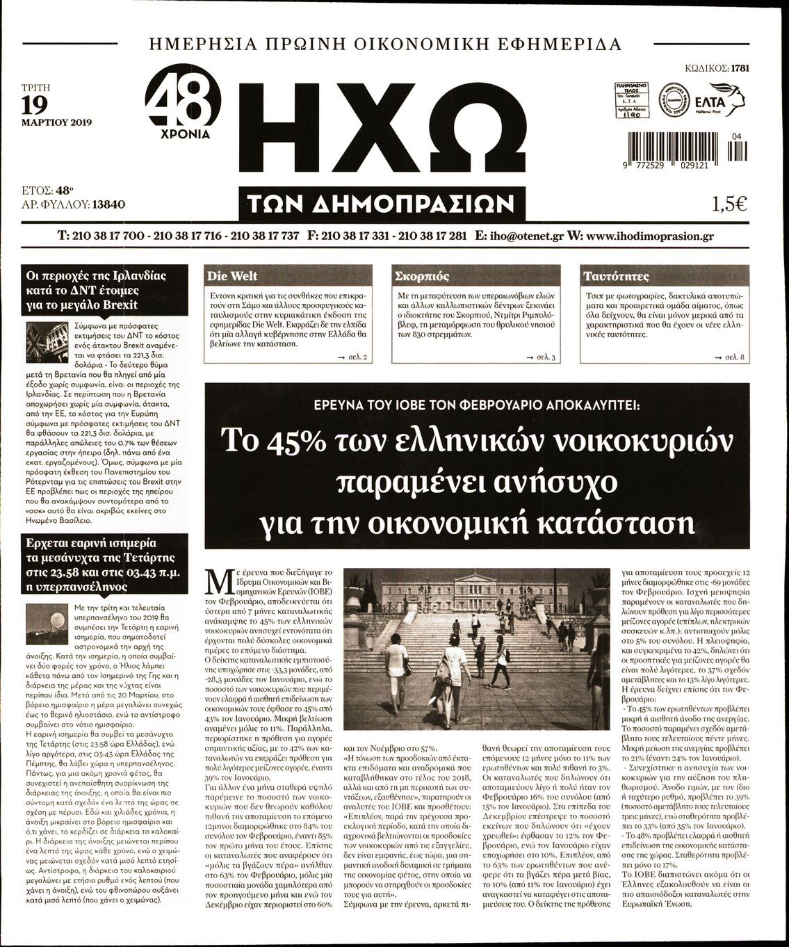 Οι οικονομικές εφημερίδες 19/3/2019 Enikos Newsroom 06:54, Τρίτη 19 Μαρτίου 2019 Media Διαβάστε τα πρωτοσέλιδα των οικονομικών εφημερίδων: ΟΙΚΟΝΟΜΙΚΕΣ ΕΦΗΜΕΡΙΔΕΣ ΠΡΩΤΟΣΕΛΙΔΑ Μοιράσου το: σχολίασε κι εσύ (0 σχόλια) Ακολουθήστε το enikos.gr στο Google News και μάθετε πρώτοι όλες τις ειδήσεις Δείτε όλες τις τελευταίες ειδήσεις από την Ελλάδα και τον Κόσμο στο enikos.gr Ειδήσεις Ροή Ειδήσεων 1 ώρα πριν Ευρωπαϊκή Ένωση: Συμφωνία για δάνειο 90 δισ. ευρώ στην Ουκρανία τη διετία 2026-2027 6 ώρες πριν ΟΠΕΚΕΠΕ: Προφυλακιστέος ο φερόμενος αρχηγός και ο λογιστής της εγκληματικής οργάνωσης 7 ώρες πριν Αυξάνουν την πίεση προς την κυβέρνηση οι αγρότες: Κλείνουν παρακαμπτήριους και ανοίγουν διόδια – Τι θα γίνει τις γιορτές 7 ώρες πριν Φοινικούντα: Το Σάββατο απολογείται ο 30χρονος γιος γνωστού επιχειρηματία της Πλάκας που παραδόθηκε – Όσα είπε στους αστυνομικούς και ο ρόλος του στο έγκλημα 5 ώρες πριν ΑΕΚ – Κραϊόβα 3-2: Επική ανατροπή και πρόκριση στους «16» του Conference League η Ένωση 6 ώρες πριν Αρχαιολόγοι ανακάλυψαν ρωμαϊκά τεχνουργήματα από μια πόλη που δεν υπήρξε ποτέ – Τα τρία εντυπωσιακά κτίρια και ο αμφορέας με τις… σαρδέλες 7 ώρες πριν Ύπνος: Η απλή βραδινή ρουτίνα για να προστατεύσετε τα μαλλιά σας από το κρύο κατά τη διάρκεια του χειμώνα 8 ώρες πριν Manifesting: Πώς να συναντήσετε τον σύντροφο της ζωής σας, ανάλογα με τον μήνα γέννησής σας 2 ημέρες πριν 20 χρόνια τα Χριστούγεννα ξεκινούν στα Public με μεγάλη ποικιλία σε δώρα! 7 λεπτά πριν Η TikTok στις ΗΠΑ πωλείται σε Oracle, Silver Lake και MGX – Οι λεπτομέρειες του «deal» 15 λεπτά πριν Αλεξάντερ Λουκασένκο: Η Λευκορωσία βρίσκεται κοντά στην αποκατάσταση των σχέσεών της με τις ΗΠΑ 30 λεπτά πριν Αυστραλία: Κήρυξε την Κυριακή (21/12) ημέρα εθνικού πένθους για τη φονική επίθεση στην παραλία Μπόνταϊ 40 λεπτά πριν Ρόδος: Δάσκαλος καράτε καταδικάστηκε για ασέλγεια σε ανήλικες αθλήτριες – Μαρτυρίες για αγγίγματα σε ευαίσθητα σημεία 55 λεπτά πριν Γουατεμάλα: Εξαρθρώθηκε κύκλωμα διακίνησης μεταναστών προς τις ΗΠΑ – Συνελήφθησαν 14 άτομα ENIKOS NETWORK Σε περίοδο αυξημένης δραστηριότητας η γρίπη στην Ελλάδα-Μέτρα προστασίας από τον ΕΟΔΥ Σκέφτεστε συνέχεια συζητήσεις που έχετε κάνει; Τι σημαίνει αυτό, σύμφωνα με ειδικό Στεγαστικό: Τι λέει η ΠΟΜΙΔΑ για τα νέα μέτρα που ανακοίνωσε ο Κυριάκος Μητσοτάκης Λαγκάρντ: Αισιόδοξη για την ανάπτυξη της Ευρωζώνης, αβέβαιη για τον πληθωρισμό Χαρτογραφώντας το «σημείο χωρίς επιστροφή»: Για πρώτη φορά αποκαλύπτεται με λεπτομέρεια το ακανθώδες όριο της ατμόσφαιρας τ... Η Google καταργεί τη λειτουργία «dark web report» – Πώς θα μπορούν οι χρήστες να διαγράφουν τα δεδομένα τους περισσότερα 02:50 , Παρασκευή 19 Δεκεμβρίου 2025 GNTM: «Κλείδωσαν» οι τέσσερις φιναλίστ – Μεγάλη ανατροπή στις τελευταίες αποχωρήσεις Για προτελευταία φορά εμφανίστηκαν στο πλατό του GNTM οι φιναλίστ του φετινού κύκλου, το βράδυ... 17:45 , Πέμπτη 18 Δεκεμβρίου 2025 ROUK ZOUK: Εορταστικό επεισόδιο με καλεσμένους τους πρωταγωνιστές του «Γιατί ρε πατέρα» Το Σάββατο 20 Δεκεμβρίου στις 21:00, η Ζέτα Μακρυπούλια υποδέχεται εκλεκτούς ηθοποιούς που όλο... 17:20 , Πέμπτη 18 Δεκεμβρίου 2025 Άγιος έρωτας: Η Χριστίνα εξομολογείται στον πατέρα Νικόλαο, απόψε στις 21:00 στον Alpha Η Νότα αποφασίζει να εκδικηθεί τον Πέτρο και τον Στέφανο, για χάρη του Λούη, όμως τα πράγματα ... 16:50 , Πέμπτη 18 Δεκεμβρίου 2025 Να μ’ αγαπάς: Ζωή και Φωτεινή συμφιλιώνονται ως μάνα με κόρη, απόψε στις 20:00 Η ταυτότητα του Άγγελου αποκαλύπτεται στο νέο επεισόδιο 