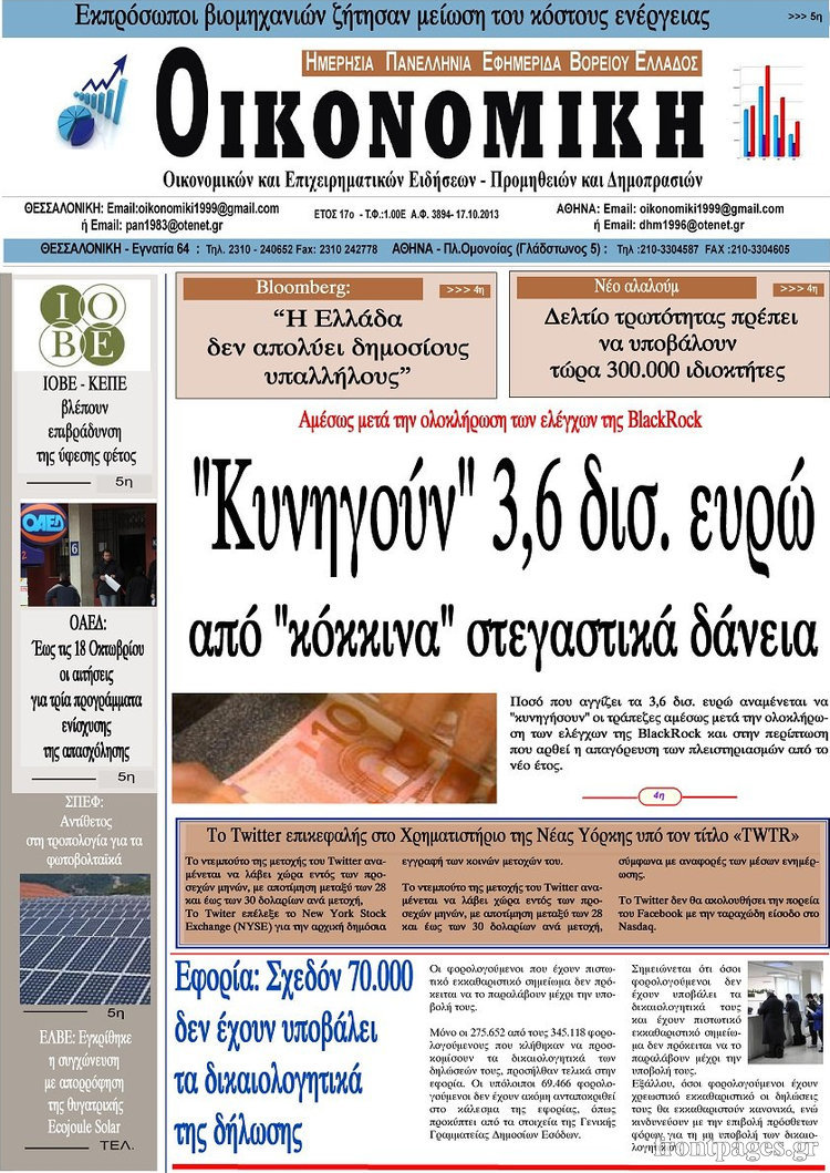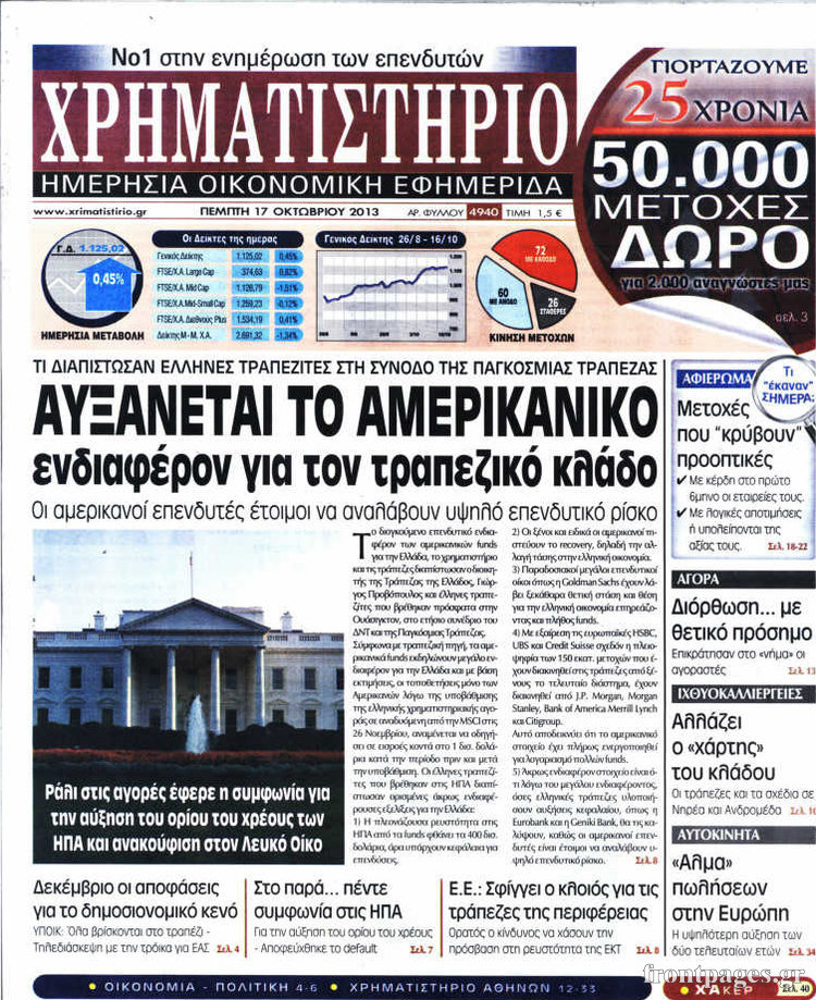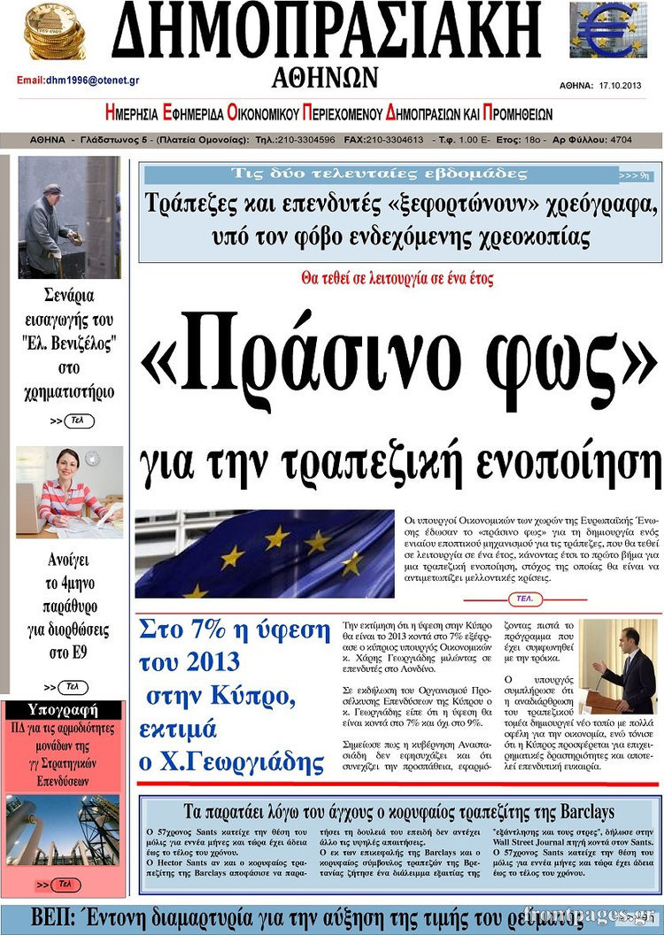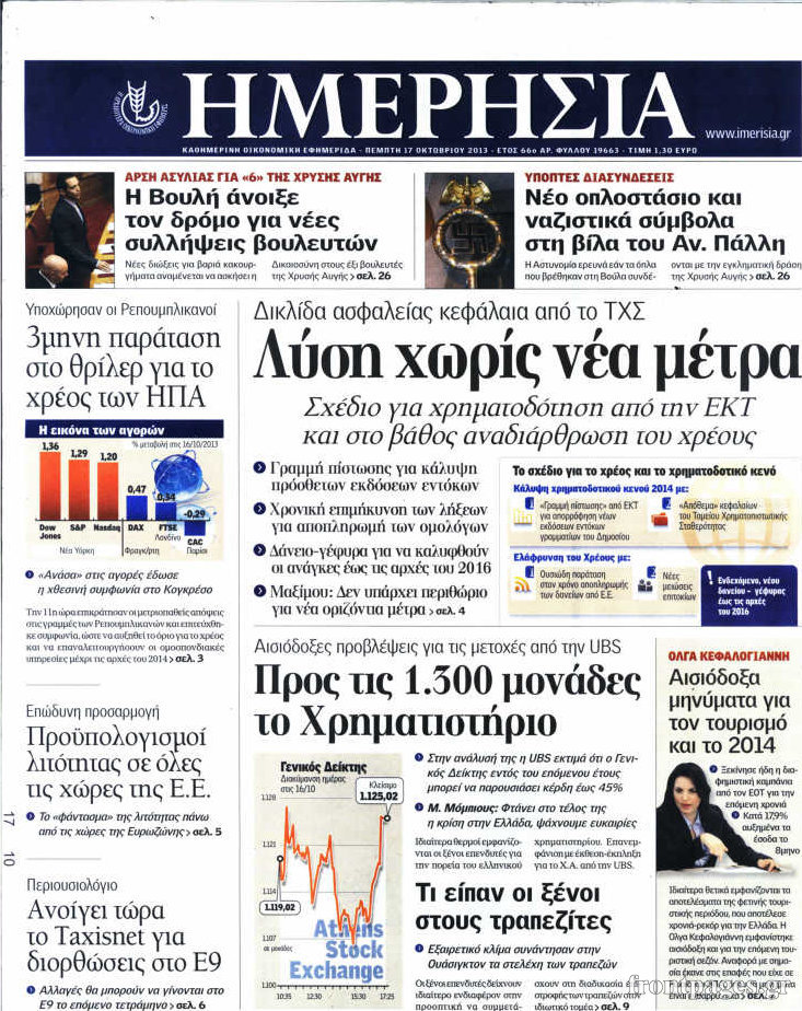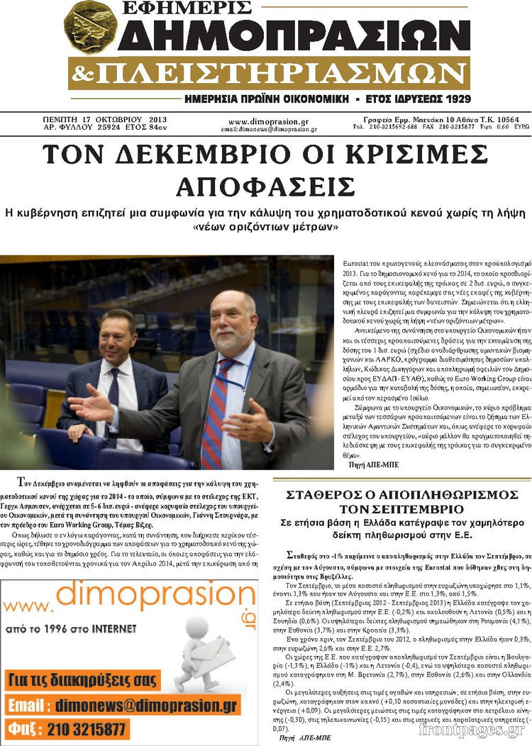Οι oικονομικές εφημερίδες Enikos Newsroom 08:54, Πέμπτη 17 Οκτωβρίου 2013 Media Οι oικονομικές εφημερίδες Διαβάστε τα πρωτοσέλιδα των οικονομικών εφημερίδων: ΕΦΗΜΕΡΙΔΕΣ ΟΙΚΟΝΟΜΙΚΕΣ ΕΦΗΜΕΡΙΔΕΣ ΠΡΩΤΟΣΕΛΙΔΑ Μοιράσου το: σχολίασε κι εσύ (0 σχόλια) Ακολουθήστε το enikos.gr στο Google News και μάθετε πρώτοι όλες τις ειδήσεις Δείτε όλες τις τελευταίες ειδήσεις από την Ελλάδα και τον Κόσμο στο enikos.gr Ειδήσεις Ροή Ειδήσεων 17 λεπτά πριν Χριστούγεννα στα μπλόκα: Επιμένουν στις κινητοποιήσεις τους οι αγρότες – Ανοίγουν τα διόδια το Σαββατοκύριακο 45 λεπτά πριν Τραμπ: Δεν αποκλείει την πιθανότητα ενός πολέμου στη Βενεζουέλα – «Ο Μαδούρο ξέρει καλύτερα από τον καθένα τι ακριβώς θέλω» 40 λεπτά πριν Ουκρανία: Η άνευ προηγουμένου επίθεση σε ρωσικό τάνκερ στη Μεσόγειο και το μήνυμα προς στον Πούτιν – Το «μακρύ χέρι» του Κιέβου 3 ώρες πριν Πούτιν: «Ναι, είμαι ερωτευμένος» – Βίντεο από τη σπάνια προσωπική παραδοχή του 1 ώρα πριν Συνεχίζει να προκαλεί ο Μίτσκοσκι: «Για μένα το όνομα Μακεδονία είναι ιερό» 2 ώρες πριν Αριθμολογία: Οι άνθρωποι που έχουν γεννηθεί αυτές τις 4 ημερομηνίες, συχνά παρεξηγούνται – «Η καλοσύνη τους κρύβει τεράστια δύναμη» 4 ώρες πριν Μήπως έχετε χάσει τον εαυτό σας στη σχέση σας; 7 «αθόρυβες» υποχωρήσεις που μάλλον κάνατε, χωρίς να το συνειδητοποιήσετε 3 ώρες πριν Ξεχάστε το καθάρισμα το Σαββατοκύριακο: Ο «κανόνας των 20 λεπτών» που θα σας λύσει τα χέρια 55 λεπτά πριν Ύπνος: Μια κρυφή κατάσταση του εγκεφάλου πριν από τον ύπνο μπορεί να είναι το “κλειδί” για υψηλή ευφυΐα και δημιουργικότητα 7 λεπτά πριν Παναθηναϊκός: «Μέσα» οι Σφιντέρσκι και Τουμπά για το ματς με τον ΠΑΟΚ – Τι έδειξε η μαγνητική του Πάντοβιτς 12 λεπτά πριν Γιώργος Γιαννόπουλος για “Το σόι σου”: “Είναι ευτυχία και ευλογία αυτή η σειρά” 17 λεπτά πριν Χριστούγεννα στα μπλόκα: Επιμένουν στις κινητοποιήσεις τους οι αγρότες – Ανοίγουν τα διόδια το Σαββατοκύριακο 28 λεπτά πριν Χάρι και Μέγκαν: Η σπάνια οικογενειακή φωτογραφία με τον Άρτσι και τη Λίλιμπετ – Τι σχεδιάζουν για τα Χριστούγεννα 35 λεπτά πριν Βασίλης Καρράς: «Είναι πάντα δίπλα μου, δεν έφυγε…», λέει ο αδελφός του ENIKOS NETWORK Το ΕΚΑΒ τιμήθηκε από την Ακαδημία Αθηνών για τα 40 χρόνια προσφοράς του Έχετε πραγματικά μεγάλη καρδιά; 10 χαρακτηριστικά όσων έχουν καλοσύνη Πλήρης επάρκεια προϊόντων στις λαϊκές της Αττικής, παρά τις αγροτικές κινητοποιήσεις – Τι απαντούν οι πωλητές ΑΑΔΕ: Νέες αναβαθμίσεις στο Ψηφιακό Πελατολόγιο και την εφαρμογή myDATAapp – Τι πρέπει να γνωρίζετε Χαρτογραφώντας το «σημείο χωρίς επιστροφή»: Για πρώτη φορά αποκαλύπτεται με λεπτομέρεια το ακανθώδες όριο της ατμόσφαιρας τ... Η Google καταργεί τη λειτουργία «dark web report» – Πώς θα μπορούν οι χρήστες να διαγράφουν τα δεδομένα τους περισσότερα 22:42 , Παρασκευή 19 Δεκεμβρίου 2025 Γιώργος Γιαννόπουλος για “Το σόι σου”: “Είναι ευτυχία και ευλογία αυτή η σειρά” «Είναι ευτυχία και ευλογία η συγκυρία αυτής της σειράς», θα πει ο Γιώργος Γιαννόπουλος -ο αγαπ... 20:37 , Παρασκευή 19 Δεκεμβρίου 2025 Don’t Forget The Lyrics: Η Έλλη Κοκκίνου υποδέχεται 4 παίκτες που θα κάνουν τα πάντα για να μη χάσουν ούτε… μισή λέξη από τους στίχους Το «Don’t Forget The Lyrics» επιστρέφει απόψε, Παρασκευή 19 Δεκεμβρίου, στις 21:00 με νέο επει... 19:31 , Παρασκευή 19 Δεκεμβρίου 2025 GNTM: Απόψε ο μεγάλος τελικός για τους 4 φιναλίστ Έπειτα από μήνες γεμάτους μόδα, δημιουργία και έντονες αναμετρήσεις, το GNTM 2025 κορυφώνεται,... 18:11 , Παρασκευή 19 Δεκεμβρίου 2025 Το σό