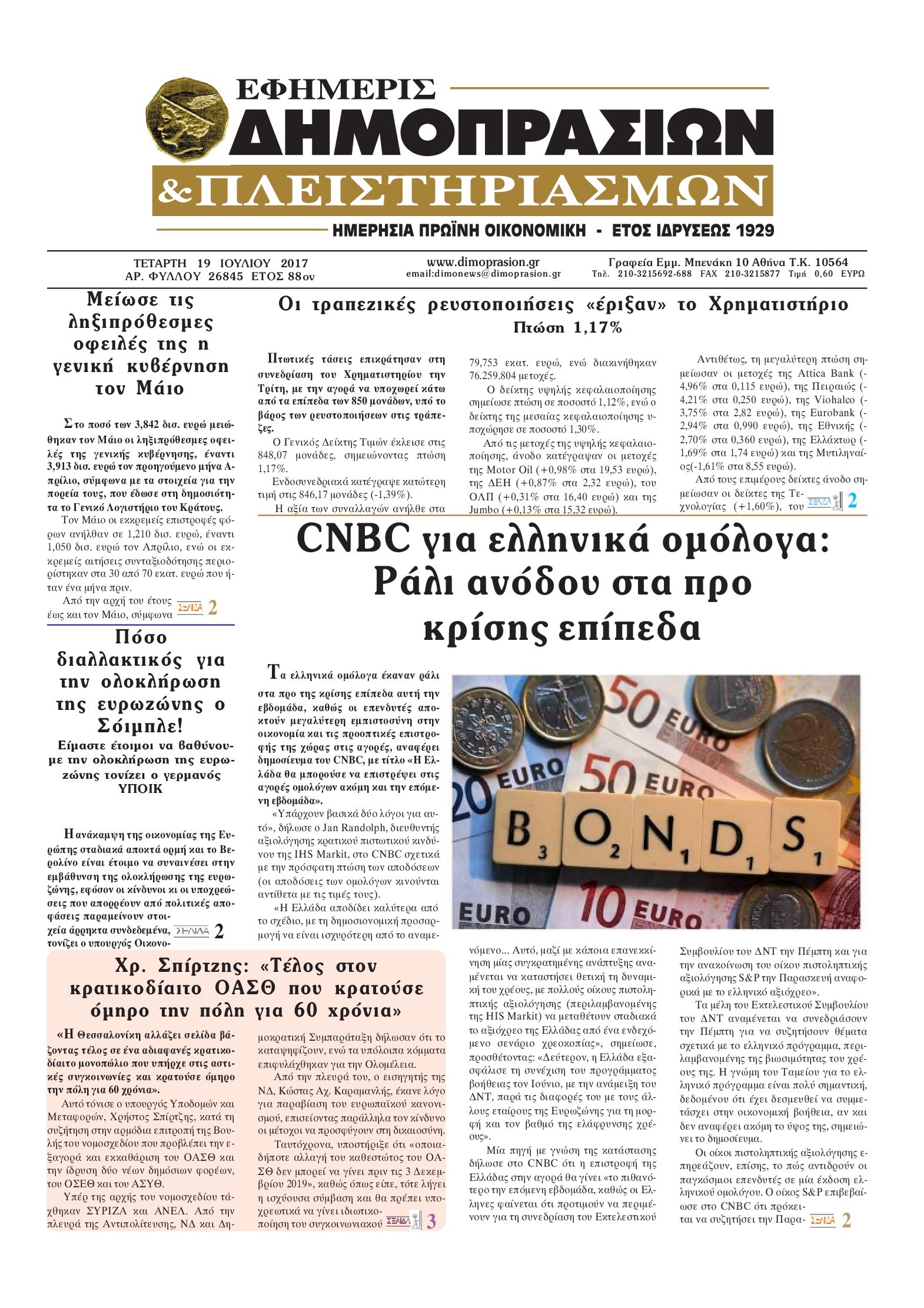 Οι οικονομικές εφημερίδες 19/7/2017 Enikos Newsroom 06:52, Τετάρτη 19 Ιουλίου 2017 Media Διαβάστε τα σημερινά πρωτοσέλιδα των οικονομικών εφημερίδων: ΟΙΚΟΝΟΜΙΚΕΣ ΕΦΗΜΕΡΙΔΕΣ ΠΡΩΤΟΣΕΛΙΔΑ Μοιράσου το: σχολίασε κι εσύ (0 σχόλια) Ακολουθήστε το enikos.gr στο Google News και μάθετε πρώτοι όλες τις ειδήσεις Δείτε όλες τις τελευταίες ειδήσεις από την Ελλάδα και τον Κόσμο στο enikos.gr Ειδήσεις Ροή Ειδήσεων 1 ώρα πριν Ευρωπαϊκή Ένωση: Συμφωνία για δάνειο 90 δισ. ευρώ στην Ουκρανία τη διετία 2026-2027 6 ώρες πριν ΟΠΕΚΕΠΕ: Προφυλακιστέος ο φερόμενος αρχηγός και ο λογιστής της εγκληματικής οργάνωσης 7 ώρες πριν Αυξάνουν την πίεση προς την κυβέρνηση οι αγρότες: Κλείνουν παρακαμπτήριους και ανοίγουν διόδια – Τι θα γίνει τις γιορτές 7 ώρες πριν Φοινικούντα: Το Σάββατο απολογείται ο 30χρονος γιος γνωστού επιχειρηματία της Πλάκας που παραδόθηκε – Όσα είπε στους αστυνομικούς και ο ρόλος του στο έγκλημα 5 ώρες πριν ΑΕΚ – Κραϊόβα 3-2: Επική ανατροπή και πρόκριση στους «16» του Conference League η Ένωση 6 ώρες πριν Αρχαιολόγοι ανακάλυψαν ρωμαϊκά τεχνουργήματα από μια πόλη που δεν υπήρξε ποτέ – Τα τρία εντυπωσιακά κτίρια και ο αμφορέας με τις… σαρδέλες 7 ώρες πριν Ύπνος: Η απλή βραδινή ρουτίνα για να προστατεύσετε τα μαλλιά σας από το κρύο κατά τη διάρκεια του χειμώνα 8 ώρες πριν Manifesting: Πώς να συναντήσετε τον σύντροφο της ζωής σας, ανάλογα με τον μήνα γέννησής σας 2 ημέρες πριν 20 χρόνια τα Χριστούγεννα ξεκινούν στα Public με μεγάλη ποικιλία σε δώρα! 1 λεπτό πριν Εφημερεύοντα φαρμακεία σε Αθήνα και Θεσσαλονίκη (19/12) 8 λεπτά πριν Η TikTok στις ΗΠΑ πωλείται σε Oracle, Silver Lake και MGX – Οι λεπτομέρειες του «deal» 16 λεπτά πριν Αλεξάντερ Λουκασένκο: Η Λευκορωσία βρίσκεται κοντά στην αποκατάσταση των σχέσεών της με τις ΗΠΑ 31 λεπτά πριν Αυστραλία: Κήρυξε την Κυριακή (21/12) ημέρα εθνικού πένθους για τη φονική επίθεση στην παραλία Μπόνταϊ 41 λεπτά πριν Ρόδος: Δάσκαλος καράτε καταδικάστηκε για ασέλγεια σε ανήλικες αθλήτριες – Μαρτυρίες για αγγίγματα σε ευαίσθητα σημεία ENIKOS NETWORK Σε περίοδο αυξημένης δραστηριότητας η γρίπη στην Ελλάδα-Μέτρα προστασίας από τον ΕΟΔΥ Σκέφτεστε συνέχεια συζητήσεις που έχετε κάνει; Τι σημαίνει αυτό, σύμφωνα με ειδικό Στεγαστικό: Τι λέει η ΠΟΜΙΔΑ για τα νέα μέτρα που ανακοίνωσε ο Κυριάκος Μητσοτάκης Λαγκάρντ: Αισιόδοξη για την ανάπτυξη της Ευρωζώνης, αβέβαιη για τον πληθωρισμό Χαρτογραφώντας το «σημείο χωρίς επιστροφή»: Για πρώτη φορά αποκαλύπτεται με λεπτομέρεια το ακανθώδες όριο της ατμόσφαιρας τ... Η Google καταργεί τη λειτουργία «dark web report» – Πώς θα μπορούν οι χρήστες να διαγράφουν τα δεδομένα τους περισσότερα 02:50 , Παρασκευή 19 Δεκεμβρίου 2025 GNTM: «Κλείδωσαν» οι τέσσερις φιναλίστ – Μεγάλη ανατροπή στις τελευταίες αποχωρήσεις Για προτελευταία φορά εμφανίστηκαν στο πλατό του GNTM οι φιναλίστ του φετινού κύκλου, το βράδυ... 17:45 , Πέμπτη 18 Δεκεμβρίου 2025 ROUK ZOUK: Εορταστικό επεισόδιο με καλεσμένους τους πρωταγωνιστές του «Γιατί ρε πατέρα» Το Σάββατο 20 Δεκεμβρίου στις 21:00, η Ζέτα Μακρυπούλια υποδέχεται εκλεκτούς ηθοποιούς που όλο... 17:20 , Πέμπτη 18 Δεκεμβρίου 2025 Άγιος έρωτας: Η Χριστίνα εξομολογείται στον πατέρα Νικόλαο, απόψε στις 21:00 στον Alpha Η Νότα αποφασίζει να εκδικηθεί τον Πέτρο και τον Στέφανο, για χάρη του Λούη, όμως τα πράγματα ... 16:50 , Πέμπτη 18 Δεκεμβρίου 2025 Να μ’ αγαπάς: Ζωή και Φωτεινή συμφιλιώνονται ως μάνα με κόρη, απόψε στις 20:00 Η ταυτότητα του Άγγελου αποκαλύπτεται στο νέο επεισόδιο της σειράς “Να μ’ αγαπάς... 