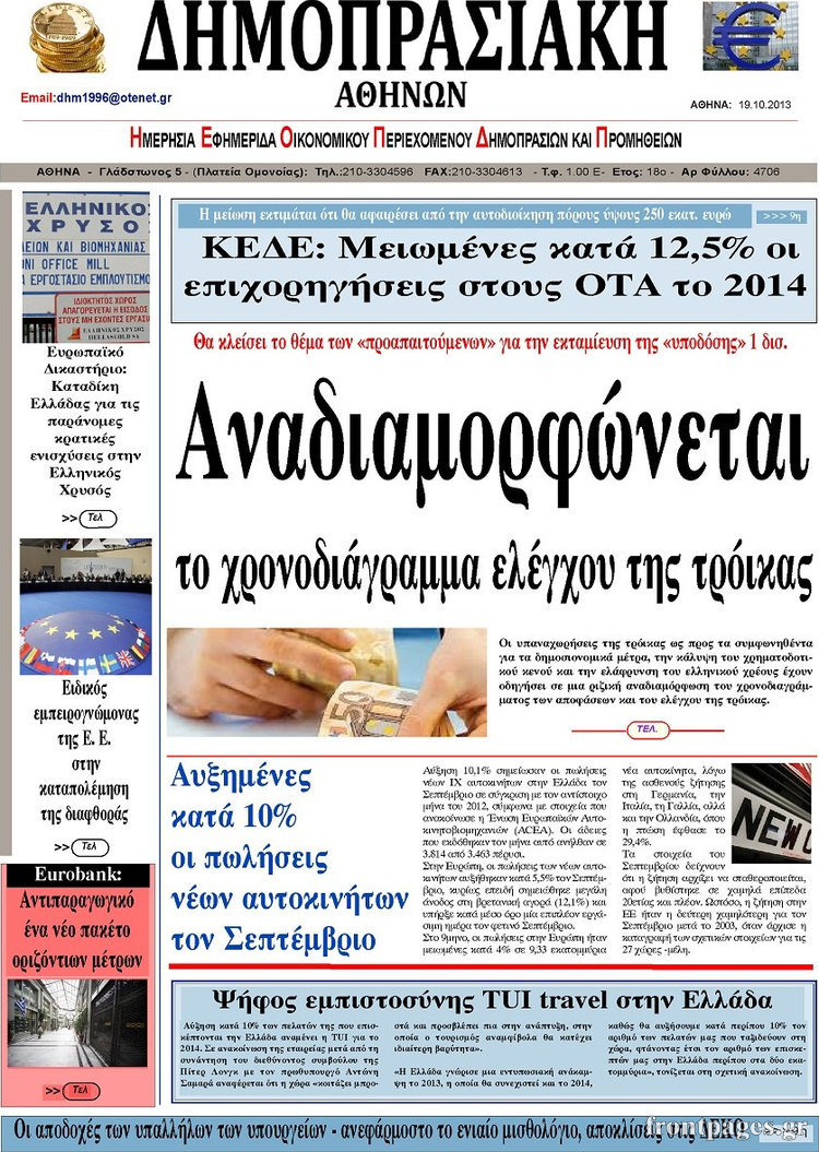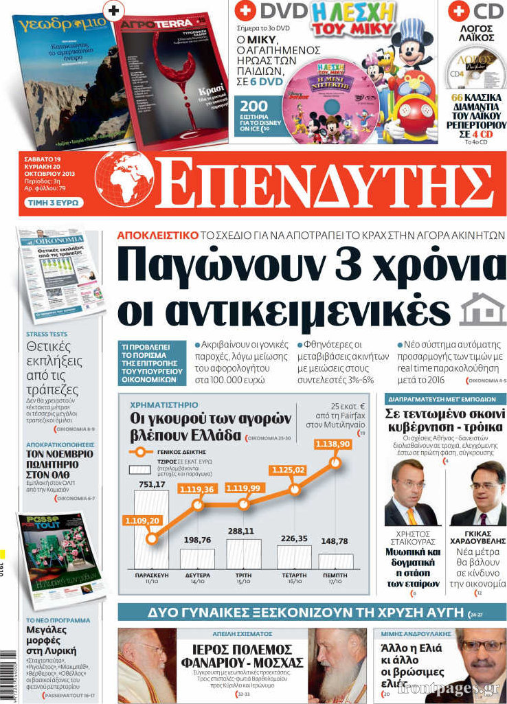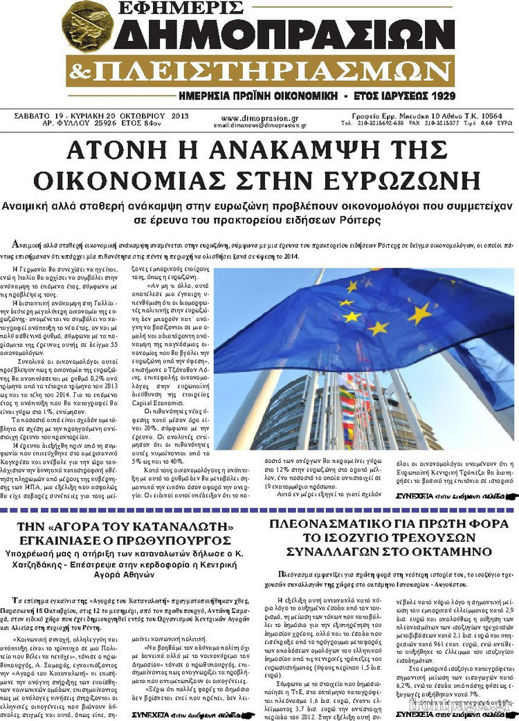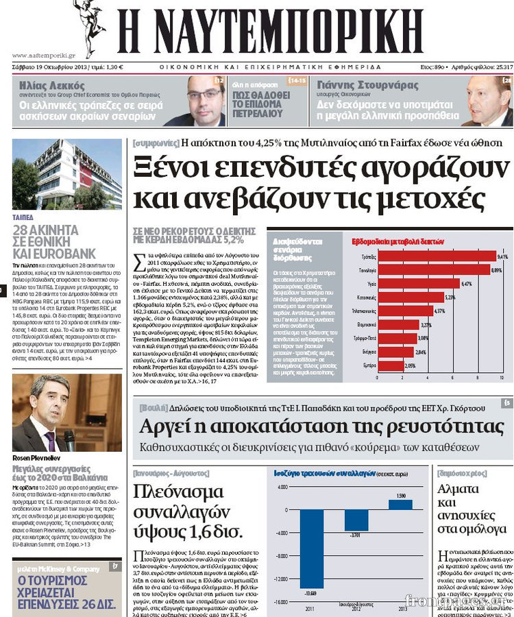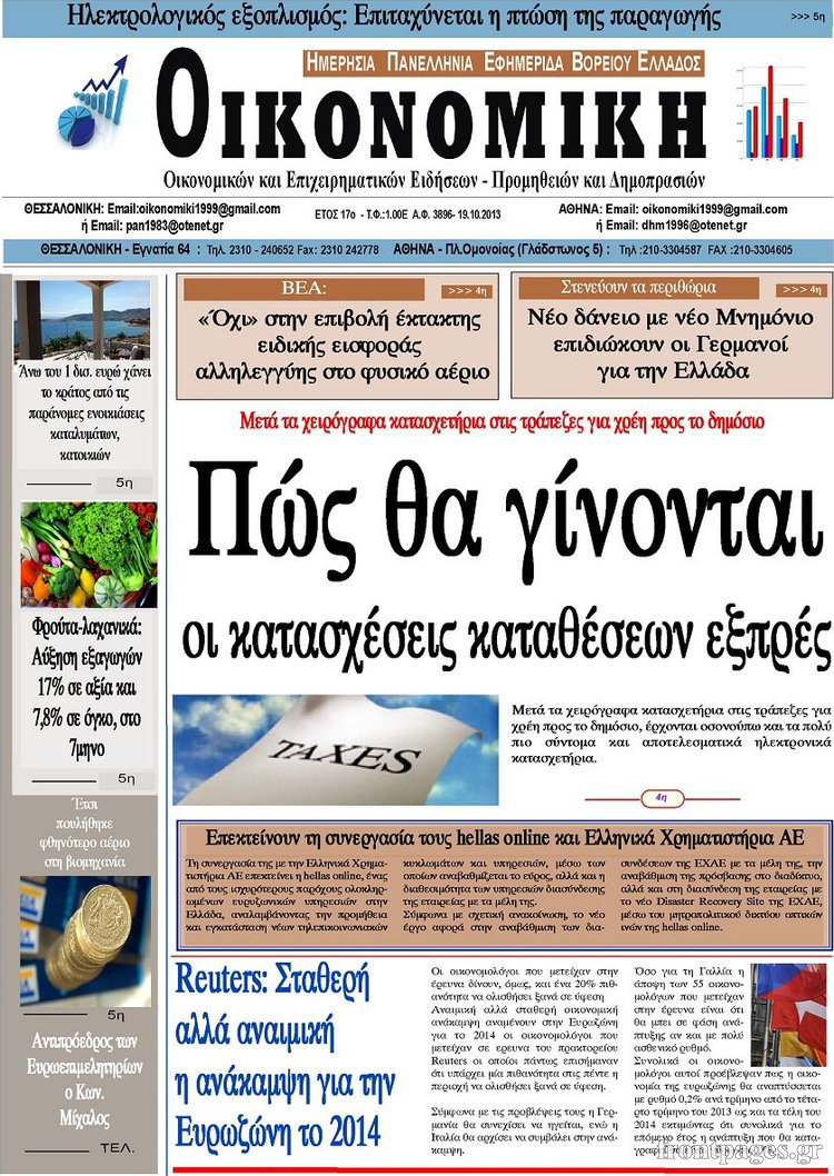 Οι oικονομικές εφημερίδες Enikos Newsroom 08:25, Σάββατο 19 Οκτωβρίου 2013 Media Οι oικονομικές εφημερίδες Διαβάστε τα πρωτοσέλιδα των οικονομικών εφημερίδων: ΟΙΚΟΝΟΜΙΚΕΣ ΕΦΗΜΕΡΙΔΕΣ ΠΡΩΤΟΣΕΛΙΔΑ Μοιράσου το: σχολίασε κι εσύ (0 σχόλια) Ακολουθήστε το enikos.gr στο Google News και μάθετε πρώτοι όλες τις ειδήσεις Δείτε όλες τις τελευταίες ειδήσεις από την Ελλάδα και τον Κόσμο στο enikos.gr Ειδήσεις Ροή Ειδήσεων 43 λεπτά πριν Μητσοτάκης για αγρότες: Ελπίζω πως θα απομακρυνθούν σύντομα από τα μπλόκα 2 ώρες πριν Έρευνα MRB: Η πρόθεση ψήφου και τα σημαντικότερα προβλήματα – Οι «λέξεις» που εκφράζουν τους πολίτες 2 ώρες πριν Αλαλούμ με τις πληρωμές στους αγρότες: Δεν καταβλήθηκε η Βασική Ενίσχυση, αλλά έγινε παρακράτηση της εισφοράς στον ΕΛΓΑ – Τι απαντά η κυβέρνηση 2 ώρες πριν Κλέφτες άρπαξαν έναν… 12μετρο φουσκωτό Άγιο Βασίλη – «Αν κάποιος έχει πληροφορίες να επικοινωνήσει μαζί μας» 1 ώρα πριν Εξεταστική ΟΠΕΚΕΠΕ – Μυλωνάκης: «Ουδέποτε είχα πληροφόρηση ή ενημέρωσα οποιονδήποτε για επισυνδέσεις της δικογραφίας» 2 ώρες πριν Τα 4 ζώδια που ξαναβρίσκουν τον εαυτό τους – «Μπαίνετε επιτέλους στην ουσία των πραγμάτων» 3 ώρες πριν 20 χρόνια τα Χριστούγεννα ξεκινούν στα Public με μεγάλη ποικιλία σε δώρα! 2 ώρες πριν «Δεν είχα κλάψει από τότε που διαγνώστηκα με καρκίνο, ώσπου ένα τηλεφώνημα με έκανε να λυγίσω» – Η συγκλονιστική εξομολόγηση ενός άνδρα 32 λεπτά πριν Τα 7 σπάνια χαρακτηριστικά που κάνουν κάποιους ανθρώπους ακαταμάχητους 3 λεπτά πριν Μεγάλη Χριστουγεννιάτικη Αγορά στην πλατεία Κοτζιά: Ξύλινα σπιτάκια, καρουζέλ και μουσική – Όλο το πρόγραμμα 8 λεπτά πριν Εξεταστική για τον ΟΠΕΚΕΠΕ: Αντιπαράθεση για την ταυτότητα του «Φραπέ» 12 λεπτά πριν Έρευνα MRB: Οι πιο δημοφιλείς υπουργοί 20 λεπτά πριν Ακούστε την εκπομπή του Νίκου Χατζηνικολάου 17/12/2025 26 λεπτά πριν Μεξικό: Χάος στο Κογκρέσο με βουλευτίνες να «μαλλιοτραβιούνται» – Βίντεο από τη μαζική σύρραξη ENIKOS NETWORK Ανησυχητική αύξηση της υπέρτασης στα παιδιά – Πώς θα τα προστατέψουμε; Αδενώματα Υπόφυσης: Μια πάθηση καλοήθης, αλλά όχι αθώα Προϋπολογισμός: Στα 12,6 δισ. ευρώ το πρωτογενές πλεόνασμα το 11μηνο-Δείτε αναλυτικά τα στοιχεία Ελεύθεροι επαγγελματίες: Ποιοι κλάδοι δήλωσαν τους υψηλότερους ετήσιους τζίρους και ποιοι τους χαμηλότερους-Δείτε τα στοιχε... Σύγχρονος Νοστράδαμος: Προειδοποιεί για «μεγάλο γεγονός» τους επόμενους μήνες που θα συγκλονίσει τη Βρετανία και τον κόσμο Τεστ παρατηρητικότητας: Μπορείτε να βρείτε τις 3 διαφορές στις εικόνες με έναν πιγκουίνο σε 14 δευτερόλεπτα περισσότερα 12:12 , Τετάρτη 17 Δεκεμβρίου 2025 Ακούστε την εκπομπή του Νίκου Χατζηνικολάου 17/12/2025 Ακούστε την εκπομπή του Νίκου Χατζηνικολάου στον ραδιοφωνικό σταθμό RealFm 97,8, την Τετάρτη 1... 11:35 , Τετάρτη 17 Δεκεμβρίου 2025 Home Alone: Το σπίτι της ταινίας θα ανακαινιστεί – Επιστροφή στην αισθητική της δεκαετίας του ’90 Οι νέοι ιδιοκτήτες του πραγματικού σπιτιού που παρουσιάζεται στην κλασική ταινία του 1990 «Hom... 11:25 , Τετάρτη 17 Δεκεμβρίου 2025 Grand Hotel: Απόψε το τελευταίο επεισόδιο της χρονιάς – Όλα τα μυστικά μένουν εδώ Το τελευταίο επεισόδιο της χρονιάς της σειράς «Grand Hotel» θα προβληθεί απόψε στις 21:00. Ο Ά... 09:08 , Τετάρτη 17 Δεκεμβρίου 2025 Τηλεθέαση (16/12): Ανακατατάξεις στην πρωινή ψυχαγωγική ζώνη Ξεκάθαρη πρωτιά στην τηλεθέαση για την «Super Κατερίνα» στο δυναμικό κοινό με ποσοστό 18,5%, α... ΤΕΛΕΥΤΑΙΕΣ ΕΙΔΗΣΕΙΣ 3 λεπτά πριν Μεγάλη Χριστουγεννιάτικη Αγορά στην πλατεία Κοτζιά:... 8 λεπ