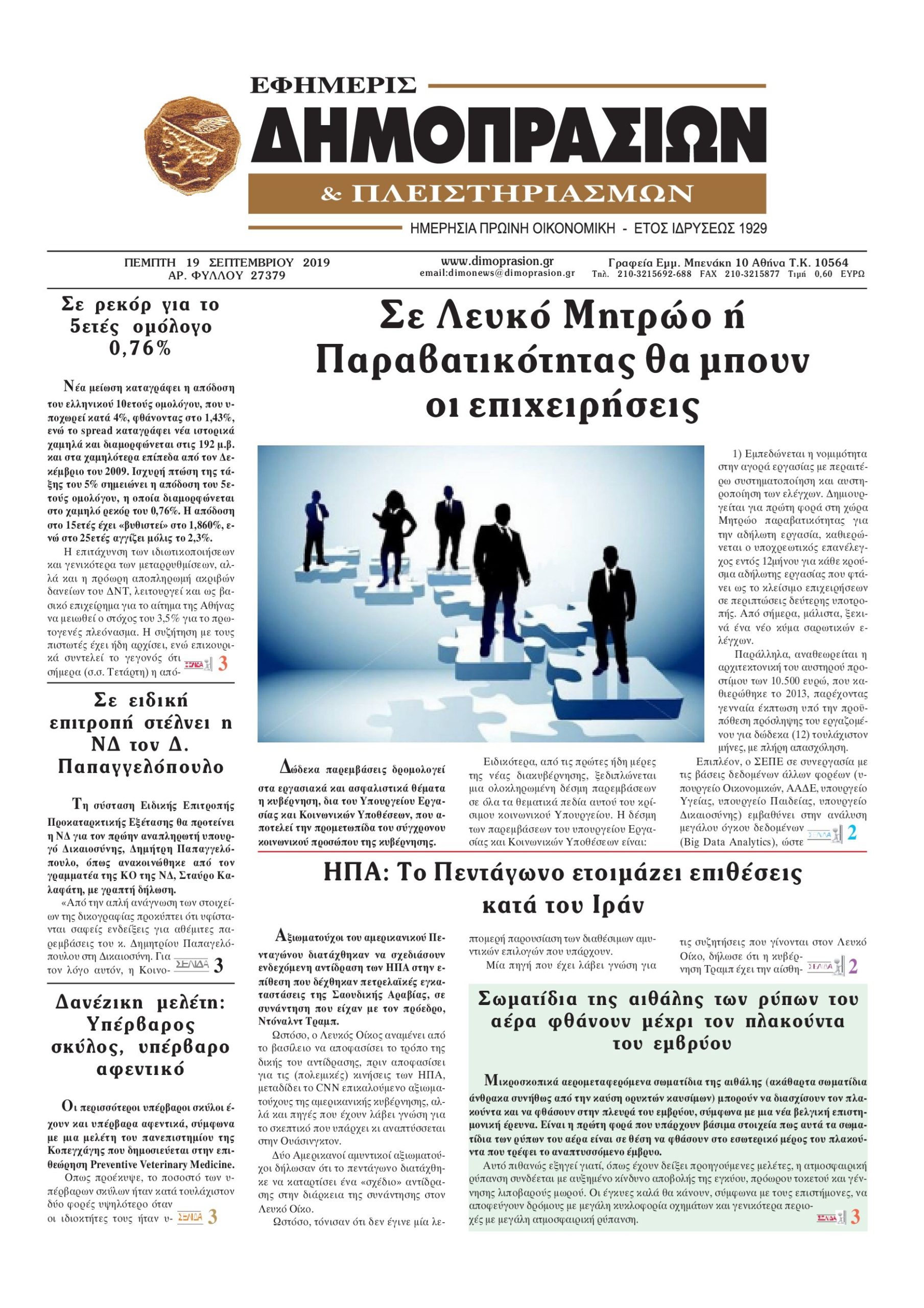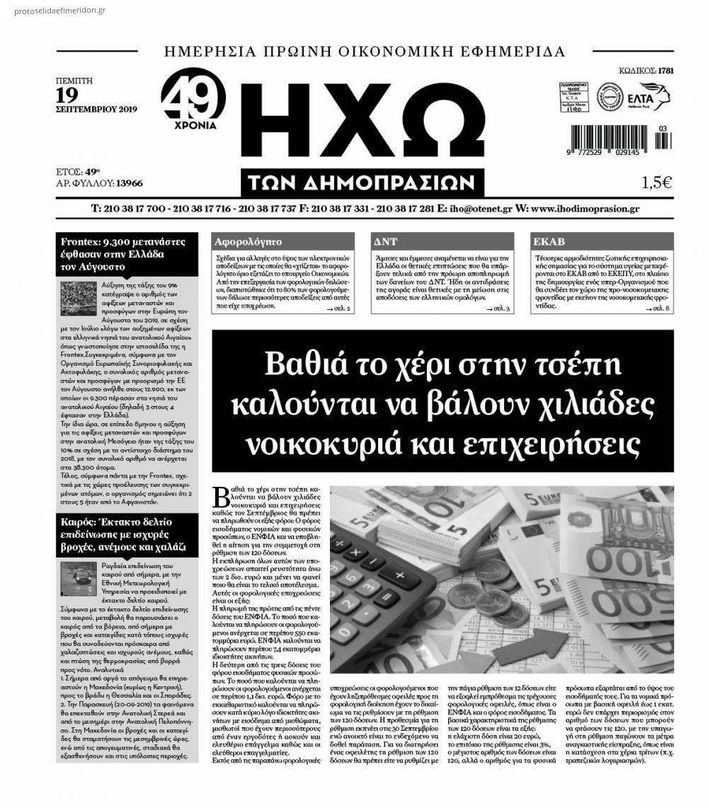 Οι οικονομικές εφημερίδες 19/9/19 Διονύσης Νίκκας 06:31, Πέμπτη 19 Σεπτεμβρίου 2019 Media Διαβάστε τα πρωτοσέλιδα των οικονομικών εφημερίδων… ΕΦΗΜΕΡΙΔΕΣ ΟΙΚΟΝΟΜΙΚΕΣ Μοιράσου το: σχολίασε κι εσύ (0 σχόλια) Ακολουθήστε το enikos.gr στο Google News και μάθετε πρώτοι όλες τις ειδήσεις Δείτε όλες τις τελευταίες ειδήσεις από την Ελλάδα και τον Κόσμο στο enikos.gr Ειδήσεις Ροή Ειδήσεων 1 ώρα πριν Πούτιν: «Ανοησίες» και «υστερίες» οι ισχυρισμοί της Ευρώπης για πιθανή σύγκρουση με τη Ρωσία – «Κάνουν πλύση εγκεφάλου» 5 ώρες πριν Έρευνα MRB: Η πρόθεση ψήφου και τα σημαντικότερα προβλήματα – Οι «λέξεις» που εκφράζουν τους πολίτες 2 ώρες πριν Αμοργός: «Θα προσπαθήσω να το κάνω κάθε μέρα» – Ποιος είναι ο αγρότης που έστησε μόνος του το πρώτο μπλόκο στο νησί 18 λεπτά πριν Τραγωδία στην Αλεξανδρούπολη: Παιδάκι 3 ετών μεταφέρθηκε νεκρό από τη μητέρα του στο νοσοκομείο 58 λεπτά πριν Συνάντηση Μητσοτάκη με την Κ.Ο. της ΝΔ: Οι αφίξεις των βουλευτών, τα γλυκά και τα «πηγαδάκια» 5 ώρες πριν Τα 4 ζώδια που ξαναβρίσκουν τον εαυτό τους – «Μπαίνετε επιτέλους στην ουσία των πραγμάτων» 6 ώρες πριν 20 χρόνια τα Χριστούγεννα ξεκινούν στα Public με μεγάλη ποικιλία σε δώρα! 4 ώρες πριν «Δεν είχα κλάψει από τότε που διαγνώστηκα με καρκίνο, ώσπου ένα τηλεφώνημα με έκανε να λυγίσω» – Η συγκλονιστική εξομολόγηση ενός άνδρα 3 ώρες πριν Τα 7 σπάνια χαρακτηριστικά που κάνουν κάποιους ανθρώπους ακαταμάχητους 5 λεπτά πριν Παραμένουν στα μπλόκα οι αγρότες της Μεσσηνίας – Κλειστή η εθνική οδός Καλαμάτας- Αθήνας 11 λεπτά πριν Φον ντερ Λάιεν: Επιστολή για το μεταναστευτικό ενόψει της Συνόδου Κορυφής – «Υπήρξε πρόοδος, αλλά έχουμε σημαντική δουλειά μπροστά μας» 16 λεπτά πριν Χριστουγεννιάτικη γιορτή με τον Σάκη Ρούβα στον ξενώνα «Μαριάννα Β. Βαρδινογιάννη-ΕΛΠΙΔΑ» 18 λεπτά πριν Τραγωδία στην Αλεξανδρούπολη: Παιδάκι 3 ετών μεταφέρθηκε νεκρό από τη μητέρα του στο νοσοκομείο 18 λεπτά πριν Βουλή: Άρση της ασυλίας της Ζωής Κωνσταντοπούλου για μήνυση συκοφαντικής δυσφήμισης ENIKOS NETWORK 5 πράγματα που αποφεύγει γαστρεντερολόγος για να μειώσει τον κίνδυνο καρκίνου του εντέρου Ανησυχητική αύξηση της υπέρτασης στα παιδιά – Πώς θα τα προστατέψουμε; ΕΛΕΤΑΕΝ: Πόσα χρήματα θα δοθούν σε δήμους και νοικοκυριά από τις ΑΠΕ «IRIS Παντού»: Στην κορυφή της Ευρώπης η Ελλάδα με 120 εκατ. ευρώ συναλλαγές το 2025 – Η σύγκριση με τις άλλες χώρες της Ευ... Σύγχρονος Νοστράδαμος: Προειδοποιεί για «μεγάλο γεγονός» τους επόμενους μήνες που θα συγκλονίσει τη Βρετανία και τον κόσμο Τεστ παρατηρητικότητας: Μπορείτε να βρείτε τις 3 διαφορές στις εικόνες με έναν πιγκουίνο σε 14 δευτερόλεπτα περισσότερα 12:35 , Τετάρτη 17 Δεκεμβρίου 2025 Μίρκα Παπακωνσταντίνου: «Δεν ήμουν αισιόδοξη για τα νούμερα – Είμαι ρεαλίστρια» Στα γυρίσματα του εορταστικού επεισοδίου της αγαπημένης σειράς “Το Σόι Σου”, βρέθηκε η κάμερα ... 12:12 , Τετάρτη 17 Δεκεμβρίου 2025 Ακούστε την εκπομπή του Νίκου Χατζηνικολάου 17/12/2025 Ακούστε την εκπομπή του Νίκου Χατζηνικολάου στον ραδιοφωνικό σταθμό RealFm 97,8, την Τετάρτη 1... 11:35 , Τετάρτη 17 Δεκεμβρίου 2025 Home Alone: Το σπίτι της ταινίας θα ανακαινιστεί – Επιστροφή στην αισθητική της δεκαετίας του ’90 Οι νέοι ιδιοκτήτες του πραγματικού σπιτιού που παρουσιάζεται στην κλασική ταινία του 1990 «Hom... 11:25 , Τετάρτη 17 Δεκεμβρίου 2025 Grand Hotel: Απόψε το τελευταίο επεισόδιο της χρονιάς – Όλα τα μυστικά μένουν εδώ Το τελευταίο επεισόδιο της χρονιάς της σειράς «Grand Hotel» θα προβληθε