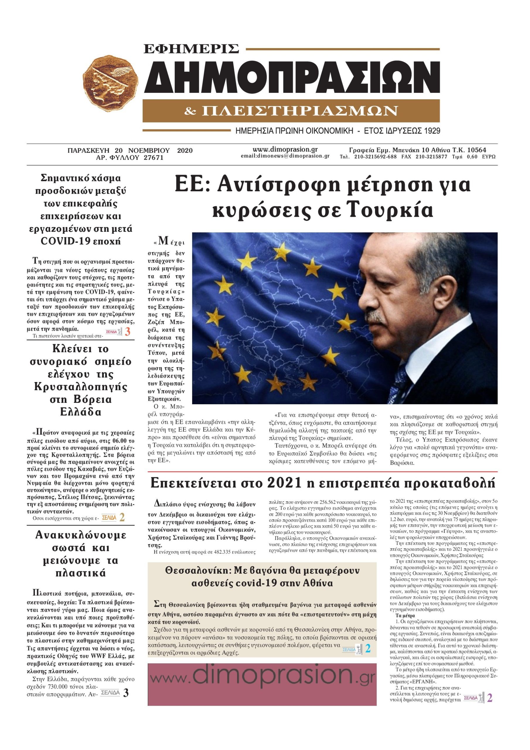 Οι οικονομικές εφημερίδες 20/11/2020 Διονύσης Νίκκας 06:53, Παρασκευή 20 Νοεμβρίου 2020 Media Διαβάστε τα πρωτοσέλιδα των οικονομικών εφημερίδων… ΟΙΚΟΝΟΜΙΚΕΣ ΕΦΗΜΕΡΙΔΕΣ Μοιράσου το: σχολίασε κι εσύ (0 σχόλια) Ακολουθήστε το enikos.gr στο Google News και μάθετε πρώτοι όλες τις ειδήσεις Δείτε όλες τις τελευταίες ειδήσεις από την Ελλάδα και τον Κόσμο στο enikos.gr Ειδήσεις Ροή Ειδήσεων 23 λεπτά πριν Κλιμακώνουν από σήμερα τις κινητοποιήσεις οι αγρότες: Νέα μπλόκα, κλείσιμο παρακαμπτηρίων και άνοιγμα διοδίων – Το νέο μήνυμα Μητσοτάκη 49 λεπτά πριν Συντάξεις: Οι κερδισμένοι και οι χαμένοι από τις αυξήσεις – Αναλυτικός οδηγός και παραδείγματα 4 ώρες πριν Ευρωπαϊκή Ένωση: Συμφωνία για δάνειο 90 δισ. ευρώ στην Ουκρανία τη διετία 2026-2027 – Μητσοτάκης: Η λύση που προκρίθηκε είναι η ενδεδειγμένη 1 ώρα πριν Θανατηφόρο τροχαίο στη Νέα Φιλαδέλφεια: Νεκρός 27χρονος οδηγός μηχανής ύστερα από σύγκρουση με τρόλεϊ 15 λεπτά πριν Πανεπιστήμιο Μπράουν: Νεκρός ο ύποπτος για την επίθεση 2 ώρες πριν Οπτική ψευδαίσθηση: Μόνο αν έχεις αετίσια ματιά θα βρεις τον παπαγάλο σε 12 δευτερόλεπτα 2 ώρες πριν Κρύα χέρια και πόδια: Γιατρός εξηγεί ποια είναι η αίτια και πότε πρέπει να ανησυχήσετε 3 ώρες πριν Τα ζώδια σήμερα, Παρασκευή 19 Δεκεμβρίου: Τοξότες, με τη Νέα Σελήνη έρχεται η προσωπική ανανέωσή σας 2 ημέρες πριν 20 χρόνια τα Χριστούγεννα ξεκινούν στα Public με μεγάλη ποικιλία σε δώρα! 4 λεπτά πριν Πώς το αρχαίο DNA του κυνηγού – συλλέκτη ξεκλείδωσε τα μυστικά της μακροζωίας 10 λεπτά πριν Την Κυριακή με τη Realnews: Δωροεπιταγή 10€ 15 λεπτά πριν Πανεπιστήμιο Μπράουν: Νεκρός ο ύποπτος για την επίθεση 21 λεπτά πριν Τέμπη: Συνεχίζεται σήμερα η δίκη για τη διαχείριση του βιντεοληπτικού υλικού 23 λεπτά πριν Κλιμακώνουν από σήμερα τις κινητοποιήσεις οι αγρότες: Νέα μπλόκα, κλείσιμο παρακαμπτηρίων και άνοιγμα διοδίων – Το νέο μήνυμα Μητσοτάκη ENIKOS NETWORK Άνοια: Ειδικοί προειδοποιούν για 5 κοινές συνήθειες που μπορεί να αυξήσουν τον κίνδυνο 6 Χριστουγεννιάτικα δώρα για όσους τα έχουν όλα – Θα τους εκπλήξουν Συντάξεις: Οι κερδισμένοι και οι χαμένοι από τις αυξήσεις – Αναλυτικός οδηγός Στεγαστικό: Τι λέει η ΠΟΜΙΔΑ για τα νέα μέτρα που ανακοίνωσε ο Κυριάκος Μητσοτάκης Χαρτογραφώντας το «σημείο χωρίς επιστροφή»: Για πρώτη φορά αποκαλύπτεται με λεπτομέρεια το ακανθώδες όριο της ατμόσφαιρας τ... Η Google καταργεί τη λειτουργία «dark web report» – Πώς θα μπορούν οι χρήστες να διαγράφουν τα δεδομένα τους περισσότερα 08:00 , Παρασκευή 19 Δεκεμβρίου 2025 Την Κυριακή με τη Realnews: Δωροεπιταγή 10€ Δωροεπιταγή αξίας 10€ για αγορές άνω των 60€ από τα πολυκαταστήματα FactoryOutlet H προσφορά ι... 05:48 , Παρασκευή 19 Δεκεμβρίου 2025 Οι οικονομικές εφημερίδες 19/12/2025 Διαβάστε τα πρωτοσέλιδα από τις οικονομικές εφημερίδες, σήμερα 19/12/2025. 05:43 , Παρασκευή 19 Δεκεμβρίου 2025 Οι αθλητικές εφημερίδες 19/12/2025 Διαβάστε τα πρωτοσέλιδα από τις αθλητικές εφημερίδες, σήμερα 19/12/2025. 05:38 , Παρασκευή 19 Δεκεμβρίου 2025 Οι πολιτικές εφημερίδες 19/12/2025 Διαβάστε τα πρωτοσέλιδα από τις πολιτικές εφημερίδες, σήμερα 19/12/2025. ΤΕΛΕΥΤΑΙΕΣ ΕΙΔΗΣΕΙΣ 10 λεπτά πριν Την Κυριακή με τη Realnews: Δωροεπιταγή 10€ 15 λεπτά πριν Πανεπιστήμιο Μπράουν: Νεκρός ο ύποπτος για την επίθεση 21 λεπτά πριν Τέμπη: Συνεχίζεται σήμερα η δίκη για τη διαχείριση του... 23 λεπτά πριν Κλιμακώνουν από σήμερα τις κινητοποιήσεις οι αγρότες:... 30 λεπτά πριν e-ΕΦΚΑ και ΔΥΠΑ: Τελευταία ημέρα πληρωμών σήμερα 37 λεπτά πριν Καιρός: Ηλιοφάνεια σήμερα – Έρχ