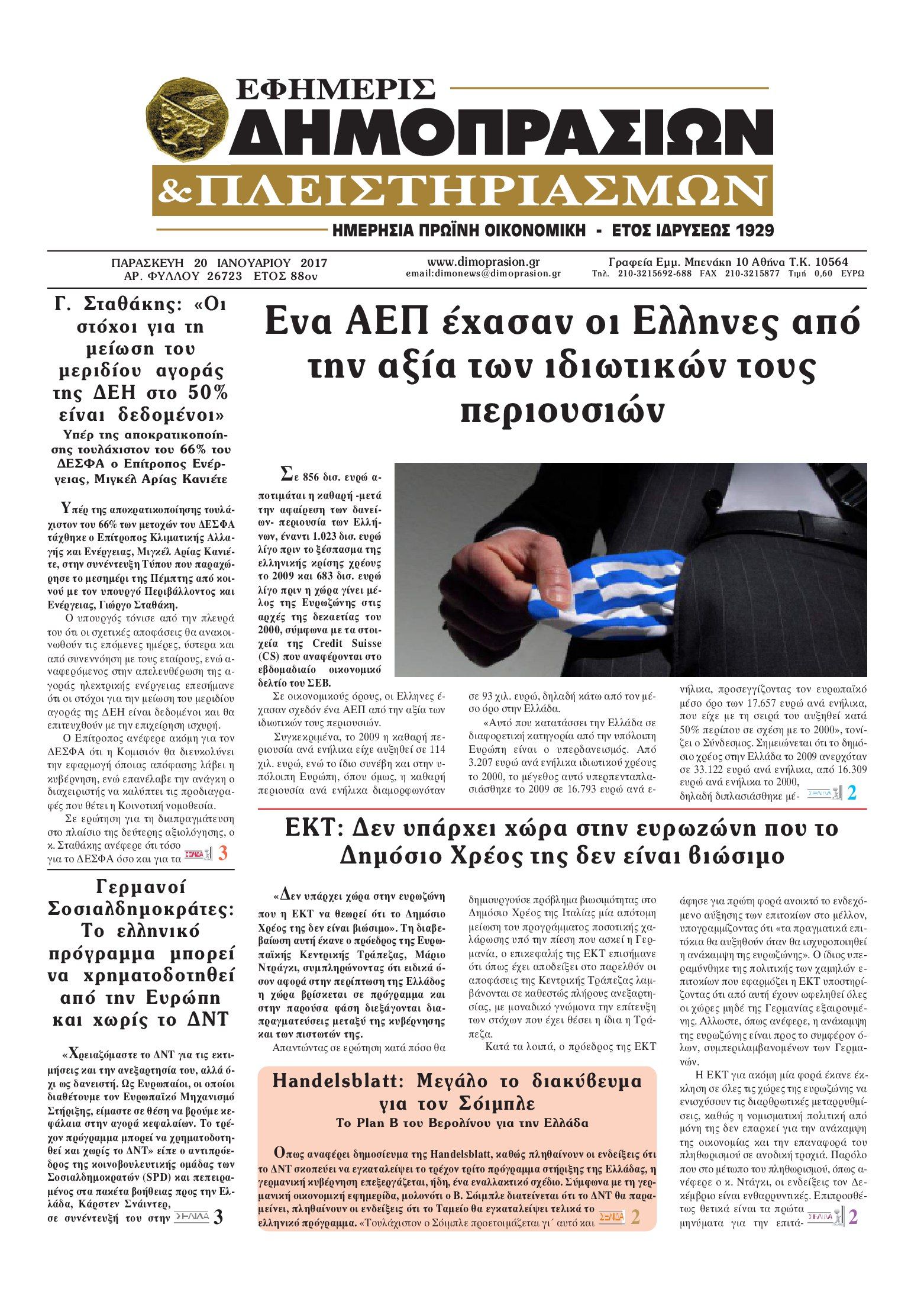 Οι οικονομικές εφημερίδες 20/1/2017 Enikos Newsroom 02:10, Παρασκευή 20 Ιανουαρίου 2017 Media Διαβάστε τα σημερινά πρωτοσέλιδα των οικονομικών εφημερίδων: ΟΙΚΟΝΟΜΙΚΕΣ ΕΦΗΜΕΡΙΔΕΣ ΠΡΩΤΟΣΕΛΙΔΑ Μοιράσου το: σχολίασε κι εσύ (0 σχόλια) Ακολουθήστε το enikos.gr στο Google News και μάθετε πρώτοι όλες τις ειδήσεις Δείτε όλες τις τελευταίες ειδήσεις από την Ελλάδα και τον Κόσμο στο enikos.gr Ειδήσεις Ροή Ειδήσεων 3 ώρες πριν Αγρότες: «Όχι στον διάλογο, μας εμπαίζει η κυβέρνηση» – Αποφάσισαν κλιμάκωση των κινητοποιήσεων, τι θα γίνει τα Χριστούγεννα 3 ώρες πριν Την πρώτη Belharra παρέλαβε η χώρα μας, υψώθηκε η ελληνική σημαία στη φρεγάτα «Κίμων» – Δένδιας: «Το ισχυρότερο Πολεμικό Ναυτικό που είχε ποτέ ο ελληνισμός» 1 ώρα πριν Γιώργος Μαζωνάκης: «Έχει υποστεί ένα σωρό εκβιαστικές πρακτικές – Του είπαν ότι θα του βάλουν τον συγκεκριμένο άνθρωπο να τον καταγγείλει» 3 ώρες πριν Μιχάλης Χουρδάκης: «Είμαι διαθέσιμος να συμβάλω στην προσωρινή κάλυψη του ιατρείου της Ψερίμου» – Η επιστολή στον Άδωνι Γεωργιάδη 3 ώρες πριν Εξώδικο Γεωργιάδη στην Κωνσταντοπούλου – «Με κατηγόρησε ότι έχω καταδικαστεί για παιδεραστία» 39 λεπτά πριν Γάμος: 11 ψυχρές αλλά ευγενικές φράσεις, που λέει ένας άνδρας όταν σκέφτεται τον χωρισμό 4 ώρες πριν Τα 5 ζώδια που θα ευνοηθούν στα οικονομικά τους το 2026 – «Τραβούν το χρήμα σαν μαγνήτες» 5 ώρες πριν Αυτό που κρύβεται κάτω από τη Γροιλανδία θα μπορούσε να ανατρέψει όσα γνωρίζουμε για την άνοδο της στάθμης των θαλασσών 1 ημέρα πριν 20 χρόνια τα Χριστούγεννα ξεκινούν στα Public με μεγάλη ποικιλία σε δώρα! 5 λεπτά πριν Σοκ στη Σουηδία: 12χρονος πληρωμένος δολοφόνος σκότωσε λάθος άτομο 10 λεπτά πριν FIFA: Έτοιμη να… επανεντάξει τη Ρωσία από το 2026 14 λεπτά πριν Live η κίνηση: Στο «κόκκινο» Κηφισός, Κηφισίας και οι δρόμοι στο κέντρο – Καθυστερήσεις και στην Αττική Οδό 19 λεπτά πριν Εξεταστική για ΟΠΕΚΕΠΕ: Νέο επεισόδιο Κωνσταντοπούλου με Λαζαρίδη και Συρεγγέλα – ΒΙΝΤΕΟ 25 λεπτά πριν Συνάντηση Γεραπετρίτη με την Βρετανή ομόλογό του – Έθεσε και το θέμα των Γλυπτών του Παρθενώνα ENIKOS NETWORK Ξεκίνησε η «επέλαση» της γρίπης στην Ελλάδα-Ποιοι κινδυνεύουν ΕΟΔΥ: Δωρεάν τεστ για HIV, Ηπατίτιδες, Σύφιλη, Χλαμύδια, Γονόρροια Κλιμάκωση των κινητοποιήσεων αποφάσισαν οι αγρότες, κλείνουν παρακαμπτήριους την Παρασκευή – Τι απαντά η κυβέρνηση Ευλογιά αιγοπροβάτων: Νέες αποζημιώσεις ύψους 26,02 εκατ. ευρώ σε κτηνοτρόφους – Η κατανομή ανά Περιφέρεια Χαρτογραφώντας το «σημείο χωρίς επιστροφή»: Για πρώτη φορά αποκαλύπτεται με λεπτομέρεια το ακανθώδες όριο της ατμόσφαιρας τ... Η Google καταργεί τη λειτουργία «dark web report» – Πώς θα μπορούν οι χρήστες να διαγράφουν τα δεδομένα τους περισσότερα 17:45 , Πέμπτη 18 Δεκεμβρίου 2025 ROUK ZOUK: Εορταστικό επεισόδιο με καλεσμένους τους πρωταγωνιστές του «Γιατί ρε πατέρα» Το Σάββατο 20 Δεκεμβρίου στις 21:00, η Ζέτα Μακρυπούλια υποδέχεται εκλεκτούς ηθοποιούς που όλο... 17:20 , Πέμπτη 18 Δεκεμβρίου 2025 Άγιος έρωτας: Η Χριστίνα εξομολογείται στον πατέρα Νικόλαο, απόψε στις 21:00 στον Alpha Η Νότα αποφασίζει να εκδικηθεί τον Πέτρο και τον Στέφανο, για χάρη του Λούη, όμως τα πράγματα ... 16:50 , Πέμπτη 18 Δεκεμβρίου 2025 Να μ’ αγαπάς: Ζωή και Φωτεινή συμφιλιώνονται ως μάνα με κόρη, απόψε στις 20:00 Η ταυτότητα του Άγγελου αποκαλύπτεται στο νέο επεισόδιο της σειράς “Να μ’ αγαπάς... 15:52 , Πέμπτη 18 Δεκεμβρίου 2025 Το Σπίτι Δίπλα Στο Ποτάμι: Το καθηλωτικό τελευταίο επεισόδιο για το 2025 απόψε στις 22:30 Καθηλώνει το σημερινό