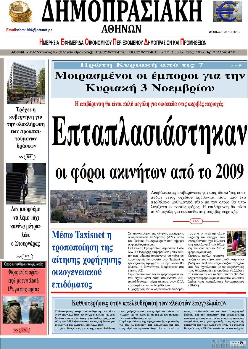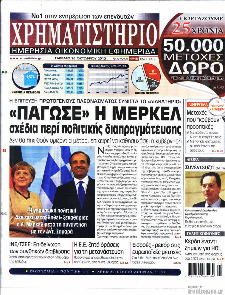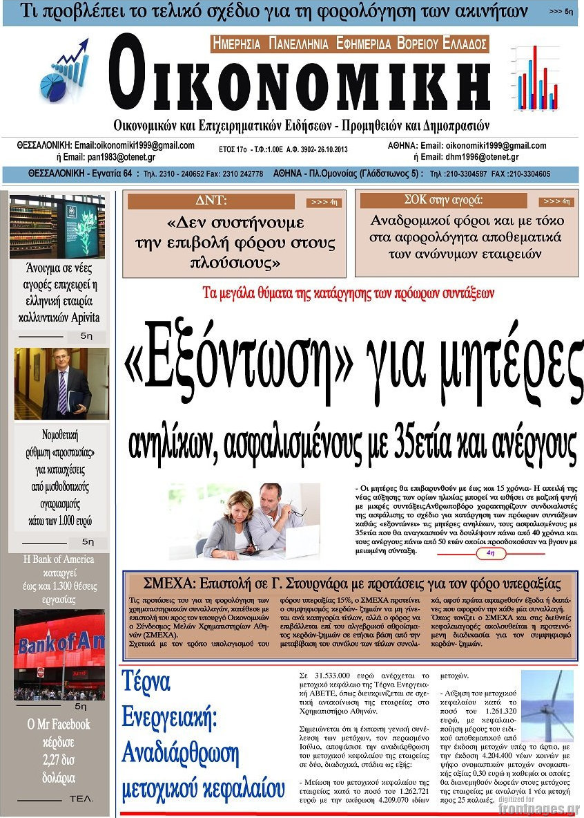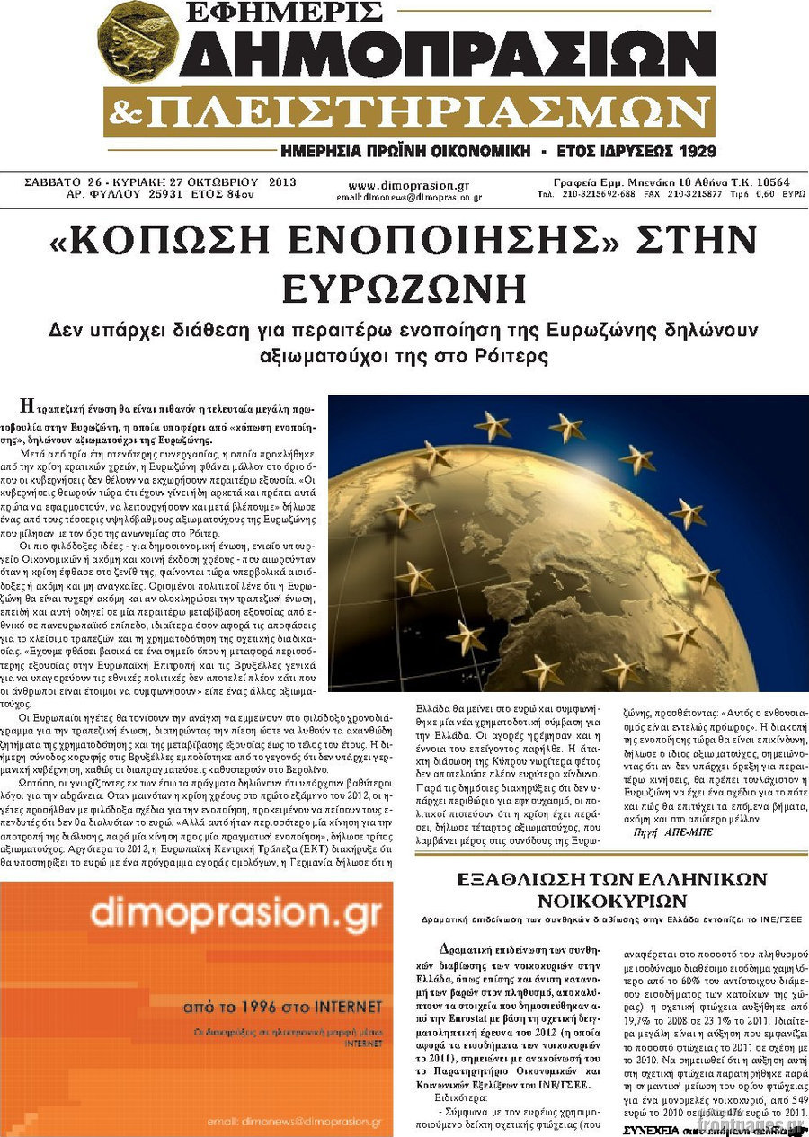 Οι oικονομικές εφημερίδες Enikos Newsroom 09:14, Σάββατο 26 Οκτωβρίου 2013 Media Οι oικονομικές εφημερίδες Διαβάστε τα πρωτοσέλιδα των οικονομικών εφημερίδων: ΕΦΗΜΕΡΙΔΕΣ ΟΙΚΟΝΟΜΙΚΕΣ ΕΦΗΜΕΡΙΔΕΣ ΠΡΩΤΟΣΕΛΙΔΑ Μοιράσου το: σχολίασε κι εσύ (0 σχόλια) Ακολουθήστε το enikos.gr στο Google News και μάθετε πρώτοι όλες τις ειδήσεις Δείτε όλες τις τελευταίες ειδήσεις από την Ελλάδα και τον Κόσμο στο enikos.gr Ειδήσεις Ροή Ειδήσεων 8 ώρες πριν Μητσοτάκης: Αναγκαία η μεταρρύθμιση του πρωτογενούς τομέα – Τα 6 νέα μέτρα για το στεγαστικό και οι αναφορές σε «Ιθάκη» και «πολιτικούς του καναπέ» 7 ώρες πριν Δάνεια σε ελβετικό φράγκο: Τα βασικά σημεία της ρύθμισης – ανάσας για 40.000 δανειολήπτες – Αναλυτικός οδηγός με ερωτήσεις και απαντήσεις 7 ώρες πριν Κυψέλη: Εξιτήριο πήρε η 14χρονη μαθήτρια που μαχαιρώθηκε από την 16χρονη σε σχολείο – «Θέλω να βοηθήσω το παιδί, έχει μπλέξει με κακές παρέες» 7 ώρες πριν Τραμπ: Γιατί κατέθεσε τώρα την αγωγή κατά του BBC – Πώς η κίνησή του εξυπηρετεί το νέο δόγμα του για «αντίσταση» στην Ευρώπη, υπέρ των συντηρητικών 8 ώρες πριν ΟΠΕΚΕΠΕ – Παράνομες επιδοτήσεις: Ελεύθεροι με περιοριστικούς όρους και οι 7 κατηγορούμενοι που απολογήθηκαν σήμερα 7 ώρες πριν Ανακαλύφθηκε βυθισμένη πέτρινη κατασκευή ανοιχτά της Κριμαίας – Αποτελεί μέρος αρχαίας ελληνικής αποικίας 8 ώρες πριν Ύπνος: Αυτό μπορεί να είναι το χειρότερο λάθος για το βιολογικό ρολόι σας, σύμφωνα με ειδικό 9 ώρες πριν Αριθμολογία: Οι άνθρωποι που έχουν γεννηθεί αυτές τις 3 ημερομηνίες, προσελκύουν μεγάλη τύχη πριν από το τέλος του 2025 11 ώρες πριν Οι 7 συμπεριφορές που μαρτυρούν ότι ένας άνδρας επενδύει μακροπρόθεσμα σε μια σχέση 8 λεπτά πριν Τα ζώδια σήμερα, Τετάρτη 17 Δεκεμβρίου: Κριοί, η αυτοπεποίθησή σας ενισχύεται 16 λεπτά πριν Εφημερεύοντα φαρμακεία σε Αθήνα και Θεσσαλονίκη (17/12) 21 λεπτά πριν Κόστα Ρίκα: Το Κογκρέσο απέρριψε το αίτημα για άρση της ασυλίας του προέδρου Τσάβες 29 λεπτά πριν Κολομβία: Νεκροί τέσσερις αστυνομικοί σε βομβιστικές επιθέσεις ανταρτών 37 λεπτά πριν Στάση εργασίας 11:00 – 17:00 σήμερα στα λεωφορεία του ΟΑΣΑ – Ποιες γραμμές θα λειτουργήσουν ENIKOS NETWORK Αίτημα ΙΣΑ για την εξαίρεση των προσωπικών γιατρών από τις κατ’ οίκον επισκέψεις Η σκανδιναβική μέθοδος στον ύπνο που μπορεί να σώσει έναν γάμο Πιερρακάκης: Ο προϋπολογισμός συμβάλλει ουσιαστικά στην ενίσχυση της αγοραστικής δύναμης της πλειονότητας των εργαζομένων e-ΕΦΚΑ: Παρατείνεται η προθεσμία για την υποβολή ΑΠΔ – Ποιους αφορά Σύγχρονος Νοστράδαμος: Προειδοποιεί για «μεγάλο γεγονός» τους επόμενους μήνες που θα συγκλονίσει τη Βρετανία και τον κόσμο Τεστ παρατηρητικότητας: Μπορείτε να βρείτε τις 3 διαφορές στις εικόνες με έναν πιγκουίνο σε 14 δευτερόλεπτα περισσότερα 20:06 , Τρίτη 16 Δεκεμβρίου 2025 Ο ΣΚΑΙ καταγγέλλει τον ΕΚΚΟΜΕΔ Επιστολή με την οποία καταγράφει την έντονη διαμαρτυρία του προς τον διευθύνοντα σύμβουλο του... 17:40 , Τρίτη 16 Δεκεμβρίου 2025 Eurovision: Στις 4 Ιανουαρίου αποκαλύπτονται τα 28 τραγούδια του ελληνικού τελικού Η αγωνία τελειώνει, η γιορτή της Eurovision αρχίζει στην ΕΡΤ από τις πρώτες ημέρες της νέας χρ... 17:09 , Τρίτη 16 Δεκεμβρίου 2025 Alter Ego Media: Βαθύτατη θλίψη και ειλικρινή συλλυπητήρια για την απώλεια της Ειρήνης Μαρινάκη Τη βαθύτατη θλίψη και τα ειλικρινή συλλυπητήριά της εκφράζει η Alter Ego Media για τον θάνατο ... 13:00 , Τρίτη 16 Δεκεμβρίου 2025 «Στο Παρά Πέντε – 20 Χρόνια Μετά»: Κυκλοφόρησε το τρέιλερ του επετειακού επεισοδίου της θρυ