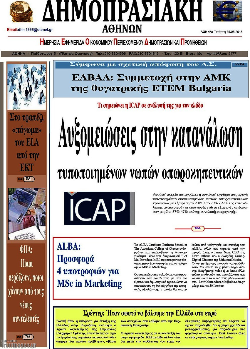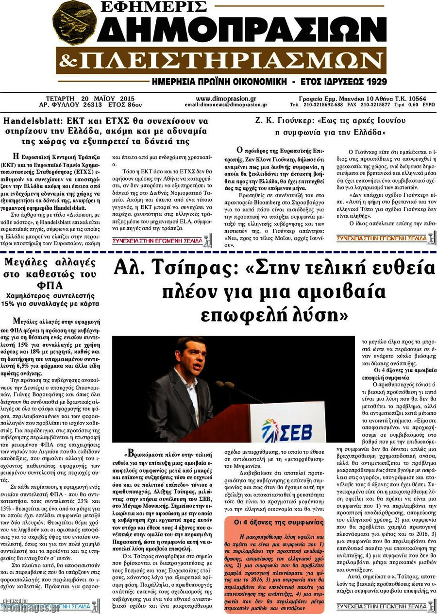 Οι οικονομικές εφημερίδες 20/5/2015 Enikos Newsroom 07:22, Τετάρτη 20 Μαΐου 2015 Media Διαβάστε τα σημερινά πρωτοσέλιδα των οικονομικών εφημερίδων: ΟΙΚΟΝΟΜΙΚΕΣ ΕΦΗΜΕΡΙΔΕΣ ΠΡΩΤΟΣΕΛΙΔΑ Μοιράσου το: σχολίασε κι εσύ (0 σχόλια) Ακολουθήστε το enikos.gr στο Google News και μάθετε πρώτοι όλες τις ειδήσεις Δείτε όλες τις τελευταίες ειδήσεις από την Ελλάδα και τον Κόσμο στο enikos.gr Ειδήσεις Ροή Ειδήσεων 3 ώρες πριν Η κοινή διακήρυξη Ελλάδας – Κύπρου – Ισραήλ: Ενίσχυση αμυντικής συνεργασίας, δέσμευση για τον Great Sea Inteconnector – Τα μηνύματα της τριμερούς Συνόδου 2 ώρες πριν Αγρότες: Bάζουν στην άκρη τα τρακτέρ ενόψει Χριστουγέννων, θέμα ασφαλείας εγείρει η αστυνομία – Οι αναδιατάξεις που θα γίνουν από την Τρίτη 3 ώρες πριν Νεκρός ο άνδρας που έπεσε στις ράγες του Ηλεκτρικού στα Κάτω Πατήσια 5 ώρες πριν Αλεξανδρούπολη: Μήνυση υπέβαλε ο παππούς του 3χρονου που πέθανε από ασιτία – Αναζητούνται οι δράστες που τον ξυλοκόπησαν 1 ώρα πριν Ολλανδία: Αυτοκίνητο έπεσε σε πλήθος στην πόλη Νούνσπετ – Τουλάχιστον εννέα τραυματίες – ΦΩΤΟ και ΒΙΝΤΕΟ 2 ώρες πριν Το «μαγικό» υλικό της Αρχαιότητας βρίσκεται ακόμα ανάμεσά μας – Η επιστήμη έλυσε το μυστήριο 4 ώρες πριν Αριθμολογία: Η λέξη που σας χαρακτηρίζει, με βάση την ημερομηνία γέννησής σας – «Είναι η αύρα που εκπέμπετε πριν καν μιλήσετε» 3 ώρες πριν Ύπνος: Γιατρός μοιράζεται τα σημάδια που δείχνουν ότι μπορεί να πάσχετε από «ορμονική αϋπνία» 3 ημέρες πριν Enerwave: Το νέο «ρεύμα» στη λιανική ενέργειας που αλλάζει την εμπειρία του καταναλωτή 15 λεπτά πριν Σωκράτης Πατσίκας: «Είχαμε σβήσει μια τούρτα στην παράσταση που έλεγε “4 – 400” – Το “4” ήταν τα εισιτήρια που είχαμε το πρώτο Σάββατο» 29 λεπτά πριν Παναθηναϊκός: Η «σκληρή» ομιλία και τα «μηνύματα» του Μπενίτεθ στους παίκτες μετά την ήττα από τον ΠΑΟΚ 45 λεπτά πριν ΟΗΕ: Η Ελλάδα και 8 ακόμη χώρες κρούουν τον κώδωνα του κινδύνου για τα δεινά που υφίστανται γυναίκες και κορίτσια στο Σουδάν 56 λεπτά πριν Ανδρέας Μικρούτσικος για την υγεία του: «Κάνω τα σέρβις στο σπίτι με το οξυγόνο, αλλά έχω έναν διάολο μέσα μου» 1 ώρα πριν Ολλανδία: Αυτοκίνητο έπεσε σε πλήθος στην πόλη Νούνσπετ – Τουλάχιστον εννέα τραυματίες – ΦΩΤΟ και ΒΙΝΤΕΟ ENIKOS NETWORK Στέλνετε ακόμα Χριστουγεννιάτικες κάρτες; Τι μπορεί να δείχνει για την προσωπικότητά σας Ενεργειακή αναβάθμιση του νοσοκομείου Πατρών «Ο Άγιος Ανδρέας» ΔΕΔΔΗΕ: Τάσεις αποκλιμάκωσης των ρευματοκλοπών αλλά παραμένουν σε υψηλά επίπεδα – Τι δείχνουν τα τελευταία στοιχεία ΥΠΑΑΤ – Ελληνική Αναπτυξιακή Τράπεζα: Συμφωνία για 3 νέα χρηματοδοτικά εργαλεία με μόχλευση πόρων 365 εκατ. ευρώ Ο Google Assistant θα παραμείνει λίγο περισσότερο για ορισμένους χρήστες Android Τεστ προσωπικότητας: Το βάζο που θα επιλέξετε αποκαλύπτει πώς λύνετε προβλήματα στη ζωή σας περισσότερα 20:16 , Δευτέρα 22 Δεκεμβρίου 2025 «Το παιδί από την αρχή»: Special edition επεισόδια της επιτυχημένης σειράς αρχίζουν από σήμερα στην ΕΡΤ1 «Το παιδί», η ξεχωριστή σειρά της ΕΡΤ1 με στοιχεία μαύρης κωμωδίας, που φέρει την υπογραφή του... 19:41 , Δευτέρα 22 Δεκεμβρίου 2025 Porto Leone: Στη γειτονιά με τα κόκκινα φανάρια – Η Αλεξάνδρα ανακαλύπτει το μυστικό της Γαλήνης και της στήνει παγίδα Απόψε στις 22:30 στον Alpha η συγκλονιστική συνέχεια της δραματικής σειράς του Apha «Porto Leo... 19:16 , Δευτέρα 22 Δεκεμβρίου 2025 Άγιος έρωτας: Η Πετρούλα αφήνει την τελευταία της πνοή Καθηλώνει το προτελευταίο επεισόδιο της χρονιάς της σειράς “Άγιος Έρωτας” απόψε στ... 18:39 , Δε