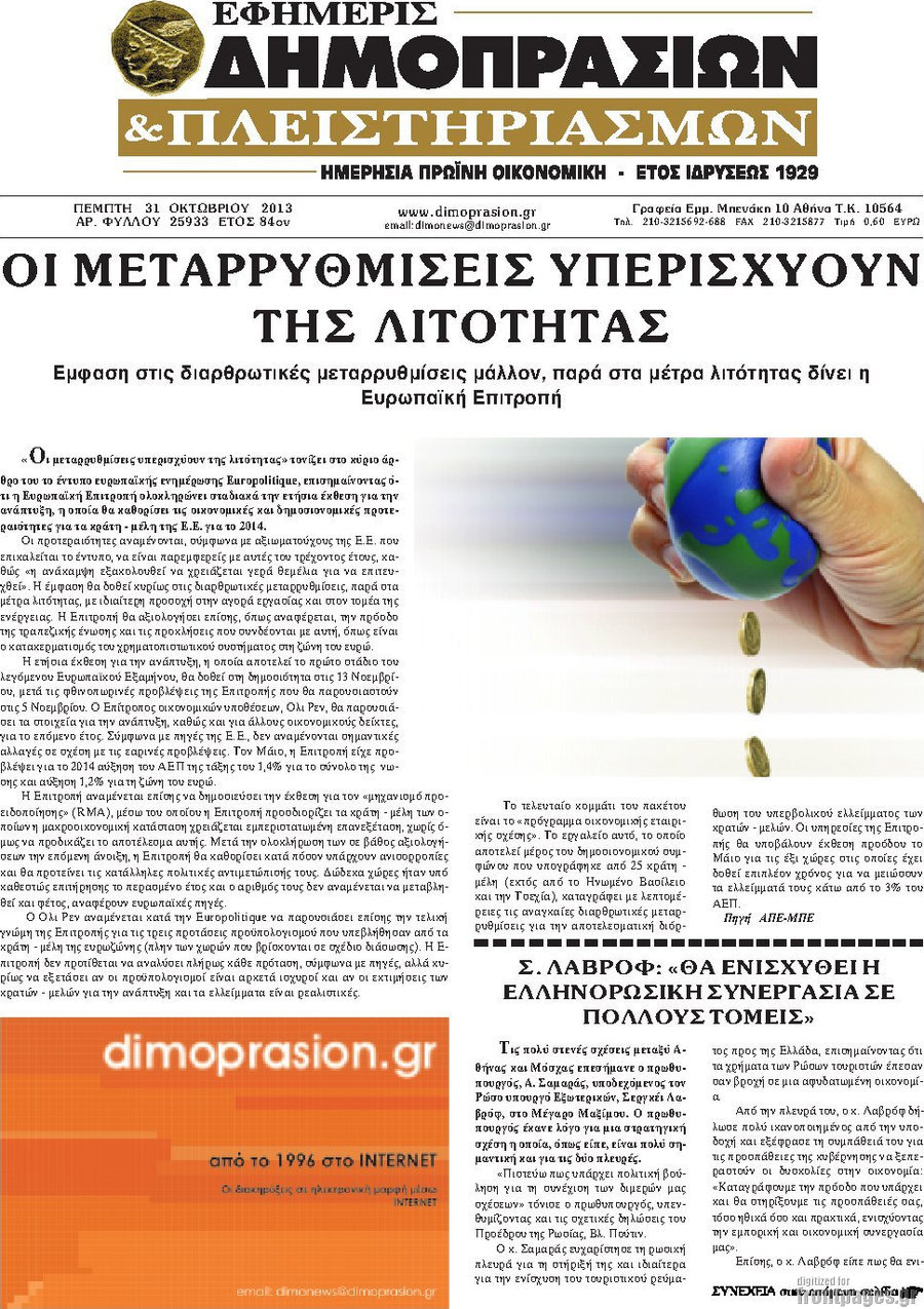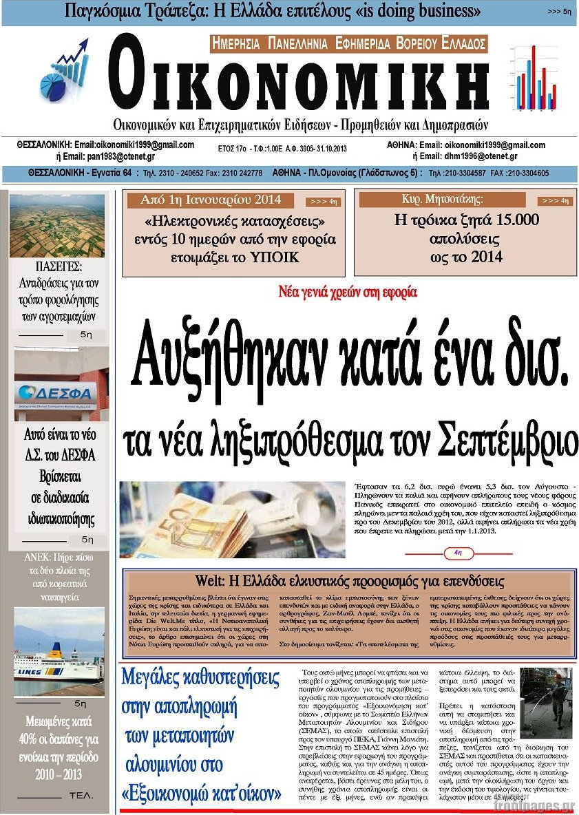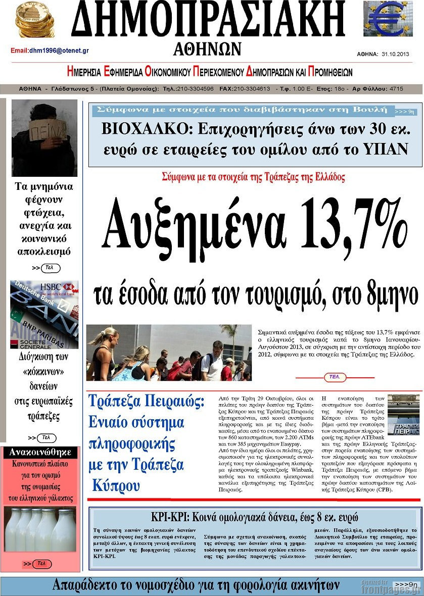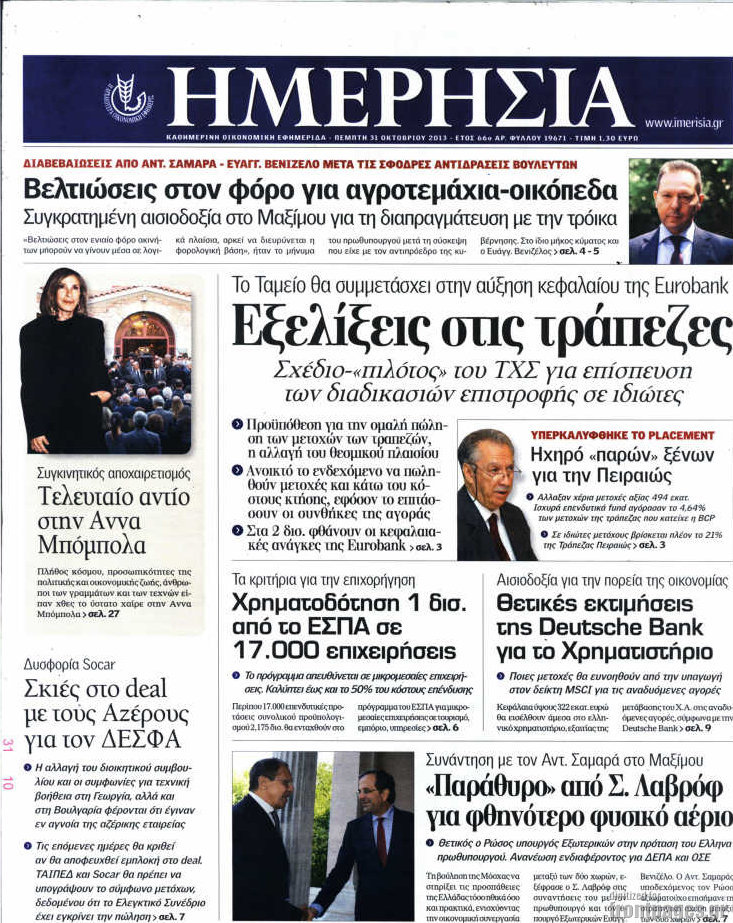 Οι oικονομικές εφημερίδες Enikos Newsroom 08:45, Πέμπτη 31 Οκτωβρίου 2013 Media Οι oικονομικές εφημερίδες Διαβάστε τα πρωτοσέλιδα των οικονομικών εφημερίδων: ΕΦΗΜΕΡΙΔΕΣ ΟΙΚΟΝΟΜΙΚΕΣ ΕΦΗΜΕΡΙΔΕΣ ΠΡΩΤΟΣΕΛΙΔΑ Μοιράσου το: σχολίασε κι εσύ (0 σχόλια) Ακολουθήστε το enikos.gr στο Google News και μάθετε πρώτοι όλες τις ειδήσεις Δείτε όλες τις τελευταίες ειδήσεις από την Ελλάδα και τον Κόσμο στο enikos.gr Ειδήσεις Ροή Ειδήσεων 3 ώρες πριν Η Ουκρανία χτύπησε τάνκερ του σκιώδους στόλου της Ρωσίας στη Μεσόγειο – Έπλεε νότια της Κρήτης 1 ώρα πριν Πούτιν: Σαρκαστικά μηνύματα, παράπονα και απρόοπτα στη συνέντευξη Τύπου – Η πρόταση γάμου on air και οι ερωτήσεις για τα αγγούρια και τους… εξωγήινους 2 ώρες πριν Η απάντηση της κυβέρνησης στα αιτήματα των αγροτών: 16+4 υλοποιούνται ή βρίσκονται υπό επεξεργασία για να βρεθεί λύση – 7 δεν μπορούν να επιλυθούν 2 ώρες πριν Θεσσαλονίκη: Στη φυλακή ο 44χρονος που κατηγορείται ότι προσπάθησε να πνίξει με κορδόνι την 34χρονη σύντροφό του 2 ώρες πριν Εξώδικο επιχειρηματία στον Γιώργο Μαζωνάκη – Τι απαντά στις καταγγελίες του τραγουδιστή 52 λεπτά πριν Τα 5 ζώδια που ευνοούνται στην ερωτική ζωή τους την επόμενη εβδομάδα – «Η ενέργεια του Αιγόκερου φέρνει αγάπη και σταθερότητα» 6 ώρες πριν Γεμάτος νεροχύτης; 5 σοβαρές ευθύνες που «φοβίζουν» όσους αφήνουν άπλυτα πιάτα 5 ώρες πριν Ειδικός μοιράζεται 6 κόλπα για να διατηρείστε σε φόρμα με πάνω από 40 ώρες εργασίας την εβδομάδα: «Προπονηθείτε πριν από τη δουλειά, όχι μετά» 2 ημέρες πριν 20 χρόνια τα Χριστούγεννα ξεκινούν στα Public με μεγάλη ποικιλία σε δώρα! 1 λεπτό πριν ΟΠΑΠ: Φρέσκια και δυναμική καμπάνια για το Υπεύθυνο Παιχνίδι με Χριστουγεννιάτικη διάθεση 3 λεπτά πριν ΟΗΕ: Δεν υπάρχει πλέον λιμός στη Γάζα αλλά η επισιτιστική ανασφάλεια παραμένει 10 λεπτά πριν Τραγωδία στη Λάρισα: Νεκρή γυναίκα που παρασύρθηκε από φορτηγό 15 λεπτά πριν Κασπία Θάλασσα: Ουκρανικά πλήγματα με drones σε ρωσική εξέδρα άντλησης πετρελαίου 19 λεπτά πριν Μαρινάκης για το «όχι» του ΠΑΣΟΚ στην ένταξη του ΟΠΕΚΕΠΕ στην ΑΑΔΕ: «Εκτεθειμένος ο κ. Ανδρουλάκης απέναντι στους αγρότες» ENIKOS NETWORK Τάξη στις ιατρικές διαφημίσεις για την προστασία των πολιτών βάζει ο ΙΣΑ Μακροζωία: Τι παίζει πιο σημαντικό ρόλο ακόμα και από την διατροφή και την άσκηση, σύμφωνα με μελέτη Παπαθανάσης για νέο Εθνικό Πρόγραμμα Ανάπτυξης 2026-2030: Είναι υπερδιπλάσιο από αυτό της προηγούμενης προγραμματικής περιό... Βουλή: Υπερψηφίστηκε το νομοσχέδιο για τη μετάβαση του ΟΠΕΚΕΠΕ στην ΑΑΔΕ Χαρτογραφώντας το «σημείο χωρίς επιστροφή»: Για πρώτη φορά αποκαλύπτεται με λεπτομέρεια το ακανθώδες όριο της ατμόσφαιρας τ... Η Google καταργεί τη λειτουργία «dark web report» – Πώς θα μπορούν οι χρήστες να διαγράφουν τα δεδομένα τους περισσότερα 15:15 , Παρασκευή 19 Δεκεμβρίου 2025 Την Κυριακή με τη Realnews: Ό,τι και αν αγοράσεις, σκανάρεις και κερδίζεις! Την Κυριακή με τη Realnews: Ό,τι και αν αγοράσεις, σκανάρεις και κερδίζεις! Με το PADU app, το... 08:00 , Παρασκευή 19 Δεκεμβρίου 2025 Την Κυριακή με τη Realnews: Δωροεπιταγή 10€ Δωροεπιταγή αξίας 10€ για αγορές άνω των 60€ από τα πολυκαταστήματα FactoryOutlet H προσφορά ι... 05:48 , Παρασκευή 19 Δεκεμβρίου 2025 Οι οικονομικές εφημερίδες 19/12/2025 Διαβάστε τα πρωτοσέλιδα από τις οικονομικές εφημερίδες, σήμερα 19/12/2025. 05:43 , Παρασκευή 19 Δεκεμβρίου 2025 Οι αθλητικές εφημερίδες 19/12/2025 Διαβάστε τα πρωτοσέλιδα από τις αθλητικές εφημερίδες, σήμερα 19/12/2025. ΤΕΛΕΥΤΑΙΕΣ ΕΙΔΗΣΕΙΣ 10 λεπτά πριν Τραγωδία στη Λάρισα: Ν