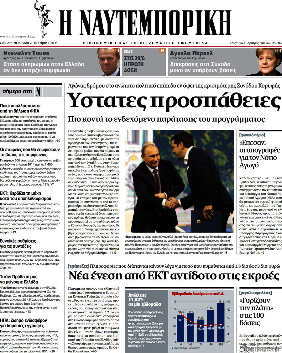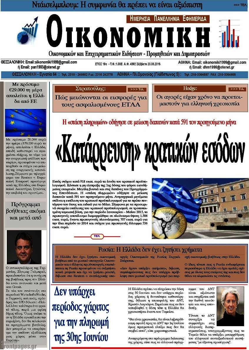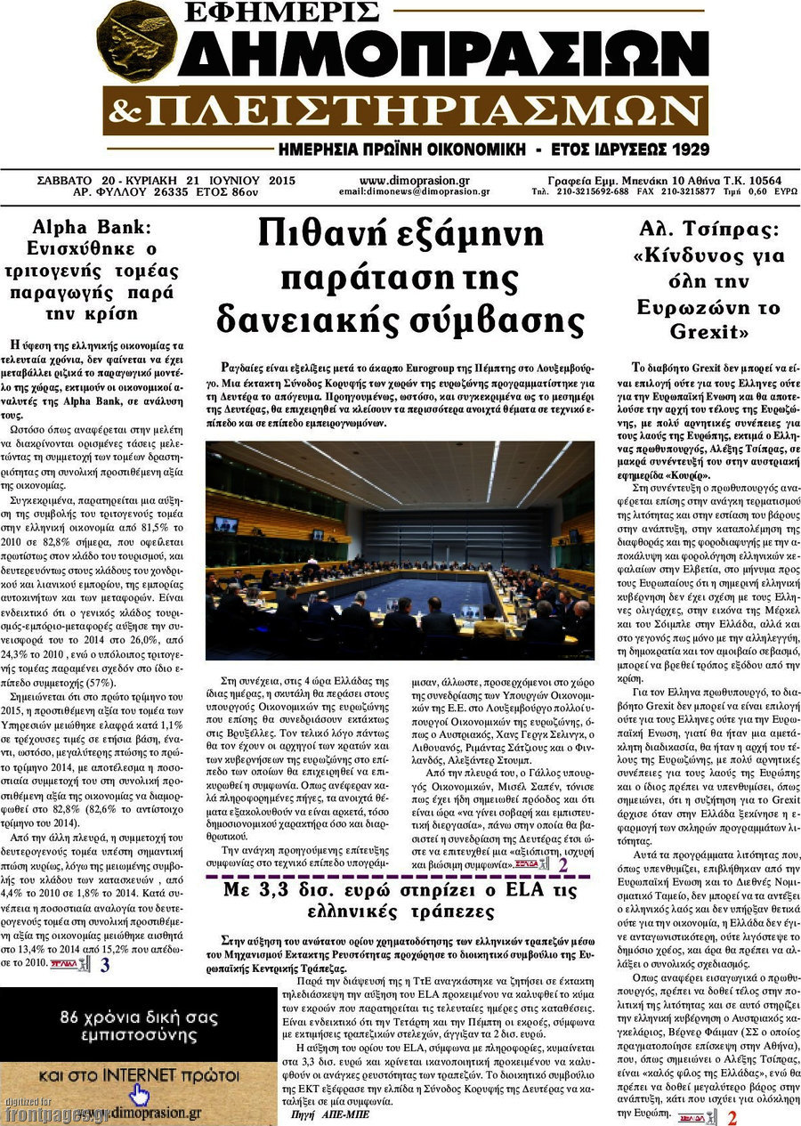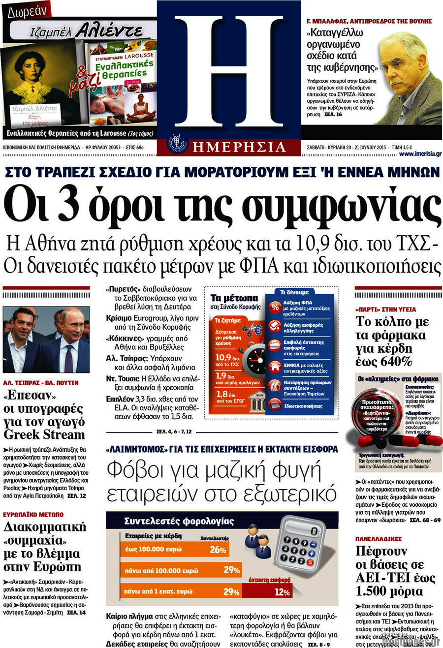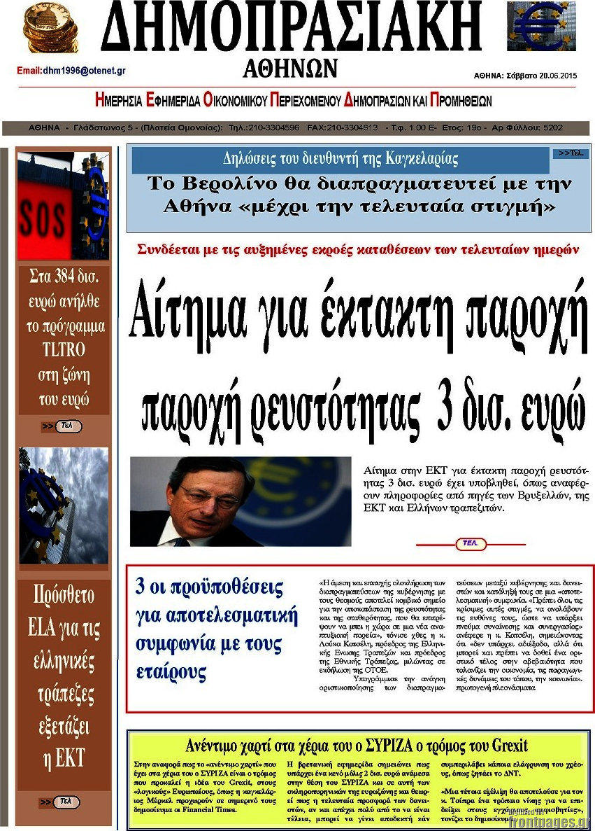 Οι οικονομικές εφημερίδες 20/6/2015 Enikos Newsroom 07:57, Σάββατο 20 Ιουνίου 2015 Media Διαβάστε τα σημερινά πρωτοσέλιδα των οικονομικών εφημερίδων: ΕΦΗΜΕΡΙΔΕΣ ΟΙΚΟΝΟΜΙΚΕΣ ΕΦΗΜΕΡΙΔΕΣ ΠΡΩΤΟΣΕΛΙΔΑ Μοιράσου το: σχολίασε κι εσύ (0 σχόλια) Ακολουθήστε το enikos.gr στο Google News και μάθετε πρώτοι όλες τις ειδήσεις Δείτε όλες τις τελευταίες ειδήσεις από την Ελλάδα και τον Κόσμο στο enikos.gr Ειδήσεις Ροή Ειδήσεων 7 ώρες πριν Μητσοτάκης: Αναγκαία η μεταρρύθμιση του πρωτογενούς τομέα – Τα 6 νέα μέτρα για το στεγαστικό και οι αναφορές σε «Ιθάκη» και «πολιτικούς του καναπέ» 6 ώρες πριν Δάνεια σε ελβετικό φράγκο: Τα βασικά σημεία της ρύθμισης – ανάσας για 40.000 δανειολήπτες – Αναλυτικός οδηγός με ερωτήσεις και απαντήσεις 6 ώρες πριν Κυψέλη: Εξιτήριο πήρε η 14χρονη μαθήτρια που μαχαιρώθηκε από την 16χρονη σε σχολείο – «Θέλω να βοηθήσω το παιδί, έχει μπλέξει με κακές παρέες» 6 ώρες πριν Τραμπ: Γιατί κατέθεσε τώρα την αγωγή κατά του BBC – Πώς η κίνησή του εξυπηρετεί το νέο δόγμα του για «αντίσταση» στην Ευρώπη, υπέρ των συντηρητικών 7 ώρες πριν ΟΠΕΚΕΠΕ – Παράνομες επιδοτήσεις: Ελεύθεροι με περιοριστικούς όρους και οι 7 κατηγορούμενοι που απολογήθηκαν σήμερα 6 ώρες πριν Ανακαλύφθηκε βυθισμένη πέτρινη κατασκευή ανοιχτά της Κριμαίας – Αποτελεί μέρος αρχαίας ελληνικής αποικίας 7 ώρες πριν Ύπνος: Αυτό μπορεί να είναι το χειρότερο λάθος για το βιολογικό ρολόι σας, σύμφωνα με ειδικό 8 ώρες πριν Αριθμολογία: Οι άνθρωποι που έχουν γεννηθεί αυτές τις 3 ημερομηνίες, προσελκύουν μεγάλη τύχη πριν από το τέλος του 2025 10 ώρες πριν Οι 7 συμπεριφορές που μαρτυρούν ότι ένας άνδρας επενδύει μακροπρόθεσμα σε μια σχέση 5 λεπτά πριν Παλαιστινιακό: «Η λύση των δύο κρατών είναι ο μόνος βιώσιμος δρόμος», τόνισε η Ελλάδα στο Συμβούλιο Ασφαλείας του ΟΗΕ 12 λεπτά πριν Ελένη Καρακάση: «Ένιωθα πολύ αδικημένη, δεν μπορούσα να ελέγξω τον εαυτό μου σε δύσκολες στιγμές» 20 λεπτά πριν Κλαούδια Σέινμπαουμ προς Ντόναλντ Τραμπ για φαιντανύλη: Να επιτεθούμε στα αίτια κατανάλωσης αντί να την κατατάσσουμε στα «όπλα μαζικής καταστροφής» 28 λεπτά πριν Ρωσία: Ουκρανική επίθεση με drones στο Κρασνοντάρ – Δύο τραυματίες, ζημιές σε σπίτια και διακοπή ρεύματος 37 λεπτά πριν Αντόνιο Ταγιάνι: Νομικά εμπόδια για τη χρήση των ρωσικών κεφαλαίων υπέρ της Ουκρανίας ENIKOS NETWORK Αίτημα ΙΣΑ για την εξαίρεση των προσωπικών γιατρών από τις κατ’ οίκον επισκέψεις Η σκανδιναβική μέθοδος στον ύπνο που μπορεί να σώσει έναν γάμο Πιερρακάκης: Ο προϋπολογισμός συμβάλλει ουσιαστικά στην ενίσχυση της αγοραστικής δύναμης της πλειονότητας των εργαζομένων e-ΕΦΚΑ: Παρατείνεται η προθεσμία για την υποβολή ΑΠΔ – Ποιους αφορά Σύγχρονος Νοστράδαμος: Προειδοποιεί για «μεγάλο γεγονός» τους επόμενους μήνες που θα συγκλονίσει τη Βρετανία και τον κόσμο Τεστ παρατηρητικότητας: Μπορείτε να βρείτε τις 3 διαφορές στις εικόνες με έναν πιγκουίνο σε 14 δευτερόλεπτα περισσότερα 20:06 , Τρίτη 16 Δεκεμβρίου 2025 Ο ΣΚΑΙ καταγγέλλει τον ΕΚΚΟΜΕΔ Επιστολή με την οποία καταγράφει την έντονη διαμαρτυρία του προς τον διευθύνοντα σύμβουλο του... 17:40 , Τρίτη 16 Δεκεμβρίου 2025 Eurovision: Στις 4 Ιανουαρίου αποκαλύπτονται τα 28 τραγούδια του ελληνικού τελικού Η αγωνία τελειώνει, η γιορτή της Eurovision αρχίζει στην ΕΡΤ από τις πρώτες ημέρες της νέας χρ... 17:09 , Τρίτη 16 Δεκεμβρίου 2025 Alter Ego Media: Βαθύτατη θλίψη και ειλικρινή συλλυπητήρια για την απώλεια της Ειρήνης Μαρινάκη Τη βαθύτατη θλίψη και τα ειλικρινή συλλ