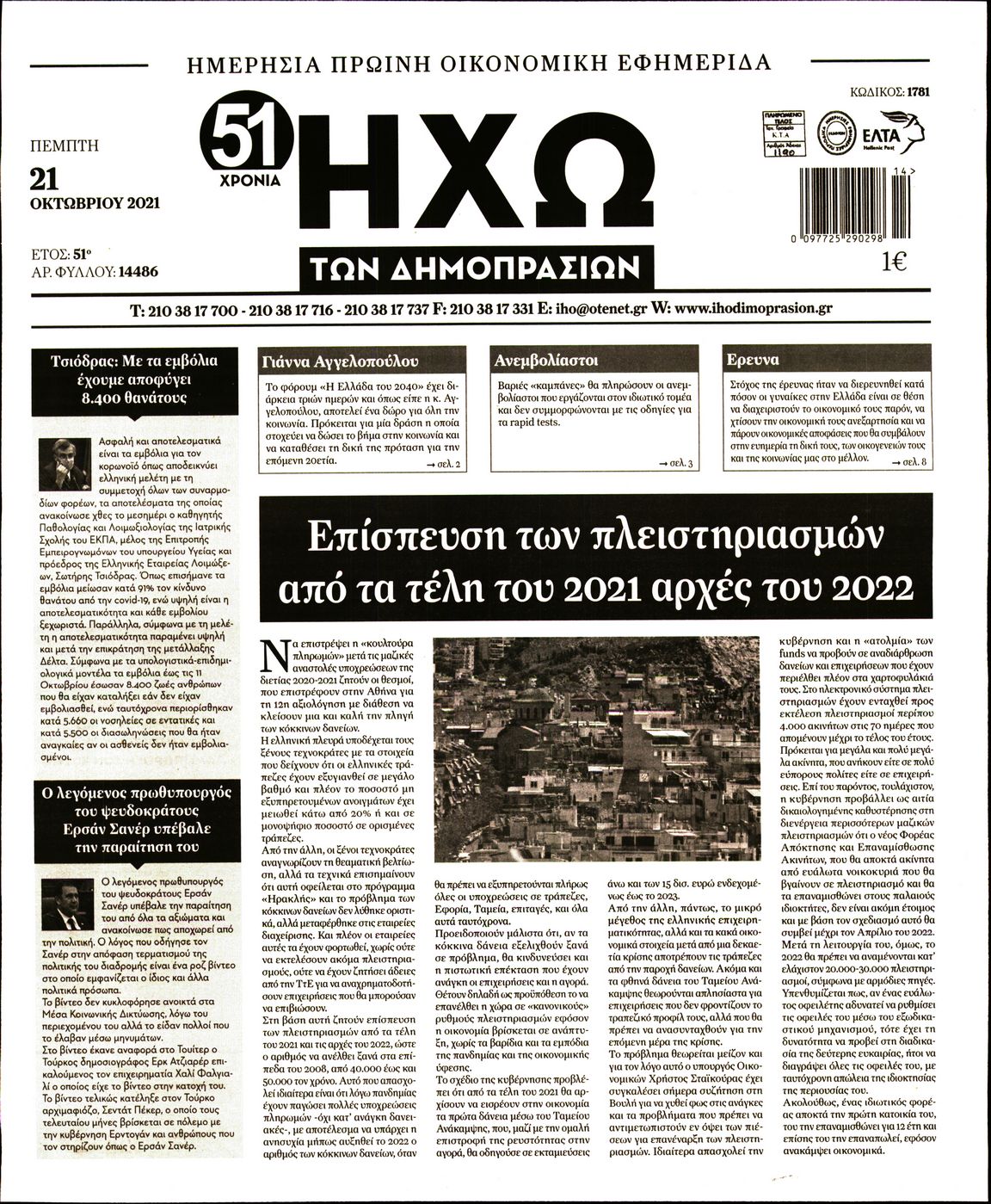 Οι οικονομικές εφημερίδες 21/10/2021 Διονύσης Νίκκας 06:52, Πέμπτη 21 Οκτωβρίου 2021 Media Διαβάστε τα πρωτοσέλιδα από τις οικονομικές εφημερίδες… ΟΙΚΟΝΟΜΙΚΕΣ ΕΦΗΜΕΡΙΔΕΣ Μοιράσου το: σχολίασε κι εσύ (0 σχόλια) Ακολουθήστε το enikos.gr στο Google News και μάθετε πρώτοι όλες τις ειδήσεις Δείτε όλες τις τελευταίες ειδήσεις από την Ελλάδα και τον Κόσμο στο enikos.gr Ειδήσεις Ροή Ειδήσεων 2 ώρες πριν Χριστούγεννα στα μπλόκα: Επιμένουν στις κινητοποιήσεις τους οι αγρότες – Ανοίγουν τα διόδια το Σαββατοκύριακο 3 ώρες πριν Ουκρανία: Η άνευ προηγουμένου επίθεση σε ρωσικό τάνκερ στη Μεσόγειο και το μήνυμα προς στον Πούτιν – Το «μακρύ χέρι» του Κιέβου 2 ώρες πριν Πούτιν: Τα μηνύματα σε Ευρώπη και ΝΑΤΟ από το μαραθώνιο «σόου» του – Η απαίτηση για «σεβασμό» και η ειρήνη «με τους όρους» της Μόσχας 3 ώρες πριν Τραμπ: Δεν αποκλείει την πιθανότητα ενός πολέμου στη Βενεζουέλα – «Ο Μαδούρο ξέρει καλύτερα από τον καθένα τι ακριβώς θέλω» 3 ώρες πριν Συνεχίζει να προκαλεί ο Μίτσκοσκι: «Για μένα το όνομα Μακεδονία είναι ιερό» 2 ώρες πριν Ανακαλύφθηκαν αρχαία χρυσά νομίσματα 2.200 ετών που απεικονίζουν τον θεό Απόλλωνα – Η άγνωστη σύνδεση με τον Φίλιππο Β΄ της Μακεδονίας 3 ώρες πριν Ύπνος: Μια κρυφή κατάσταση του εγκεφάλου πριν από τον ύπνο μπορεί να είναι το “κλειδί” για υψηλή ευφυΐα και δημιουργικότητα 4 ώρες πριν Αριθμολογία: Οι άνθρωποι που έχουν γεννηθεί αυτές τις 4 ημερομηνίες, συχνά παρεξηγούνται – «Η καλοσύνη τους κρύβει τεράστια δύναμη» 5 ώρες πριν Ξεχάστε το καθάρισμα το Σαββατοκύριακο: Ο «κανόνας των 20 λεπτών» που θα σας λύσει τα χέρια 6 λεπτά πριν Μπαρτσελόνα – Μπασκόνια 134-124: Οι «μπλαουγκράνα» πήραν το ματς της χρονιάς ύστερα από τρεις παρατάσεις 21 λεπτά πριν Φαίη Σκορδά: «Παλιότερα τα κομπλιμέντα τα προσπερνούσα, τώρα τα έχω ανάγκη» 36 λεπτά πριν Βασίλης Σπανούλης: Δεν εμφανίστηκε ούτε ένας δημοσιογράφος στην συνέντευξη Τύπου – «Καλησπέρα στον… κανέναν», δείτε βίντεο 48 λεπτά πριν Πόλεμος στην Ουκρανία: Εφτά νεκροί από ρωσική πυραυλική επίθεση στο λιμάνι της Οδησσού 51 λεπτά πριν ΗΠΑ: Η κυβέρνηση του Ντόναλντ Τραμπ άρχισε να δημοσιοποιεί τα αρχεία Έπσταϊν ENIKOS NETWORK Το ΕΚΑΒ τιμήθηκε από την Ακαδημία Αθηνών για τα 40 χρόνια προσφοράς του Έχετε πραγματικά μεγάλη καρδιά; 10 χαρακτηριστικά όσων έχουν καλοσύνη Αναστολή μέτρων αναγκαστικής εκτέλεσης για κτηνοτρόφους που πλήττονται από την ευλογιά των αιγοπροβάτων Πλήρης επάρκεια προϊόντων στις λαϊκές της Αττικής, παρά τις αγροτικές κινητοποιήσεις – Τι απαντούν οι πωλητές Χαρτογραφώντας το «σημείο χωρίς επιστροφή»: Για πρώτη φορά αποκαλύπτεται με λεπτομέρεια το ακανθώδες όριο της ατμόσφαιρας τ... Η Google καταργεί τη λειτουργία «dark web report» – Πώς θα μπορούν οι χρήστες να διαγράφουν τα δεδομένα τους περισσότερα 22:42 , Παρασκευή 19 Δεκεμβρίου 2025 Γιώργος Γιαννόπουλος για “Το σόι σου”: “Είναι ευτυχία και ευλογία αυτή η σειρά” «Είναι ευτυχία και ευλογία η συγκυρία αυτής της σειράς», θα πει ο Γιώργος Γιαννόπουλος -ο αγαπ... 20:37 , Παρασκευή 19 Δεκεμβρίου 2025 Don’t Forget The Lyrics: Η Έλλη Κοκκίνου υποδέχεται 4 παίκτες που θα κάνουν τα πάντα για να μη χάσουν ούτε… μισή λέξη από τους στίχους Το «Don’t Forget The Lyrics» επιστρέφει απόψε, Παρασκευή 19 Δεκεμβρίου, στις 21:00 με νέο επει... 19:31 , Παρασκευή 19 Δεκεμβρίου 2025 GNTM: Απόψε ο μεγάλος τελικός για τους 4 φιναλίστ Έπειτα από μήνες γεμάτους μόδα, δημιουργία και έντονες αναμετρήσεις, το GNTM 2025 κορυφώνεται,... 18:11 , Παρασκευ