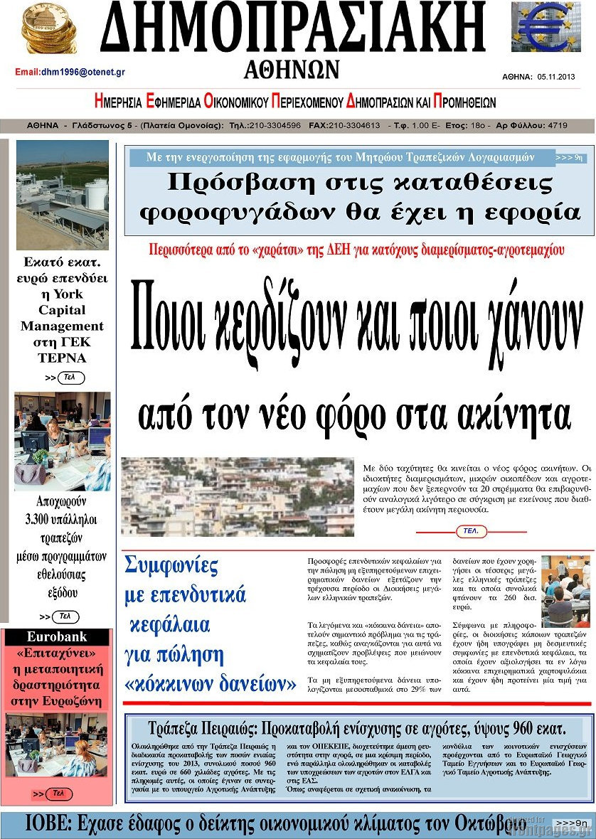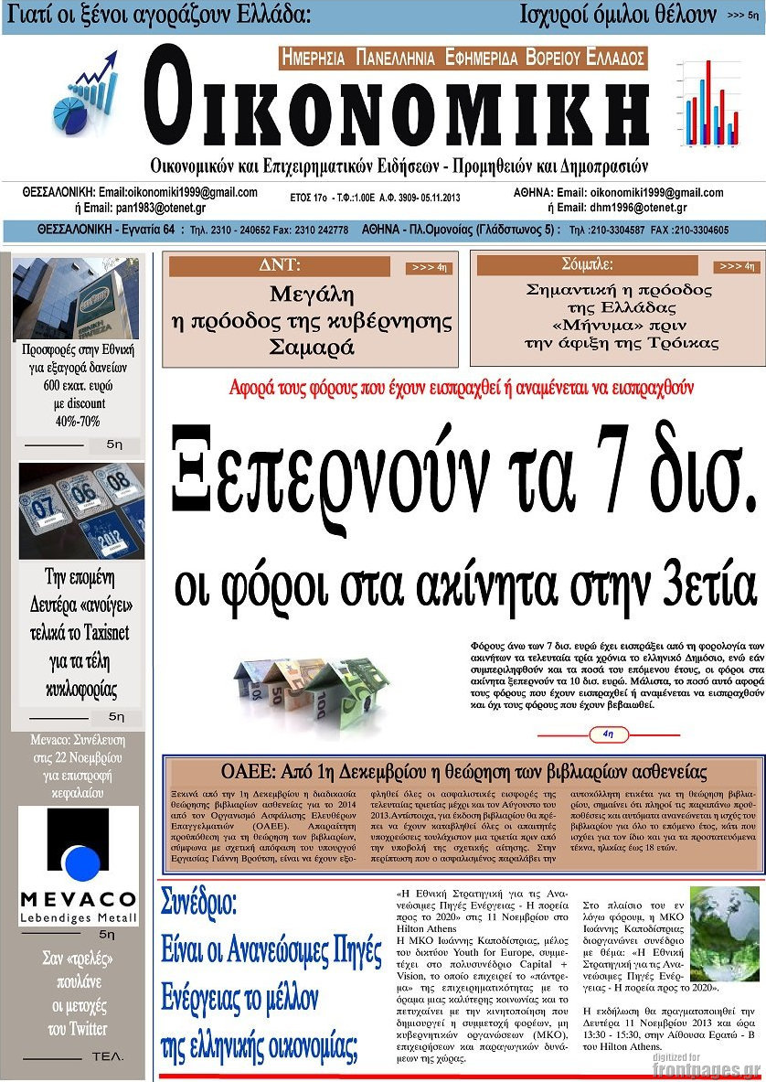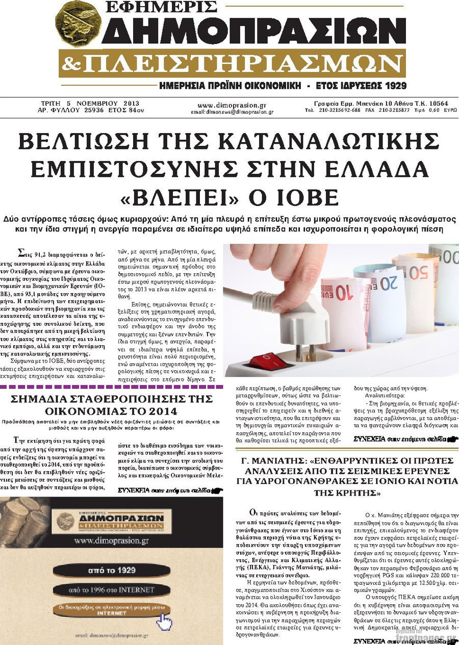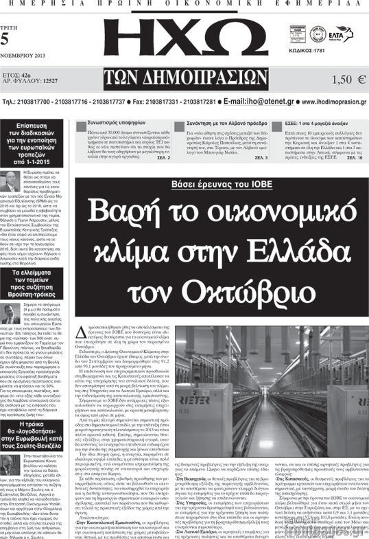 Οι oικονομικές εφημερίδες Enikos Newsroom 09:01, Τρίτη 05 Νοεμβρίου 2013 Media Οι oικονομικές εφημερίδες Διαβάστε τα πρωτοσέλιδα των οικονομικών εφημερίδων: ΕΦΗΜΕΡΙΔΕΣ ΟΙΚΟΝΟΜΙΚΕΣ ΕΦΗΜΕΡΙΔΕΣ ΠΡΩΤΟΣΕΛΙΔΑ Μοιράσου το: σχολίασε κι εσύ (0 σχόλια) Ακολουθήστε το enikos.gr στο Google News και μάθετε πρώτοι όλες τις ειδήσεις Δείτε όλες τις τελευταίες ειδήσεις από την Ελλάδα και τον Κόσμο στο enikos.gr Ειδήσεις Ροή Ειδήσεων 5 ώρες πριν Μητσοτάκης: Αναγκαία η μεταρρύθμιση του πρωτογενούς τομέα – Τα 6 νέα μέτρα για το στεγαστικό και οι αναφορές σε «Ιθάκη» και «πολιτικούς του καναπέ» 4 ώρες πριν Δάνεια σε ελβετικό φράγκο: Τα βασικά σημεία της ρύθμισης – ανάσας για 40.000 δανειολήπτες – Αναλυτικός οδηγός με ερωτήσεις και απαντήσεις 4 ώρες πριν Κυψέλη: Εξιτήριο πήρε η 14χρονη μαθήτρια που μαχαιρώθηκε από την 16χρονη σε σχολείο – «Θέλω να βοηθήσω το παιδί, έχει μπλέξει με κακές παρέες» 3 ώρες πριν Τραμπ: Γιατί κατέθεσε τώρα την αγωγή κατά του BBC – Πώς η κίνησή του εξυπηρετεί το νέο δόγμα του για «αντίσταση» στην Ευρώπη, υπέρ των συντηρητικών 4 ώρες πριν ΟΠΕΚΕΠΕ – Παράνομες επιδοτήσεις: Ελεύθεροι με περιοριστικούς όρους και οι 7 κατηγορούμενοι που απολογήθηκαν σήμερα 4 ώρες πριν Ανακαλύφθηκε βυθισμένη πέτρινη κατασκευή ανοιχτά της Κριμαίας – Αποτελεί μέρος αρχαίας ελληνικής αποικίας 5 ώρες πριν Ύπνος: Αυτό μπορεί να είναι το χειρότερο λάθος για το βιολογικό ρολόι σας, σύμφωνα με ειδικό 6 ώρες πριν Αριθμολογία: Οι άνθρωποι που έχουν γεννηθεί αυτές τις 3 ημερομηνίες, προσελκύουν μεγάλη τύχη πριν από το τέλος του 2025 8 ώρες πριν Οι 7 συμπεριφορές που μαρτυρούν ότι ένας άνδρας επενδύει μακροπρόθεσμα σε μια σχέση 11 λεπτά πριν ΗΠΑ: Στην αγορά δύο Boeing 747-8 προχωρά η Πολεμική Αεροπορία για την υποστήριξη του προεδρικού στόλου 25 λεπτά πριν Ιταλία: Λεωφορείο έπεσε πάνω σε βιτρίνα καταστήματος στο Τορίνο – Τρεις τραυματίες 40 λεπτά πριν Χαλάνδρι: Καθηγητής έπιασε με κόφτη τα δάχτυλα μαθητή σε κατάληψη – «Μου έχεις πιάσει το χέρι» 56 λεπτά πριν Ουκρανία: Εκρήξεις στο Κίεβο ύστερα από προειδοποίηση για επιδρομή drones 1 ώρα πριν Ορφέας Αυγουστίδης: Η επική ατάκα του γιου του για τα «Φαντάσματα» – «Του λέω “δεν ντρέπεσαι να το λες στον πατέρα σου αυτό;”» ENIKOS NETWORK Αίτημα ΙΣΑ για την εξαίρεση των προσωπικών γιατρών από τις κατ’ οίκον επισκέψεις Η σκανδιναβική μέθοδος στον ύπνο που μπορεί να σώσει έναν γάμο Πιερρακάκης: Ο προϋπολογισμός συμβάλλει ουσιαστικά στην ενίσχυση της αγοραστικής δύναμης της πλειονότητας των εργαζομένων e-ΕΦΚΑ: Παρατείνεται η προθεσμία για την υποβολή ΑΠΔ – Ποιους αφορά Σύγχρονος Νοστράδαμος: Προειδοποιεί για «μεγάλο γεγονός» τους επόμενους μήνες που θα συγκλονίσει τη Βρετανία και τον κόσμο Τεστ παρατηρητικότητας: Μπορείτε να βρείτε τις 3 διαφορές στις εικόνες με έναν πιγκουίνο σε 14 δευτερόλεπτα περισσότερα 20:06 , Τρίτη 16 Δεκεμβρίου 2025 Ο ΣΚΑΙ καταγγέλλει τον ΕΚΚΟΜΕΔ Επιστολή με την οποία καταγράφει την έντονη διαμαρτυρία του προς τον διευθύνοντα σύμβουλο του... 17:40 , Τρίτη 16 Δεκεμβρίου 2025 Eurovision: Στις 4 Ιανουαρίου αποκαλύπτονται τα 28 τραγούδια του ελληνικού τελικού Η αγωνία τελειώνει, η γιορτή της Eurovision αρχίζει στην ΕΡΤ από τις πρώτες ημέρες της νέας χρ... 17:09 , Τρίτη 16 Δεκεμβρίου 2025 Alter Ego Media: Βαθύτατη θλίψη και ειλικρινή συλλυπητήρια για την απώλεια της Ειρήνης Μαρινάκη Τη βαθύτατη θλίψη και τα ειλικρινή συλλυπητήριά της εκφράζει η Alter Ego Media για τον θάνατο ... 13:00 , Τρίτη 16 Δεκεμβρίου
