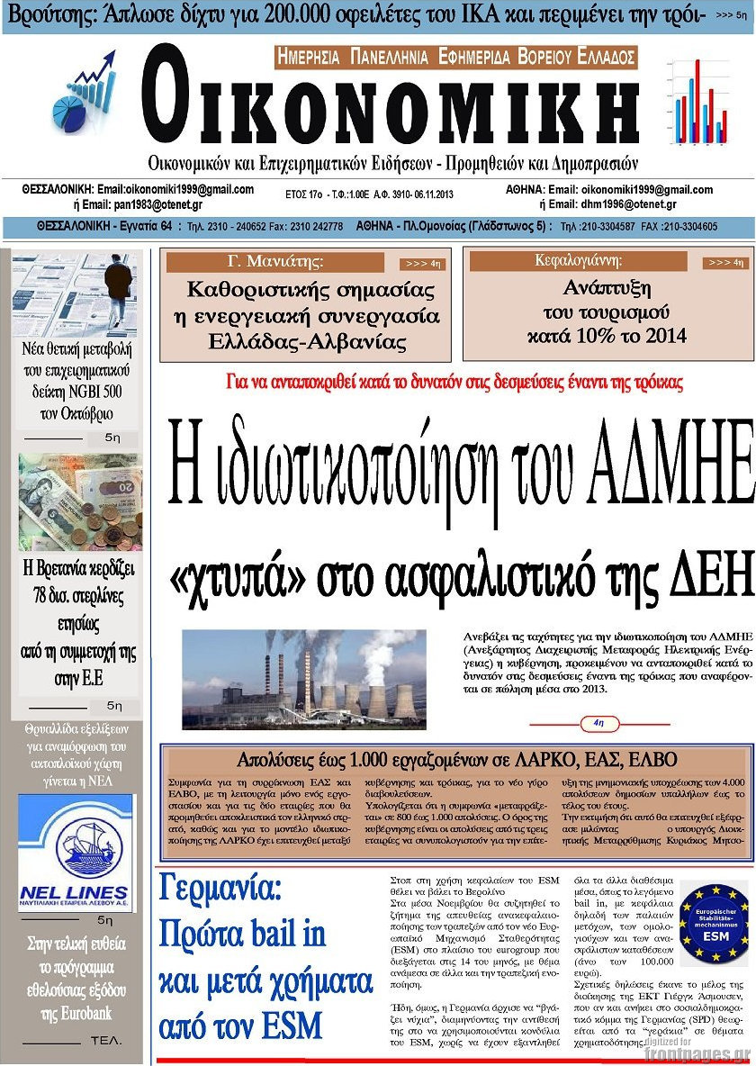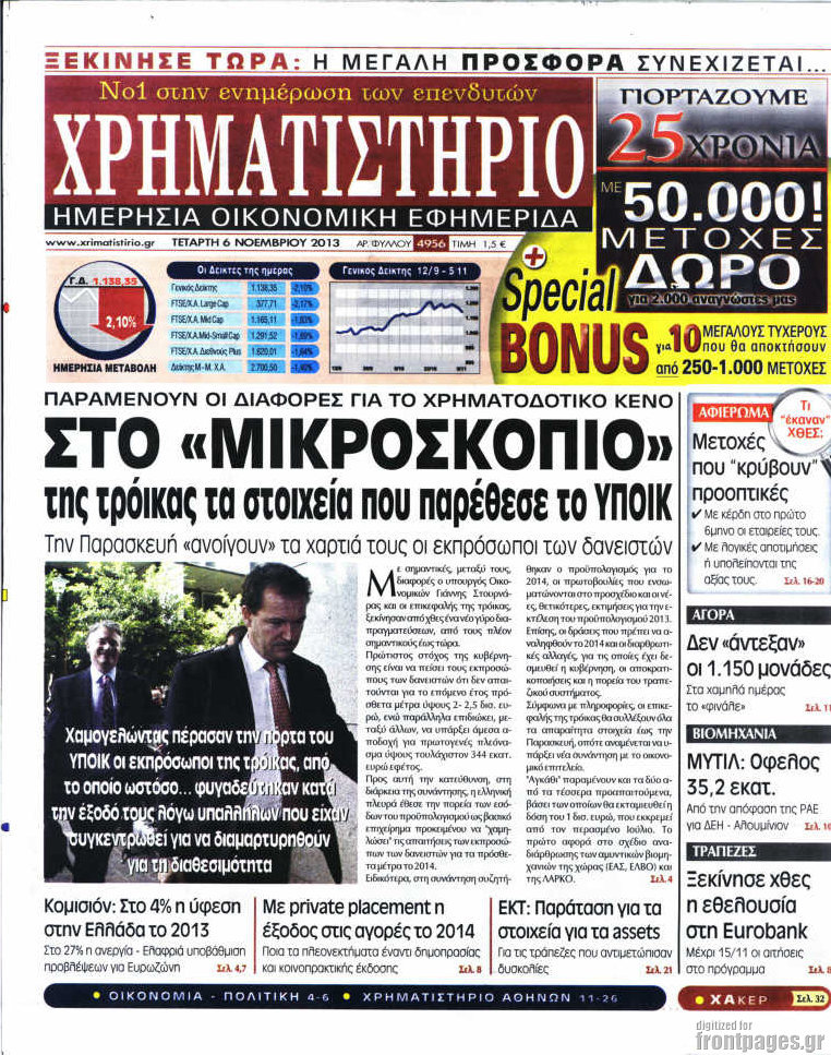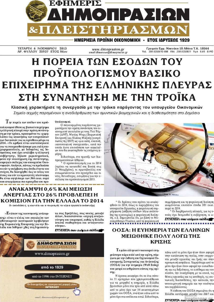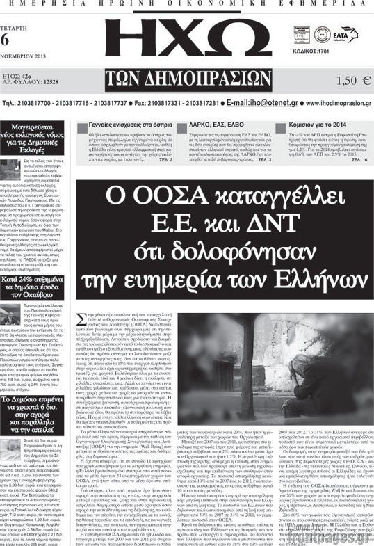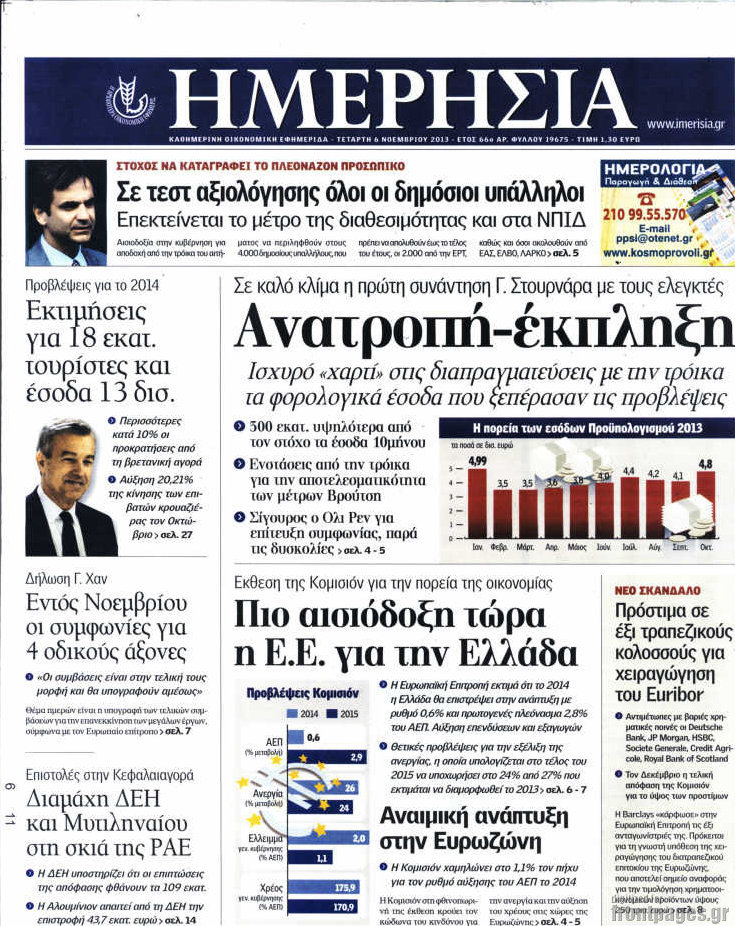 Οι oικονομικές εφημερίδες Enikos Newsroom 09:11, Τετάρτη 06 Νοεμβρίου 2013 Media Οι oικονομικές εφημερίδες Διαβάστε τα πρωτοσέλιδα των οικονομικών εφημερίδων: ΕΦΗΜΕΡΙΔΕΣ ΟΙΚΟΝΟΜΙΚΕΣ ΕΦΗΜΕΡΙΔΕΣ ΠΡΩΤΟΣΕΛΙΔΑ Μοιράσου το: σχολίασε κι εσύ (0 σχόλια) Ακολουθήστε το enikos.gr στο Google News και μάθετε πρώτοι όλες τις ειδήσεις Δείτε όλες τις τελευταίες ειδήσεις από την Ελλάδα και τον Κόσμο στο enikos.gr Ειδήσεις Ροή Ειδήσεων 19 λεπτά πριν Αγρότες: Πολύωροι αποκλεισμοί και σήμερα στα τελωνεία Ευζώνων, Νίκης, Προμαχώνα και Εξοχής 3 ώρες πριν Στεγαστικό: Όλο το σχέδιο για περισσότερα και φθηνότερα ενοικιαζόμενα σπίτια 35 λεπτά πριν Κυψέλη: Μαθητές κλείδωσαν τους καθηγητές μέσα στο Γυμνάσιο μετά την επίθεση με μαχαίρι 1 ώρα πριν Προϋπολογισμός 2026: Τα μηνύματα από την ομιλία Μητσοτάκη και τα «καρφιά» με πολλαπλούς αποδέκτες 1 ώρα πριν Ρομπ Ράινερ: Το δείπνο με τους Ομπάμα που δεν έγινε ποτέ και νέα στοιχεία για τον «καβγά» στο πάρτι – Βίντεο με τον γιο του να περιφέρεται κοντά στο σπίτι της τραγωδίας 4 ώρες πριν Οπτική ψευδαίσθηση: Μόνο αν είσαι ο Σέρλοκ Χολμς θα βρεις τον σκύλο σε 15 δευτερόλεπτα 4 ώρες πριν Τα ζώδια σήμερα, Τετάρτη 17 Δεκεμβρίου: Κριοί, η αυτοπεποίθησή σας ενισχύεται 2 ώρες πριν Νεολιθικός σκύλος βρέθηκε προσεκτικά θαμμένος στον βυθό λίμνης – Δίπλα του βρέθηκε ένα στιλέτο 51 λεπτά πριν Έλαβε τελεσίγραφο από τη σύντροφό του – «Μου είπε πως ή θα της κάνω πρόταση στα δύο χρόνια σχέσης ή θα με χωρίσει» 5 λεπτά πριν Καιρός: Αλλάζει το σκηνικό – Βροχερά τα Χριστούγεννα, κρύο και χιόνια την Πρωτοχρονιά 10 λεπτά πριν Ανδρέας Παναγιωτόπουλος: Δεν ψήφισε στον προϋπολογισμό για να πάει στην εκδήλωση του Αλέξη Τσίπρα – «Μείζονος πολιτικής σημασίας η μεγάλη συγκέντρωση που έκανε» 14 λεπτά πριν Ανδρουλάκης: Τα έξι σημεία του σχεδίου για τον πρωτογενή τομέα που κατέθεσε στη Βουλή 19 λεπτά πριν Αγρότες: Πολύωροι αποκλεισμοί και σήμερα στα τελωνεία Ευζώνων, Νίκης, Προμαχώνα και Εξοχής 24 λεπτά πριν Σύγκληση του Εθνικού Συμβουλίου Εξωτερικής Πολιτικής για τις εξελίξεις στην Ανατολική Μεσόγειο ENIKOS NETWORK Δύο συστατικά που είναι καλό να βάλετε στον πρωινό σας καφέ – Βοηθούν στην απώλεια βάρους και τη ρύθμιση του σακχάρου Πρωτοποριακή θεραπεία για το Αλτσχάιμερ: Φως και ήχος μπορεί να επιβραδύνουν την εξέλιξη της νόσου Λεωφορεία: Στάση εργασίας πραγματοποιούν σήμερα οι εργαζόμενοι-Δείτε τις ώρες Έρχεται «νοικοκύρεμα » στα ακίνητα- Τι πρέπει να γνωρίζουν οι πολίτες Σύγχρονος Νοστράδαμος: Προειδοποιεί για «μεγάλο γεγονός» τους επόμενους μήνες που θα συγκλονίσει τη Βρετανία και τον κόσμο Τεστ παρατηρητικότητας: Μπορείτε να βρείτε τις 3 διαφορές στις εικόνες με έναν πιγκουίνο σε 14 δευτερόλεπτα περισσότερα 09:08 , Τετάρτη 17 Δεκεμβρίου 2025 Τηλεθέαση (16/12): Ανακατατάξεις στην πρωινή ψυχαγωγική ζώνη Ξεκάθαρη πρωτιά στην τηλεθέαση για την «Super Κατερίνα» στο δυναμικό κοινό με ποσοστό 18,5%, α... 08:00 , Τετάρτη 17 Δεκεμβρίου 2025 Την Κυριακή με τη Realnews: Δωροεπιταγή 10€ Δωροεπιταγή αξίας 10€ για αγορές άνω των 60€ από τα πολυκαταστήματα FactoryOutlet H προσφορά ι... 07:00 , Τετάρτη 17 Δεκεμβρίου 2025 Την Κυριακή με τη Realnews: Ό,τι και αν αγοράσεις, σκανάρεις και κερδίζεις! Την Κυριακή με τη Realnews: Ό,τι και αν αγοράσεις, σκανάρεις και κερδίζεις! Με το PADU app, το... 05:48 , Τετάρτη 17 Δεκεμβρίου 2025 Οι οικονομικές εφημερίδες 17/12/2025 Διαβάστε τα πρωτοσέλιδα από τις οικονομικές εφημερίδες, σήμερα 17/12/2025. ΤΕΛΕΥΤΑΙΕΣ ΕΙΔΗΣΕΙΣ 5 λεπτά πριν Καιρ