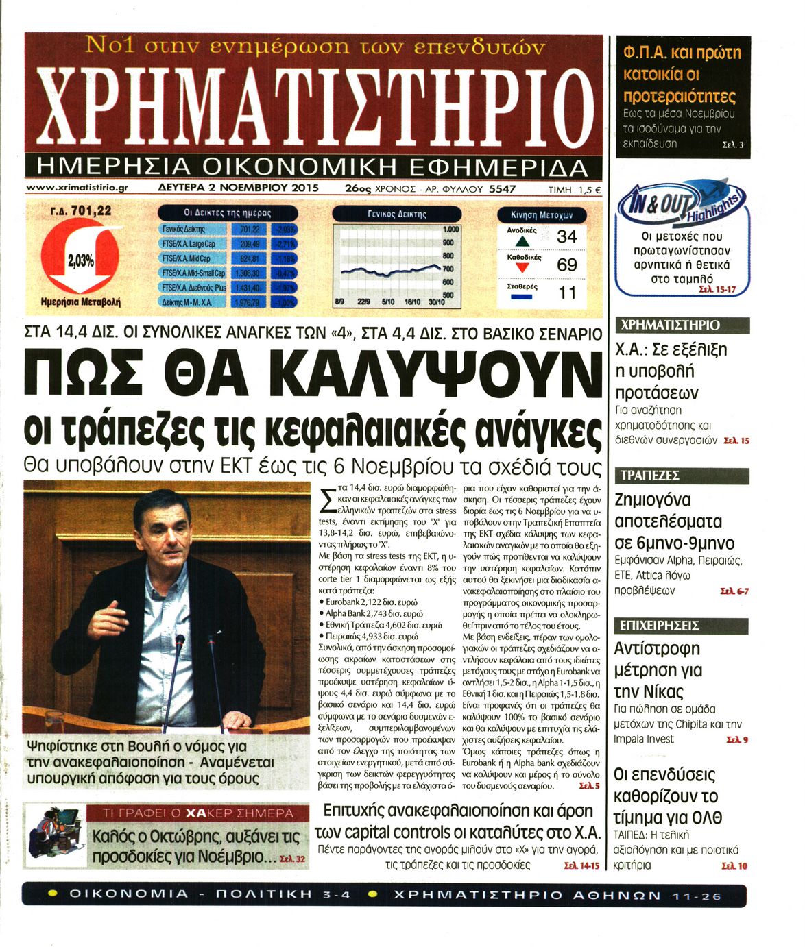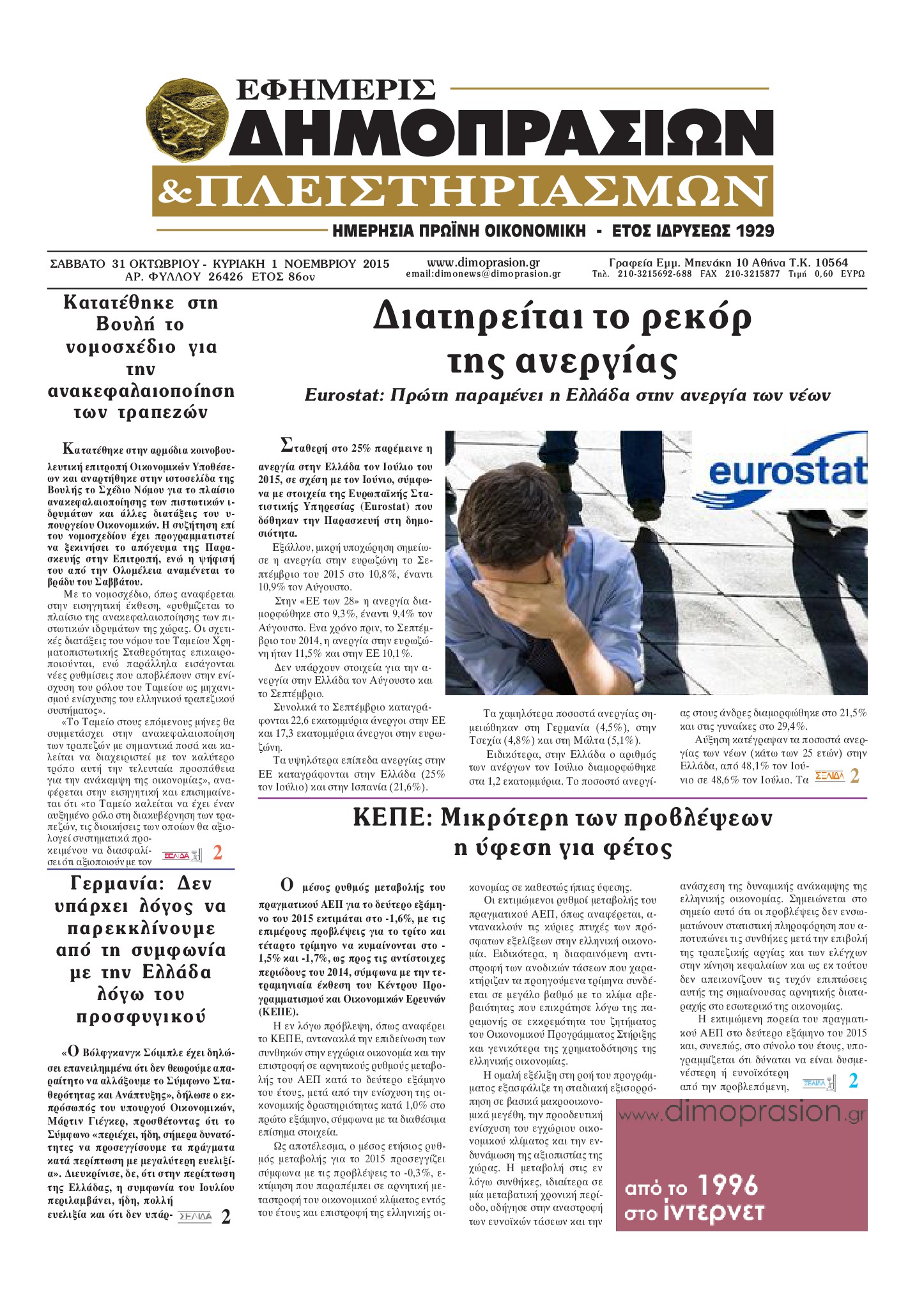 Οι οικονομικές εφημερίδες 2/11/2015 Enikos Newsroom 06:06, Δευτέρα 02 Νοεμβρίου 2015 Media Διαβάστε τα σημερινά πρωτοσέλιδα των οικονομικών εφημερίδων: ΟΙΚΟΝΟΜΙΚΕΣ ΕΦΗΜΕΡΙΔΕΣ ΠΡΩΤΟΣΕΛΙΔΑ Μοιράσου το: σχολίασε κι εσύ (0 σχόλια) Ακολουθήστε το enikos.gr στο Google News και μάθετε πρώτοι όλες τις ειδήσεις Δείτε όλες τις τελευταίες ειδήσεις από την Ελλάδα και τον Κόσμο στο enikos.gr Ειδήσεις Ροή Ειδήσεων 37 λεπτά πριν Φοροδιαφυγή: Ποιοι φορολογούμενοι κινδυνεύουν να πληρώσουν «τσουχτερά» πρόστιμα 15 λεπτά πριν Αγρότες: Ανυποχώρητοι στα μπλόκα – Στις Σέρρες σήμερα η κρίσιμη συνεδρίαση της Πανελλαδικής Επιτροπής 27 λεπτά πριν Τα επίσημα χρονοδιαγράμματα που η Τουρκία θα παραλάβει τα Eurofighter 9 ώρες πριν «Θύελλα» αντιδράσεων για τον Νίκο Παππά μετά την επίθεση στον δημοσιογράφο Νίκο Γιαννόπουλο – Η μήνυση, οι δηλώσεις και η έξοδος από την ευρωομάδα του ΣΥΡΙΖΑ 9 ώρες πριν Politico: Το πρόβλημα της Ευρώπης δεν είναι το Βέλγιο αλλά ο Ντόναλντ Τραμπ 2 ώρες πριν Καούρα: Το μπαχαρικό που είναι «εξίσου αποτελεσματικό» με την ομεπραζόλη, σύμφωνα με ειδικούς 2 ώρες πριν Τα ζώδια σήμερα, Πέμπτη 18 Δεκεμβρίου: Λέοντες, η καρδιά σας θέλει να εκφραστεί 2 ώρες πριν Οπτική ψευδαίσθηση: Μόνο οι πιο έξυπνοι άνθρωποι θα βρουν 7 ξωτικά 15 δευτερόλεπτα 23 ώρες πριν 20 χρόνια τα Χριστούγεννα ξεκινούν στα Public με μεγάλη ποικιλία σε δώρα! 5 λεπτά πριν Την Κυριακή με τη Realnews: Δωροεπιταγή 10€ 57 δευτερόλεπτα πριν Έδεσσα: Χωρίς τις αισθήσεις ανασύρθηκε ηλικιωμένη έπειτα από φωτιά σε μονοκατοικία 6 λεπτά πριν «Το σόι σου»: Backstage στα γυρίσματα για το εορταστικό επεισόδιο 13 λεπτά πριν e-ΕΦΚΑ και ΔΥΠΑ: Προτελευταία ημέρα πληρωμών σήμερα 15 λεπτά πριν Αγρότες: Ανυποχώρητοι στα μπλόκα – Στις Σέρρες σήμερα η κρίσιμη συνεδρίαση της Πανελλαδικής Επιτροπής ENIKOS NETWORK Ουρική αρθρίτιδα: Μεγάλη μελέτη αποκαλύπτει τι μπορεί να προκαλεί τη νόσο Τι σημαίνει όταν ο σκύλος σας σάς φέρνει τυχαία αντικείμενα, σύμφωνα με εκπαιδεύτρια Φοροδιαφυγή: Ποιοι φορολογούμενοι κινδυνεύουν να πληρώσουν «τσουχτερά» πρόστιμα ΕΛΣΤΑΤ: Τι δείχνουν τα νέα στοιχεία για τις ηλεκτρονικές παραγγελίες των επιχειρήσεων Χαρτογραφώντας το «σημείο χωρίς επιστροφή»: Για πρώτη φορά αποκαλύπτεται με λεπτομέρεια το ακανθώδες όριο της ατμόσφαιρας τ... Η Google καταργεί τη λειτουργία «dark web report» – Πώς θα μπορούν οι χρήστες να διαγράφουν τα δεδομένα τους περισσότερα 07:50 , Πέμπτη 18 Δεκεμβρίου 2025 «Το σόι σου»: Backstage στα γυρίσματα για το εορταστικό επεισόδιο «Το σόι σου» φορά τα γιορτινά του για τα Χριστούγεννα και η Όλγα Λαφαζάνη, με την κάμερα του «... 07:36 , Πέμπτη 18 Δεκεμβρίου 2025 Οι αθλητικές μεταδόσεις 18/12/2025 – Πού θα δείτε τον αγώνα της ΑΕΚ με την Κραϊόβα για το Conference League Τα ματς ΑΕΚ – Ουνιβερσιτάτεα Κραϊόβα για το Conference League και Παναθηναϊκός – Χάποελ Τελ Αβ... 05:48 , Πέμπτη 18 Δεκεμβρίου 2025 Οι οικονομικές εφημερίδες 18/12/2025 Διαβάστε τα πρωτοσέλιδα από τις οικονομικές εφημερίδες, σήμερα 18/12/2025. 05:43 , Πέμπτη 18 Δεκεμβρίου 2025 Οι αθλητικές εφημερίδες 18/12/2025 Διαβάστε τα πρωτοσέλιδα από τις αθλητικές εφημερίδες, σήμερα 18/12/2025. ΤΕΛΕΥΤΑΙΕΣ ΕΙΔΗΣΕΙΣ 6 λεπτά πριν «Το σόι σου»: Backstage στα γυρίσματα για το εορταστικό... 13 λεπτά πριν e-ΕΦΚΑ και ΔΥΠΑ: Προτελευταία ημέρα πληρωμών σήμερα 15 λεπτά πριν Αγρότες: Ανυποχώρητοι στα μπλόκα – Στις Σέρρες... 20 λεπτά πριν Οι αθλητικές μεταδόσεις 18/12/2025 – Πού θα δείτε τον... 23 λεπτά πριν Σοβαρό τροχαίο στη Βασιλίσσης Σοφίας: Αυτοκίνητο... 27 λεπτά πριν Τα επίσημα χρο