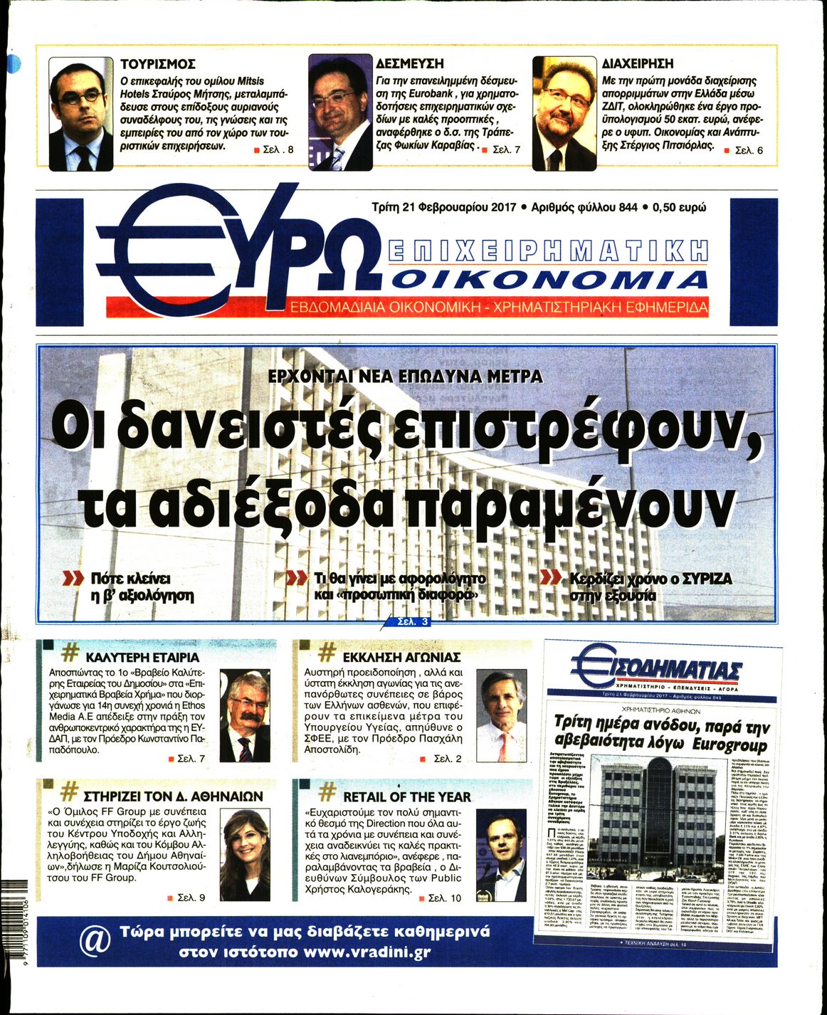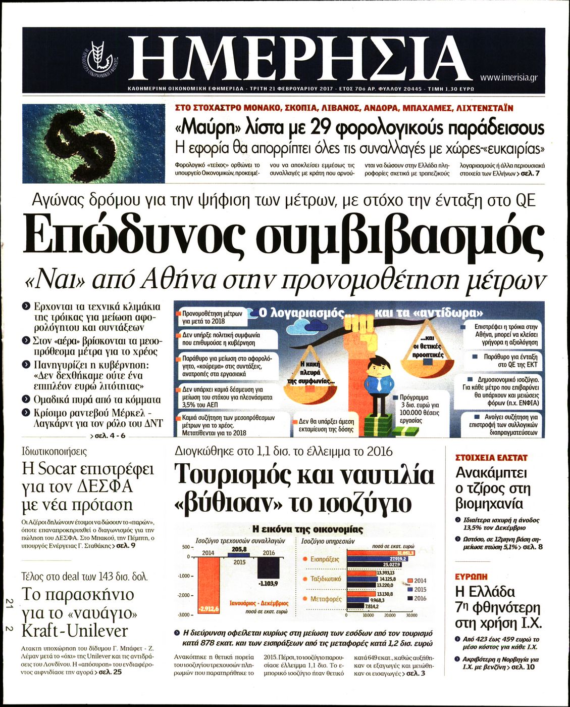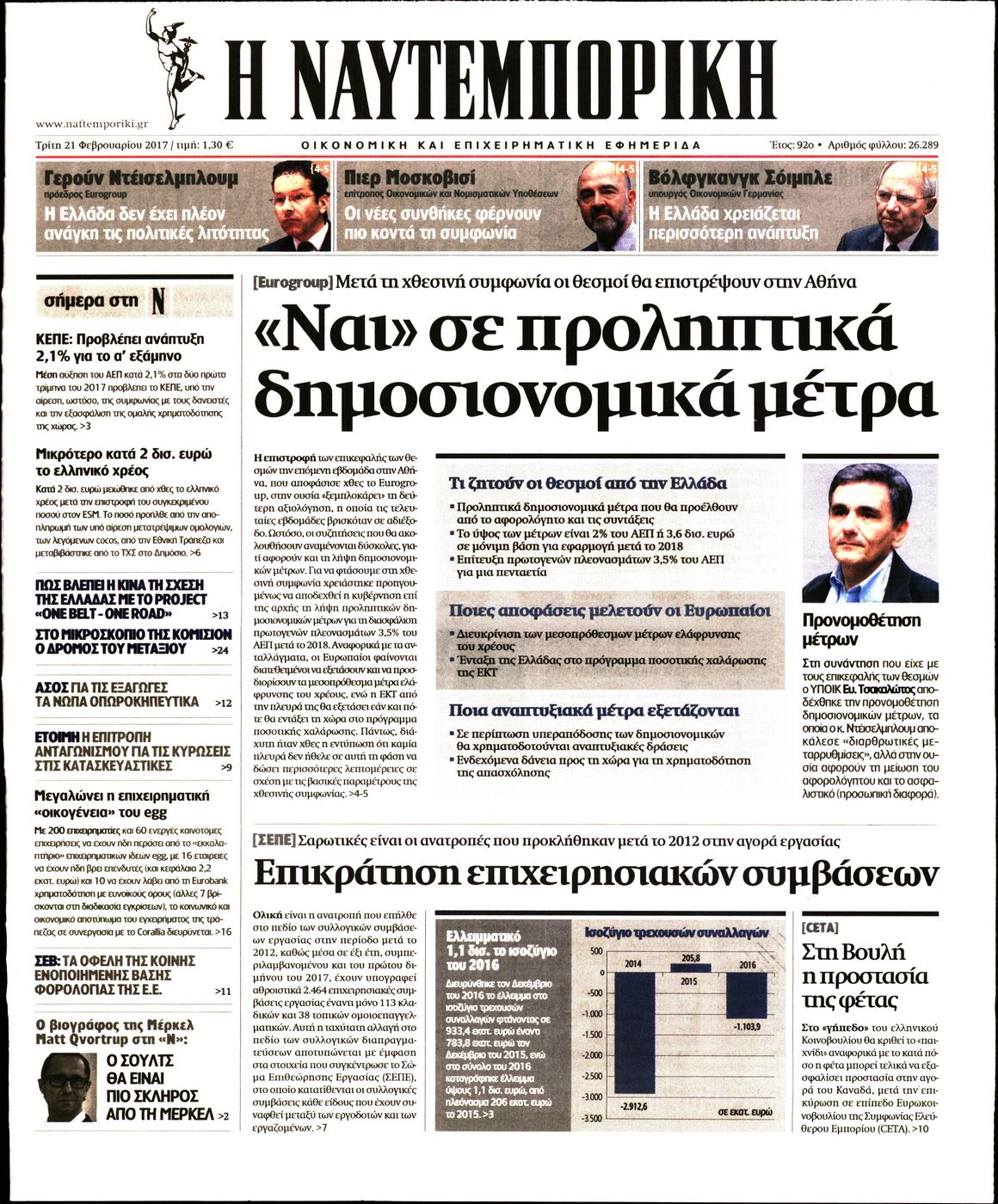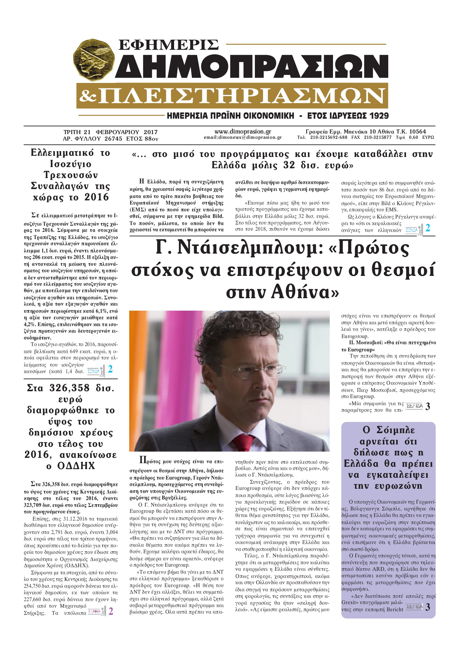 Οι οικονομικές εφημερίδες 21/2/2017 Enikos Newsroom 06:59, Τρίτη 21 Φεβρουαρίου 2017 Media Διαβάστε τα σημερινά πρωτοσέλιδα των οικονομικών εφημερίδων ΟΙΚΟΝΟΜΙΚΕΣ ΕΦΗΜΕΡΙΔΕΣ ΠΡΩΤΟΣΕΛΙΔΑ Μοιράσου το: σχολίασε κι εσύ (0 σχόλια) Ακολουθήστε το enikos.gr στο Google News και μάθετε πρώτοι όλες τις ειδήσεις Δείτε όλες τις τελευταίες ειδήσεις από την Ελλάδα και τον Κόσμο στο enikos.gr Ειδήσεις Ροή Ειδήσεων 5 ώρες πριν Μητσοτάκης: Αναγκαία η μεταρρύθμιση του πρωτογενούς τομέα – Τα 6 νέα μέτρα για το στεγαστικό και οι αναφορές σε «Ιθάκη» και «πολιτικούς του καναπέ» 5 ώρες πριν Δάνεια σε ελβετικό φράγκο: Τα βασικά σημεία της ρύθμισης – ανάσας για 40.000 δανειολήπτες – Αναλυτικός οδηγός με ερωτήσεις και απαντήσεις 4 ώρες πριν Κυψέλη: Εξιτήριο πήρε η 14χρονη μαθήτρια που μαχαιρώθηκε από την 16χρονη σε σχολείο – «Θέλω να βοηθήσω το παιδί, έχει μπλέξει με κακές παρέες» 4 ώρες πριν Τραμπ: Γιατί κατέθεσε τώρα την αγωγή κατά του BBC – Πώς η κίνησή του εξυπηρετεί το νέο δόγμα του για «αντίσταση» στην Ευρώπη, υπέρ των συντηρητικών 5 ώρες πριν ΟΠΕΚΕΠΕ – Παράνομες επιδοτήσεις: Ελεύθεροι με περιοριστικούς όρους και οι 7 κατηγορούμενοι που απολογήθηκαν σήμερα 4 ώρες πριν Ανακαλύφθηκε βυθισμένη πέτρινη κατασκευή ανοιχτά της Κριμαίας – Αποτελεί μέρος αρχαίας ελληνικής αποικίας 5 ώρες πριν Ύπνος: Αυτό μπορεί να είναι το χειρότερο λάθος για το βιολογικό ρολόι σας, σύμφωνα με ειδικό 6 ώρες πριν Αριθμολογία: Οι άνθρωποι που έχουν γεννηθεί αυτές τις 3 ημερομηνίες, προσελκύουν μεγάλη τύχη πριν από το τέλος του 2025 8 ώρες πριν Οι 7 συμπεριφορές που μαρτυρούν ότι ένας άνδρας επενδύει μακροπρόθεσμα σε μια σχέση 8 λεπτά πριν Νίκος Πλακιάς: Η Μαρία Καρυστιανού πλέον θα κρίνεται ως πολιτικός και όχι ως συγγενής 23 λεπτά πριν Ντόναλντ Τραμπ: Κάλυψε απόλυτα την προσωπάρχη του Λευκού Οίκου: «Ναι, έχω προσωπικότητα αλκοολικού» 38 λεπτά πριν ΗΠΑ: Στην αγορά δύο Boeing 747-8 προχωρά η Πολεμική Αεροπορία για την υποστήριξη του προεδρικού στόλου 53 λεπτά πριν Ιταλία: Λεωφορείο έπεσε πάνω σε βιτρίνα καταστήματος στο Τορίνο – Τρεις τραυματίες 1 ώρα πριν Χαλάνδρι: Καθηγητής έπιασε με κόφτη τα δάχτυλα μαθητή σε κατάληψη – «Μου έχεις πιάσει το χέρι» ENIKOS NETWORK Αίτημα ΙΣΑ για την εξαίρεση των προσωπικών γιατρών από τις κατ’ οίκον επισκέψεις Η σκανδιναβική μέθοδος στον ύπνο που μπορεί να σώσει έναν γάμο Πιερρακάκης: Ο προϋπολογισμός συμβάλλει ουσιαστικά στην ενίσχυση της αγοραστικής δύναμης της πλειονότητας των εργαζομένων e-ΕΦΚΑ: Παρατείνεται η προθεσμία για την υποβολή ΑΠΔ – Ποιους αφορά Σύγχρονος Νοστράδαμος: Προειδοποιεί για «μεγάλο γεγονός» τους επόμενους μήνες που θα συγκλονίσει τη Βρετανία και τον κόσμο Τεστ παρατηρητικότητας: Μπορείτε να βρείτε τις 3 διαφορές στις εικόνες με έναν πιγκουίνο σε 14 δευτερόλεπτα περισσότερα 20:06 , Τρίτη 16 Δεκεμβρίου 2025 Ο ΣΚΑΙ καταγγέλλει τον ΕΚΚΟΜΕΔ Επιστολή με την οποία καταγράφει την έντονη διαμαρτυρία του προς τον διευθύνοντα σύμβουλο του... 17:40 , Τρίτη 16 Δεκεμβρίου 2025 Eurovision: Στις 4 Ιανουαρίου αποκαλύπτονται τα 28 τραγούδια του ελληνικού τελικού Η αγωνία τελειώνει, η γιορτή της Eurovision αρχίζει στην ΕΡΤ από τις πρώτες ημέρες της νέας χρ... 17:09 , Τρίτη 16 Δεκεμβρίου 2025 Alter Ego Media: Βαθύτατη θλίψη και ειλικρινή συλλυπητήρια για την απώλεια της Ειρήνης Μαρινάκη Τη βαθύτατη θλίψη και τα ειλικρινή συλλυπητήριά της εκφράζει η Alter Ego Media για τον θάνατο ... 13:00 , Τρίτη 16 Δεκεμβρίου 2025 «Στο Παρά Πέντε – 20 Χρόνια Μετ