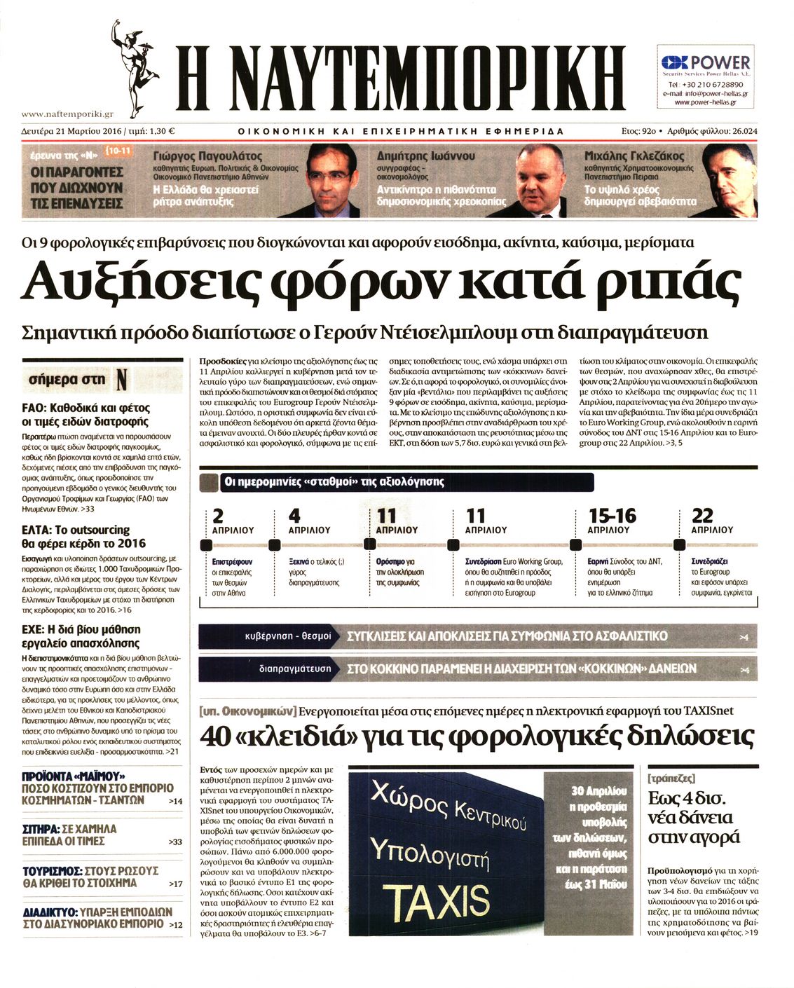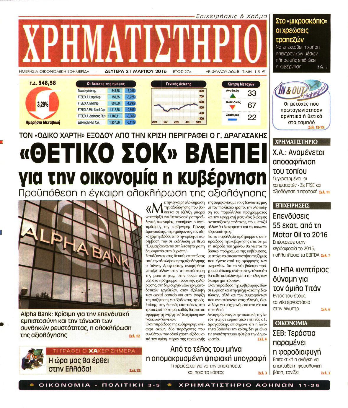 Oι οικονομικές εφημερίδες 21/3/2016 Enikos Newsroom 04:51, Δευτέρα 21 Μαρτίου 2016 Media Διαβάστε τα σημερινά πρωτοσέλιδα των οικονομικών εφημερίδων: ΟΙΚΟΝΟΜΙΚΕΣ ΕΦΗΜΕΡΙΔΕΣ ΠΡΩΤΟΣΕΛΙΔΑ Μοιράσου το: σχολίασε κι εσύ (0 σχόλια) Ακολουθήστε το enikos.gr στο Google News και μάθετε πρώτοι όλες τις ειδήσεις Δείτε όλες τις τελευταίες ειδήσεις από την Ελλάδα και τον Κόσμο στο enikos.gr Ειδήσεις Ροή Ειδήσεων 1 ώρα πριν ΣΥΡΙΖΑ: Διαγράφεται ο ευρωβουλευτής Νίκος Παππάς μετά την μήνυση δημοσιογράφου για ξυλοδαρμό 2 ώρες πριν Πώς στήθηκε η επιχείρηση «Ίπαλλος» που οδήγησε στη σύλληψη του «Έλληνα Εσκομπάρ» – «Ο πόλεμος ενάντια στους εμπόρους ναρκωτικών θα συνεχιστεί» 2 ώρες πριν Δίκη Χρυσής Αυγής: Την ενοχή και των 42 κατηγορουμένων ζητά η εισαγγελέας 2 ώρες πριν Κυψέλη: Στη φυλακή η 16χρονη που μαχαίρωσε συμμαθήτριά της 5 ώρες πριν Αμοργός: «Θα προσπαθήσω να το κάνω κάθε μέρα» – Ποιος είναι ο αγρότης που έστησε μόνος του το πρώτο μπλόκο στο νησί 2 ώρες πριν Τα 3 ζώδια που θα δουν τη ζωή τους να αλλάζει ριζικά το 2026 – «Όλα γίνονται καλύτερα σταδιακά» 7 ώρες πριν «Δεν είχα κλάψει από τότε που διαγνώστηκα με καρκίνο, ώσπου ένα τηλεφώνημα με έκανε να λυγίσω» – Η συγκλονιστική εξομολόγηση ενός άνδρα 3 ώρες πριν Ο σπάνιος σεισμός που έλυσε τα χέρια των επιστημόνων – Αποκάλυψε ακριβώς όσα αναζητούσαν 9 ώρες πριν 20 χρόνια τα Χριστούγεννα ξεκινούν στα Public με μεγάλη ποικιλία σε δώρα! 5 λεπτά πριν ΟΠΕΚΕΠΕ: Ελεύθερες με όρους η σύζυγος και η αδελφή του φερόμενου αρχηγού – Τι υποστήριξαν 7 λεπτά πριν Υπουργείο Εργασίας: Οι 5 άξονες του σχεδίου δράσης για την ενίσχυση των συλλογικών συμβάσεων – Δείτε την Υπουργική Απόφαση 11 λεπτά πριν Καβάλα: Βίντεο ντοκουμέντο από διάρρηξη σε καφετέρια – Έσπασαν την τζαμαρία, άρπαξαν το συρτάρι του ταμείου και έγιναν καπνός 17 λεπτά πριν ΑΣΕΠ: Οι προσωρινοί πίνακες για 4.276 θέσεις επιτυχόντων του πρώτου γραπτού διαγωνισμού – Η διαδικασία για τις ενστάσεις 22 λεπτά πριν Αίγινα: Βλάβη στον υποθαλάσσιο αγωγό του νησιού – «Προσωρινά από τις γεωτρήσεις του Δήμου η κάλυψη των αναγκών ύδρευσης» ENIKOS NETWORK Γιατί αναζητούμε τα Χριστούγεννα όλο και νωρίτερα; Ποιοι οι ψυχολογικοί και οι συναισθηματικοί λόγοι Σοβαροί κίνδυνοι από τη λάθος χορήγηση φαρμάκου για τις αιμορραγίες-Συστάσεις προς τους γιατρούς «Αναταράξεις» στην εφοδιαστική αλυσίδα από τα μπλόκα: Επιστολή του Συνδέσμου Θεσσαλικών Βιομηχανιών στον πρωθυπουργό -Τι αν... Δάνεια σε ελβετικό φράγκο: Αύριο η κατάθεση της τροπολογίας στη Βουλή – Όλες οι λεπτομέρειες Χαρτογραφώντας το «σημείο χωρίς επιστροφή»: Για πρώτη φορά αποκαλύπτεται με λεπτομέρεια το ακανθώδες όριο της ατμόσφαιρας τ... Η Google καταργεί τη λειτουργία «dark web report» – Πώς θα μπορούν οι χρήστες να διαγράφουν τα δεδομένα τους περισσότερα 12:35 , Τετάρτη 17 Δεκεμβρίου 2025 Μίρκα Παπακωνσταντίνου: «Δεν ήμουν αισιόδοξη για τα νούμερα – Είμαι ρεαλίστρια» Στα γυρίσματα του εορταστικού επεισοδίου της αγαπημένης σειράς “Το Σόι Σου”, βρέθηκε η κάμερα ... 12:12 , Τετάρτη 17 Δεκεμβρίου 2025 Ακούστε την εκπομπή του Νίκου Χατζηνικολάου 17/12/2025 Ακούστε την εκπομπή του Νίκου Χατζηνικολάου στον ραδιοφωνικό σταθμό RealFm 97,8, την Τετάρτη 1... 11:35 , Τετάρτη 17 Δεκεμβρίου 2025 Home Alone: Το σπίτι της ταινίας θα ανακαινιστεί – Επιστροφή στην αισθητική της δεκαετίας του ’90 Οι νέοι ιδιοκτήτες του πραγματικού σπιτιού που παρουσιάζεται στην κλασική ταινία του 1990 «Hom... 11:25 , Τετάρτη 17 Δεκεμβρίου 2025 Grand Hotel