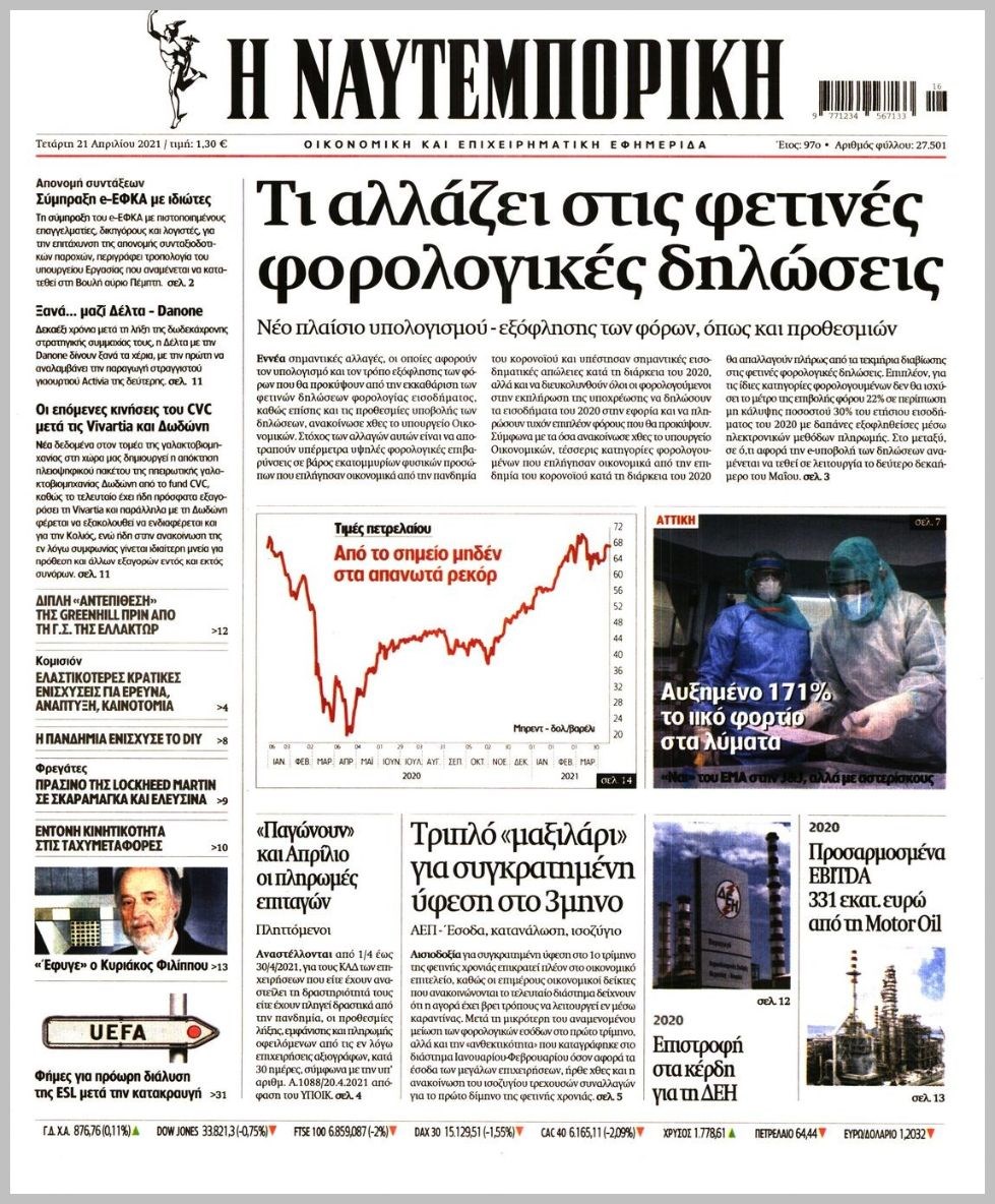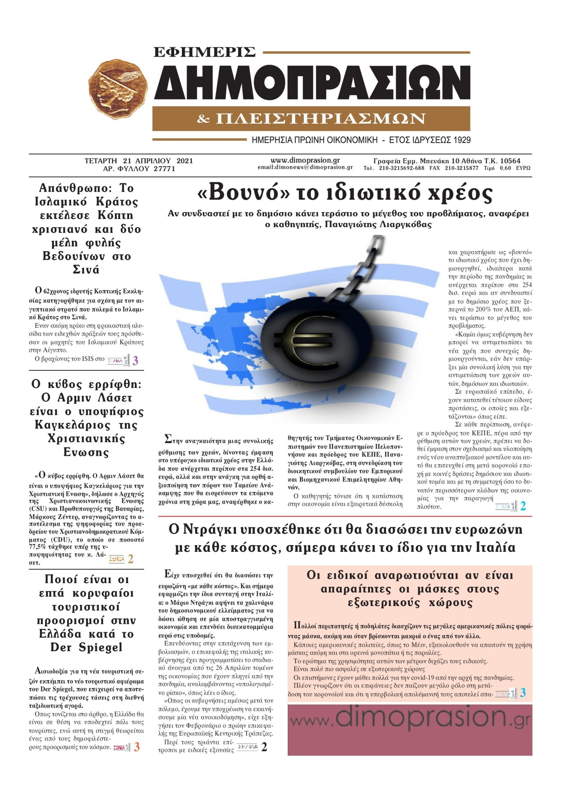 Οι οικονομικές εφημερίδες 21/4/2021 Διονύσης Νίκκας 06:33, Τετάρτη 21 Απριλίου 2021 Media Διαβάστε τα πρωτοσέλιδα των οικονομικών εφημερίδων… ΟΙΚΟΝΟΜΙΚΕΣ ΕΦΗΜΕΡΙΔΕΣ Μοιράσου το: σχολίασε κι εσύ (0 σχόλια) Ακολουθήστε το enikos.gr στο Google News και μάθετε πρώτοι όλες τις ειδήσεις Δείτε όλες τις τελευταίες ειδήσεις από την Ελλάδα και τον Κόσμο στο enikos.gr Ειδήσεις Ροή Ειδήσεων 45 λεπτά πριν Ευρωπαϊκή Ένωση: Χωρίς συμφωνία, για την μακροπρόθεσμη χρηματοδότηση της Ουκρανίας, ολοκληρώθηκε η Σύνοδος Κορυφής στις Βρυξέλλες 4 ώρες πριν ΟΠΕΚΕΠΕ: Προφυλακιστέος ο φερόμενος αρχηγός και ο λογιστής της εγκληματικής οργάνωσης 5 ώρες πριν Αυξάνουν την πίεση προς την κυβέρνηση οι αγρότες: Κλείνουν παρακαμπτήριους και ανοίγουν διόδια – Τι θα γίνει τις γιορτές 5 ώρες πριν Φοινικούντα: Το Σάββατο απολογείται ο 30χρονος γιος γνωστού επιχειρηματία της Πλάκας που παραδόθηκε – Όσα είπε στους αστυνομικούς και ο ρόλος του στο έγκλημα 4 ώρες πριν ΑΕΚ – Κραϊόβα 3-2: Επική ανατροπή και πρόκριση στους «16» του Conference League η Ένωση 5 ώρες πριν Αρχαιολόγοι ανακάλυψαν ρωμαϊκά τεχνουργήματα από μια πόλη που δεν υπήρξε ποτέ – Τα τρία εντυπωσιακά κτίρια και ο αμφορέας με τις… σαρδέλες 6 ώρες πριν Ύπνος: Η απλή βραδινή ρουτίνα για να προστατεύσετε τα μαλλιά σας από το κρύο κατά τη διάρκεια του χειμώνα 7 ώρες πριν Manifesting: Πώς να συναντήσετε τον σύντροφο της ζωής σας, ανάλογα με τον μήνα γέννησής σας 2 ημέρες πριν 20 χρόνια τα Χριστούγεννα ξεκινούν στα Public με μεγάλη ποικιλία σε δώρα! 1 λεπτό πριν Στη Φλόριντα σήμερα οι διαβουλεύσεις σχετικά με τα επόμενα στάδια για τη Λωρίδα της Γάζας 5 λεπτά πριν Σίσσυ Τουμάση: «Είμαι ασθενοφοβική πάρα πολύ και με πιάνει μια παράνοια μ’ αυτό» 30 λεπτά πριν Ντόναλντ Τραμπ: Δεν χρειάζομαι την έγκριση του Κογκρέσου για να διατάξω στρατιωτικά πλήγματα στη Βενεζουέλα 45 λεπτά πριν Ευρωπαϊκή Ένωση: Χωρίς συμφωνία, για την μακροπρόθεσμη χρηματοδότηση της Ουκρανίας, ολοκληρώθηκε η Σύνοδος Κορυφής στις Βρυξέλλες 1 ώρα πριν GNTM: «Κλείδωσαν» οι τέσσερις φιναλίστ – Μεγάλη ανατροπή στις τελευταίες αποχωρήσεις ENIKOS NETWORK Σε περίοδο αυξημένης δραστηριότητας η γρίπη στην Ελλάδα-Μέτρα προστασίας από τον ΕΟΔΥ Σκέφτεστε συνέχεια συζητήσεις που έχετε κάνει; Τι σημαίνει αυτό, σύμφωνα με ειδικό Στεγαστικό: Τι λέει η ΠΟΜΙΔΑ για τα νέα μέτρα που ανακοίνωσε ο Κυριάκος Μητσοτάκης Λαγκάρντ: Αισιόδοξη για την ανάπτυξη της Ευρωζώνης, αβέβαιη για τον πληθωρισμό Χαρτογραφώντας το «σημείο χωρίς επιστροφή»: Για πρώτη φορά αποκαλύπτεται με λεπτομέρεια το ακανθώδες όριο της ατμόσφαιρας τ... Η Google καταργεί τη λειτουργία «dark web report» – Πώς θα μπορούν οι χρήστες να διαγράφουν τα δεδομένα τους περισσότερα 02:50 , Παρασκευή 19 Δεκεμβρίου 2025 GNTM: «Κλείδωσαν» οι τέσσερις φιναλίστ – Μεγάλη ανατροπή στις τελευταίες αποχωρήσεις Για προτελευταία φορά εμφανίστηκαν στο πλατό του GNTM οι φιναλίστ του φετινού κύκλου, το βράδυ... 17:45 , Πέμπτη 18 Δεκεμβρίου 2025 ROUK ZOUK: Εορταστικό επεισόδιο με καλεσμένους τους πρωταγωνιστές του «Γιατί ρε πατέρα» Το Σάββατο 20 Δεκεμβρίου στις 21:00, η Ζέτα Μακρυπούλια υποδέχεται εκλεκτούς ηθοποιούς που όλο... 17:20 , Πέμπτη 18 Δεκεμβρίου 2025 Άγιος έρωτας: Η Χριστίνα εξομολογείται στον πατέρα Νικόλαο, απόψε στις 21:00 στον Alpha Η Νότα αποφασίζει να εκδικηθεί τον Πέτρο και τον Στέφανο, για χάρη του Λούη, όμως τα πράγματα ... 16:50 , Πέμπτη 18 Δεκεμβρίου 2025 Να μ’ αγαπάς: Ζωή και Φωτεινή συμφιλιώνονται ως μάνα με κόρη, 