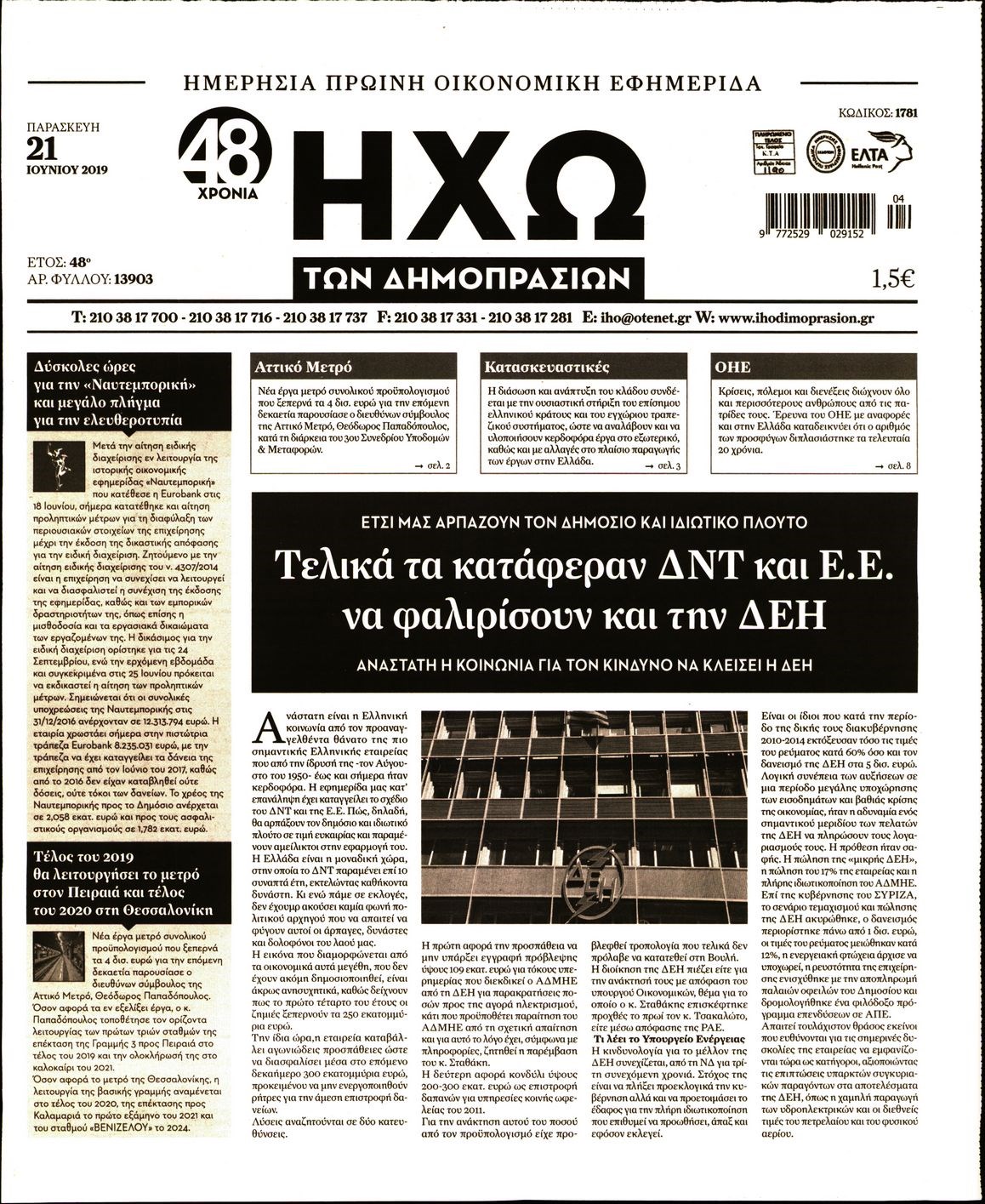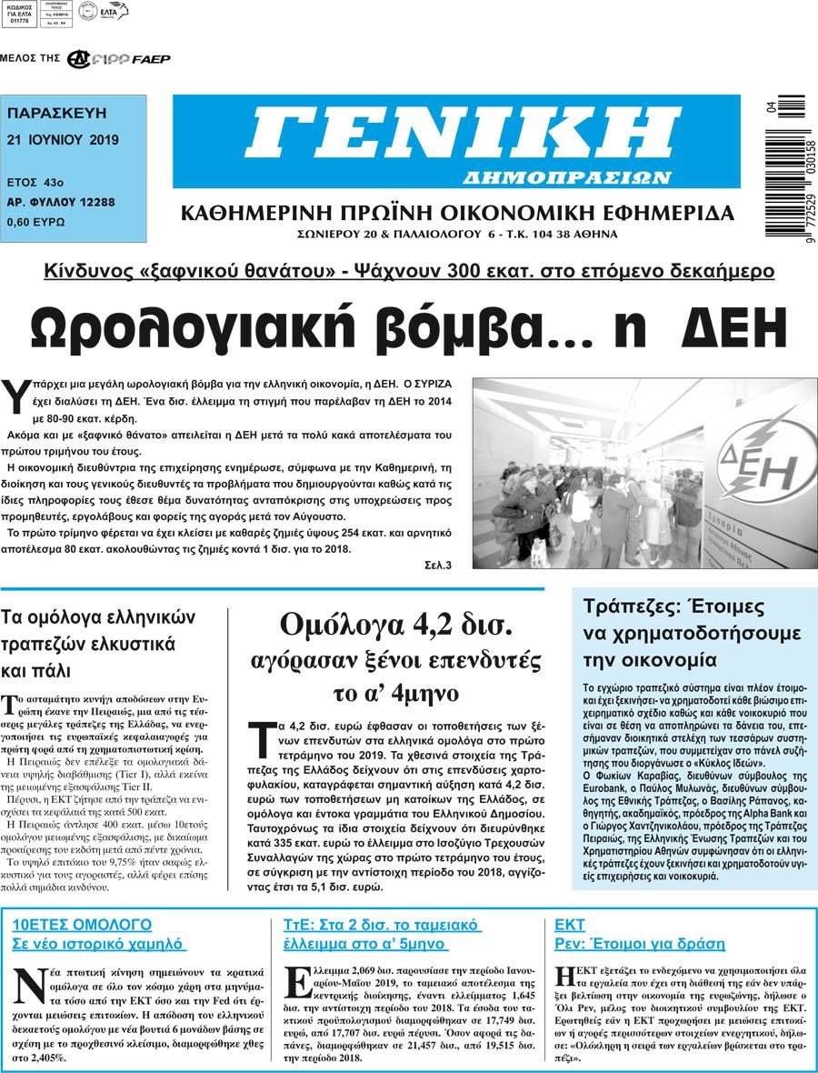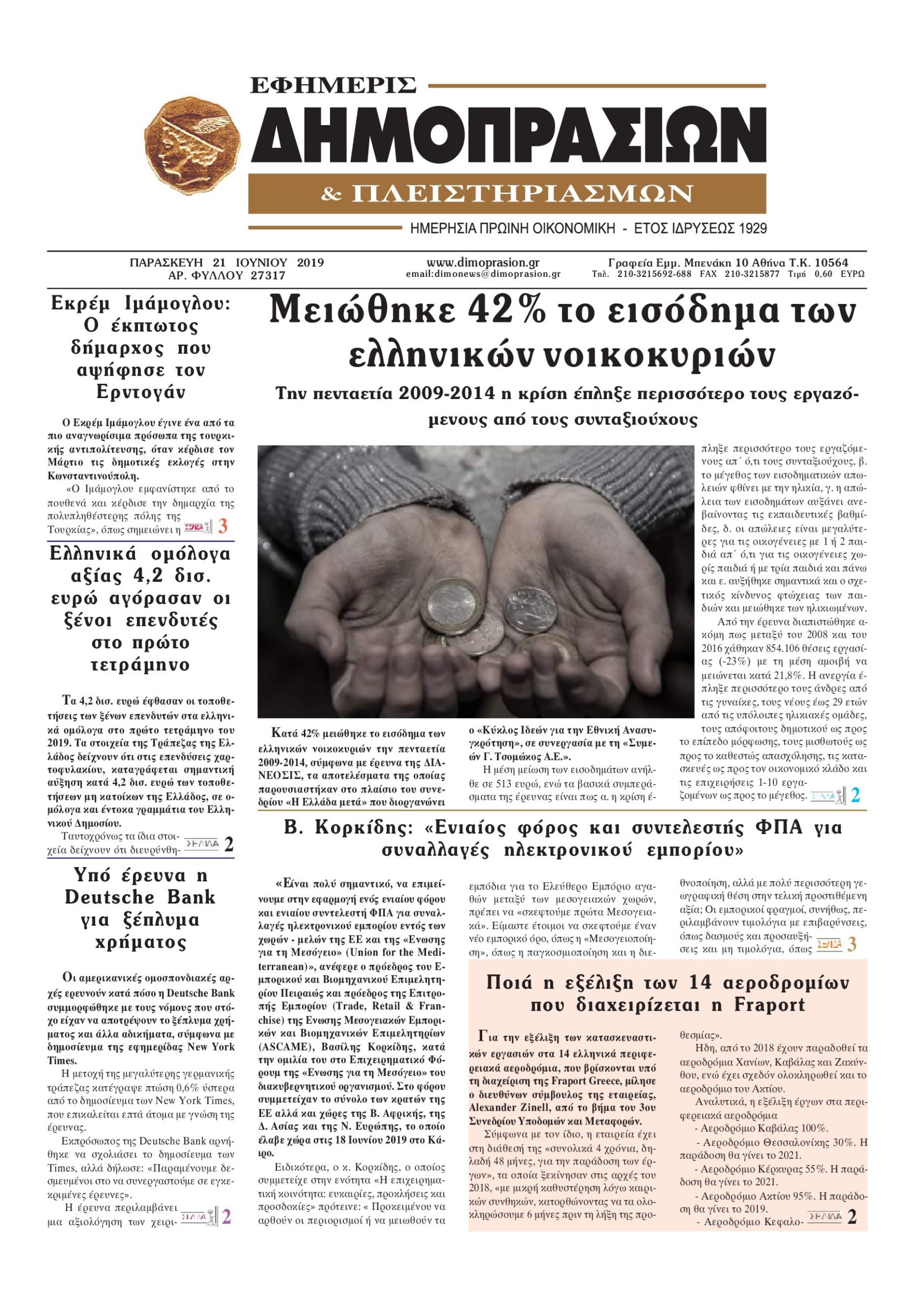 Οι οικονομικές εφημερίδες 21/6/2019 Enikos Newsroom 06:51, Παρασκευή 21 Ιουνίου 2019 Media Διαβάστε τα πρωτοσέλιδα των οικονομικών εφημερίδων: ΟΙΚΟΝΟΜΙΚΕΣ ΕΦΗΜΕΡΙΔΕΣ ΠΡΩΤΟΣΕΛΙΔΑ Μοιράσου το: σχολίασε κι εσύ (0 σχόλια) Ακολουθήστε το enikos.gr στο Google News και μάθετε πρώτοι όλες τις ειδήσεις Δείτε όλες τις τελευταίες ειδήσεις από την Ελλάδα και τον Κόσμο στο enikos.gr Ειδήσεις Ροή Ειδήσεων 8 ώρες πριν Χριστούγεννα στα μπλόκα: Επιμένουν στις κινητοποιήσεις τους οι αγρότες – Ανοίγουν τα διόδια το Σαββατοκύριακο 8 ώρες πριν Ουκρανία: Η άνευ προηγουμένου επίθεση σε ρωσικό τάνκερ στη Μεσόγειο και το μήνυμα προς στον Πούτιν – Το «μακρύ χέρι» του Κιέβου 7 ώρες πριν Πούτιν: Τα μηνύματα σε Ευρώπη και ΝΑΤΟ από το μαραθώνιο «σόου» του – Η απαίτηση για «σεβασμό» και η ειρήνη «με τους όρους» της Μόσχας 6 ώρες πριν ΗΠΑ: Η κυβέρνηση του Ντόναλντ Τραμπ άρχισε να δημοσιοποιεί τα αρχεία Έπσταϊν 7 ώρες πριν Άνω Λιόσια: Πυροβολισμοί σε επιχείρηση με χαλιά – Εντοπίστηκαν 10 κάλυκες 27 λεπτά πριν Αυγά: Πόσα μπορείτε να τρώτε την ημέρα με ασφάλεια για μέγιστη πρόσληψη πρωτεΐνης 57 λεπτά πριν Τα ζώδια σήμερα, Σάββατο 20 Δεκεμβρίου: Παρθένοι, το σύμπαν σας δίνει το κλειδί 7 ώρες πριν Ανακαλύφθηκαν αρχαία χρυσά νομίσματα 2.200 ετών που απεικονίζουν τον θεό Απόλλωνα – Η άγνωστη σύνδεση με τον Φίλιππο Β΄ της Μακεδονίας 8 ώρες πριν Ύπνος: Μια κρυφή κατάσταση του εγκεφάλου πριν από τον ύπνο μπορεί να είναι το “κλειδί” για υψηλή ευφυΐα και δημιουργικότητα 4 λεπτά πριν Κολομβία: Είκοσι χρόνια κάθειρξη σε πρώην ανώτερο αξιωματικό για 72 εκτελέσεις αμάχων 11 λεπτά πριν Οπτική ψευδαίσθηση: Μόνο αν είσαι ο Σέρλοκ Χολμς θα βρεις τον αριθμό «87» σε 7 δευτερόλεπτα 18 λεπτά πριν Σαρωτικοί οι έλεγχοι στους δρόμους ενόψει εορτών – Μπλόκα της τροχαίας σε κεντρικές αρτηρίες της Αττικής 27 λεπτά πριν Αυγά: Πόσα μπορείτε να τρώτε την ημέρα με ασφάλεια για μέγιστη πρόσληψη πρωτεΐνης 33 λεπτά πριν Σαν σήμερα 20 Δεκεμβρίου: Τα σημαντικότερα γεγονότα της ημέρας ENIKOS NETWORK Το ΕΚΑΒ τιμήθηκε από την Ακαδημία Αθηνών για τα 40 χρόνια προσφοράς του Έχετε πραγματικά μεγάλη καρδιά; 10 χαρακτηριστικά όσων έχουν καλοσύνη Αναστολή μέτρων αναγκαστικής εκτέλεσης για κτηνοτρόφους που πλήττονται από την ευλογιά των αιγοπροβάτων Πλήρης επάρκεια προϊόντων στις λαϊκές της Αττικής, παρά τις αγροτικές κινητοποιήσεις – Τι απαντούν οι πωλητές Χαρτογραφώντας το «σημείο χωρίς επιστροφή»: Για πρώτη φορά αποκαλύπτεται με λεπτομέρεια το ακανθώδες όριο της ατμόσφαιρας τ... Η Google καταργεί τη λειτουργία «dark web report» – Πώς θα μπορούν οι χρήστες να διαγράφουν τα δεδομένα τους περισσότερα 05:48 , Σάββατο 20 Δεκεμβρίου 2025 Οι οικονομικές εφημερίδες 20/12/2025 Διαβάστε τα πρωτοσέλιδα από τις οικονομικές εφημερίδες, σήμερα 20/12/2025. 05:43 , Σάββατο 20 Δεκεμβρίου 2025 Οι αθλητικές εφημερίδες 20/12/2025 Διαβάστε τα πρωτοσέλιδα από τις αθλητικές εφημερίδες, σήμερα 20/12/2025. 05:38 , Σάββατο 20 Δεκεμβρίου 2025 Οι πολιτικές εφημερίδες 20/12/2025 Διαβάστε τα πρωτοσέλιδα από τις πολιτικές εφημερίδες, σήμερα 20/12/2025. 04:20 , Σάββατο 20 Δεκεμβρίου 2025 Αγγελική Νικολούλη: Τα συλλυπητήρια για την απώλεια της Ειρήνης Μαρινάκη Τα συλληπητήρια στον πρόεδρο του Mega, τον Βαγγέλη Μαρινάκη, για την απώλεια της μητέρας του Ε... ΤΕΛΕΥΤΑΙΕΣ ΕΙΔΗΣΕΙΣ 4 λεπτά πριν Κολομβία: Είκοσι χρόνια κάθειρξη σε πρώην ανώτερο... 11 λεπτά πριν Οπτική ψευδαίσθηση: Μόνο αν είσαι ο Σέρλοκ Χολμς θα... 18 λεπτά πριν Σαρωτικοί οι έλεγχοι στους δρόμους