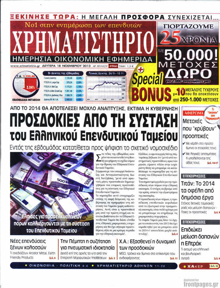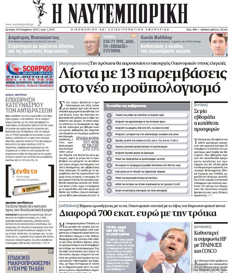 Οι oικονομικές εφημερίδες Enikos Newsroom 09:33, Δευτέρα 18 Νοεμβρίου 2013 Media Οι oικονομικές εφημερίδες Διαβάστε τα πρωτοσέλιδα των οικονομικών εφημερίδων: ΕΦΗΜΕΡΙΔΕΣ ΟΙΚΟΝΟΜΙΚΕΣ ΕΦΗΜΕΡΙΔΕΣ ΠΡΩΤΟΣΕΛΙΔΑ Μοιράσου το: σχολίασε κι εσύ (0 σχόλια) Ακολουθήστε το enikos.gr στο Google News και μάθετε πρώτοι όλες τις ειδήσεις Δείτε όλες τις τελευταίες ειδήσεις από την Ελλάδα και τον Κόσμο στο enikos.gr Ειδήσεις Ροή Ειδήσεων 8 ώρες πριν Μητσοτάκης: Αναγκαία η μεταρρύθμιση του πρωτογενούς τομέα – Τα 6 νέα μέτρα για το στεγαστικό και οι αναφορές σε «Ιθάκη» και «πολιτικούς του καναπέ» 7 ώρες πριν Δάνεια σε ελβετικό φράγκο: Τα βασικά σημεία της ρύθμισης – ανάσας για 40.000 δανειολήπτες – Αναλυτικός οδηγός με ερωτήσεις και απαντήσεις 7 ώρες πριν Κυψέλη: Εξιτήριο πήρε η 14χρονη μαθήτρια που μαχαιρώθηκε από την 16χρονη σε σχολείο – «Θέλω να βοηθήσω το παιδί, έχει μπλέξει με κακές παρέες» 7 ώρες πριν Τραμπ: Γιατί κατέθεσε τώρα την αγωγή κατά του BBC – Πώς η κίνησή του εξυπηρετεί το νέο δόγμα του για «αντίσταση» στην Ευρώπη, υπέρ των συντηρητικών 8 ώρες πριν ΟΠΕΚΕΠΕ – Παράνομες επιδοτήσεις: Ελεύθεροι με περιοριστικούς όρους και οι 7 κατηγορούμενοι που απολογήθηκαν σήμερα 7 ώρες πριν Ανακαλύφθηκε βυθισμένη πέτρινη κατασκευή ανοιχτά της Κριμαίας – Αποτελεί μέρος αρχαίας ελληνικής αποικίας 8 ώρες πριν Ύπνος: Αυτό μπορεί να είναι το χειρότερο λάθος για το βιολογικό ρολόι σας, σύμφωνα με ειδικό 9 ώρες πριν Αριθμολογία: Οι άνθρωποι που έχουν γεννηθεί αυτές τις 3 ημερομηνίες, προσελκύουν μεγάλη τύχη πριν από το τέλος του 2025 11 ώρες πριν Οι 7 συμπεριφορές που μαρτυρούν ότι ένας άνδρας επενδύει μακροπρόθεσμα σε μια σχέση 2 λεπτά πριν Σαν σήμερα 17 Δεκεμβρίου: Τα σημαντικότερα γεγονότα της ημέρας 8 λεπτά πριν Οι οικονομικές εφημερίδες 17/12/2025 13 λεπτά πριν Οι αθλητικές εφημερίδες 17/12/2025 18 λεπτά πριν Οι πολιτικές εφημερίδες 17/12/2025 26 λεπτά πριν Τα ζώδια σήμερα, Τετάρτη 17 Δεκεμβρίου: Κριοί, η αυτοπεποίθησή σας ενισχύεται ENIKOS NETWORK Αίτημα ΙΣΑ για την εξαίρεση των προσωπικών γιατρών από τις κατ’ οίκον επισκέψεις Η σκανδιναβική μέθοδος στον ύπνο που μπορεί να σώσει έναν γάμο Πιερρακάκης: Ο προϋπολογισμός συμβάλλει ουσιαστικά στην ενίσχυση της αγοραστικής δύναμης της πλειονότητας των εργαζομένων e-ΕΦΚΑ: Παρατείνεται η προθεσμία για την υποβολή ΑΠΔ – Ποιους αφορά Σύγχρονος Νοστράδαμος: Προειδοποιεί για «μεγάλο γεγονός» τους επόμενους μήνες που θα συγκλονίσει τη Βρετανία και τον κόσμο Τεστ παρατηρητικότητας: Μπορείτε να βρείτε τις 3 διαφορές στις εικόνες με έναν πιγκουίνο σε 14 δευτερόλεπτα περισσότερα 05:48 , Τετάρτη 17 Δεκεμβρίου 2025 Οι οικονομικές εφημερίδες 17/12/2025 Διαβάστε τα πρωτοσέλιδα από τις οικονομικές εφημερίδες, σήμερα 17/12/2025. 05:43 , Τετάρτη 17 Δεκεμβρίου 2025 Οι αθλητικές εφημερίδες 17/12/2025 Διαβάστε τα πρωτοσέλιδα από τις αθλητικές εφημερίδες, σήμερα 17/12/2025. 05:38 , Τετάρτη 17 Δεκεμβρίου 2025 Οι πολιτικές εφημερίδες 17/12/2025 Διαβάστε τα πρωτοσέλιδα από τις πολιτικές εφημερίδες, σήμερα 17/12/2025. 20:06 , Τρίτη 16 Δεκεμβρίου 2025 Ο ΣΚΑΙ καταγγέλλει τον ΕΚΚΟΜΕΔ Επιστολή με την οποία καταγράφει την έντονη διαμαρτυρία του προς τον διευθύνοντα σύμβουλο του... ΤΕΛΕΥΤΑΙΕΣ ΕΙΔΗΣΕΙΣ 2 λεπτά πριν Σαν σήμερα 17 Δεκεμβρίου: Τα σημαντικότερα γεγονότα... 8 λεπτά πριν Οι οικονομικές εφημερίδες 17/12/2025 13 λεπτά πριν Οι αθλητικές εφημερίδες 17/12/2025 18 λεπτά πριν Οι πολιτικές εφημερίδες 17/12/2025 26 λεπτά πριν Τα ζώδια σήμερα, Τετάρτη 17 Δεκεμβρίου: Κριο
