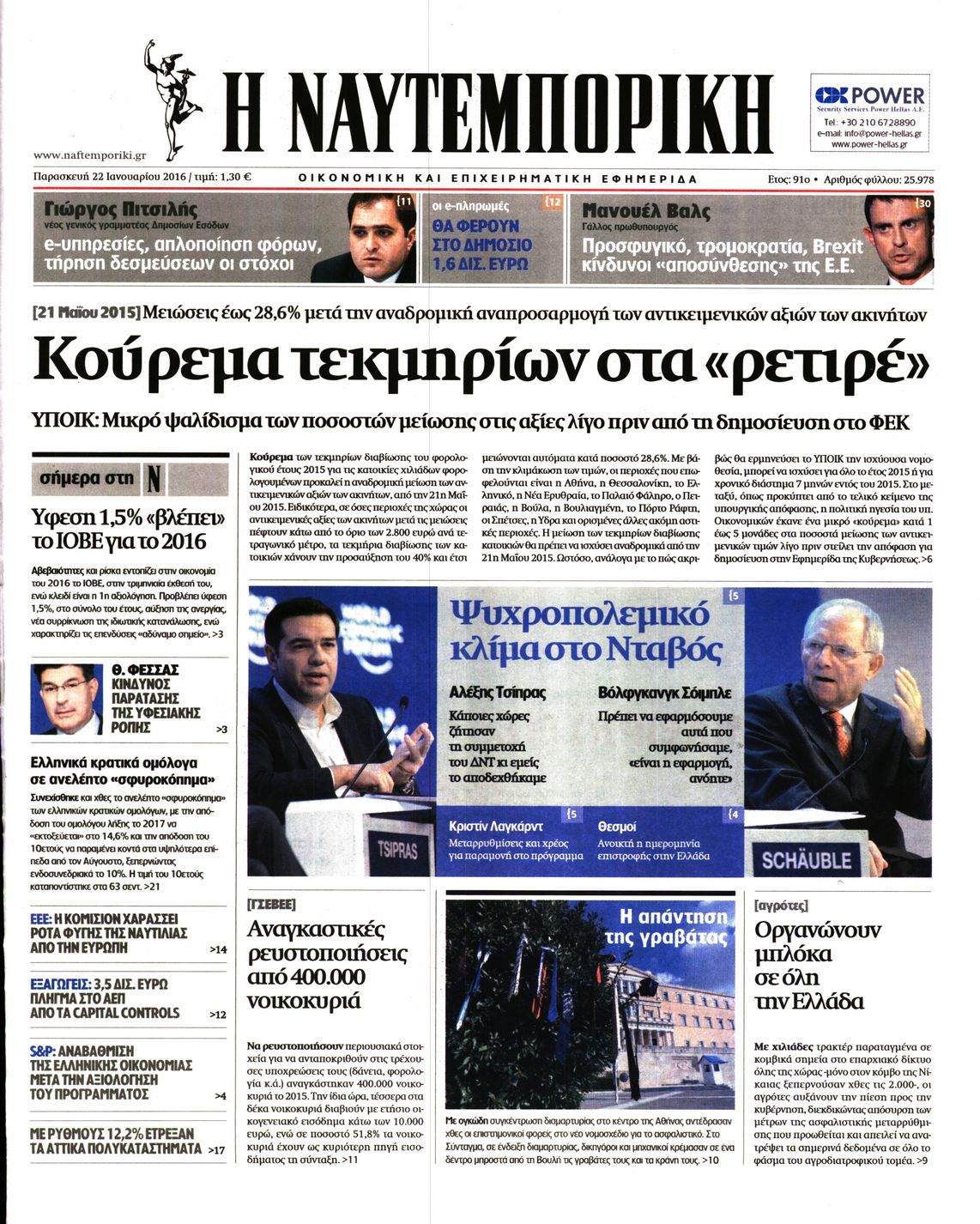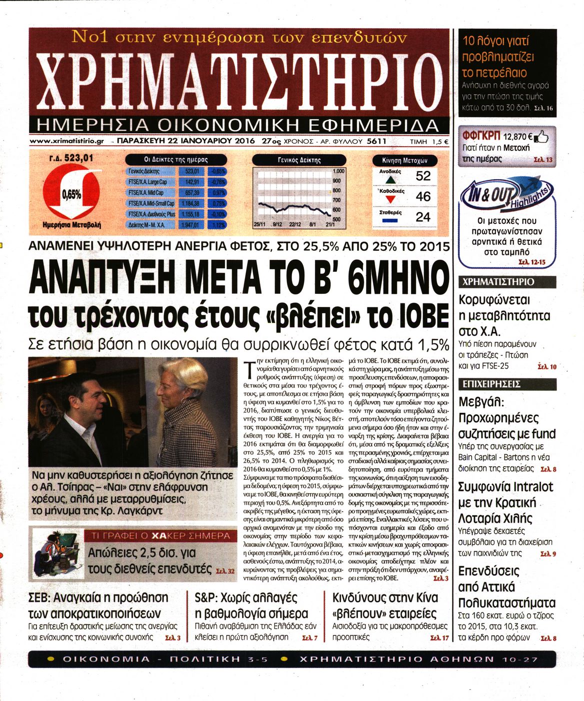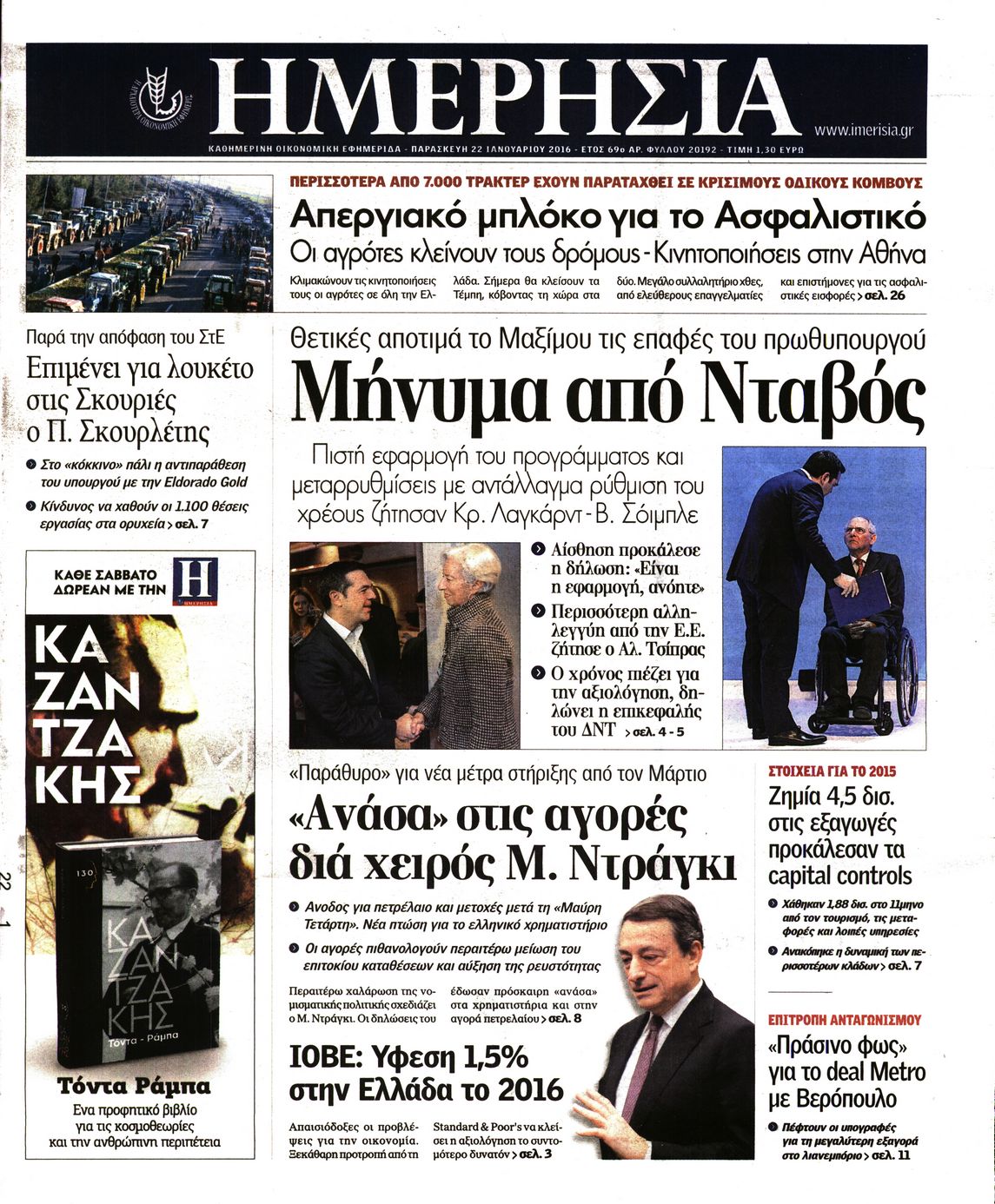 Οι οικονομικές εφημερίδες 22/1/2016 Enikos Newsroom 05:54, Παρασκευή 22 Ιανουαρίου 2016 Media Διαβάστε τα σημερινά πρωτοσέλιδα των οικονομικών εφημερίδων: ΟΙΚΟΝΟΜΙΚΕΣ ΕΦΗΜΕΡΙΔΕΣ ΠΡΩΤΟΣΕΛΙΔΑ Μοιράσου το: σχολίασε κι εσύ (0 σχόλια) Ακολουθήστε το enikos.gr στο Google News και μάθετε πρώτοι όλες τις ειδήσεις Δείτε όλες τις τελευταίες ειδήσεις από την Ελλάδα και τον Κόσμο στο enikos.gr Ειδήσεις Ροή Ειδήσεων 3 ώρες πριν Εκτός ευρωομάδας ΣΥΡΙΖΑ ο Νίκος Παππάς μετά την επίθεση στον δημοσιογράφο Νίκο Γιαννόπουλο – Η μήνυση και οι νέες δηλώσεις 3 ώρες πριν «Αγριεύουν» οι αγρότες: «Δεν συντρέχει λόγος συνάντησης με τον πρωθυπουργό» – Ώρα αποφάσεων στη σύσκεψη της Πέμπτης 3 ώρες πριν Κυψέλη: Χωρίς την οικογένειά της δίπλα της απολογήθηκε η 16χρονη – «Της είχε επιτεθεί κάποιος για να την βιάσει, φοβήθηκε και κυκλοφορούσε με μαχαίρι» 3 ώρες πριν Politico: Το πρόβλημα της Ευρώπης δεν είναι το Βέλγιο αλλά ο Ντόναλντ Τραμπ 5 ώρες πριν Αλεξανδρούπολη: Πολυοργανική ανεπάρκεια λόγω υποσιτισμού η αιτία θανάτου του 3χρονου αγοριού 3 ώρες πριν Μυστήριο με τεράστιες κυκλικές πέτρες 200 κιλών – Ανακαλύφθηκαν τυχαία κατά τη διάρκεια οδικών έργων και κανείς δεν ξέρει από πού προέρχονται 4 ώρες πριν Ύπνος: Ειδικός εξηγεί τον πραγματικό λόγο που ξυπνάτε στις 4 τα ξημερώματα – Ο ρόλος των ορμονών και του κιρκάδιου ρυθμού 5 ώρες πριν Αριθμολογία: Οι άνθρωποι που έχουν γεννηθεί αυτές τις 4 ημερομηνίες, είναι τρυφεροί και αγαπούν ανιδιοτελώς 17 ώρες πριν 20 χρόνια τα Χριστούγεννα ξεκινούν στα Public με μεγάλη ποικιλία σε δώρα! 10 λεπτά πριν Βρυξέλλες: Νυχτερινό… μπλόκο αγροτών μπροστά από το κτίριο της Ευρωπαϊκής Επιτροπής – Πάνω από 100 τρακτέρ απέκλεισαν την λεωφόρο 25 λεπτά πριν Euroleague: Απρόσμενη ήττα για την Μονακό του Βασίλη Σπανούλη – Η βαθμολογία μετά το τέλος της 16ης αγωνιστικής 40 λεπτά πριν Μουντιάλ 2026: Η νέα ταξιδιωτική απαγόρευση του Ντόναλντ Τραμπ πλήττει (και) τους οπαδούς Σενεγάλης – Ακτής Ελεφαντοστού 52 λεπτά πριν Κυριάκος Μητσοτάκης: Στις Βρυξέλλες για την Σύνοδο Κορυφής ΕΕ και Δυτικών Βαλκανίων – Δείτε φωτογραφίες 1 ώρα πριν Σάρα Εσκενάζυ: Η πρώτη ανάρτηση για το θάνατο του πατέρα της, Αλμπέρτο Εσκενάζυ και η επιθυμία της οικογένειας ENIKOS NETWORK Αϋπνία: Το κόλπο που θα σας βοηθήσει να κοιμηθείτε απόψε – Είναι απλό και έχει αποτέλεσμα 2,6 εκατομμύρια πολίτες έχουν ήδη εμβολιαστεί κατά της γρίπης ΕΛΣΤΑΤ: Τι δείχνουν τα νέα στοιχεία για τις ηλεκτρονικές παραγγελίες των επιχειρήσεων ΚΕΠΕ: Οι 3 διακριτές συμβολές των ΜμΕ και της μεταποίησης στην ελληνική οικονομία Χαρτογραφώντας το «σημείο χωρίς επιστροφή»: Για πρώτη φορά αποκαλύπτεται με λεπτομέρεια το ακανθώδες όριο της ατμόσφαιρας τ... Η Google καταργεί τη λειτουργία «dark web report» – Πώς θα μπορούν οι χρήστες να διαγράφουν τα δεδομένα τους περισσότερα 22:24 , Τετάρτη 17 Δεκεμβρίου 2025 Το Σπίτι Δίπλα Στο Ποτάμι: Σε κίνδυνο η υγεία του Απόστολου – Τι θα δούμε απόψε “Το Σπίτι Δίπλα στο Ποτάμι” ξετυλίγει το νήμα της ζωής των πέντε αδελφών με καταισ... 21:14 , Τετάρτη 17 Δεκεμβρίου 2025 Παιχνίδια Εκδίκησης: Θα καταφέρει ο Χρήστος να κλονίσει την εμπιστοσύνη της Μάγιας απέναντι στον Άγη; Τα «Παιχνίδια Εκδίκησης» έρχονται απόψε στις 22:30, στον Αντ1, με το τελευταίο επεισόδιο της χ... 20:57 , Τετάρτη 17 Δεκεμβρίου 2025 Άγιος Έρωτας: Η Χλόη καταθέτει εναντίον του πατέρα της και ο Χάρης αποκαλύπτει στον Κλεάνθη ότι δεν είναι ο βιολογικός του πατέρας. Γεμάτο αποκαλύψεις είναι το νέο ε