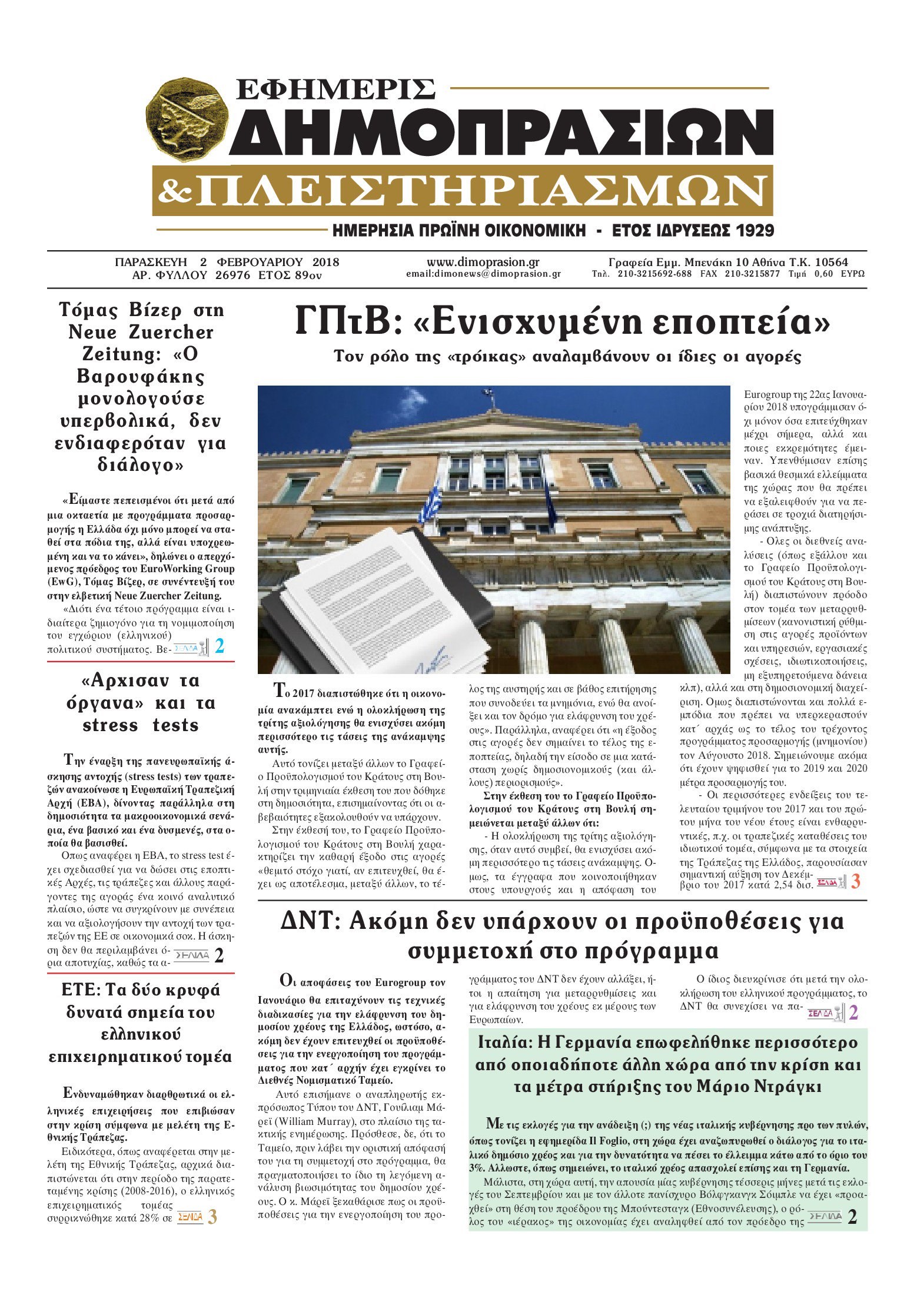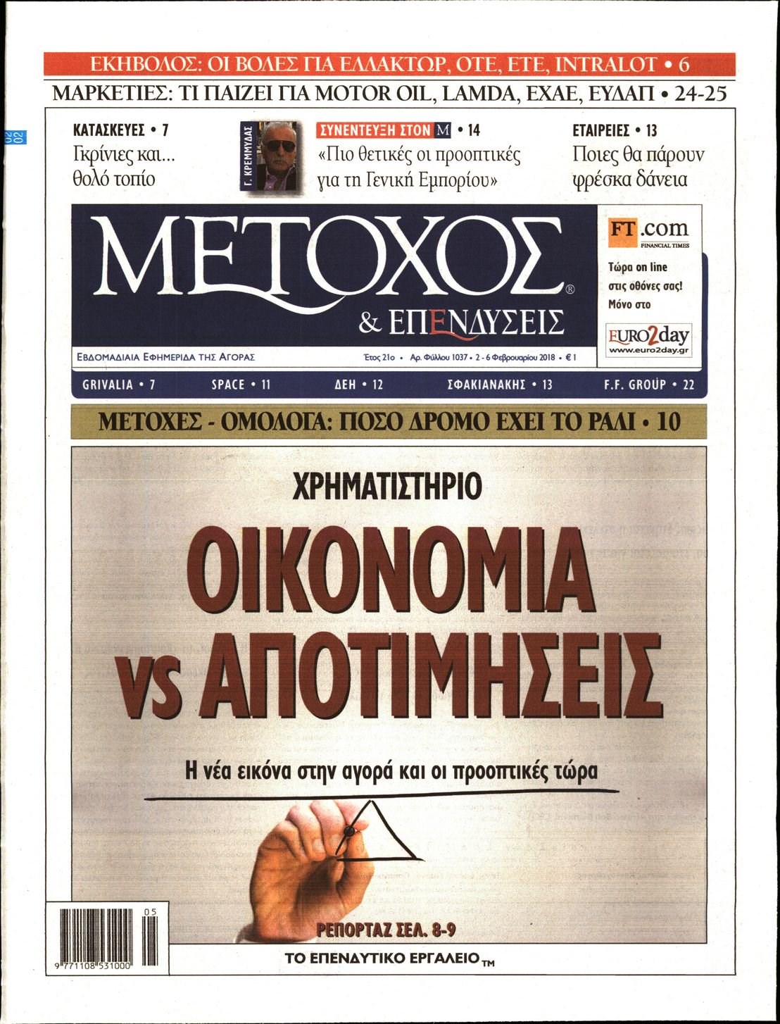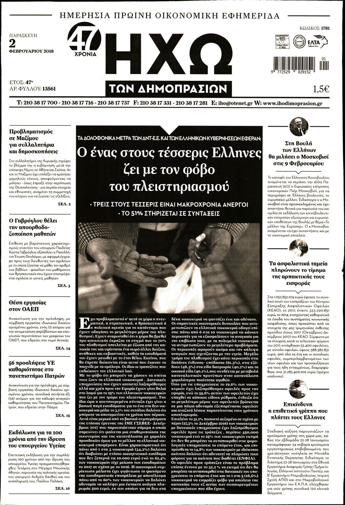 Οι οικονομικές εφημερίδες 2/2/2018 Enikos Newsroom 07:12, Παρασκευή 02 Φεβρουαρίου 2018 Media Διαβάστε τα σημερινά πρωτοσέλιδα των οικονομικών εφημερίδων: ΟΙΚΟΝΟΜΙΚΕΣ ΕΦΗΜΕΡΙΔΕΣ ΠΡΩΤΟΣΕΛΙΔΑ Μοιράσου το: σχολίασε κι εσύ (0 σχόλια) Ακολουθήστε το enikos.gr στο Google News και μάθετε πρώτοι όλες τις ειδήσεις Δείτε όλες τις τελευταίες ειδήσεις από την Ελλάδα και τον Κόσμο στο enikos.gr Ειδήσεις Ροή Ειδήσεων 1 ώρα πριν Χριστούγεννα στα μπλόκα: Επιμένουν στις κινητοποιήσεις τους οι αγρότες – Ανοίγουν τα διόδια το Σαββατοκύριακο 1 ώρα πριν Ουκρανία: Η άνευ προηγουμένου επίθεση σε ρωσικό τάνκερ στη Μεσόγειο και το μήνυμα προς στον Πούτιν – Το «μακρύ χέρι» του Κιέβου 43 λεπτά πριν Πούτιν: Τα μηνύματα σε Ευρώπη και ΝΑΤΟ από το μαραθώνιο «σόου» του – Η απαίτηση για «σεβασμό» και η ειρήνη «με τους όρους» της Μόσχας 2 ώρες πριν Τραμπ: Δεν αποκλείει την πιθανότητα ενός πολέμου στη Βενεζουέλα – «Ο Μαδούρο ξέρει καλύτερα από τον καθένα τι ακριβώς θέλω» 2 ώρες πριν Συνεχίζει να προκαλεί ο Μίτσκοσκι: «Για μένα το όνομα Μακεδονία είναι ιερό» 44 λεπτά πριν Ανακαλύφθηκαν αρχαία χρυσά νομίσματα 2.200 ετών που απεικονίζουν τον θεό Απόλλωνα – Η άγνωστη σύνδεση με τον Φίλιππο Β΄ της Μακεδονίας 2 ώρες πριν Ύπνος: Μια κρυφή κατάσταση του εγκεφάλου πριν από τον ύπνο μπορεί να είναι το “κλειδί” για υψηλή ευφυΐα και δημιουργικότητα 3 ώρες πριν Αριθμολογία: Οι άνθρωποι που έχουν γεννηθεί αυτές τις 4 ημερομηνίες, συχνά παρεξηγούνται – «Η καλοσύνη τους κρύβει τεράστια δύναμη» 4 ώρες πριν Ξεχάστε το καθάρισμα το Σαββατοκύριακο: Ο «κανόνας των 20 λεπτών» που θα σας λύσει τα χέρια 6 λεπτά πριν Άνω Λιόσια: Πυροβολισμοί σε επιχείρηση με χαλιά – Εντοπίστηκαν 10 κάλυκες 14 λεπτά πριν Γάζα: Ισραηλινό πλήγμα σε σχολείο που είχαν καταφύγει εκτοπισμένοι – Τουλάχιστον έξι νεκροί 28 λεπτά πριν Ολυμπιακός – Βιλερμπάν 107-84: Επιστροφή στις νίκες με… προπόνηση 34 λεπτά πριν Νέος Κόσμος: Συνελήφθη 41χρονος με ένταλμα από την Τουρκία για εμπόριο ναρκωτικών και ληστεία 43 λεπτά πριν Πούτιν: Τα μηνύματα σε Ευρώπη και ΝΑΤΟ από το μαραθώνιο «σόου» του – Η απαίτηση για «σεβασμό» και η ειρήνη «με τους όρους» της Μόσχας ENIKOS NETWORK Το ΕΚΑΒ τιμήθηκε από την Ακαδημία Αθηνών για τα 40 χρόνια προσφοράς του Έχετε πραγματικά μεγάλη καρδιά; 10 χαρακτηριστικά όσων έχουν καλοσύνη Αναστολή μέτρων αναγκαστικής εκτέλεσης για κτηνοτρόφους που πλήττονται από την ευλογιά των αιγοπροβάτων Πλήρης επάρκεια προϊόντων στις λαϊκές της Αττικής, παρά τις αγροτικές κινητοποιήσεις – Τι απαντούν οι πωλητές Χαρτογραφώντας το «σημείο χωρίς επιστροφή»: Για πρώτη φορά αποκαλύπτεται με λεπτομέρεια το ακανθώδες όριο της ατμόσφαιρας τ... Η Google καταργεί τη λειτουργία «dark web report» – Πώς θα μπορούν οι χρήστες να διαγράφουν τα δεδομένα τους περισσότερα 22:42 , Παρασκευή 19 Δεκεμβρίου 2025 Γιώργος Γιαννόπουλος για “Το σόι σου”: “Είναι ευτυχία και ευλογία αυτή η σειρά” «Είναι ευτυχία και ευλογία η συγκυρία αυτής της σειράς», θα πει ο Γιώργος Γιαννόπουλος -ο αγαπ... 20:37 , Παρασκευή 19 Δεκεμβρίου 2025 Don’t Forget The Lyrics: Η Έλλη Κοκκίνου υποδέχεται 4 παίκτες που θα κάνουν τα πάντα για να μη χάσουν ούτε… μισή λέξη από τους στίχους Το «Don’t Forget The Lyrics» επιστρέφει απόψε, Παρασκευή 19 Δεκεμβρίου, στις 21:00 με νέο επει... 19:31 , Παρασκευή 19 Δεκεμβρίου 2025 GNTM: Απόψε ο μεγάλος τελικός για τους 4 φιναλίστ Έπειτα από μήνες γεμάτους μόδα, δημιουργία και έντονες αναμετρήσεις, το GNTM 2025 κορυφώνεται,... 18:11 , Παρασ