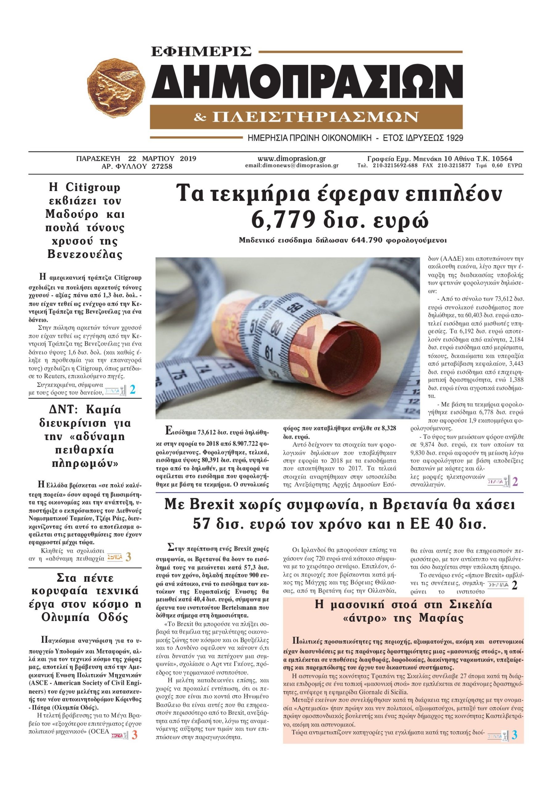 Οι οικονομικές εφημερίδες 22/3/2019 Enikos Newsroom 07:03, Παρασκευή 22 Μαρτίου 2019 Media Διαβάστε τα πρωτοσέλιδα των οικονομικών εφημερίδων: ΟΙΚΟΝΟΜΙΚΕΣ ΕΦΗΜΕΡΙΔΕΣ ΠΡΩΤΟΣΕΛΙΔΑ Μοιράσου το: σχολίασε κι εσύ (0 σχόλια) Ακολουθήστε το enikos.gr στο Google News και μάθετε πρώτοι όλες τις ειδήσεις Δείτε όλες τις τελευταίες ειδήσεις από την Ελλάδα και τον Κόσμο στο enikos.gr Ειδήσεις Ροή Ειδήσεων 13 λεπτά πριν Κλιμακώνουν από σήμερα τις κινητοποιήσεις οι αγρότες: Νέα μπλόκα, κλείσιμο παρακαμπτηρίων και άνοιγμα διοδίων – Το νέο μήνυμα Μητσοτάκη 40 λεπτά πριν Συντάξεις: Οι κερδισμένοι και οι χαμένοι από τις αυξήσεις – Αναλυτικός οδηγός και παραδείγματα 4 ώρες πριν Ευρωπαϊκή Ένωση: Συμφωνία για δάνειο 90 δισ. ευρώ στην Ουκρανία τη διετία 2026-2027 – Μητσοτάκης: Η λύση που προκρίθηκε είναι η ενδεδειγμένη 60 λεπτά πριν Θανατηφόρο τροχαίο στη Νέα Φιλαδέλφεια: Νεκρός 27χρονος οδηγός μηχανής ύστερα από σύγκρουση με τρόλεϊ 8 ώρες πριν ΟΠΕΚΕΠΕ: Προφυλακιστέος ο φερόμενος αρχηγός και ο λογιστής της εγκληματικής οργάνωσης 2 ώρες πριν Οπτική ψευδαίσθηση: Μόνο αν έχεις αετίσια ματιά θα βρεις τον παπαγάλο σε 12 δευτερόλεπτα 2 ώρες πριν Κρύα χέρια και πόδια: Γιατρός εξηγεί ποια είναι η αίτια και πότε πρέπει να ανησυχήσετε 3 ώρες πριν Τα ζώδια σήμερα, Παρασκευή 19 Δεκεμβρίου: Τοξότες, με τη Νέα Σελήνη έρχεται η προσωπική ανανέωσή σας 2 ημέρες πριν 20 χρόνια τα Χριστούγεννα ξεκινούν στα Public με μεγάλη ποικιλία σε δώρα! 14 δευτερόλεπτα πριν Την Κυριακή με τη Realnews: Δωροεπιταγή 10€ 6 λεπτά πριν Πανεπιστήμιο Μπράουν: Νεκρός ο ύποπτος για την επίθεση 12 λεπτά πριν Τέμπη: Συνεχίζεται σήμερα η δίκη για τη διαχείριση του βιντεοληπτικού υλικού 13 λεπτά πριν Κλιμακώνουν από σήμερα τις κινητοποιήσεις οι αγρότες: Νέα μπλόκα, κλείσιμο παρακαμπτηρίων και άνοιγμα διοδίων – Το νέο μήνυμα Μητσοτάκη 21 λεπτά πριν e-ΕΦΚΑ και ΔΥΠΑ: Τελευταία ημέρα πληρωμών σήμερα ENIKOS NETWORK Άνοια: Ειδικοί προειδοποιούν για 5 κοινές συνήθειες που μπορεί να αυξήσουν τον κίνδυνο 6 Χριστουγεννιάτικα δώρα για όσους τα έχουν όλα – Θα τους εκπλήξουν Συντάξεις: Οι κερδισμένοι και οι χαμένοι από τις αυξήσεις – Αναλυτικός οδηγός Στεγαστικό: Τι λέει η ΠΟΜΙΔΑ για τα νέα μέτρα που ανακοίνωσε ο Κυριάκος Μητσοτάκης Χαρτογραφώντας το «σημείο χωρίς επιστροφή»: Για πρώτη φορά αποκαλύπτεται με λεπτομέρεια το ακανθώδες όριο της ατμόσφαιρας τ... Η Google καταργεί τη λειτουργία «dark web report» – Πώς θα μπορούν οι χρήστες να διαγράφουν τα δεδομένα τους περισσότερα 05:48 , Παρασκευή 19 Δεκεμβρίου 2025 Οι οικονομικές εφημερίδες 19/12/2025 Διαβάστε τα πρωτοσέλιδα από τις οικονομικές εφημερίδες, σήμερα 19/12/2025. 05:43 , Παρασκευή 19 Δεκεμβρίου 2025 Οι αθλητικές εφημερίδες 19/12/2025 Διαβάστε τα πρωτοσέλιδα από τις αθλητικές εφημερίδες, σήμερα 19/12/2025. 05:38 , Παρασκευή 19 Δεκεμβρίου 2025 Οι πολιτικές εφημερίδες 19/12/2025 Διαβάστε τα πρωτοσέλιδα από τις πολιτικές εφημερίδες, σήμερα 19/12/2025. 02:50 , Παρασκευή 19 Δεκεμβρίου 2025 GNTM: «Κλείδωσαν» οι τέσσερις φιναλίστ – Μεγάλη ανατροπή στις τελευταίες αποχωρήσεις Για προτελευταία φορά εμφανίστηκαν στο πλατό του GNTM οι φιναλίστ του φετινού κύκλου, το βράδυ... ΤΕΛΕΥΤΑΙΕΣ ΕΙΔΗΣΕΙΣ 6 λεπτά πριν Πανεπιστήμιο Μπράουν: Νεκρός ο ύποπτος για την επίθεση 12 λεπτά πριν Τέμπη: Συνεχίζεται σήμερα η δίκη για τη διαχείριση του... 13 λεπτά πριν Κλιμακώνουν από σήμερα τις κινητοποιήσεις οι αγρότες:... 21 λεπτά πριν e-ΕΦΚΑ και ΔΥΠΑ: Τελευταία ημέρα πληρωμών σήμερα 28 λεπτά πριν Καιρός: Ηλιοφάνεια 