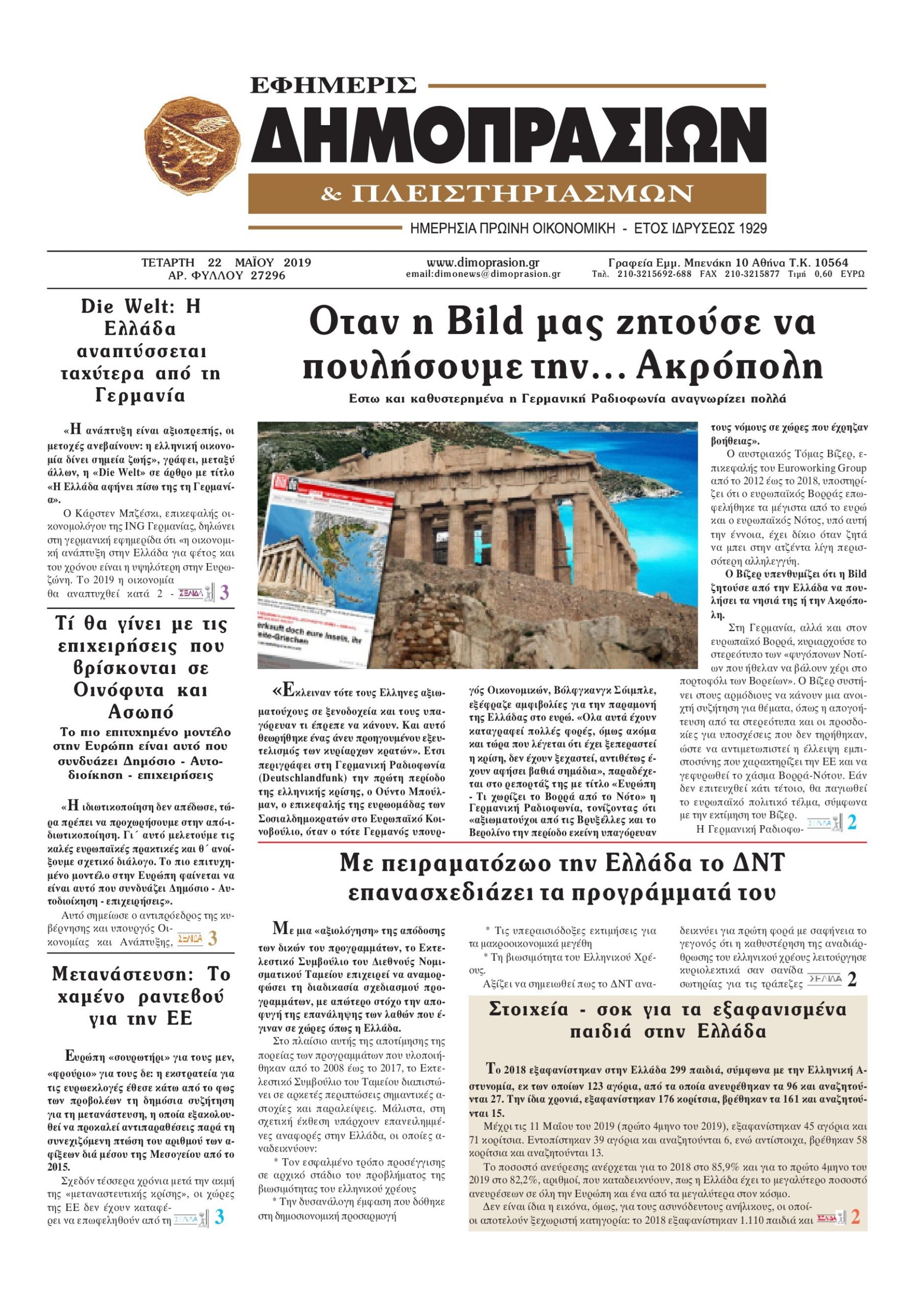 Οι οικονομικές εφημερίδες 22/5/2019 Enikos Newsroom 06:54, Τετάρτη 22 Μαΐου 2019 Media Διαβάστε τα πρωτοσέλιδα των οικονομικών εφημερίδων: ΟΙΚΟΝΟΜΙΚΕΣ ΕΦΗΜΕΡΙΔΕΣ ΠΡΩΤΟΣΕΛΙΔΑ Μοιράσου το: σχολίασε κι εσύ (0 σχόλια) Ακολουθήστε το enikos.gr στο Google News και μάθετε πρώτοι όλες τις ειδήσεις Δείτε όλες τις τελευταίες ειδήσεις από την Ελλάδα και τον Κόσμο στο enikos.gr Ειδήσεις Ροή Ειδήσεων 2 ώρες πριν Με μπλόκα η έξοδος των εκδρομέων για τα Χριστούγεννα – Οι αγρότες αναδιατάσσουν τα τρακτέρ τους 2 ώρες πριν Χριστούγεννα: Πόσο ακριβότερο είναι φέτος το γιορτινό τραπέζι – Τι θα αγοράσουν οι καταναλωτές 43 λεπτά πριν Θεσσαλονίκη: Φωτιά σε όχημα στον περιφερειακό – Δείτε βίντεο αναγνώστη 49 λεπτά πριν Ο «Χρυσός Στόλος» των ΗΠΑ: Το σχέδιο για θωρηκτά «100 φορές πιο ισχυρά» – Τα όπλα που θα φέρουν τα πλοία της κλάσης «Τραμπ» 2 ώρες πριν Υπουργικό Συμβούλιο: Στις 11:00 η συνεδρίαση – Τι θα πει ο Πρωθυπουργός στους αγρότες και η ατζέντα για τις μεταρρυθμίσεις 4 ώρες πριν Φλεγμονή: Έμπειρη μαγείρισσα αποκαλύπτει το πανίσχυρο ελληνικό βότανο που την καταπολεμά 4 ώρες πριν Τα ζώδια σήμερα, Τρίτη 23 Δεκεμβρίου: Υδροχόοι, κάποιος μπορεί να μοιάζει ιδανικός στην φαντασία σας 1 ώρα πριν Ανακαλύφθηκε μωσαϊκό της ύστερης αρχαιότητας με ελληνική επιγραφή 3 ημέρες πριν Enerwave: Το νέο «ρεύμα» στη λιανική ενέργειας που αλλάζει την εμπειρία του καταναλωτή 5 λεπτά πριν Η Coca-Cola και ο Ελληνικός Ερυθρός Σταυρός μαζί αυτά τα Χριστούγεννα: Μια μεγάλη αγκαλιά για τους συνανθρώπους μας που έχουν ανάγκη 10 λεπτά πριν Ηράκλειο: Πέταξαν κόκκινη μπογιά στο κτίριο της Διεύθυνσης Αγροτικής Ανάπτυξης 15 λεπτά πριν Τζέι Ντι Βανς: «Σαν να με χτύπησε τρένο» – Φωτογραφίες από την εξαντλητική προπόνηση με την ελίτ μονάδα του Πολεμικού Ναυτικού 19 λεπτά πριν Χριστούγεννα: Τροποποιήσεις στα δρομολόγια των Μέσων Μαζικής Μεταφοράς – Πώς θα κινηθούν 25 λεπτά πριν Οι εταιρείες-βιτρίνες του «Έλληνα Εσκομπάρ» – Το «πλυντήριο» του καρτέλ ENIKOS NETWORK Στοιχεία σοκ για τη χρήση ναρκωτικών και αλκοόλ από ανήλικους-Καμπανάκι κινδύνου ενόψει γιορτών Οι τρεις καλύτερες τροφές και μια χειρότερη για ανοσία αυτές τις γιορτές, σύμφωνα με το Κλίβελαντ Καιρός: Βροχές και καταιγίδες σήμερα – Πώς θα κάνουμε Χριστούγεννα Φορέας Απόκτησης και Επαναμίσθωσης Ακινήτων: Πότε θα κάνει πρεμιέρα – Ερωτήσεις και απαντήσεις για τη λειτουργία του Ο Google Assistant θα παραμείνει λίγο περισσότερο για ορισμένους χρήστες Android Τεστ προσωπικότητας: Το βάζο που θα επιλέξετε αποκαλύπτει πώς λύνετε προβλήματα στη ζωή σας περισσότερα 07:01 , Τρίτη 23 Δεκεμβρίου 2025 Την Κυριακή με τη Realnews: Δωροεπιταγή 10€ Την Κυριακή με τη Realnews: Δωροεπιταγή 10€ Δωροεπιταγή αξίας 10€ για αγορές άνω των 60€ από τ... 20:16 , Δευτέρα 22 Δεκεμβρίου 2025 «Το παιδί από την αρχή»: Special edition επεισόδια της επιτυχημένης σειράς αρχίζουν από σήμερα στην ΕΡΤ1 «Το παιδί», η ξεχωριστή σειρά της ΕΡΤ1 με στοιχεία μαύρης κωμωδίας, που φέρει την υπογραφή του... 19:41 , Δευτέρα 22 Δεκεμβρίου 2025 Porto Leone: Στη γειτονιά με τα κόκκινα φανάρια – Η Αλεξάνδρα ανακαλύπτει το μυστικό της Γαλήνης και της στήνει παγίδα Απόψε στις 22:30 στον Alpha η συγκλονιστική συνέχεια της δραματικής σειράς του Apha «Porto Leo... 19:16 , Δευτέρα 22 Δεκεμβρίου 2025 Άγιος έρωτας: Η Πετρούλα αφήνει την τελευταία της πνοή Καθηλώνει το προτελευταίο επεισόδιο της χρονιάς της σειράς “Άγιος Έρωτας” απόψε στ... ΤΕΛΕΥΤΑΙΕΣ ΕΙΔΗΣΕΙΣ 10 λεπτά πριν Ηράκλειο: Πέταξαν κόκκινη μπογιά στο κ