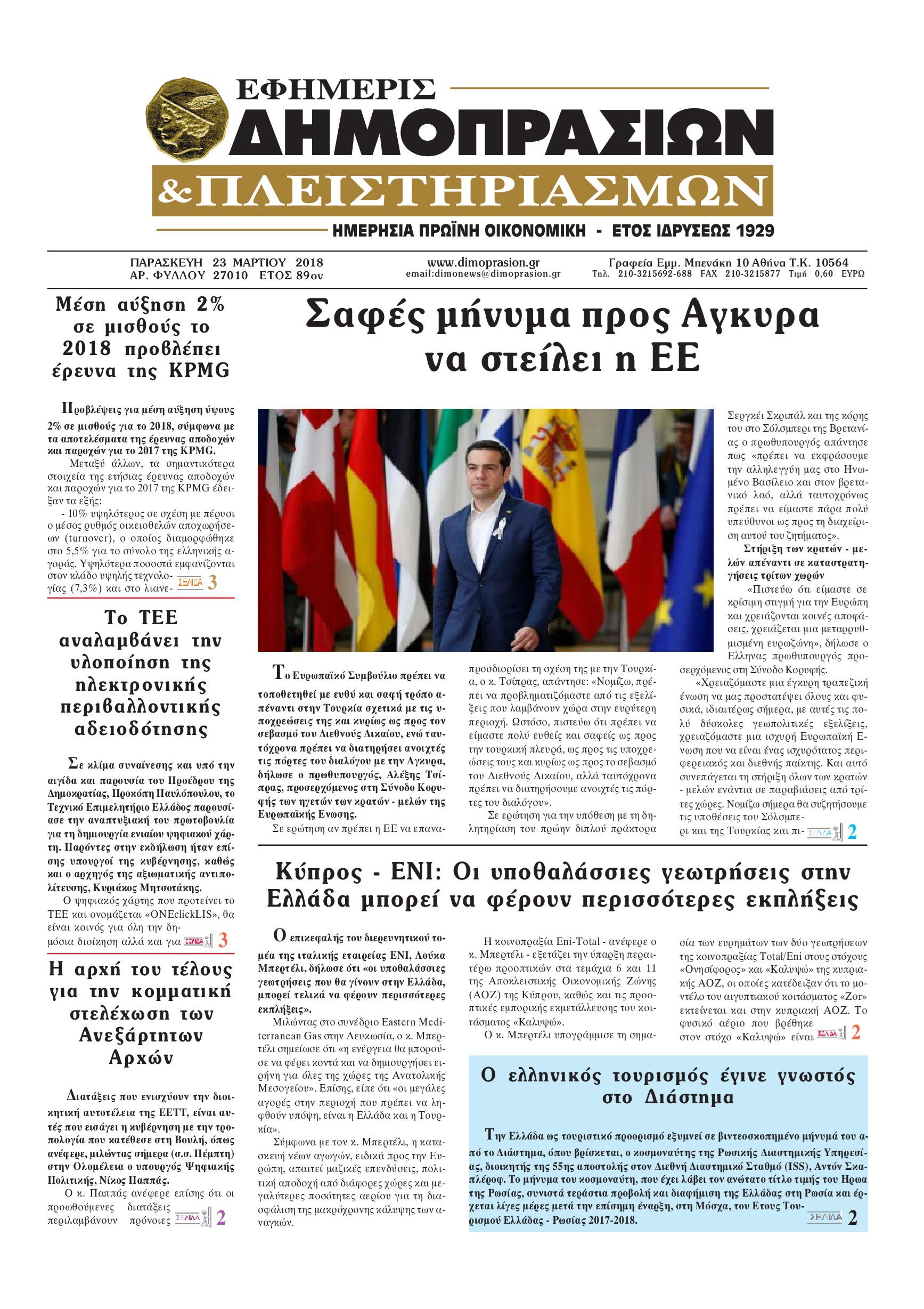 Οι οικονομικές εφημερίδες 23/3/2018 Enikos Newsroom 07:19, Παρασκευή 23 Μαρτίου 2018 Media Διαβάστε τα σημερινά πρωτοσέλιδα των οικονομικών εφημερίδων: ΟΙΚΟΝΟΜΙΚΕΣ ΕΦΗΜΕΡΙΔΕΣ ΠΡΩΤΟΣΕΛΙΔΑ Μοιράσου το: σχολίασε κι εσύ (0 σχόλια) Ακολουθήστε το enikos.gr στο Google News και μάθετε πρώτοι όλες τις ειδήσεις Δείτε όλες τις τελευταίες ειδήσεις από την Ελλάδα και τον Κόσμο στο enikos.gr Ειδήσεις Ροή Ειδήσεων 2 ώρες πριν Δημοσκόπηση Metron Analysis: Στις 10 μονάδες η διαφορά ΝΔ-ΠΑΣΟΚ, στην 3η θέση η Πλεύση Ελευθερίας – 8 στους 10 στηρίζουν τον αγώνα των αγροτών 6 ώρες πριν Αγρότες: «Όχι στον διάλογο, μας εμπαίζει η κυβέρνηση» – Αποφάσισαν κλιμάκωση των κινητοποιήσεων, τι θα γίνει τα Χριστούγεννα 2 ώρες πριν Νίκος Παππάς στον ΑΝΤ1: «Δεν κρύβομαι – Μετά το συμβάν ακολούθησα κανονικά το πρόγραμμά μου» – ΒΙΝΤΕΟ 3 ώρες πριν Αθήνα: Εξαρθρώθηκε εγκληματική οργάνωση που διακινούσε ναρκωτικά σε μορφή σοκολάτας – Δύο τράπερ ανάμεσα στους 4 συλληφθέντες – ΒΙΝΤΕΟ 2 ώρες πριν Διαμαντής Καραναστάσης: Οδηγούσε υπό την επήρεια αλκοόλ – Του αφαιρέθηκε το δίπλωμα και του επιβλήθηκε πρόστιμο 350 ευρώ 2 ώρες πριν Manifesting: Πώς να συναντήσετε τον σύντροφο της ζωής σας, ανάλογα με τον μήνα γέννησής σας 4 ώρες πριν Γάμος: 11 ψυχρές αλλά ευγενικές φράσεις, που λέει ένας άνδρας όταν σκέφτεται τον χωρισμό 3 ώρες πριν Σφουγγάρισμα: Η συνήθεια που θα σας βοηθήσει να διατηρήσετε το σπίτι σας καθαρό και τακτοποιημένο 2 ημέρες πριν 20 χρόνια τα Χριστούγεννα ξεκινούν στα Public με μεγάλη ποικιλία σε δώρα! 3 λεπτά πριν Μπορεί ο Μαδούρο να αντέξει τον αποκλεισμό του Τραμπ; Τι θα χρειαστεί η Ουάσινγκτον για να τον ανατρέψει 7 λεπτά πριν Αρχαιολόγοι ανακάλυψαν ρωμαϊκά τεχνουργήματα από μια πόλη που δεν υπήρξε ποτέ – Τα τρία εντυπωσιακά κτίρια και ο αμφορέας με τις… σαρδέλες 8 λεπτά πριν Στο ΟΑΚΑ για το «Παναθηναϊκός – Χάποελ» η Κίμπερλι Γκίλφοϊλ – ΦΩΤΟ 16 λεπτά πριν Ούρσουλα φον ντερ Λάιεν: Μετατίθεται για τον Ιανουάριο η υπογραφή της εμπορικής συμφωνίας «ΕΕ-MERCOSUR» 21 λεπτά πριν Φοινικούντα: Το Σάββατο απολογείται ο 30χρονος γιος γνωστού επιχειρηματία της Πλάκας που παραδόθηκε – Όσα είπε στους αστυνομικούς και ο ρόλος του στο έγκλημα ENIKOS NETWORK Σε περίοδο αυξημένης δραστηριότητας η γρίπη στην Ελλάδα-Μέτρα προστασίας από τον ΕΟΔΥ Σκέφτεστε συνέχεια συζητήσεις που έχετε κάνει; Τι σημαίνει αυτό, σύμφωνα με ειδικό Λαγκάρντ: Αισιόδοξη για την ανάπτυξη της Ευρωζώνης, αβέβαιη για τον πληθωρισμό ΑΣΕΠ 2ΓΒ/2025: Σήμερα αρχίζει η υποβολή ενστάσεων – Πότε θα βγουν τα οριστικά αποτελέσματα Χαρτογραφώντας το «σημείο χωρίς επιστροφή»: Για πρώτη φορά αποκαλύπτεται με λεπτομέρεια το ακανθώδες όριο της ατμόσφαιρας τ... Η Google καταργεί τη λειτουργία «dark web report» – Πώς θα μπορούν οι χρήστες να διαγράφουν τα δεδομένα τους περισσότερα 17:45 , Πέμπτη 18 Δεκεμβρίου 2025 ROUK ZOUK: Εορταστικό επεισόδιο με καλεσμένους τους πρωταγωνιστές του «Γιατί ρε πατέρα» Το Σάββατο 20 Δεκεμβρίου στις 21:00, η Ζέτα Μακρυπούλια υποδέχεται εκλεκτούς ηθοποιούς που όλο... 17:20 , Πέμπτη 18 Δεκεμβρίου 2025 Άγιος έρωτας: Η Χριστίνα εξομολογείται στον πατέρα Νικόλαο, απόψε στις 21:00 στον Alpha Η Νότα αποφασίζει να εκδικηθεί τον Πέτρο και τον Στέφανο, για χάρη του Λούη, όμως τα πράγματα ... 16:50 , Πέμπτη 18 Δεκεμβρίου 2025 Να μ’ αγαπάς: Ζωή και Φωτεινή συμφιλιώνονται ως μάνα με κόρη, απόψε στις 20:00 Η ταυτότητα του Άγγελου αποκαλύπτεται στο νέο επεισόδιο της σειράς “Να μ’ αγαπάς... 15:52 , Πέμπτη 18 Δεκεμβρίου 2025 Το Σπίτι