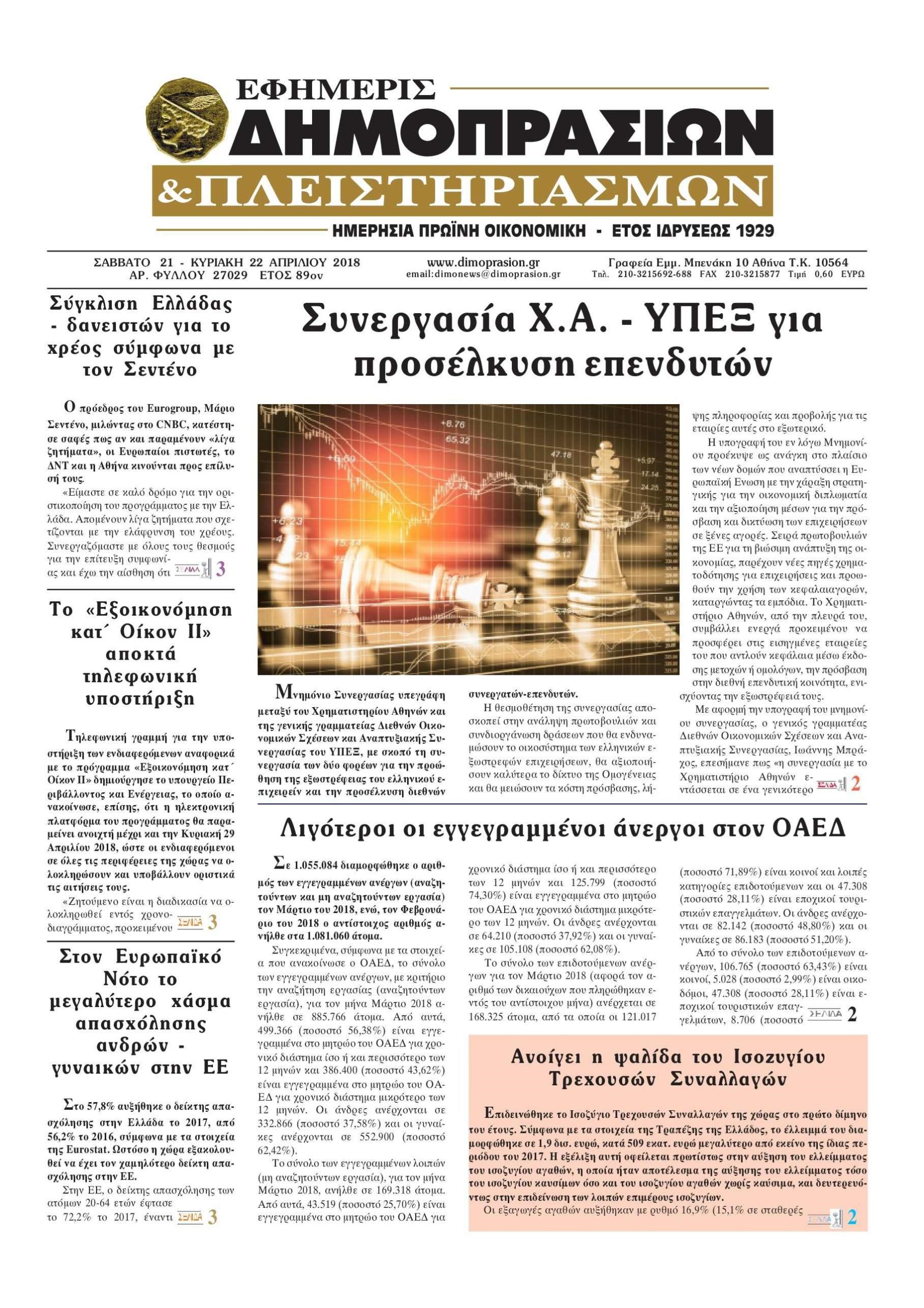 Οι οικονομικές εφημερίδες 23/4/2018 Enikos Newsroom 07:17, Δευτέρα 23 Απριλίου 2018 Media Διαβάστε τα σημερινά πρωτοσέλιδα των οικονομικών εφημερίδων: ΟΙΚΟΝΟΜΙΚΕΣ ΕΦΗΜΕΡΙΔΕΣ ΠΡΩΤΟΣΕΛΙΔΑ Μοιράσου το: σχολίασε κι εσύ (0 σχόλια) Ακολουθήστε το enikos.gr στο Google News και μάθετε πρώτοι όλες τις ειδήσεις Δείτε όλες τις τελευταίες ειδήσεις από την Ελλάδα και τον Κόσμο στο enikos.gr Ειδήσεις Ροή Ειδήσεων 4 ώρες πριν Υπόθεση Έπσταϊν: Το Υπουργείο Δικαιοσύνης δημοσιοποίησε μια σειρά από εξαιρετικά επεξεργασμένα αρχεία – «Λείπουν τα πιο σημαντικά έγγραφα», λένε οι Δημοκρατικοί 45 λεπτά πριν Γιορτές με μπλόκα για τους αγρότες: Ανοίγουν διόδια και μοιράζουν προϊόντα στους ταξιδιώτες 1 ώρα πριν Εξαφάνιση 33χρονου γιατρού στην Κρήτη: «Άναψα τα φώτα, τρόμαξε και άρχισε να τρέχει στα χωράφια» – Η τελευταία διαδρομή και η μαρτυρία «κλειδί» 3 ώρες πριν Ο «χάρτης» με τις αυξήσεις και τις φοροελαφρύνσεις του 2026 – Ποιοι και πόσα κερδίζουν 1 ώρα πριν Τα αρχεία του Έπσταϊν αποκαλύπτουν φωτογραφία του έκπτωτου πρίγκιπα Άντριου – Είναι ξαπλωμένος στην αγκαλιά 5 γυναικών 1 ώρα πριν Μία νέα «χρυσή» περίοδος αρχίζει για 3 ζώδια από σήμερα – «Μία αναπάντεχη ευκαιρία οδηγεί στην επιτυχία» 5 ώρες πριν Αυγά: Πόσα μπορείτε να τρώτε την ημέρα με ασφάλεια για μέγιστη πρόσληψη πρωτεΐνης 3 ώρες πριν Αρχαιολόγοι ανακάλυψαν σε χωράφι απεικόνιση 600 ετών ενός Αγίου – Τα στοιχεία που δείχνουν ότι μαρτύρησε 2 ώρες πριν Αγχώνεται για το χριστουγεννιάτικο δώρο που πήρε στην πλούσια σύντροφό του – «Φοβάμαι πως θα το βρει φθηνιάρικο, φοράει βραχιόλια Cartier» 2 λεπτά πριν Τα Labubu «μετακομίζουν» στο Χόλιγουντ: Η Sony Pictures ετοιμάζει live-action ταινία με τον σκηνοθέτη του «Wonka» 10 λεπτά πριν Νέες ταυτότητες: Μεγάλη αναμονή για ραντεβού στην Αττική – Τέλος τα ταξίδια εκτός Ελλάδος από τον Αύγουστο για όσους δεν έχουν αλλάξει 18 λεπτά πριν Οι 7 φράσεις που δεν λένε ποτέ οι συναισθηματικά έξυπνοι άνθρωποι κατά τη διάρκεια ενός καβγά 22 λεπτά πριν Τηλεθέαση (19/12): Ανατροπές και πρωτιές στην πρωινή ζώνη 29 λεπτά πριν Πώς η κλιματική αλλαγή επηρεάζει εγκύους και βρέφη – Οι επιπτώσεις των υψηλών θερμοκρασιών ENIKOS NETWORK Είστε μόνιμα απρόσεκτοι; 3 σημάδια που δείχνουν ότι μπορεί να είναι σύμπτωμα πάθησης Πόσα κιλά παίρνουμε πραγματικά τα Χριστούγεννα, σύμφωνα με την επιστήμη – Πώς να το αποτρέψουμε; Επίδομα παιδιού: Τι αλλάζει από το 2026 – Το όφελος από τις φορολογικές ελαφρύνσεις Mega χριστουγεννιάτικη φορολοταρία: «Κλείδωσε» η ημερομηνία για την κλήρωση – Ερωτήσεις και απαντήσεις Χαρτογραφώντας το «σημείο χωρίς επιστροφή»: Για πρώτη φορά αποκαλύπτεται με λεπτομέρεια το ακανθώδες όριο της ατμόσφαιρας τ... Η Google καταργεί τη λειτουργία «dark web report» – Πώς θα μπορούν οι χρήστες να διαγράφουν τα δεδομένα τους περισσότερα 09:30 , Σάββατο 20 Δεκεμβρίου 2025 «Porto Leone: Στη γειτονιά με τα κόκκινα φανάρια» – Ο Χρόνης αποκαλύπτει στην Αλεξάνδρα το μυστικό για το παιδί της Λένας Η μεγάλη δραματική σειρά του Apha «Porto Leone: Στη γειτονιά με τα κόκκινα φανάρια» μας μεταφέ... 08:14 , Σάββατο 20 Δεκεμβρίου 2025 Τρομεροί γονείς: Η Μαρία Καβογιάννη εισβάλλει στο σπίτι της οικογένειας Στεφανίδη Όσα θα δούμε στο νέο διπλό επεισόδιο της σειράς «Τρομεροί γονείς», σήμερα Σάββατο 20 Δεκεμβρίο... 05:48 , Σάββατο 20 Δεκεμβρίου 2025 Οι οικονομικές εφημερίδες 20/12/2025 Διαβάστε τα πρωτοσέλιδα από τις οικονομικές εφημερίδες, σήμερα 20/12/2025. 05:43 , Σάββατο 20 Δεκεμβρίου 2025 Οι αθλητικές εφημερίδες 20/12/