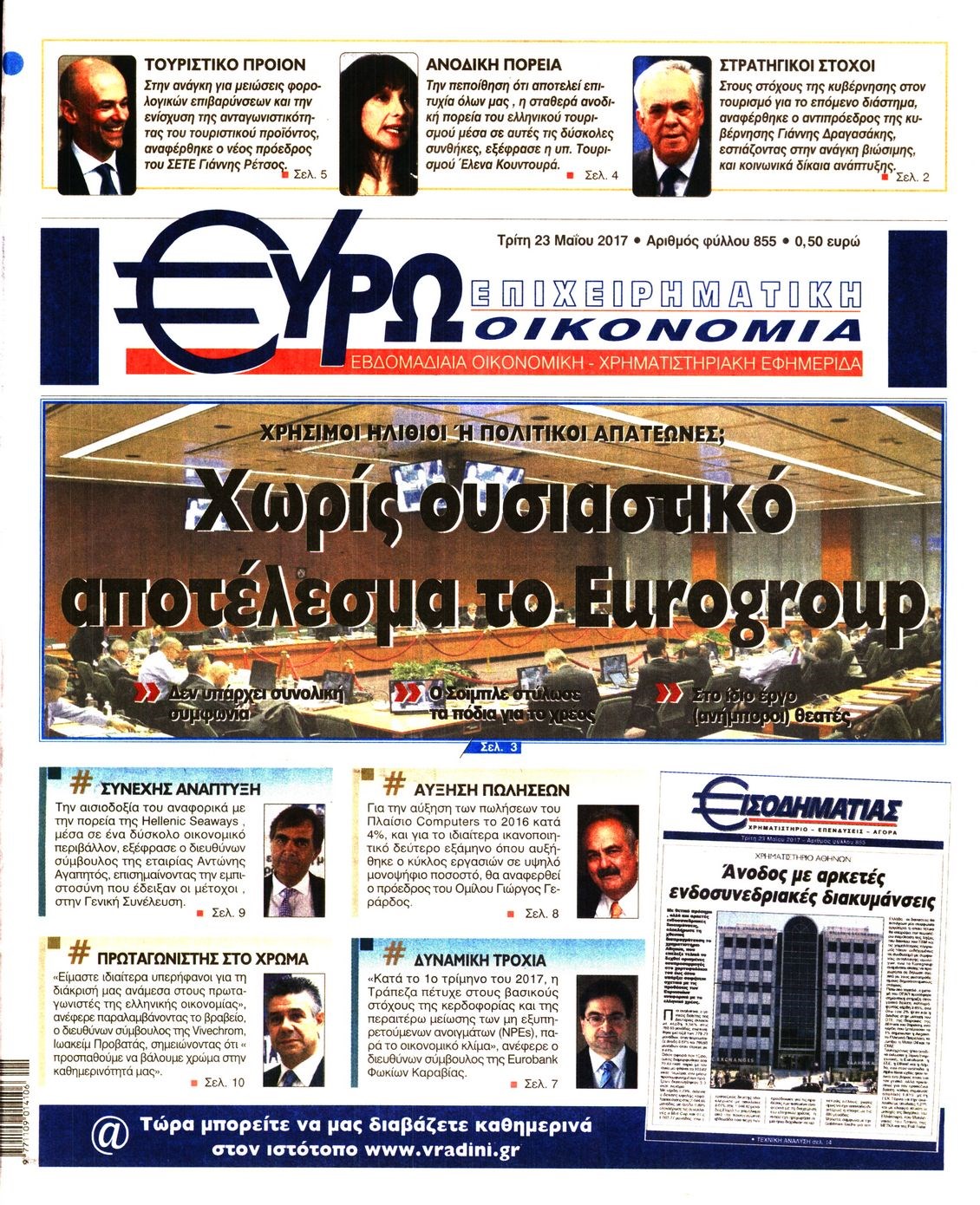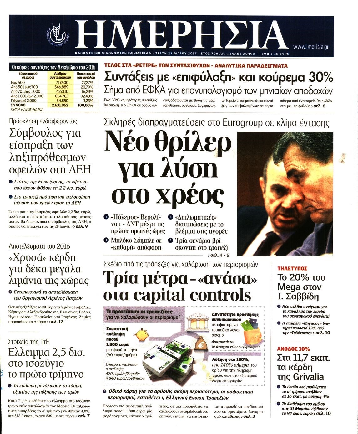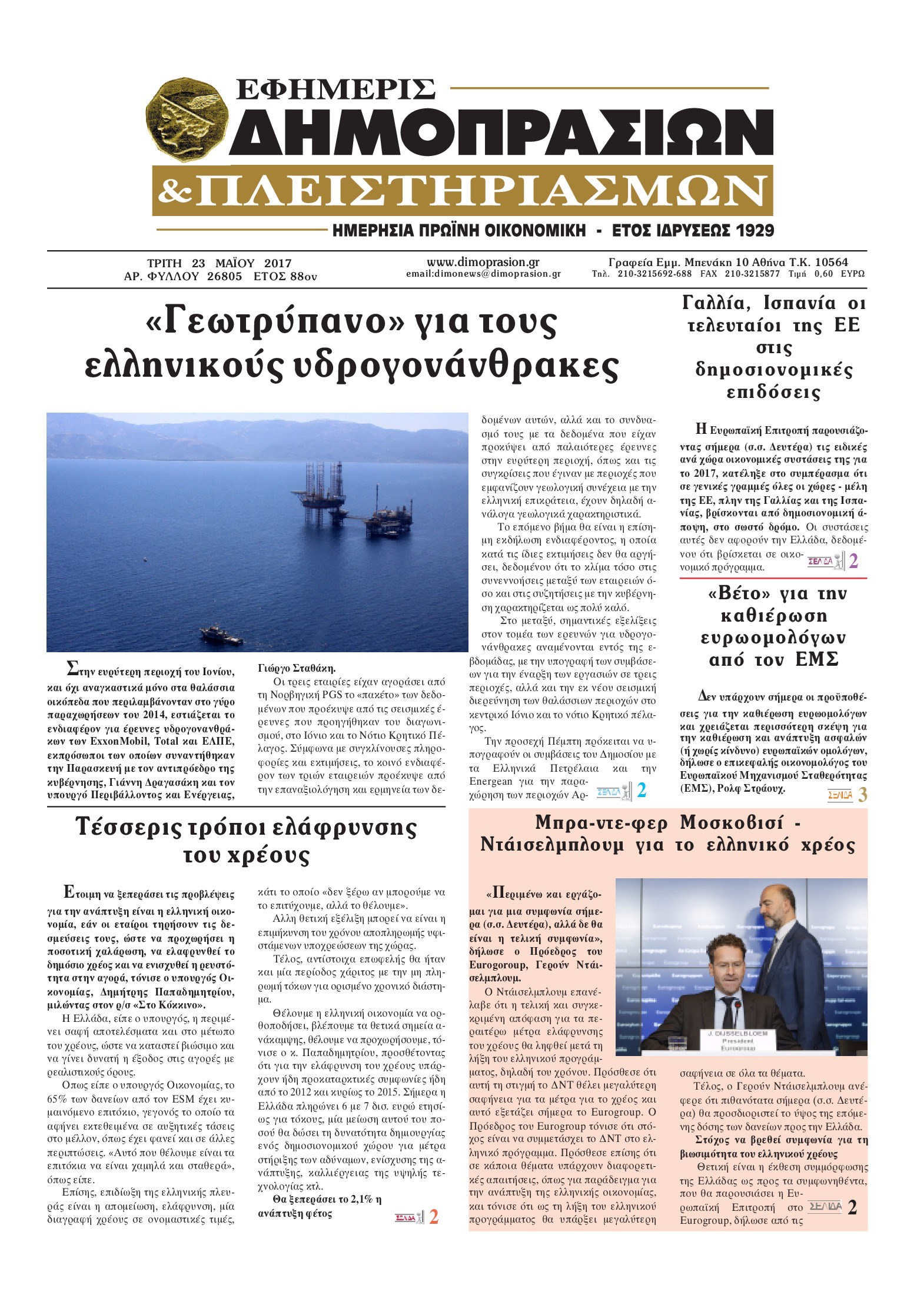 Οι οικονομικές εφημερίδες 23/5/2017 Enikos Newsroom 06:29, Τρίτη 23 Μαΐου 2017 Media Διαβάστε τα σημερινά πρωτοσέλιδα των οικονομικών εφημερίδων: ΟΙΚΟΝΟΜΙΚΕΣ ΕΦΗΜΕΡΙΔΕΣ ΠΡΩΤΟΣΕΛΙΔΑ Μοιράσου το: σχολίασε κι εσύ (0 σχόλια) Ακολουθήστε το enikos.gr στο Google News και μάθετε πρώτοι όλες τις ειδήσεις Δείτε όλες τις τελευταίες ειδήσεις από την Ελλάδα και τον Κόσμο στο enikos.gr Ειδήσεις Ροή Ειδήσεων 19 λεπτά πριν Την πρώτη Belharra παρέλαβε η χώρα μας, υψώθηκε η ελληνική σημαία στη φρεγάτα «Κίμων» – Δένδιας: «Το ισχυρότερο Πολεμικό Ναυτικό που είχε ποτέ ο ελληνισμός» 3 ώρες πριν Γιώργος Μαζωνάκης: «Δεν ζήτησα χρήματα, παρά μόνο ηθική δικαίωση» – Οι πρώτες δηλώσεις του 21χρονου μετά την κατάθεση της μήνυσης 2 ώρες πριν Δίκη Βαλυράκη: Καταθέτει ο βασικός αυτόπτης μάρτυρας – «Δέχτηκα πιέσεις να μη μιλήσω, πήγα να ψωνίσω και αυτοκίνητο με χτύπησε στο πόδι» 1 ώρα πριν Ώρα αποφάσεων για τους αγρότες – Ξεκίνησε η πανελλαδική σύσκεψη μπλόκων στις Σέρρες – ΦΩΤΟ 6 ώρες πριν Συναγερμός και στην Ελλάδα για τη «σούπερ γρίπη»: Πόσο σοβαρή είναι και ποιοι θεωρούνται πιο ευάλωτοι – 3 ειδικοί μιλούν στο enikos.gr 7 ώρες πριν Τα 4 ζώδια που λαμβάνουν ένα ισχυρό σημάδι από το σύμπαν – «Αποκαλύπτεται κάτι που μπορεί να αλλάξει τη ζωή μας» 6 ώρες πριν Αν κάνετε συνεχώς αυτά τα 8 πράγματα με τα κατοικίδιά σας, σας λείπει η ανθρώπινη επαφή 2 ώρες πριν Αυτό που κρύβεται κάτω από τη Γροιλανδία θα μπορούσε να ανατρέψει όσα γνωρίζουμε για την άνοδο της στάθμης των θαλασσών 1 ημέρα πριν 20 χρόνια τα Χριστούγεννα ξεκινούν στα Public με μεγάλη ποικιλία σε δώρα! 4 λεπτά πριν Εξεταστική για ΟΠΕΚΕΠΕ – Μπρατάκος: «Δεν μου τέθηκε ζήτημα για πιέσεις από τον κ. Αυγενάκη ή οποιονδήποτε» – Τι είπε για τον Σημανδράκο 6 λεπτά πριν ΤΕΧΑΝ: 1ο Πανελλήνιο Σχολικό Πρωτάθλημα Ανακύκλωσης Δευτεροβάθμιας Εκπαίδευσης 10 λεπτά πριν Τραυματίστηκε 5χρονο παιδί σε νηπιαγωγείο στο Αγρίνιο – Χτυπήθηκε από αντικείμενο που έπεσε από έπιπλο 15 λεπτά πριν Μεσσηνία: Παρέμβαση εισαγγελέα στο μπλόκο αγροτών στον κόμβο της Θουρίας έπειτα από καταγγελίες για παρακώλυση συγκοινωνιών 19 λεπτά πριν Την πρώτη Belharra παρέλαβε η χώρα μας, υψώθηκε η ελληνική σημαία στη φρεγάτα «Κίμων» – Δένδιας: «Το ισχυρότερο Πολεμικό Ναυτικό που είχε ποτέ ο ελληνισμός» ENIKOS NETWORK 100 χρόνια ΠΙΣ: Ένας αιώνας προσφοράς στην Ιατρική και την κοινωνία Ένα ποτήρι την ημέρα από αυτόν τον χυμό μειώνει τη χοληστερίνη, τη φλεγμονή και την πίεση Κρατική επιχορήγηση έως 14.500 ευρώ: Ποιοι θα λάβουν από σήμερα την προκαταβολή στον τραπεζικό λογαριασμό τους Αυτόματη απόδοση ΦΠΑ: Τα δύο σενάρια που επεξεργάζεται η ΑΑΔΕ Χαρτογραφώντας το «σημείο χωρίς επιστροφή»: Για πρώτη φορά αποκαλύπτεται με λεπτομέρεια το ακανθώδες όριο της ατμόσφαιρας τ... Η Google καταργεί τη λειτουργία «dark web report» – Πώς θα μπορούν οι χρήστες να διαγράφουν τα δεδομένα τους περισσότερα 15:52 , Πέμπτη 18 Δεκεμβρίου 2025 Το Σπίτι Δίπλα Στο Ποτάμι: Το καθηλωτικό τελευταίο επεισόδιο για το 2025 απόψε στις 22:30 Καθηλώνει το σημερινό επεισόδιο της σειράς “Το Σπίτι Δίπλα Στο Ποτάμι” που έρχεται... 15:20 , Πέμπτη 18 Δεκεμβρίου 2025 Άγιος έρωτας – Η Ελευθερία Αρβανιτάκη τραγουδά και ο Γιάννης Τσορτέκης καθηλώνει με τον χορό του Ο Κλεάνθης χορεύει στους ήχους της Ελευθερίας Αρβανιτάκη στη σειρά “Άγιος Έρωτας“.... 08:00 , Πέμπτη 18 Δεκεμβρίου 2025 Την Κυριακή με τη Realnews: Δωροεπιταγή 10€ Δωροεπιταγή αξίας 10€ για αγορές άνω των 60€ από τα πολυκαταστήματα FactoryOutle