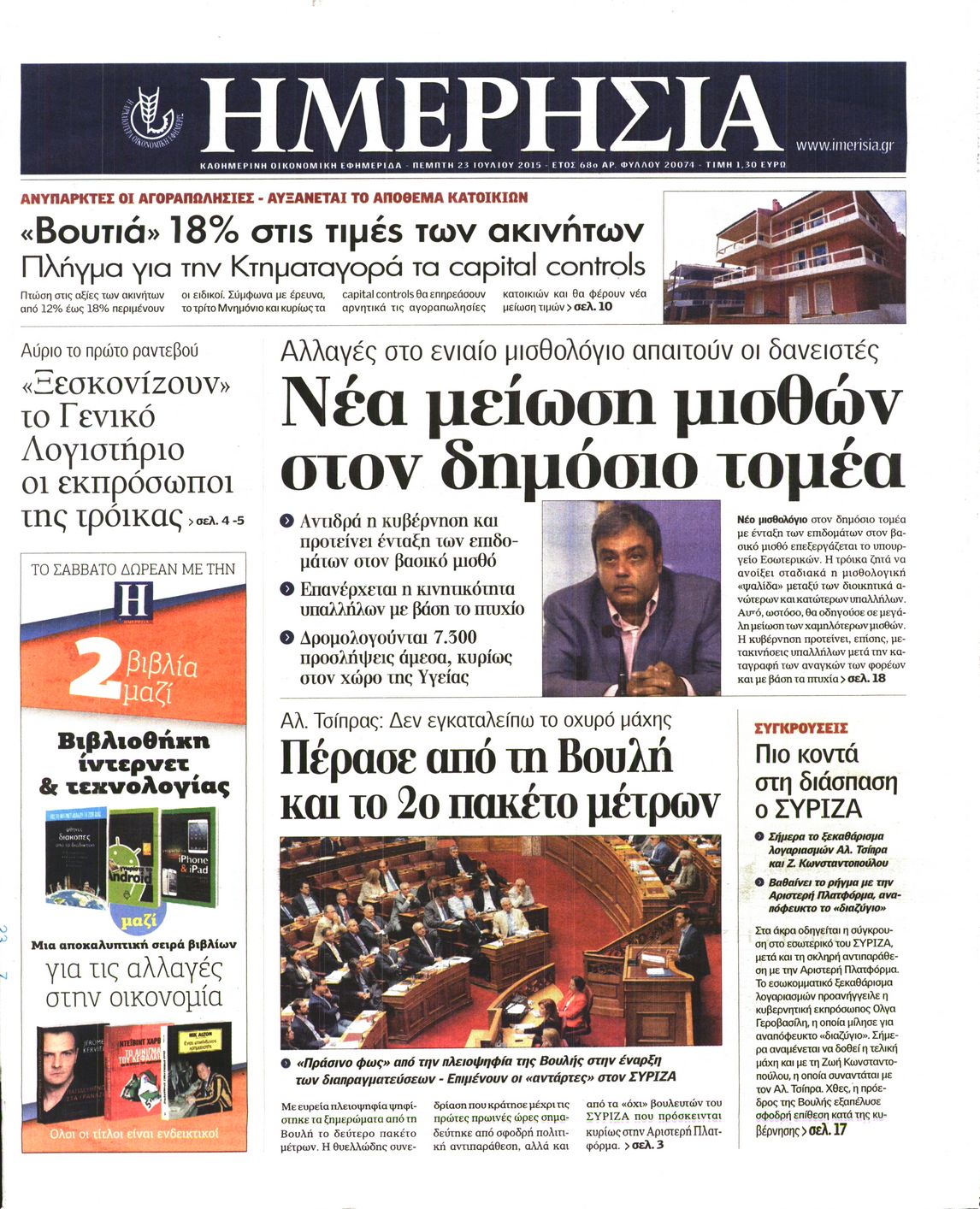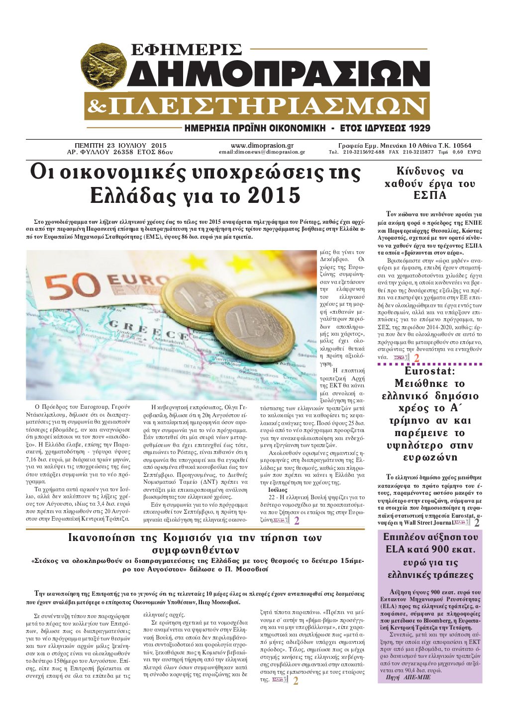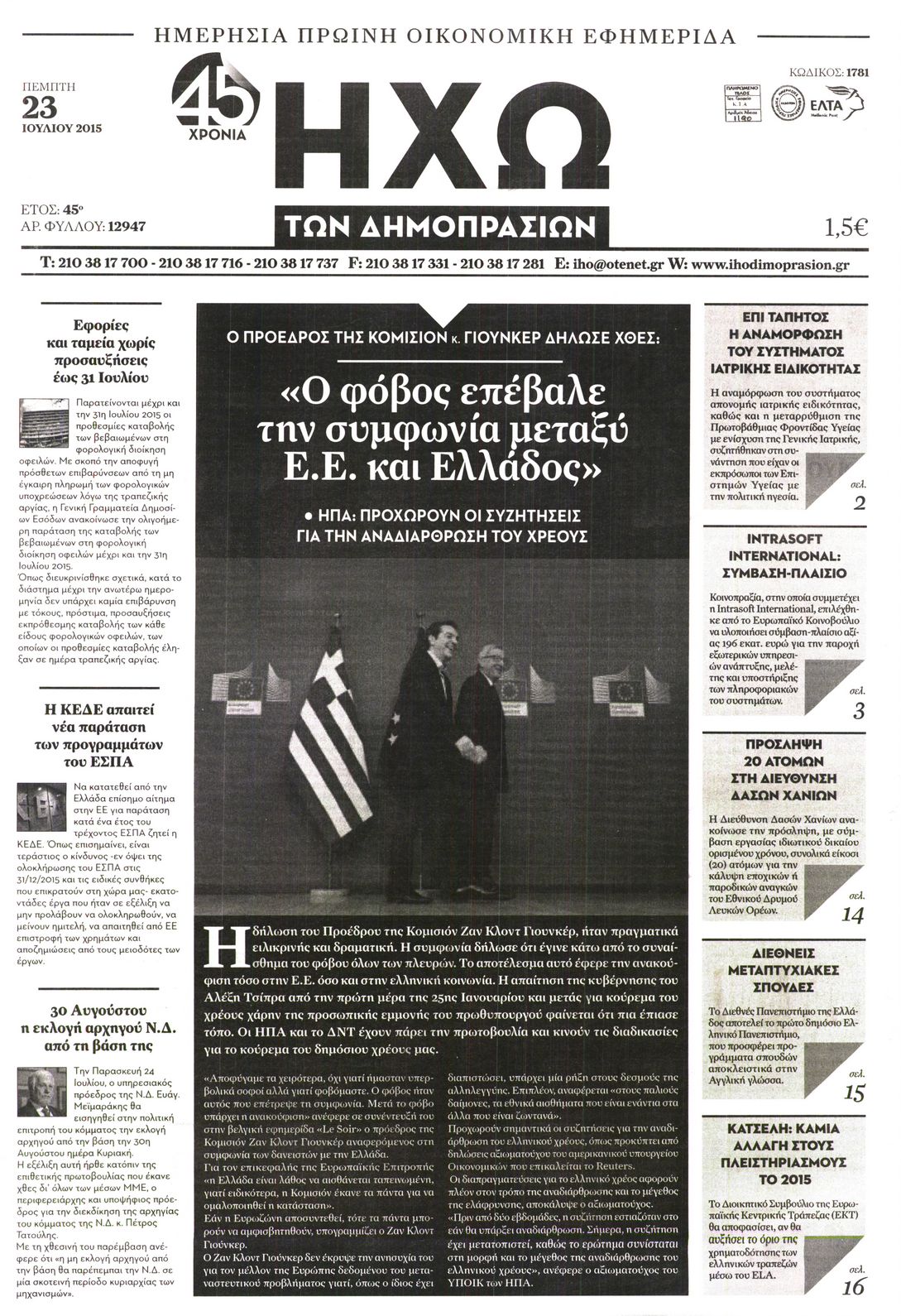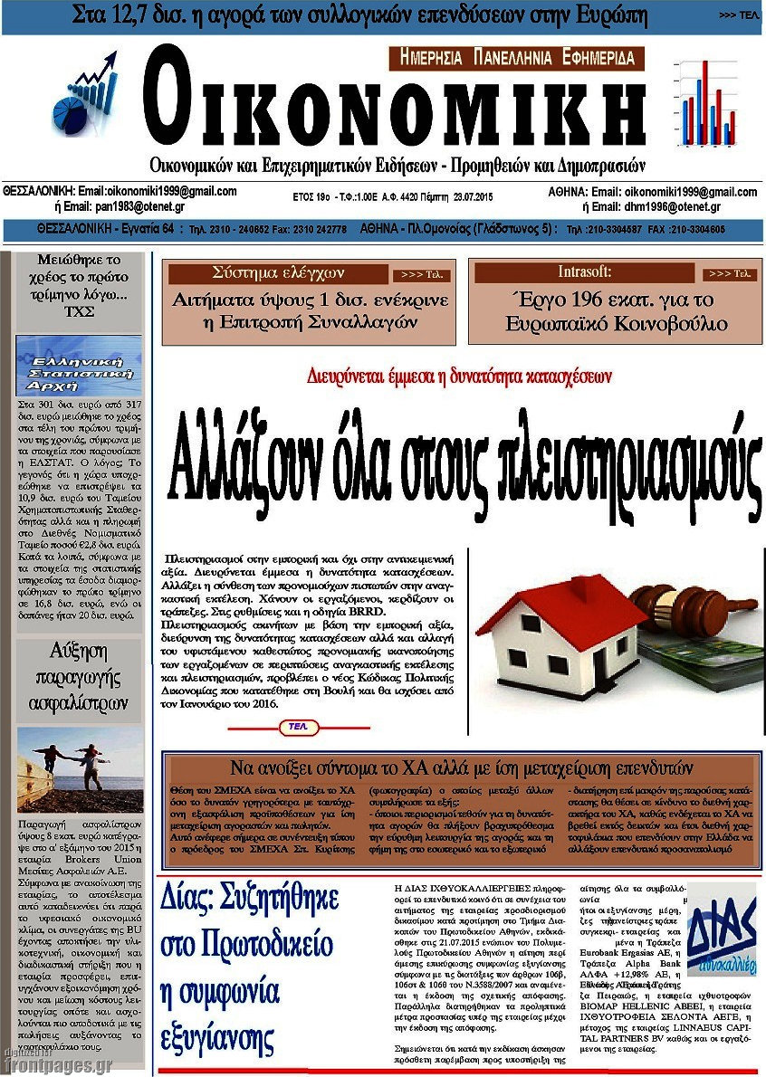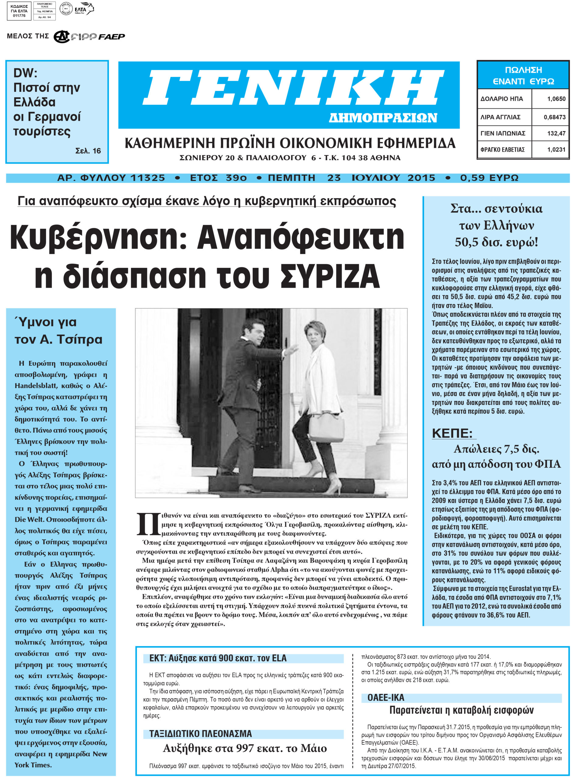 Οι οικονομικές εφημερίδες 23/7/2015 Enikos Newsroom 08:50, Πέμπτη 23 Ιουλίου 2015 Media Διαβάστε τα σημερινά πρωτοσέλιδα των οικονομικών εφημερίδων. ΕΦΗΜΕΡΙΔΕΣ ΟΙΚΟΝΟΜΙΚΕΣ ΕΦΗΜΕΡΙΔΕΣ ΠΡΩΤΟΣΕΛΙΔΑ Μοιράσου το: σχολίασε κι εσύ (0 σχόλια) Ακολουθήστε το enikos.gr στο Google News και μάθετε πρώτοι όλες τις ειδήσεις Δείτε όλες τις τελευταίες ειδήσεις από την Ελλάδα και τον Κόσμο στο enikos.gr Ειδήσεις Ροή Ειδήσεων 2 ώρες πριν Μητσοτάκης για αγρότες: Ελπίζω πως θα απομακρυνθούν σύντομα από τα μπλόκα 3 ώρες πριν Έρευνα MRB: Η πρόθεση ψήφου και τα σημαντικότερα προβλήματα – Οι «λέξεις» που εκφράζουν τους πολίτες 6 λεπτά πριν Αμοργός: «Θα προσπαθήσω να το κάνω κάθε μέρα» – Ποιος είναι ο αγρότης που έστησε μόνος του το πρώτο μπλόκο στο νησί 42 λεπτά πριν Μισέλ Ομπάμα: Εμφανώς αδυνατισμένη στην εκπομπή του Τζίμι Κίμελ – Οι φήμες για τη χρήση Ozempic και η «φιλία» της με τον Ρομπ Ράινερ 36 λεπτά πριν Αγρότες: Επ’ αόριστον μπλόκο στον σταθμό στον Προμαχώνα για τα φορτηγά – Κλείνει το ρεύμα εισόδου στα Μάλγαρα 3 ώρες πριν Τα 4 ζώδια που ξαναβρίσκουν τον εαυτό τους – «Μπαίνετε επιτέλους στην ουσία των πραγμάτων» 4 ώρες πριν 20 χρόνια τα Χριστούγεννα ξεκινούν στα Public με μεγάλη ποικιλία σε δώρα! 2 ώρες πριν «Δεν είχα κλάψει από τότε που διαγνώστηκα με καρκίνο, ώσπου ένα τηλεφώνημα με έκανε να λυγίσω» – Η συγκλονιστική εξομολόγηση ενός άνδρα 1 ώρα πριν Τα 7 σπάνια χαρακτηριστικά που κάνουν κάποιους ανθρώπους ακαταμάχητους 3 λεπτά πριν Bloomberg: Οι ΗΠΑ ετοιμάζουν νέες κυρώσεις σε βάρος της Ρωσίας εάν ο Πούτιν απορρίψει μια ειρηνευτική συμφωνία 6 λεπτά πριν Αμοργός: «Θα προσπαθήσω να το κάνω κάθε μέρα» – Ποιος είναι ο αγρότης που έστησε μόνος του το πρώτο μπλόκο στο νησί 9 λεπτά πριν Βίντεο: Με γερανό απομακρύνθηκε αυτοκίνητο στο Μαρούσι – Η οδηγός… είχε αργήσει σε ραντεβού 15 λεπτά πριν ΟΠΕΚΕΠΕ: Κανονικά οι πληρωμές των αγροτών μετά το νέο αλαλούμ – «Το τεχνικό πρόβλημα επιλύθηκε» 20 λεπτά πριν Ο Δημήτρης Μαύρος στον Realfm 97,8 για τις τάσεις της MRB ENIKOS NETWORK Ανησυχητική αύξηση της υπέρτασης στα παιδιά – Πώς θα τα προστατέψουμε; Αδενώματα Υπόφυσης: Μια πάθηση καλοήθης, αλλά όχι αθώα Διεθνής Οργανισμός Ενέργειας (ΔΟΕ, IEA): Τι δείχνουν τα νέα στοιχεία για την παγκόσμια κατανάλωση άνθρακα Διευκρινίσεις από το ΥΠΑΑΤ και τον ΟΠΕΚΕΠΕ για την εξόφληση της βασικής ενίσχυσης στους αγρότες Σύγχρονος Νοστράδαμος: Προειδοποιεί για «μεγάλο γεγονός» τους επόμενους μήνες που θα συγκλονίσει τη Βρετανία και τον κόσμο Τεστ παρατηρητικότητας: Μπορείτε να βρείτε τις 3 διαφορές στις εικόνες με έναν πιγκουίνο σε 14 δευτερόλεπτα περισσότερα 12:35 , Τετάρτη 17 Δεκεμβρίου 2025 Μίρκα Παπακωνσταντίνου: «Δεν ήμουν αισιόδοξη για τα νούμερα – Είμαι ρεαλίστρια» Στα γυρίσματα του εορταστικού επεισοδίου της αγαπημένης σειράς “Το Σόι Σου”, βρέθηκε η κάμερα ... 12:12 , Τετάρτη 17 Δεκεμβρίου 2025 Ακούστε την εκπομπή του Νίκου Χατζηνικολάου 17/12/2025 Ακούστε την εκπομπή του Νίκου Χατζηνικολάου στον ραδιοφωνικό σταθμό RealFm 97,8, την Τετάρτη 1... 11:35 , Τετάρτη 17 Δεκεμβρίου 2025 Home Alone: Το σπίτι της ταινίας θα ανακαινιστεί – Επιστροφή στην αισθητική της δεκαετίας του ’90 Οι νέοι ιδιοκτήτες του πραγματικού σπιτιού που παρουσιάζεται στην κλασική ταινία του 1990 «Hom... 11:25 , Τετάρτη 17 Δεκεμβρίου 2025 Grand Hotel: Απόψε το τελευταίο επεισόδιο της χρονιάς – Όλα τα μυστικά μένουν εδώ Το τελευταίο επεισόδιο της χρονιάς της σειράς «Grand Hotel» θα προβληθεί απόψε στις 21:00. Ο Ά... ΤΕΛΕΥΤΑΙΕΣ 