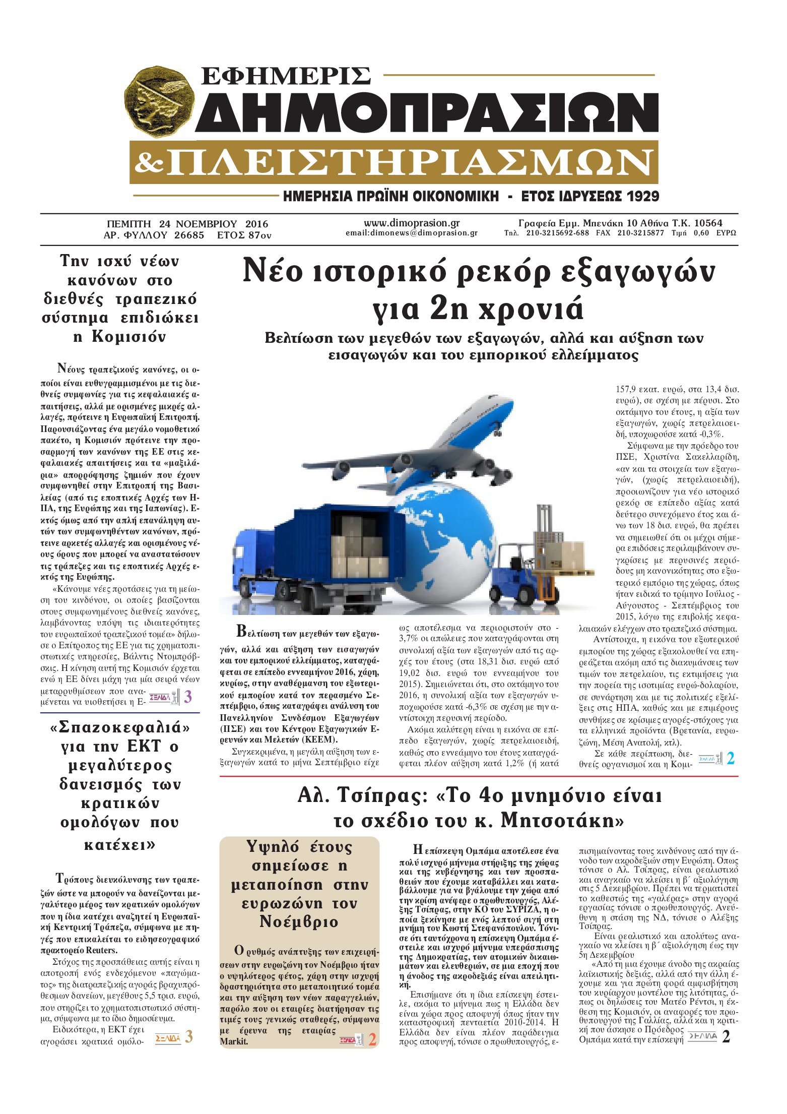 Οι οικονομικές εφημερίδες 24/11/2016 Enikos Newsroom 03:01, Πέμπτη 24 Νοεμβρίου 2016 Media Διαβάστε τα σημερινά πρωτοσέλιδα των οικονομικών εφημερίδων: ΟΙΚΟΝΟΜΙΚΕΣ ΕΦΗΜΕΡΙΔΕΣ ΠΡΩΤΟΣΕΛΙΔΑ Μοιράσου το: σχολίασε κι εσύ (0 σχόλια) Ακολουθήστε το enikos.gr στο Google News και μάθετε πρώτοι όλες τις ειδήσεις Δείτε όλες τις τελευταίες ειδήσεις από την Ελλάδα και τον Κόσμο στο enikos.gr Ειδήσεις Ροή Ειδήσεων 15 λεπτά πριν Μητσοτάκης: Η τριμερής Ελλάδας – Κύπρου – Ισραήλ ενισχύει τη σταθερότητα και την ασφάλεια στην ανατολική Μεσόγειο 1 ώρα πριν Αγρότες: Ανοίγουν το τελωνείο των Κήπων και για τα φορτηγά από απόψε έως και την Παρασκευή 1 ώρα πριν Προκλήσεις: Έστειλαν πάλι οπλισμένα F-16 στο Αιγαίο οι Τούρκοι – Παραβιάσεις και αερομαχίες 1 ώρα πριν Ποινική δίωξη για δύο κακουργήματα άσκησε ο Εισαγγελέας σε 3 αγρότες 1 ώρα πριν Σύλλογος Πληγέντων Τεμπών για ΣΔΟΕ: «Δεν τρομοκρατούμαστε. Συνεχίζουμε!» 1 ώρα πριν Τα μυστικά του «αόρατου» φλερτ: 7 τρόποι για να δείξετε το ενδιαφέρον σας για κάποιον χωρίς να αποκαλυφθούν οι προθέσεις σας 4 ώρες πριν Αυτό το ζώδιο θα ξαναγεννηθεί το 2026 – «Αφήνετε τις δυσκολίες στο παρελθόν και κάνετε restart» 2 ημέρες πριν Enerwave: Το νέο «ρεύμα» στη λιανική ενέργειας που αλλάζει την εμπειρία του καταναλωτή 5 ώρες πριν Ιστορική ανακάλυψη στη Φυσική – Επιβεβαιώθηκε η ύπαρξη του «δεύτερου ήχου» 12 λεπτά πριν Το έξυπνο κόλπο για να μην χαλάσετε τους τοίχους σας από τα αυτοκόλλητα άγκιστρα 15 λεπτά πριν Μητσοτάκης: Η τριμερής Ελλάδας – Κύπρου – Ισραήλ ενισχύει τη σταθερότητα και την ασφάλεια στην ανατολική Μεσόγειο 16 λεπτά πριν Παύλος Κοντογιαννίδης: «Επειδή με βλέπουν αυτοί που θέλουν να με βρίσουν και με ρωτάνε τι βαφή βάζω…» 21 λεπτά πριν Σωκράτης Φάμελλος: Επισκέφθηκε κοινωνικές δομές στη Θεσσαλονίκη – «Χρειαζόμαστε μια ισχυρή Πολιτεία για να υπάρχει κοινωνικό κράτος» 25 λεπτά πριν Ποιοι λόγοι κάνουν τους οδηγούς να οδηγούν γρήγορα ENIKOS NETWORK Στέλνετε ακόμα Χριστουγεννιάτικες κάρτες; Τι μπορεί να δείχνει για την προσωπικότητά σας Ενεργειακή αναβάθμιση του νοσοκομείου Πατρών «Ο Άγιος Ανδρέας» ΔΥΠΑ: 2.000 νέες θέσεις εργασίας για Άτομα με Αναπηρία σε Δήμους – Λήγει η προθεσμία υποβολής αιτήσεων Κίνα: Γιατί το Πεκίνο επιβάλλει προσωρινούς δασμούς σε εισαγωγές γαλακτοκομικών προϊόντων από την ΕΕ Ο Google Assistant θα παραμείνει λίγο περισσότερο για ορισμένους χρήστες Android Τεστ προσωπικότητας: Το βάζο που θα επιλέξετε αποκαλύπτει πώς λύνετε προβλήματα στη ζωή σας περισσότερα 19:41 , Δευτέρα 22 Δεκεμβρίου 2025 Porto Leone: Στη γειτονιά με τα κόκκινα φανάρια – Η Αλεξάνδρα ανακαλύπτει το μυστικό της Γαλήνης και της στήνει παγίδα Απόψε στις 22:30 στον Alpha η συγκλονιστική συνέχεια της δραματικής σειράς του Apha «Porto Leo... 19:16 , Δευτέρα 22 Δεκεμβρίου 2025 Άγιος έρωτας: Η Πετρούλα αφήνει την τελευταία της πνοή Καθηλώνει το προτελευταίο επεισόδιο της χρονιάς της σειράς “Άγιος Έρωτας” απόψε στ... 18:39 , Δευτέρα 22 Δεκεμβρίου 2025 Να μ’αγαπάς: Ο Θεόφιλος απειλεί να καταστρέψει τη Ζωή Σοκαριστικές αποκαλύψεις έρχονται στο νέο επεισόδιο της σειράς “Να μ΄αγαπάς” απόψε... 17:48 , Δευτέρα 22 Δεκεμβρίου 2025 Βελτιωτικές κινήσεις με νέους συνεργάτες Στοχευμένες κινήσεις για την ενίσχυση του «Καλημέρα Ελλάδα» κάνει ο ΑΝΤ1 ενόψει της νέας χρονι... ΤΕΛΕΥΤΑΙΕΣ ΕΙΔΗΣΕΙΣ 12 λεπτά πριν Το έξυπνο κόλπο για να μην χαλάσετε τους τοίχους σας... 15 λεπτά πριν Μητσοτάκης: Η τριμερής Ελλάδας – Κύπρου – Ισραήλ... 16 λεπτά πριν Παύλος Κο