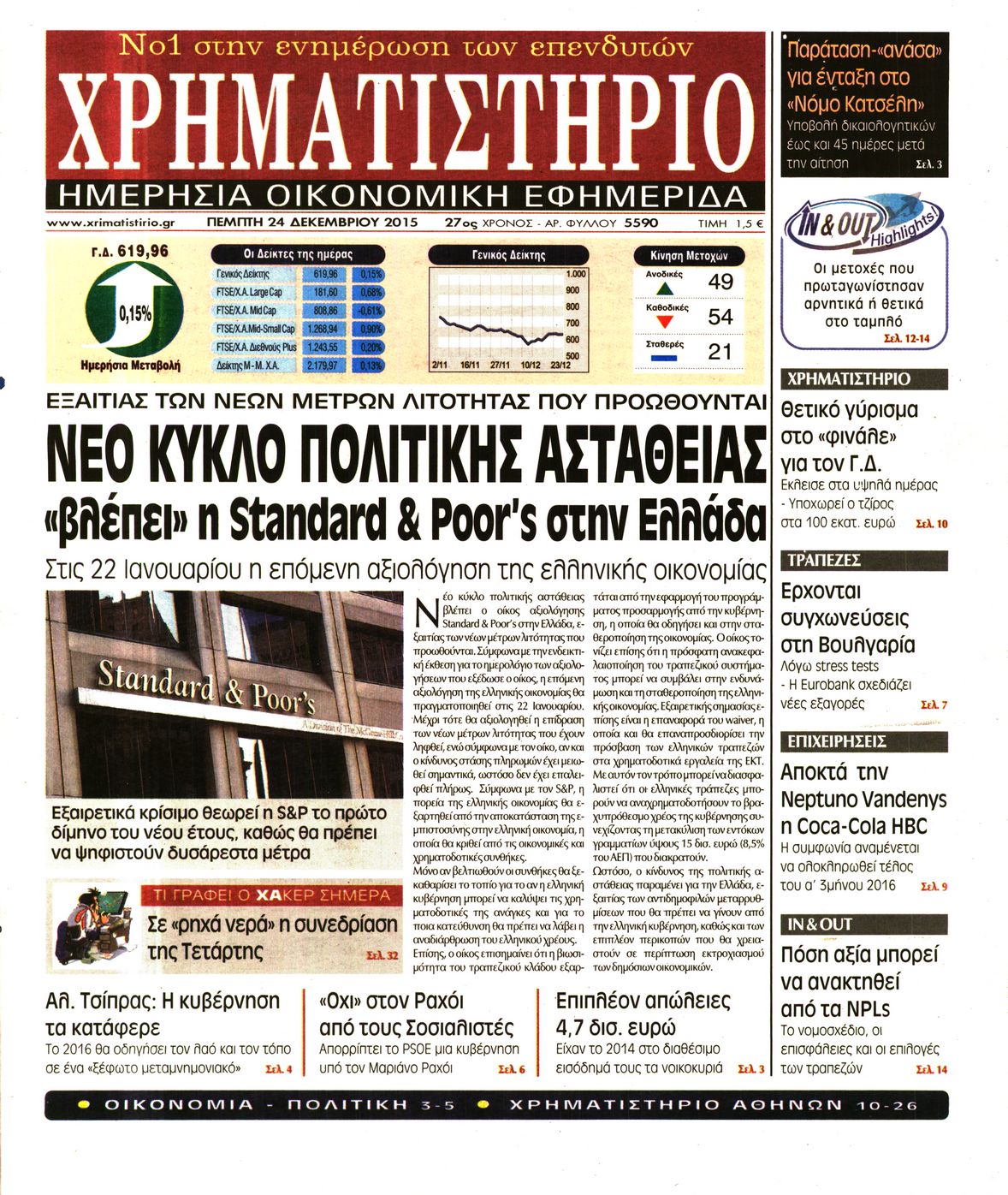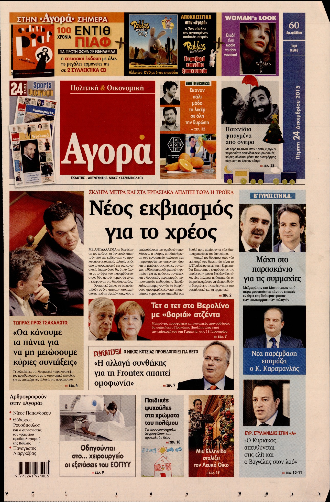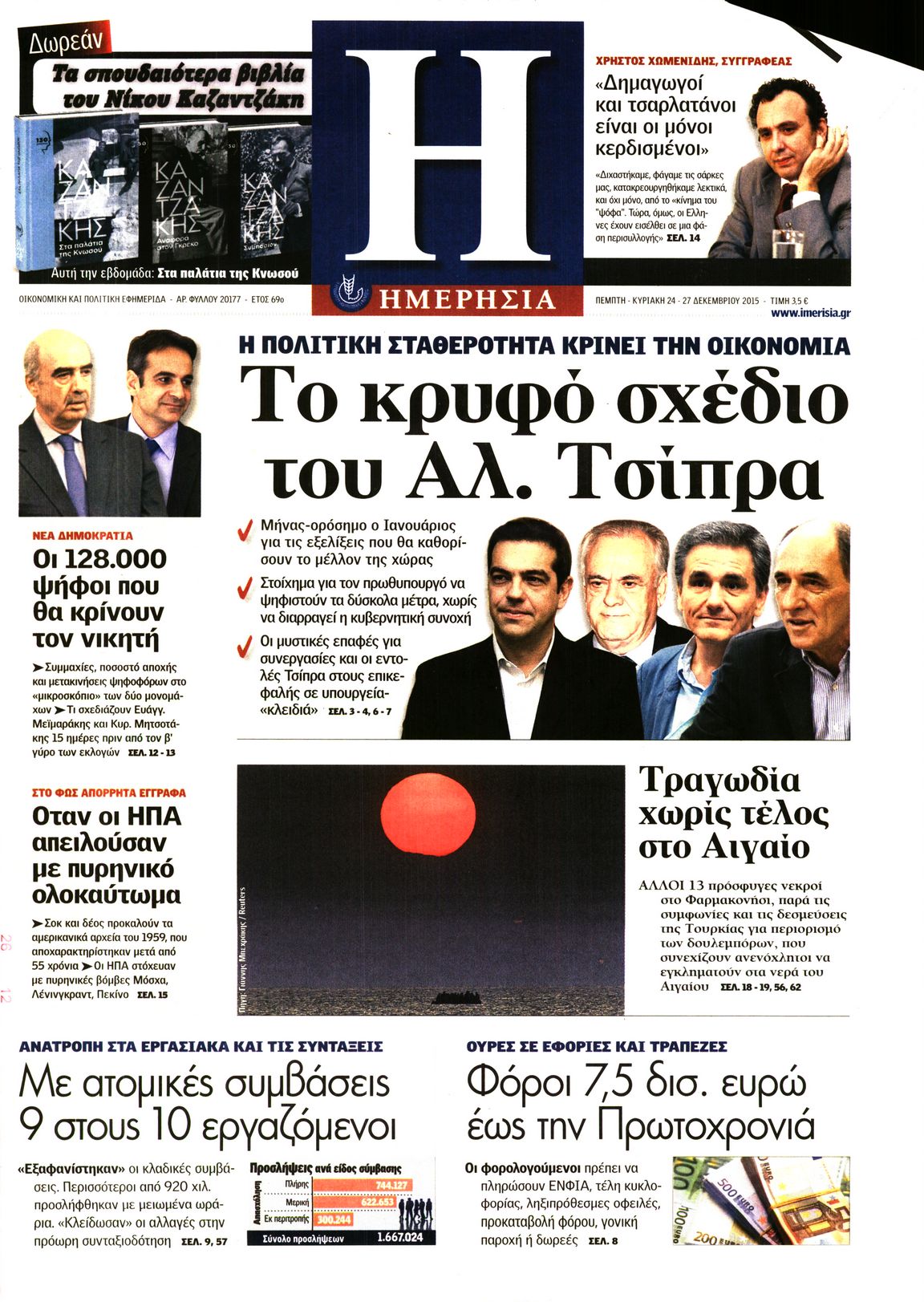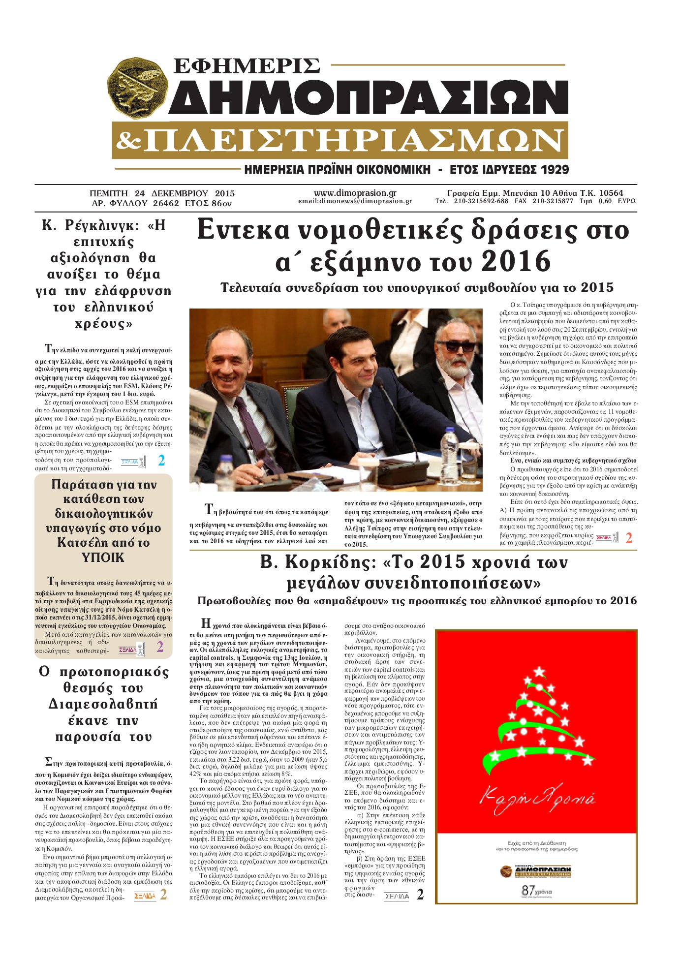 Oι οικονομικές εφημερίδες 24/12/2015 Enikos Newsroom 05:08, Πέμπτη 24 Δεκεμβρίου 2015 Media Διαβάστε τα σημερινά πρωτοσέλιδα των οικονομικών εφημερίδων: ΟΙΚΟΝΟΜΙΚΕΣ ΕΦΗΜΕΡΙΔΕΣ ΠΡΩΤΟΣΕΛΙΔΑ Μοιράσου το: σχολίασε κι εσύ (0 σχόλια) Ακολουθήστε το enikos.gr στο Google News και μάθετε πρώτοι όλες τις ειδήσεις Δείτε όλες τις τελευταίες ειδήσεις από την Ελλάδα και τον Κόσμο στο enikos.gr Ειδήσεις Ροή Ειδήσεων 3 ώρες πριν Χριστούγεννα στα μπλόκα: Επιμένουν στις κινητοποιήσεις τους οι αγρότες – Ανοίγουν τα διόδια το Σαββατοκύριακο 3 ώρες πριν Ουκρανία: Η άνευ προηγουμένου επίθεση σε ρωσικό τάνκερ στη Μεσόγειο και το μήνυμα προς στον Πούτιν – Το «μακρύ χέρι» του Κιέβου 2 ώρες πριν Πούτιν: Τα μηνύματα σε Ευρώπη και ΝΑΤΟ από το μαραθώνιο «σόου» του – Η απαίτηση για «σεβασμό» και η ειρήνη «με τους όρους» της Μόσχας 3 ώρες πριν Τραμπ: Δεν αποκλείει την πιθανότητα ενός πολέμου στη Βενεζουέλα – «Ο Μαδούρο ξέρει καλύτερα από τον καθένα τι ακριβώς θέλω» 4 ώρες πριν Συνεχίζει να προκαλεί ο Μίτσκοσκι: «Για μένα το όνομα Μακεδονία είναι ιερό» 2 ώρες πριν Ανακαλύφθηκαν αρχαία χρυσά νομίσματα 2.200 ετών που απεικονίζουν τον θεό Απόλλωνα – Η άγνωστη σύνδεση με τον Φίλιππο Β΄ της Μακεδονίας 3 ώρες πριν Ύπνος: Μια κρυφή κατάσταση του εγκεφάλου πριν από τον ύπνο μπορεί να είναι το “κλειδί” για υψηλή ευφυΐα και δημιουργικότητα 4 ώρες πριν Αριθμολογία: Οι άνθρωποι που έχουν γεννηθεί αυτές τις 4 ημερομηνίες, συχνά παρεξηγούνται – «Η καλοσύνη τους κρύβει τεράστια δύναμη» 5 ώρες πριν Ξεχάστε το καθάρισμα το Σαββατοκύριακο: Ο «κανόνας των 20 λεπτών» που θα σας λύσει τα χέρια 2 λεπτά πριν Συρία: Μαζικά πλήγματα των ΗΠΑ σε θέσεις του Ισλαμικού Κράτους – Χέγκσεθ: «Δεν είναι αρχή πολέμου, είναι μια δήλωση εκδίκησης» για το θάνατο των στρατιωτών μας 15 λεπτά πριν Ουκρανία: Ολοκληρώθηκαν οι συνομιλίες με τους Αμερικανούς κι Ευρωπαίους διαπραγματευτές 30 λεπτά πριν Μπαρτσελόνα – Μπασκόνια 134-124: Οι «μπλαουγκράνα» πήραν το ματς της χρονιάς ύστερα από τρεις παρατάσεις 45 λεπτά πριν Φαίη Σκορδά: «Παλιότερα τα κομπλιμέντα τα προσπερνούσα, τώρα τα έχω ανάγκη» 1 ώρα πριν Βασίλης Σπανούλης: Δεν εμφανίστηκε ούτε ένας δημοσιογράφος στην συνέντευξη Τύπου – «Καλησπέρα στον… κανέναν», δείτε βίντεο ENIKOS NETWORK Το ΕΚΑΒ τιμήθηκε από την Ακαδημία Αθηνών για τα 40 χρόνια προσφοράς του Έχετε πραγματικά μεγάλη καρδιά; 10 χαρακτηριστικά όσων έχουν καλοσύνη Αναστολή μέτρων αναγκαστικής εκτέλεσης για κτηνοτρόφους που πλήττονται από την ευλογιά των αιγοπροβάτων Πλήρης επάρκεια προϊόντων στις λαϊκές της Αττικής, παρά τις αγροτικές κινητοποιήσεις – Τι απαντούν οι πωλητές Χαρτογραφώντας το «σημείο χωρίς επιστροφή»: Για πρώτη φορά αποκαλύπτεται με λεπτομέρεια το ακανθώδες όριο της ατμόσφαιρας τ... Η Google καταργεί τη λειτουργία «dark web report» – Πώς θα μπορούν οι χρήστες να διαγράφουν τα δεδομένα τους περισσότερα 22:42 , Παρασκευή 19 Δεκεμβρίου 2025 Γιώργος Γιαννόπουλος για “Το σόι σου”: “Είναι ευτυχία και ευλογία αυτή η σειρά” «Είναι ευτυχία και ευλογία η συγκυρία αυτής της σειράς», θα πει ο Γιώργος Γιαννόπουλος -ο αγαπ... 20:37 , Παρασκευή 19 Δεκεμβρίου 2025 Don’t Forget The Lyrics: Η Έλλη Κοκκίνου υποδέχεται 4 παίκτες που θα κάνουν τα πάντα για να μη χάσουν ούτε… μισή λέξη από τους στίχους Το «Don’t Forget The Lyrics» επιστρέφει απόψε, Παρασκευή 19 Δεκεμβρίου, στις 21:00 με νέο επει... 19:31 , Παρασκευή 19 Δεκεμβρίου 2025 GNTM: Απόψε ο μεγάλος τελικός για τους 4 φιναλίστ Έπειτα από μή
