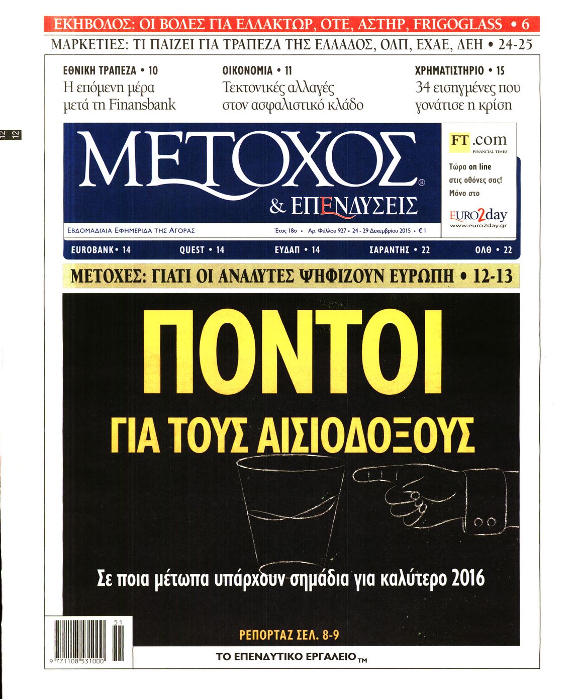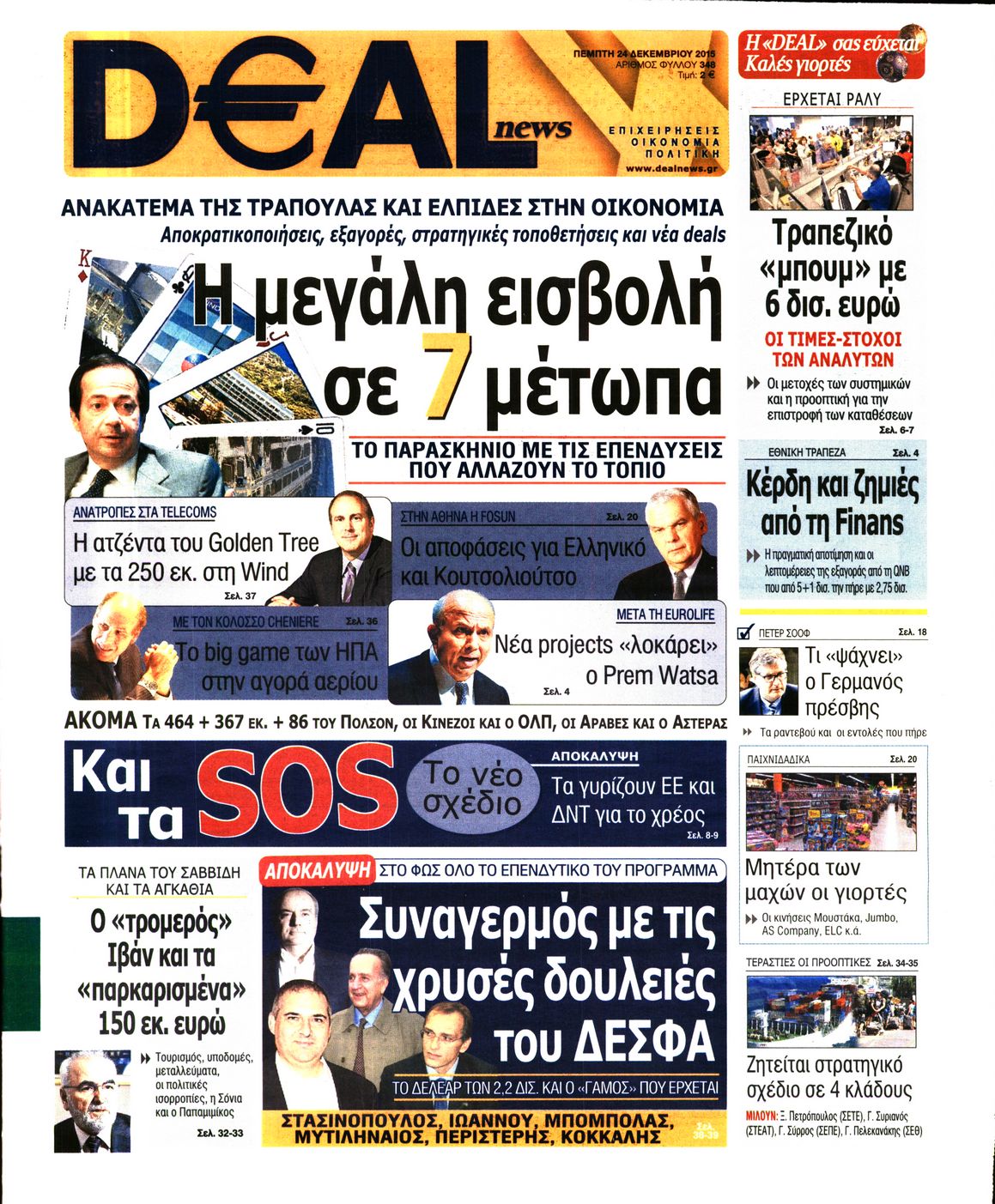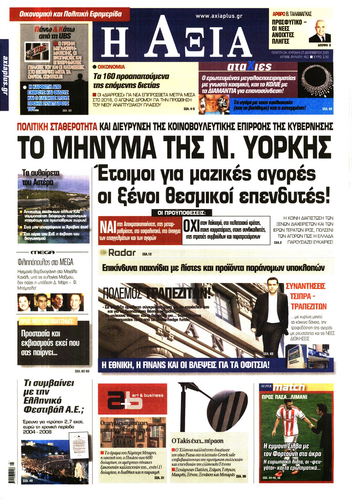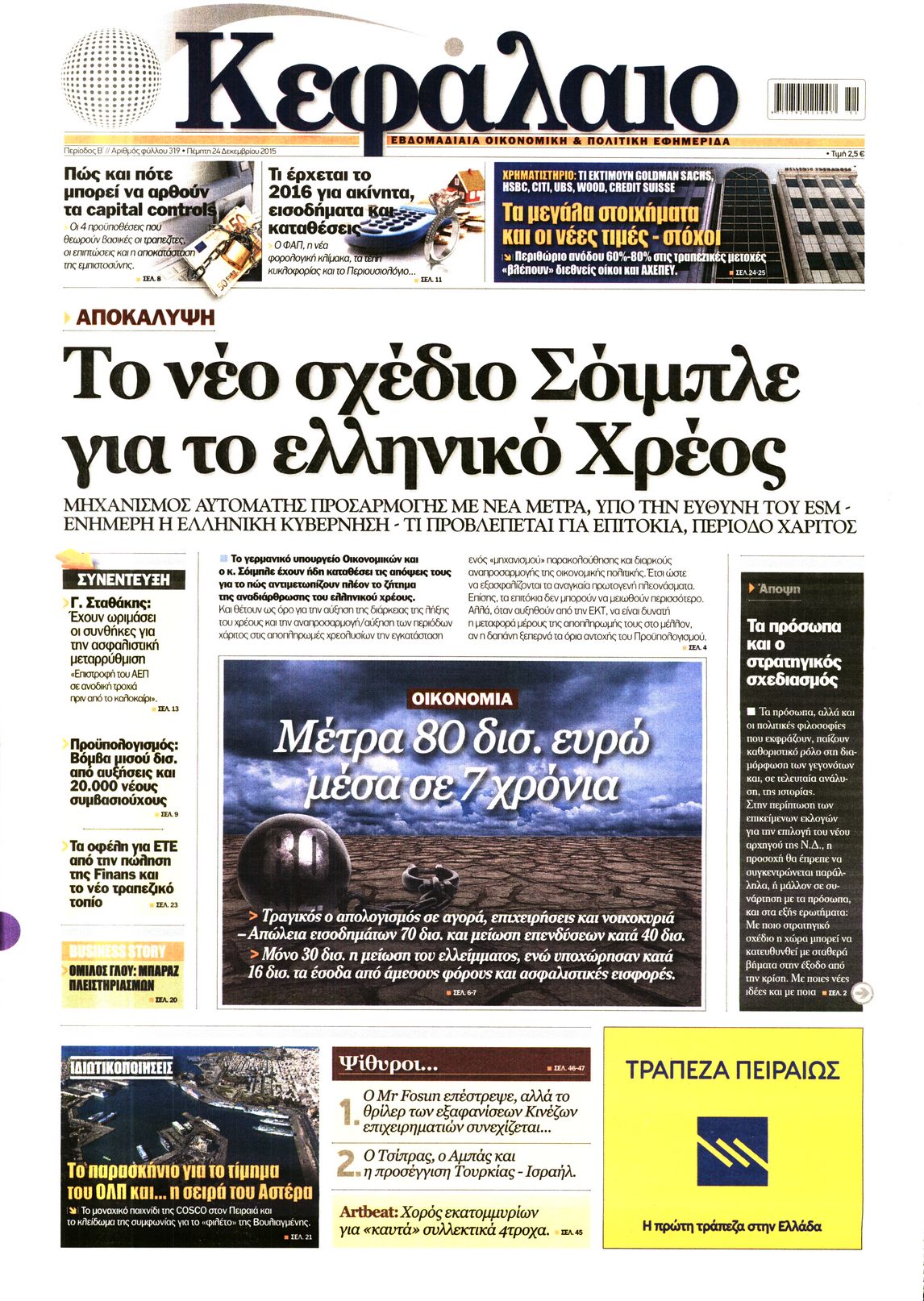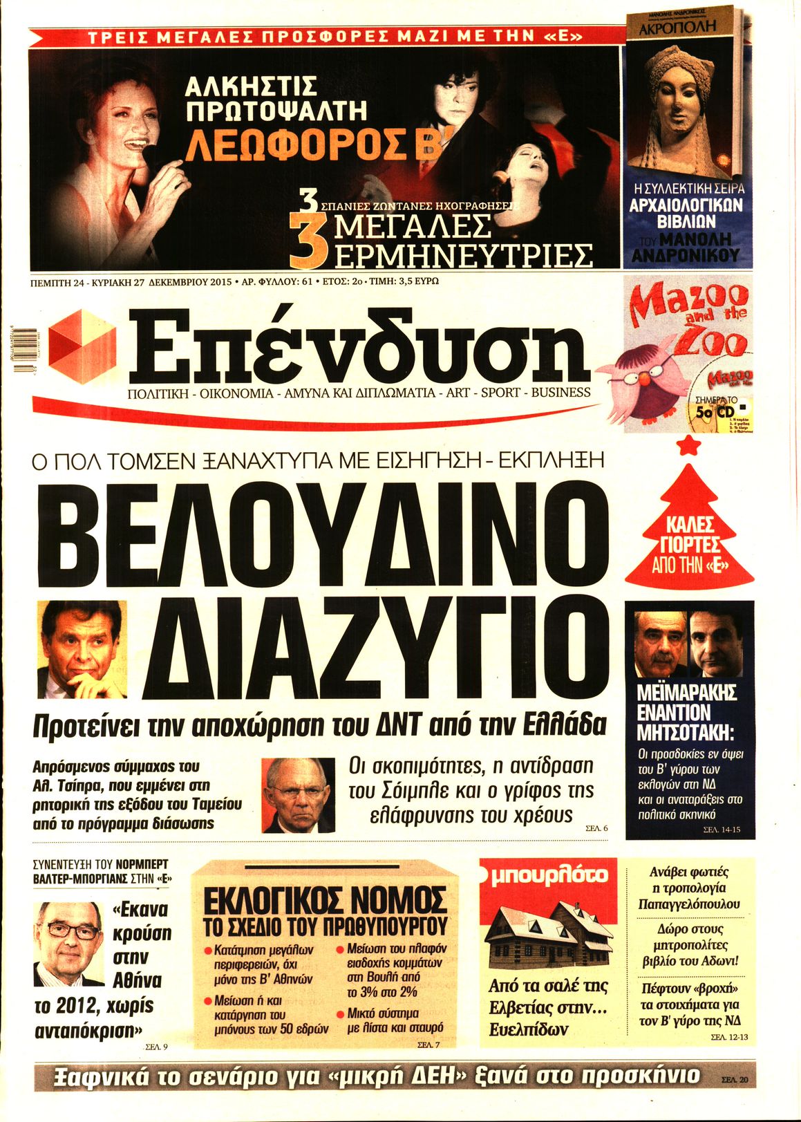 Oι οικονομικές εφημερίδες 24/12/2015 Enikos Newsroom 05:08, Πέμπτη 24 Δεκεμβρίου 2015 Media Διαβάστε τα σημερινά πρωτοσέλιδα των οικονομικών εφημερίδων: ΟΙΚΟΝΟΜΙΚΕΣ ΕΦΗΜΕΡΙΔΕΣ ΠΡΩΤΟΣΕΛΙΔΑ Μοιράσου το: σχολίασε κι εσύ (0 σχόλια) Ακολουθήστε το enikos.gr στο Google News και μάθετε πρώτοι όλες τις ειδήσεις Δείτε όλες τις τελευταίες ειδήσεις από την Ελλάδα και τον Κόσμο στο enikos.gr Ειδήσεις Ροή Ειδήσεων 3 ώρες πριν Χριστούγεννα στα μπλόκα: Επιμένουν στις κινητοποιήσεις τους οι αγρότες – Ανοίγουν τα διόδια το Σαββατοκύριακο 3 ώρες πριν Ουκρανία: Η άνευ προηγουμένου επίθεση σε ρωσικό τάνκερ στη Μεσόγειο και το μήνυμα προς στον Πούτιν – Το «μακρύ χέρι» του Κιέβου 2 ώρες πριν Πούτιν: Τα μηνύματα σε Ευρώπη και ΝΑΤΟ από το μαραθώνιο «σόου» του – Η απαίτηση για «σεβασμό» και η ειρήνη «με τους όρους» της Μόσχας 3 ώρες πριν Τραμπ: Δεν αποκλείει την πιθανότητα ενός πολέμου στη Βενεζουέλα – «Ο Μαδούρο ξέρει καλύτερα από τον καθένα τι ακριβώς θέλω» 4 ώρες πριν Συνεχίζει να προκαλεί ο Μίτσκοσκι: «Για μένα το όνομα Μακεδονία είναι ιερό» 2 ώρες πριν Ανακαλύφθηκαν αρχαία χρυσά νομίσματα 2.200 ετών που απεικονίζουν τον θεό Απόλλωνα – Η άγνωστη σύνδεση με τον Φίλιππο Β΄ της Μακεδονίας 3 ώρες πριν Ύπνος: Μια κρυφή κατάσταση του εγκεφάλου πριν από τον ύπνο μπορεί να είναι το “κλειδί” για υψηλή ευφυΐα και δημιουργικότητα 4 ώρες πριν Αριθμολογία: Οι άνθρωποι που έχουν γεννηθεί αυτές τις 4 ημερομηνίες, συχνά παρεξηγούνται – «Η καλοσύνη τους κρύβει τεράστια δύναμη» 5 ώρες πριν Ξεχάστε το καθάρισμα το Σαββατοκύριακο: Ο «κανόνας των 20 λεπτών» που θα σας λύσει τα χέρια 2 λεπτά πριν Συρία: Μαζικά πλήγματα των ΗΠΑ σε θέσεις του Ισλαμικού Κράτους – Χέγκσεθ: «Δεν είναι αρχή πολέμου, είναι μια δήλωση εκδίκησης» για το θάνατο των στρατιωτών μας 15 λεπτά πριν Ουκρανία: Ολοκληρώθηκαν οι συνομιλίες με τους Αμερικανούς κι Ευρωπαίους διαπραγματευτές 30 λεπτά πριν Μπαρτσελόνα – Μπασκόνια 134-124: Οι «μπλαουγκράνα» πήραν το ματς της χρονιάς ύστερα από τρεις παρατάσεις 45 λεπτά πριν Φαίη Σκορδά: «Παλιότερα τα κομπλιμέντα τα προσπερνούσα, τώρα τα έχω ανάγκη» 1 ώρα πριν Βασίλης Σπανούλης: Δεν εμφανίστηκε ούτε ένας δημοσιογράφος στην συνέντευξη Τύπου – «Καλησπέρα στον… κανέναν», δείτε βίντεο ENIKOS NETWORK Το ΕΚΑΒ τιμήθηκε από την Ακαδημία Αθηνών για τα 40 χρόνια προσφοράς του Έχετε πραγματικά μεγάλη καρδιά; 10 χαρακτηριστικά όσων έχουν καλοσύνη Αναστολή μέτρων αναγκαστικής εκτέλεσης για κτηνοτρόφους που πλήττονται από την ευλογιά των αιγοπροβάτων Πλήρης επάρκεια προϊόντων στις λαϊκές της Αττικής, παρά τις αγροτικές κινητοποιήσεις – Τι απαντούν οι πωλητές Χαρτογραφώντας το «σημείο χωρίς επιστροφή»: Για πρώτη φορά αποκαλύπτεται με λεπτομέρεια το ακανθώδες όριο της ατμόσφαιρας τ... Η Google καταργεί τη λειτουργία «dark web report» – Πώς θα μπορούν οι χρήστες να διαγράφουν τα δεδομένα τους περισσότερα 22:42 , Παρασκευή 19 Δεκεμβρίου 2025 Γιώργος Γιαννόπουλος για “Το σόι σου”: “Είναι ευτυχία και ευλογία αυτή η σειρά” «Είναι ευτυχία και ευλογία η συγκυρία αυτής της σειράς», θα πει ο Γιώργος Γιαννόπουλος -ο αγαπ... 20:37 , Παρασκευή 19 Δεκεμβρίου 2025 Don’t Forget The Lyrics: Η Έλλη Κοκκίνου υποδέχεται 4 παίκτες που θα κάνουν τα πάντα για να μη χάσουν ούτε… μισή λέξη από τους στίχους Το «Don’t Forget The Lyrics» επιστρέφει απόψε, Παρασκευή 19 Δεκεμβρίου, στις 21:00 με νέο επει... 19:31 , Παρασκευή 19 Δεκεμβρίου 2025 GNTM: Απόψε ο μεγάλος τελικός για τους 4 φιναλίστ Έπειτα από μή