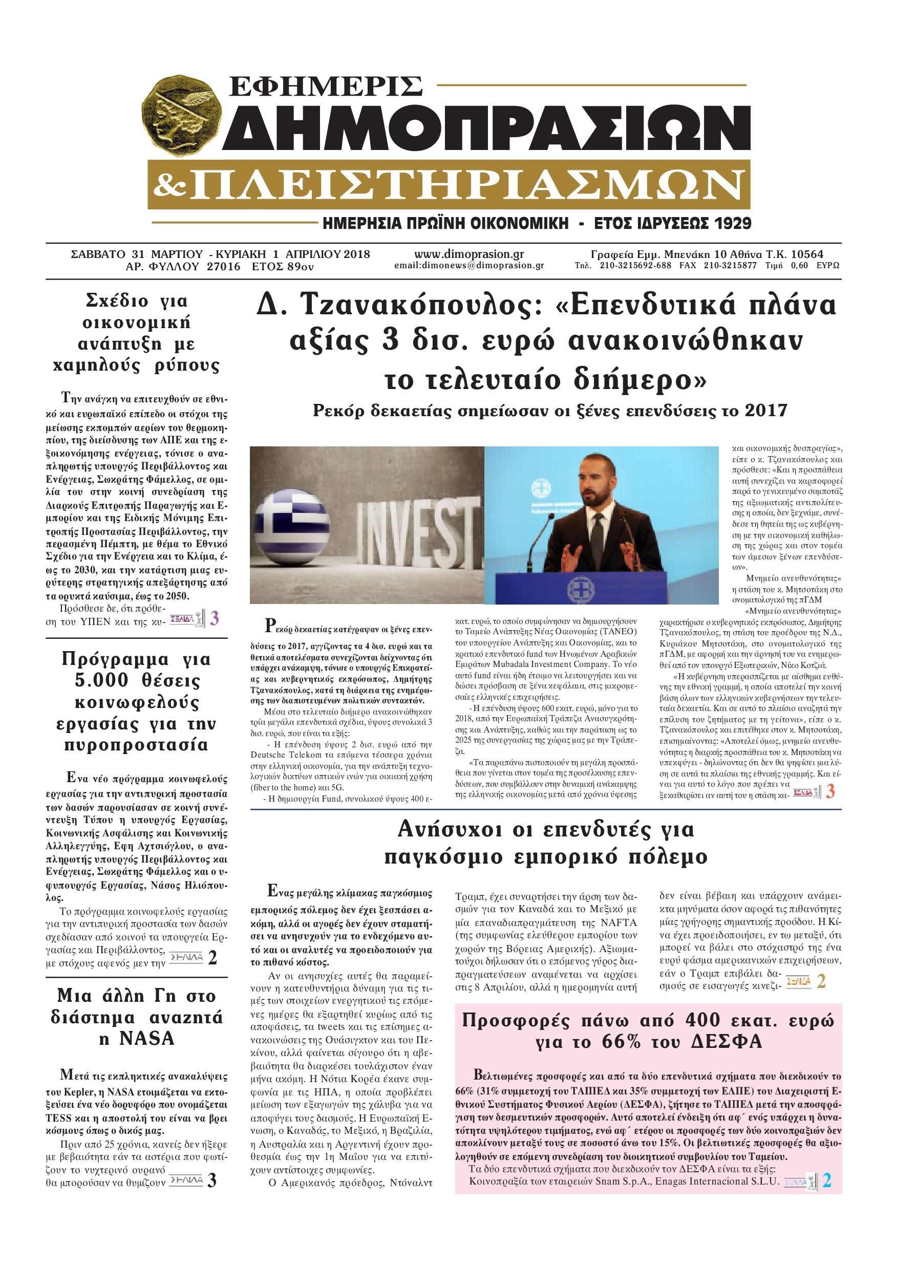 Οι οικονομικές εφημερίδες 2/4/2018 Enikos Newsroom 07:15, Δευτέρα 02 Απριλίου 2018 Media Διαβάστε τα σημερινά πρωτοσέλιδα των οικονομικών εφημερίδων: ΟΙΚΟΝΟΜΙΚΕΣ ΕΦΗΜΕΡΙΔΕΣ ΠΡΩΤΟΣΕΛΙΔΑ Μοιράσου το: σχολίασε κι εσύ (0 σχόλια) Ακολουθήστε το enikos.gr στο Google News και μάθετε πρώτοι όλες τις ειδήσεις Δείτε όλες τις τελευταίες ειδήσεις από την Ελλάδα και τον Κόσμο στο enikos.gr Ειδήσεις Ροή Ειδήσεων 3 ώρες πριν Αυξάνουν την πίεση προς την κυβέρνηση οι αγρότες: Κλείνουν παρακαμπτήριους και ανοίγουν διόδια – Τι θα γίνει τις γιορτές 2 ώρες πριν ΟΠΕΚΕΠΕ: Προφυλακιστέος ο φερόμενος αρχηγός και ο λογιστής της εγκληματικής οργάνωσης 3 ώρες πριν Φοινικούντα: Το Σάββατο απολογείται ο 30χρονος γιος γνωστού επιχειρηματία της Πλάκας που παραδόθηκε – Όσα είπε στους αστυνομικούς και ο ρόλος του στο έγκλημα 3 ώρες πριν Μπορεί ο Μαδούρο να αντέξει τον αποκλεισμό του Τραμπ; Τι θα χρειαστεί η Ουάσινγκτον για να τον ανατρέψει 4 ώρες πριν Πρίγκιπας Ουίλιαμ – Κέιτ: Η νέα οικογενειακή φωτογραφία για τις Χριστουγεννιάτικες κάρτες του 2025 4 ώρες πριν Ύπνος: Η απλή βραδινή ρουτίνα για να προστατεύσετε τα μαλλιά σας από το κρύο κατά τη διάρκεια του χειμώνα 5 ώρες πριν Manifesting: Πώς να συναντήσετε τον σύντροφο της ζωής σας, ανάλογα με τον μήνα γέννησής σας 2 ημέρες πριν 20 χρόνια τα Χριστούγεννα ξεκινούν στα Public με μεγάλη ποικιλία σε δώρα! 3 ώρες πριν Αρχαιολόγοι ανακάλυψαν ρωμαϊκά τεχνουργήματα από μια πόλη που δεν υπήρξε ποτέ – Τα τρία εντυπωσιακά κτίρια και ο αμφορέας με τις… σαρδέλες 6 λεπτά πριν Μιχάλης Χρυσοχοΐδης από την Κωνσταντινούπολη: Κοινές επιχειρήσεις Ελλάδας – Τουρκίας ενάντια στο οργανωμένο έγκλημα 28 λεπτά πριν Μάρκο Νίκολιτς: «Είμαι περήφανος για τους παίκτες μου, όποιος αντίπαλος και να έρθει θα προετοιμαστούμε» 37 λεπτά πριν ΟΗΕ: Την εκλογή του νέου ύπατου αρμοστή για τους Πρόσφυγες Μπαρχάμ Άχμεντ Σαλίχ χαιρέτησε ο Αντόνιο Γκουτέρες 41 λεπτά πριν Σύνοδος Κορυφής στις Βρυξέλλες: Ακόμη πιο κοντά σε διέξοδο για τη χρηματοδότηση της Ουκρανίας 50 λεπτά πριν ΟΗΕ: Iστορική επίσκεψη του Συμβουλίου Ασφαλείας στη Δαμασκό – Mήνυμα Ελλάδας για συμπερίληψη και λογοδοσία ENIKOS NETWORK Σε περίοδο αυξημένης δραστηριότητας η γρίπη στην Ελλάδα-Μέτρα προστασίας από τον ΕΟΔΥ Σκέφτεστε συνέχεια συζητήσεις που έχετε κάνει; Τι σημαίνει αυτό, σύμφωνα με ειδικό Στεγαστικό: Τι λέει η ΠΟΜΙΔΑ για τα νέα μέτρα που ανακοίνωσε ο Κυριάκος Μητσοτάκης Λαγκάρντ: Αισιόδοξη για την ανάπτυξη της Ευρωζώνης, αβέβαιη για τον πληθωρισμό Χαρτογραφώντας το «σημείο χωρίς επιστροφή»: Για πρώτη φορά αποκαλύπτεται με λεπτομέρεια το ακανθώδες όριο της ατμόσφαιρας τ... Η Google καταργεί τη λειτουργία «dark web report» – Πώς θα μπορούν οι χρήστες να διαγράφουν τα δεδομένα τους περισσότερα 17:45 , Πέμπτη 18 Δεκεμβρίου 2025 ROUK ZOUK: Εορταστικό επεισόδιο με καλεσμένους τους πρωταγωνιστές του «Γιατί ρε πατέρα» Το Σάββατο 20 Δεκεμβρίου στις 21:00, η Ζέτα Μακρυπούλια υποδέχεται εκλεκτούς ηθοποιούς που όλο... 17:20 , Πέμπτη 18 Δεκεμβρίου 2025 Άγιος έρωτας: Η Χριστίνα εξομολογείται στον πατέρα Νικόλαο, απόψε στις 21:00 στον Alpha Η Νότα αποφασίζει να εκδικηθεί τον Πέτρο και τον Στέφανο, για χάρη του Λούη, όμως τα πράγματα ... 16:50 , Πέμπτη 18 Δεκεμβρίου 2025 Να μ’ αγαπάς: Ζωή και Φωτεινή συμφιλιώνονται ως μάνα με κόρη, απόψε στις 20:00 Η ταυτότητα του Άγγελου αποκαλύπτεται στο νέο επεισόδιο της σειράς “Να μ’ αγαπάς... 15:52 , Πέμπτη 18 Δεκεμβρίου 2025 Το Σπίτι Δίπλα Στο Ποτάμι: Το καθηλω