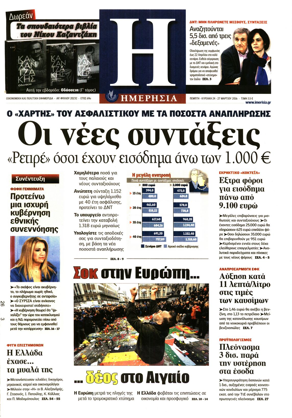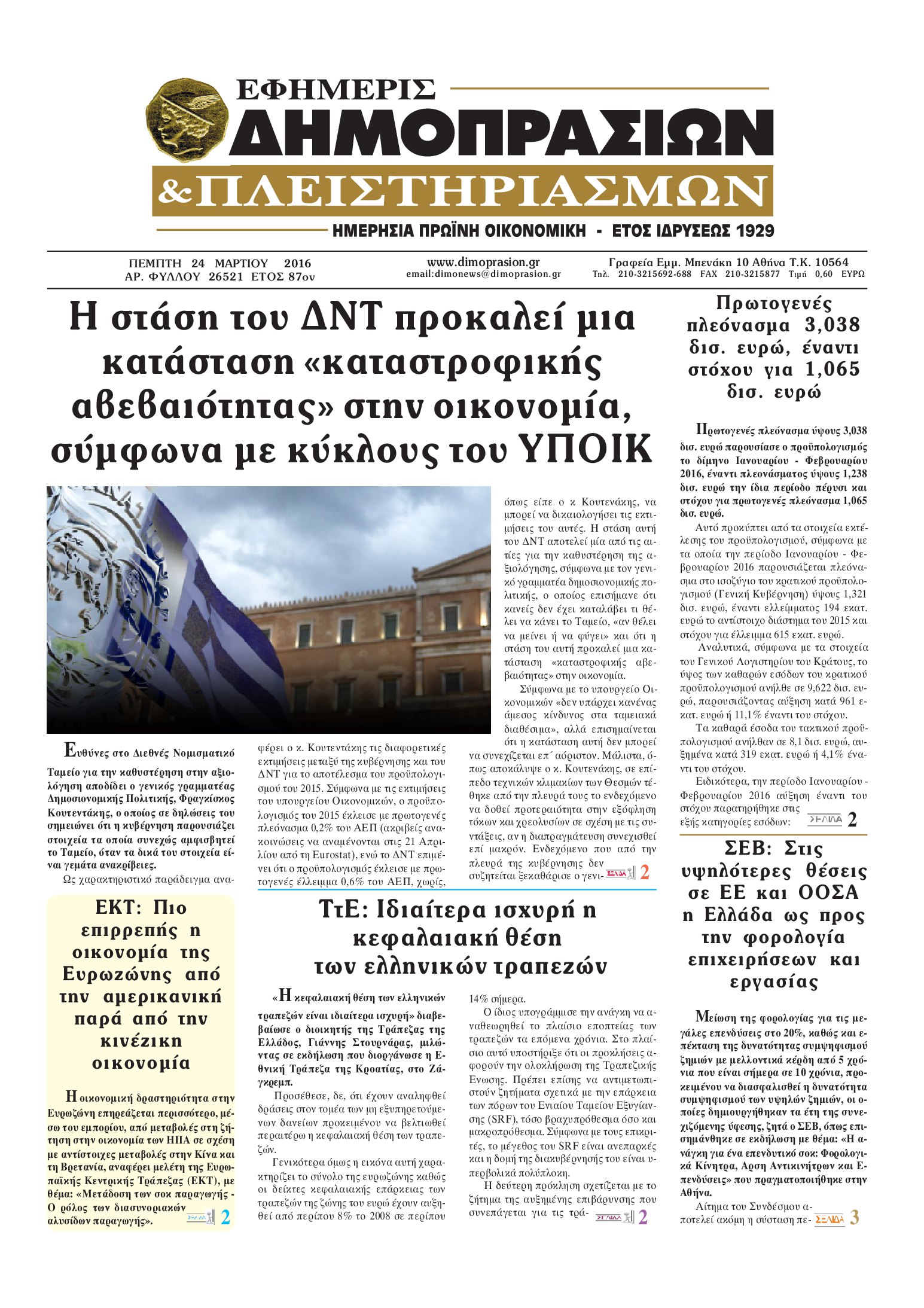 Oι οικονομικές εφημερίδες 24/3/2016 Enikos Newsroom 05:37, Πέμπτη 24 Μαρτίου 2016 Media Διαβάστε τα σημερινά πρωτοσέλιδα των οικονομικών εφημερίδων: ΟΙΚΟΝΟΜΙΚΕΣ ΕΦΗΜΕΡΙΔΕΣ ΠΡΩΤΟΣΕΛΙΔΑ Μοιράσου το: σχολίασε κι εσύ (0 σχόλια) Ακολουθήστε το enikos.gr στο Google News και μάθετε πρώτοι όλες τις ειδήσεις Δείτε όλες τις τελευταίες ειδήσεις από την Ελλάδα και τον Κόσμο στο enikos.gr Ειδήσεις Ροή Ειδήσεων 3 ώρες πριν Μητσοτάκης για αγρότες: Ελπίζω πως θα απομακρυνθούν σύντομα από τα μπλόκα 4 ώρες πριν Έρευνα MRB: Η πρόθεση ψήφου και τα σημαντικότερα προβλήματα – Οι «λέξεις» που εκφράζουν τους πολίτες 44 λεπτά πριν Κυψέλη: Στον ανακριτή η 16χρονη που μαχαίρωσε την 14χρονη – «Είχα το μαχαίρι για προστασία – Έχω θέμα με τα νεύρα μου» 1 ώρα πριν Αμοργός: «Θα προσπαθήσω να το κάνω κάθε μέρα» – Ποιος είναι ο αγρότης που έστησε μόνος του το πρώτο μπλόκο στο νησί 2 ώρες πριν Μισέλ Ομπάμα: Εμφανώς αδυνατισμένη στην εκπομπή του Τζίμι Κίμελ – Οι φήμες για τη χρήση Ozempic και η «φιλία» της με τον Ρομπ Ράινερ 4 ώρες πριν Τα 4 ζώδια που ξαναβρίσκουν τον εαυτό τους – «Μπαίνετε επιτέλους στην ουσία των πραγμάτων» 5 ώρες πριν 20 χρόνια τα Χριστούγεννα ξεκινούν στα Public με μεγάλη ποικιλία σε δώρα! 4 ώρες πριν «Δεν είχα κλάψει από τότε που διαγνώστηκα με καρκίνο, ώσπου ένα τηλεφώνημα με έκανε να λυγίσω» – Η συγκλονιστική εξομολόγηση ενός άνδρα 3 ώρες πριν Τα 7 σπάνια χαρακτηριστικά που κάνουν κάποιους ανθρώπους ακαταμάχητους 4 λεπτά πριν Live – Οι ανακοινώσεις της ΕΛΑΣ για το κύκλωμα κοκαΐνης και τον «Έλληνα Εσκομπάρ» 5 λεπτά πριν Τροχαίο έξω από το Μέγαρο Μαξίμου: Αυτοκίνητο παρέσυρε ηλικιωμένο 9 λεπτά πριν Συνάντηση Μητσοτάκη με την Κ.Ο. της ΝΔ: Οι αφίξεις των βουλευτών, τα γλυκά και τα «πηγαδάκια» 19 λεπτά πριν Πούτιν: «Ανοησίες» και «υστερίες» οι ισχυρισμοί της Ευρώπης για πιθανή σύγκρουση με τη Ρωσία – «Κάνουν πλύση εγκεφάλου» 27 λεπτά πριν ΟΠΕΚΕΠΕ – Παράνομες επιδοτήσεις: Ελεύθεροι αφέθηκαν οι δύο πρώτοι από τους κατηγορούμενους που απολογούνται σήμερα ENIKOS NETWORK 5 πράγματα που αποφεύγει γαστρεντερολόγος για να μειώσει τον κίνδυνο καρκίνου του εντέρου Ανησυχητική αύξηση της υπέρτασης στα παιδιά – Πώς θα τα προστατέψουμε; Αδειοδωρόσημο Χριστουγέννων 2025: Πότε γίνεται η καταβολή του και σε ποιους Τριπλή αύξηση στους μισθωτούς – Τι αλλάζει μετά την Πρωτοχρονιά Σύγχρονος Νοστράδαμος: Προειδοποιεί για «μεγάλο γεγονός» τους επόμενους μήνες που θα συγκλονίσει τη Βρετανία και τον κόσμο Τεστ παρατηρητικότητας: Μπορείτε να βρείτε τις 3 διαφορές στις εικόνες με έναν πιγκουίνο σε 14 δευτερόλεπτα περισσότερα 12:35 , Τετάρτη 17 Δεκεμβρίου 2025 Μίρκα Παπακωνσταντίνου: «Δεν ήμουν αισιόδοξη για τα νούμερα – Είμαι ρεαλίστρια» Στα γυρίσματα του εορταστικού επεισοδίου της αγαπημένης σειράς “Το Σόι Σου”, βρέθηκε η κάμερα ... 12:12 , Τετάρτη 17 Δεκεμβρίου 2025 Ακούστε την εκπομπή του Νίκου Χατζηνικολάου 17/12/2025 Ακούστε την εκπομπή του Νίκου Χατζηνικολάου στον ραδιοφωνικό σταθμό RealFm 97,8, την Τετάρτη 1... 11:35 , Τετάρτη 17 Δεκεμβρίου 2025 Home Alone: Το σπίτι της ταινίας θα ανακαινιστεί – Επιστροφή στην αισθητική της δεκαετίας του ’90 Οι νέοι ιδιοκτήτες του πραγματικού σπιτιού που παρουσιάζεται στην κλασική ταινία του 1990 «Hom... 11:25 , Τετάρτη 17 Δεκεμβρίου 2025 Grand Hotel: Απόψε το τελευταίο επεισόδιο της χρονιάς – Όλα τα μυστικά μένουν εδώ Το τελευταίο επεισόδιο της χρονιάς της σειράς «Grand Hotel» θα προβληθεί απόψε στις 21:00. Ο Ά... ΤΕΛΕΥΤΑΙΕΣ ΕΙΔΗΣΕΙΣ 4 λεπτά πρ