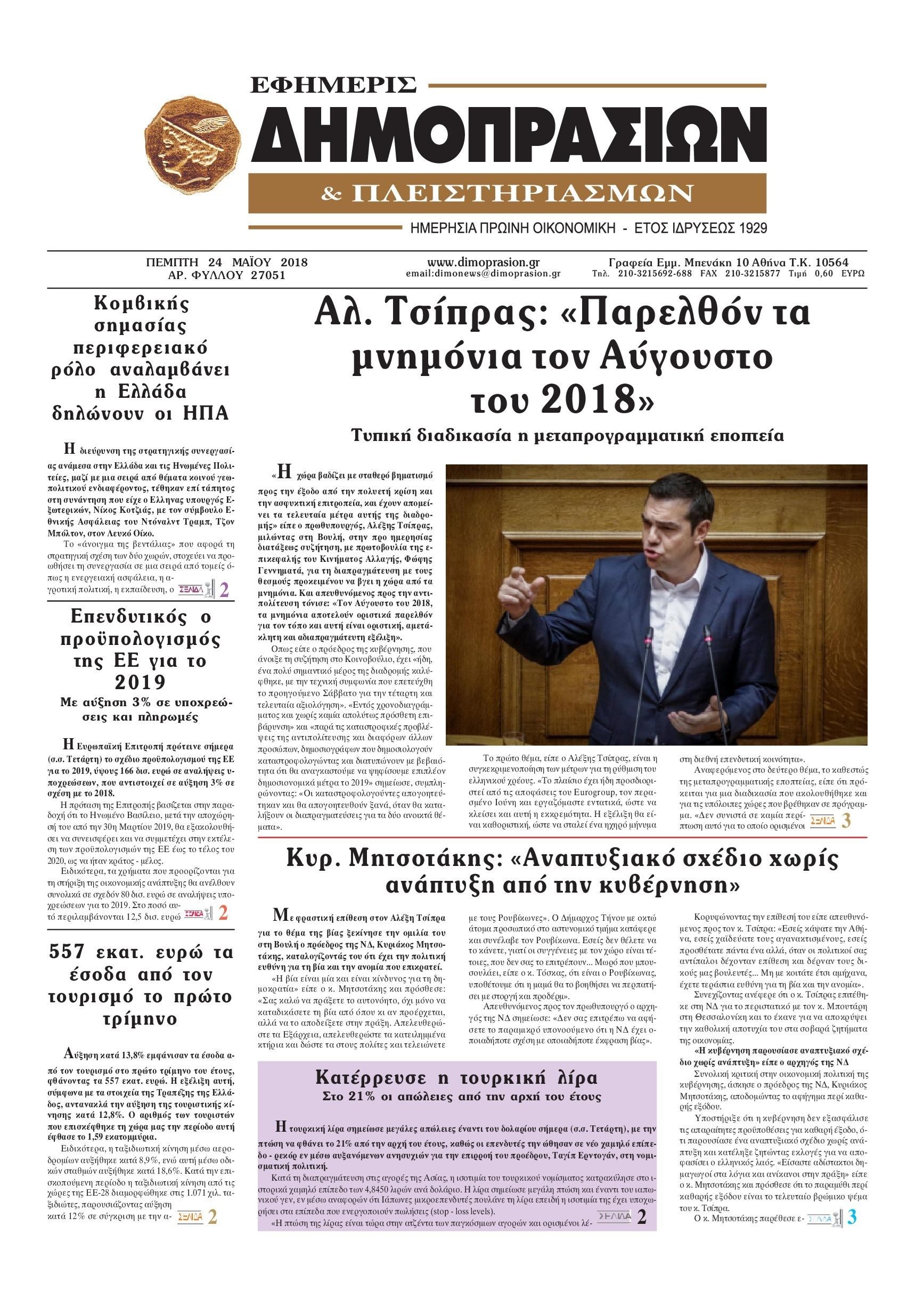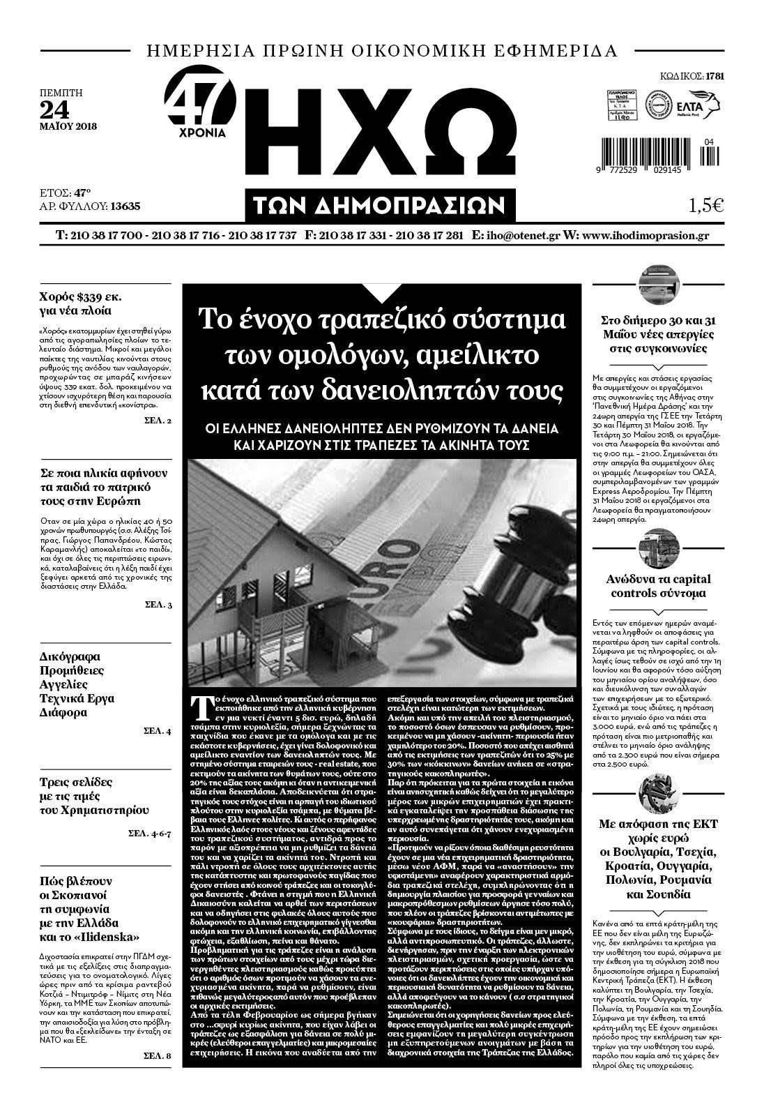 Οι οικονομικές εφημερίδες 24/5/2018 Κώστας Τεό 07:03, Πέμπτη 24 Μαΐου 2018 Media Διαβάστε τα σημερινά πρωτοσέλιδα των οικονομικών εφημερίδων: ΟΙΚΟΝΟΜΙΚΕΣ ΕΦΗΜΕΡΙΔΕΣ ΠΡΩΤΟΣΕΛΙΔΑ Μοιράσου το: σχολίασε κι εσύ (0 σχόλια) Ακολουθήστε το enikos.gr στο Google News και μάθετε πρώτοι όλες τις ειδήσεις Δείτε όλες τις τελευταίες ειδήσεις από την Ελλάδα και τον Κόσμο στο enikos.gr Ειδήσεις Ροή Ειδήσεων 2 ώρες πριν Κυριάκος Μητσοτάκης: «Κάποιοι αγρότες δεν αισθάνονται την ανάγκη να διαφωνήσουν με τις προτάσεις της κυβέρνησης, η Ευρώπη στέκεται στο πλευρό της Ουκρανίας» 7 ώρες πριν ΟΠΕΚΕΠΕ: Προφυλακιστέος ο φερόμενος αρχηγός και ο λογιστής της εγκληματικής οργάνωσης 8 ώρες πριν Αυξάνουν την πίεση προς την κυβέρνηση οι αγρότες: Κλείνουν παρακαμπτήριους και ανοίγουν διόδια – Τι θα γίνει τις γιορτές 8 ώρες πριν Φοινικούντα: Το Σάββατο απολογείται ο 30χρονος γιος γνωστού επιχειρηματία της Πλάκας που παραδόθηκε – Όσα είπε στους αστυνομικούς και ο ρόλος του στο έγκλημα 7 ώρες πριν ΑΕΚ – Κραϊόβα 3-2: Επική ανατροπή και πρόκριση στους «16» του Conference League η Ένωση 8 ώρες πριν Αρχαιολόγοι ανακάλυψαν ρωμαϊκά τεχνουργήματα από μια πόλη που δεν υπήρξε ποτέ – Τα τρία εντυπωσιακά κτίρια και ο αμφορέας με τις… σαρδέλες 9 ώρες πριν Ύπνος: Η απλή βραδινή ρουτίνα για να προστατεύσετε τα μαλλιά σας από το κρύο κατά τη διάρκεια του χειμώνα 10 ώρες πριν Manifesting: Πώς να συναντήσετε τον σύντροφο της ζωής σας, ανάλογα με τον μήνα γέννησής σας 2 ημέρες πριν 20 χρόνια τα Χριστούγεννα ξεκινούν στα Public με μεγάλη ποικιλία σε δώρα! 12 λεπτά πριν Απειλή για το Προϋπολογισμό τα ληξιπρόθεσμα χρέη των ιδιωτών προς την εφορία 13 λεπτά πριν Πέντε νεκροί σε πλήγματα των ΗΠΑ κατά δύο σκαφών που φέρεται να μετέφεραν ναρκωτικά στον Ανατολικό Ειρηνικό 21 λεπτά πριν ΕΥΔΑΠ: Αλλάζουν τα τιμολόγια του νερού 28 λεπτά πριν Οπτική ψευδαίσθηση: Μόνο αν έχεις αετίσια ματιά θα βρεις τον παπαγάλο σε 12 δευτερόλεπτα 35 λεπτά πριν Αθήνα: Βρέθηκε η 16χρονη που είχε εξαφανιστεί από τις 6 Δεκεμβρίου – Η ανακοίνωση από το «Χαμόγελο του Παιδιού» ENIKOS NETWORK Σε περίοδο αυξημένης δραστηριότητας η γρίπη στην Ελλάδα-Μέτρα προστασίας από τον ΕΟΔΥ Σκέφτεστε συνέχεια συζητήσεις που έχετε κάνει; Τι σημαίνει αυτό, σύμφωνα με ειδικό Στεγαστικό: Τι λέει η ΠΟΜΙΔΑ για τα νέα μέτρα που ανακοίνωσε ο Κυριάκος Μητσοτάκης Λαγκάρντ: Αισιόδοξη για την ανάπτυξη της Ευρωζώνης, αβέβαιη για τον πληθωρισμό Χαρτογραφώντας το «σημείο χωρίς επιστροφή»: Για πρώτη φορά αποκαλύπτεται με λεπτομέρεια το ακανθώδες όριο της ατμόσφαιρας τ... Η Google καταργεί τη λειτουργία «dark web report» – Πώς θα μπορούν οι χρήστες να διαγράφουν τα δεδομένα τους περισσότερα 05:48 , Παρασκευή 19 Δεκεμβρίου 2025 Οι οικονομικές εφημερίδες 19/12/2025 Διαβάστε τα πρωτοσέλιδα από τις οικονομικές εφημερίδες, σήμερα 19/12/2025. 05:43 , Παρασκευή 19 Δεκεμβρίου 2025 Οι αθλητικές εφημερίδες 19/12/2025 Διαβάστε τα πρωτοσέλιδα από τις αθλητικές εφημερίδες, σήμερα 19/12/2025. 05:38 , Παρασκευή 19 Δεκεμβρίου 2025 Οι πολιτικές εφημερίδες 19/12/2025 Διαβάστε τα πρωτοσέλιδα από τις πολιτικές εφημερίδες, σήμερα 19/12/2025. 02:50 , Παρασκευή 19 Δεκεμβρίου 2025 GNTM: «Κλείδωσαν» οι τέσσερις φιναλίστ – Μεγάλη ανατροπή στις τελευταίες αποχωρήσεις Για προτελευταία φορά εμφανίστηκαν στο πλατό του GNTM οι φιναλίστ του φετινού κύκλου, το βράδυ... ΤΕΛΕΥΤΑΙΕΣ ΕΙΔΗΣΕΙΣ 12 λεπτά πριν Απειλή για το Προϋπολογισμό τα ληξιπρόθεσμα χρέη των... 13 λεπτά πριν Πέντε νεκροί σε πλήγματα των ΗΠΑ κατά 