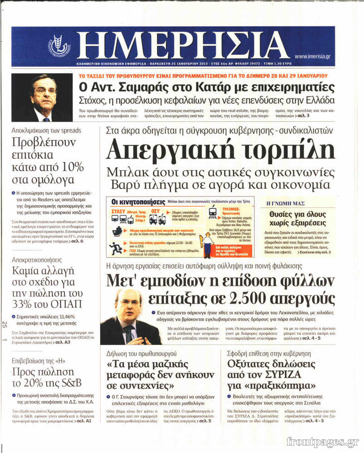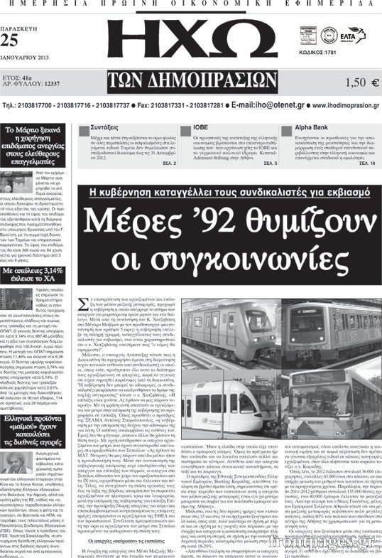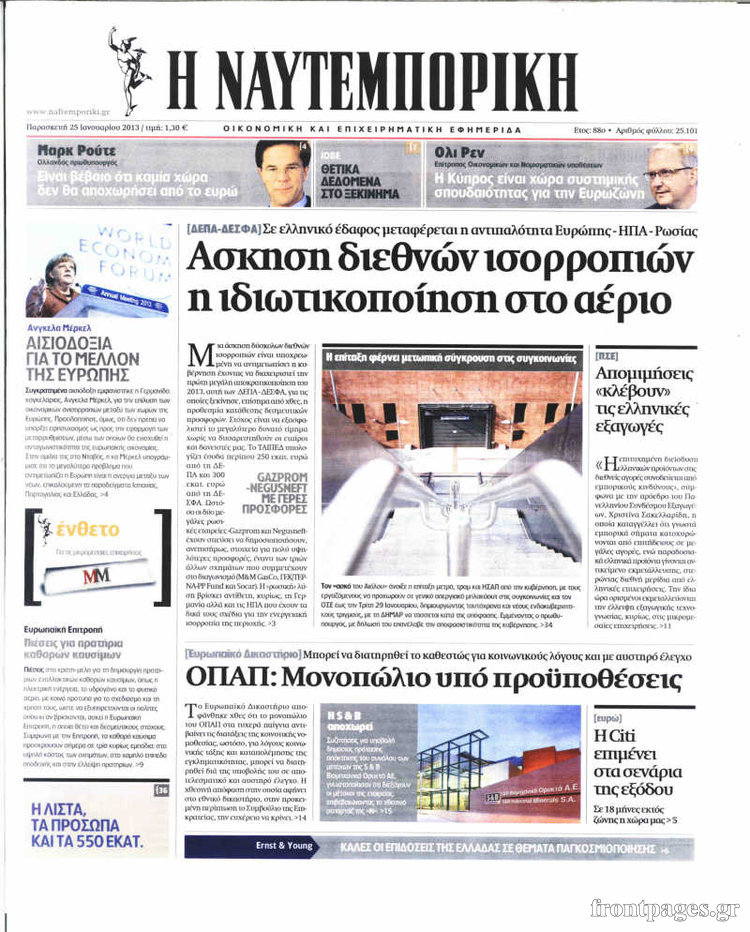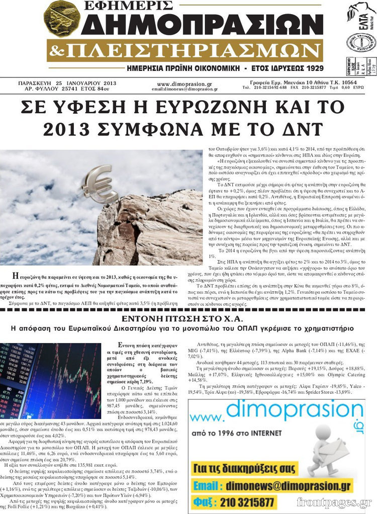 Οι οικονομικές εφημερίδες Enikos Newsroom 09:15, Παρασκευή 25 Ιανουαρίου 2013 Media Οι οικονομικές εφημερίδες Τα πρωτοσέλιδα των οικονομικών εφημερίδων. ΕΦΗΜΕΡΙΔΕΣ ΟΙΚΟΝΟΜΙΚΕΣ ΕΦΗΜΕΡΙΔΕΣ ΠΡΩΤΟΣΕΛΙΔΑ Μοιράσου το: σχολίασε κι εσύ (0 σχόλια) Ακολουθήστε το enikos.gr στο Google News και μάθετε πρώτοι όλες τις ειδήσεις Δείτε όλες τις τελευταίες ειδήσεις από την Ελλάδα και τον Κόσμο στο enikos.gr Ειδήσεις Ροή Ειδήσεων 1 ώρα πριν Σίδνεϊ: Τα ονόματα των θυμάτων από την τρομοκρατική επίθεση – Η 10χρονη Ματίλντα και ο επιζών του Ολοκαυτώματος που έσωσε τη γυναίκα του 2 ώρες πριν Η διαδρομή του σκάφους με την τεράστια ποσότητα κοκαΐνης που κατασχέθηκε στο λιμάνι του Πειραιά – Συνελήφθη και γνωστός «βαρώνος» 2 ώρες πριν Κυβέρνηση: Οι κόκκινες γραμμές στη διαπραγμάτευση με τους αγρότες – Τι ζητούν οι εκπρόσωποι των μπλόκων 4 ώρες πριν Σοκ στο Χόλιγουντ: Νεκροί από μαχαιριές ο σκηνοθέτης Ρομπ Ράινερ και η σύζυγός του – Αναφορές ότι τους σκότωσε ο γιος τους 2 ώρες πριν Δείτε LIVE το συνέδριο «Ελληνικός Τουρισμός, Μια Εθνική Υπόθεση!» 36 λεπτά πριν Μακροζωία: 55χρονος που ισχυρίζεται ότι βιολογικά είναι 20 ετών μοιράζεται μια απλή συμβουλή για υγιή εγκέφαλο 3 ώρες πριν Τα 3 ζώδια που μπαίνουν σε μια νέα δυναμική εποχή – «Είστε έτοιμοι για όλα» 2 ώρες πριν Οι 8 φράσεις που δίνουν αμέσως την εντύπωση πως είστε δύσκολος άνθρωπος 4 ώρες πριν Κληρονόμησε 2,8 εκατ. ευρώ και φοβάται ότι οι άνδρες θα την πλησιάζουν για τα λεφτά – «Μήπως καλύτερα να το κρατήσω μυστικό;» 2 λεπτά πριν Χαρίτσης για αγροτικές κινητοποιήσεις: Η κυβέρνηση επενδύει στον κοινωνικό αυτοματισμό – Πολύ επικίνδυνο να ρίχνει λάδι στη φωτιά 7 λεπτά πριν ΑΠΕΥΘΕΙΑΣ – Η ενημέρωση από τον Κυβερνητικό Εκπρόσωπο (15/12/2025) 11 λεπτά πριν Συνέδριο «Ελληνικός Τουρισμός 2025, Μια εθνική υπόθεση!» – Όλγα Κεφαλογιάννη: Στα 23,5 δισ. ευρώ τα τουριστικά έσοδα για το 2025 11 λεπτά πριν Τουριστικά γραφεία Μακεδονίας – Θράκης: Ζητούν ελεύθερη διέλευση από τα αγροτικά μπλόκα 15 λεπτά πριν Θεσσαλονίκη: Ψήφισμα διαμαρτυρίας και τα αιτήματά τους έδωσε σε βουλευτές επιτροπή από το μπλόκο Δερβενίου ENIKOS NETWORK Νέα φάρμακα για την παχυσαρκία: Υπάρχει κίνδυνος καρκίνου; Αρτηριακή πλάκα: Ειδικός στη μακροζωία εξηγεί πώς μπορεί να αντιστραφεί μέσα σε 12 μήνες Μετρό: Ποιοι σταθμοί θα κλείσουν σήμερα και αύριο νωρίτερα Συντάξεις Ιανουαρίου 2026: Ποια ταμεία πληρώνουν πρώτα Σύγχρονος Νοστράδαμος: Προειδοποιεί για «μεγάλο γεγονός» τους επόμενους μήνες που θα συγκλονίσει τη Βρετανία και τον κόσμο Τεστ παρατηρητικότητας: Μπορείτε να βρείτε τις 3 διαφορές στις εικόνες με έναν πιγκουίνο σε 14 δευτερόλεπτα περισσότερα 12:27 , Δευτέρα 15 Δεκεμβρίου 2025 Συνέδριο «Ελληνικός Τουρισμός 2025, Μια εθνική υπόθεση!» – Όλγα Κεφαλογιάννη: Στα 23,5 δισ. ευρώ τα τουριστικά έσοδα για το 2025 Τον πήχη στα 23,5 δισ. ευρώ σε ό,τι αφορά τις ταξιδιωτικές εισπράξεις για το 2025 έθεσε η υπου... 11:59 , Δευτέρα 15 Δεκεμβρίου 2025 Γιατί καθυστερεί η πρεμιέρα του «Survivor» – Το παρασκήνιο Μετατίθεται για αργότερα η πρεμιέρα του «Survivor» στην prime time του ΣΚΑΪ, κλείνοντας τη χρο... 11:58 , Δευτέρα 15 Δεκεμβρίου 2025 Συνέδριο «Ελληνικός Τουρισμός 2025, Μια εθνική υπόθεση!» – Χάρης Δούκας: «Η Αθήνα δεν είναι πια εποχικός προορισμός» – Στοίχημα η βιώσιμη διαχείριση του τουρισμού Στις προκλήσεις που δημιουργεί η ραγδαία αύξηση του τουρισμού σε τοπικό επίπεδο, αναφέρθηκε στ... 11:44 , Δευτέρα 15 Δεκεμβρίου 2025 Συνέδριο «Ελληνικός Τουρισμός 2025, Μι