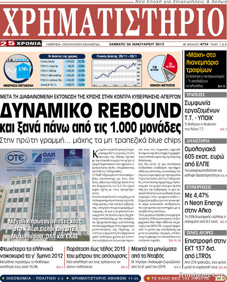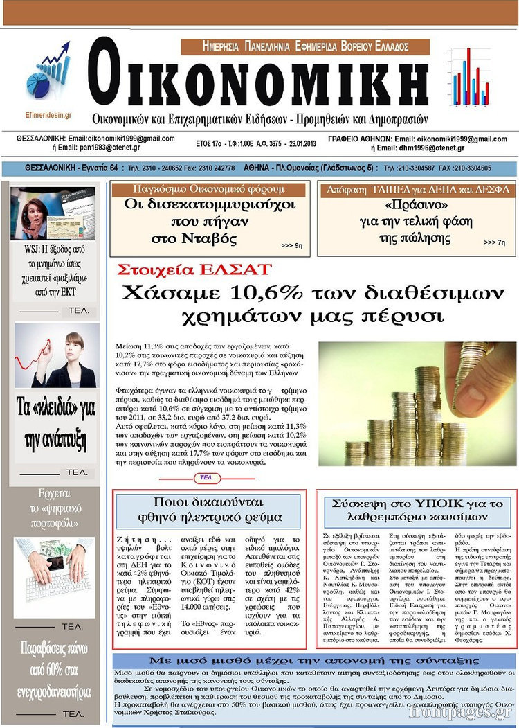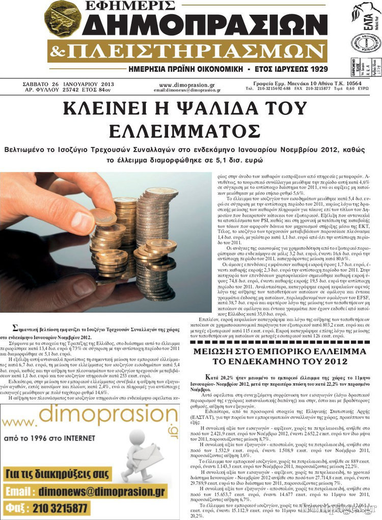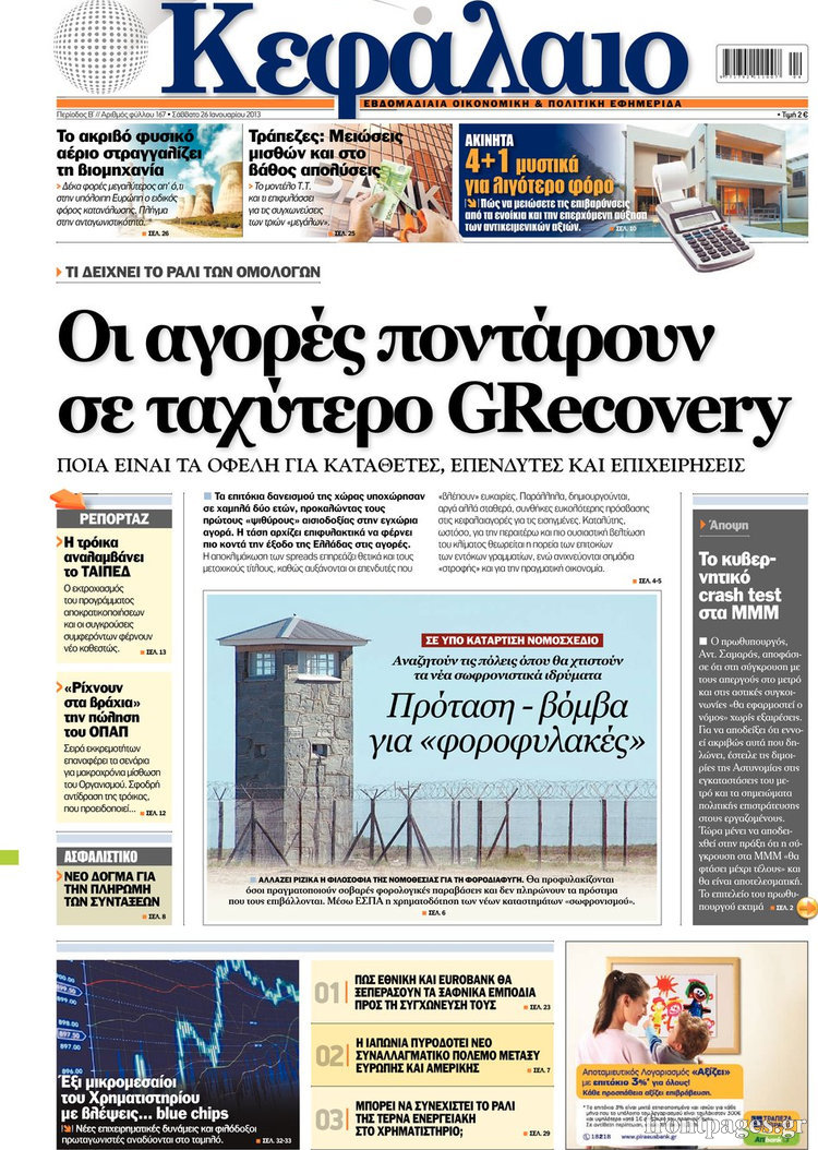 Οι οικονομικές εφημερίδες Enikos Newsroom 09:46, Σάββατο 26 Ιανουαρίου 2013 Media Οι οικονομικές εφημερίδες Τα πρωτοσέλιδα των οικονομικών εφημερίδων. ΕΦΗΜΕΡΙΔΕΣ ΟΙΚΟΝΟΜΙΚΕΣ ΕΦΗΜΕΡΙΔΕΣ ΠΡΩΤΟΣΕΛΙΔΑ Μοιράσου το: σχολίασε κι εσύ (0 σχόλια) Ακολουθήστε το enikos.gr στο Google News και μάθετε πρώτοι όλες τις ειδήσεις Δείτε όλες τις τελευταίες ειδήσεις από την Ελλάδα και τον Κόσμο στο enikos.gr Ειδήσεις Ροή Ειδήσεων 2 ώρες πριν Αυστραλία: Σχέσεις με το ISIS εκτιμάται πως είχαν οι δράστες της τρομοκρατικής επίθεσης στο Σίδνεϊ 25 λεπτά πριν Τσιάρας για αγροτικές κινητοποιήσεις: Μονόδρομος ο διάλογος – Διαφάνεια με τη μεταφορά του ΟΠΕΚΕΠΕ στην ΑΑΔΕ 2 ώρες πριν Σοκ στο Χόλιγουντ: Νεκροί από μαχαιριές ο σκηνοθέτης Ρομπ Ράινερ και η σύζυγός του – Αναφορές ότι τους σκότωσε ο γιος τους 2 ώρες πριν Αγρότες: Αμετακίνητοι από τα μπλόκα σε τελωνεία και εθνικές οδούς – Ο χάρτης των κινητοποιήσεων και τα αιτήματά τους 2 ώρες πριν Δολοφονία στη Φοινικούντα: Απολογούνται σήμερα οι δύο συλληφθέντες – Στο «κάδρο» και δύο γυναίκες 8 λεπτά πριν Τα 3 ζώδια που μπαίνουν σε μια νέα δυναμική εποχή – «Είστε έτοιμοι για όλα» 1 ώρα πριν Κληρονόμησε 2,8 εκατ. ευρώ και φοβάται ότι οι άνδρες θα την πλησιάζουν για τα λεφτά – «Μήπως καλύτερα να το κρατήσω μυστικό;» 2 ώρες πριν Κάτω από παλάτι κρυβόταν ένα άλλο μνημειώδες ανάκτορο: Οι ανασκαφές σε αρχαία πόλη αποκάλυψαν τα ερείπια και τα μυστικά του 4 ώρες πριν Διατροφή: Γιατρός προειδοποιεί για 2 απλά λάθη που αυξάνουν τον κίνδυνο χρόνιων παθήσεων 39 δευτερόλεπτα πριν Αγροτικές κινητοποιήσεις: Αποκλεισμός του τελωνείου Νίκης στη Φλώρινα και του δρόμου προς Πτολεμαΐδα 5 λεπτά πριν Το χρυσό συμβόλαιο της THEON INTERNATIONAL 8 λεπτά πριν Τα 3 ζώδια που μπαίνουν σε μια νέα δυναμική εποχή – «Είστε έτοιμοι για όλα» 15 λεπτά πριν Αλλάζει το σκηνικό του καιρού την Παρασκευή: «Το ατμοσφαιρικό βουνό υποχωρεί και ανοίγει ο δρόμος για τις κακοκαιρίες» 20 λεπτά πριν Λίλα Μπακλέση – Νατάσα Εξηνταβελώνη: «Όταν πας μια Πατρινιά και μια Περιστεριώτισσα σε εστιατόριο με Michelin – Βίντεο από την έξοδό τους ENIKOS NETWORK Έλλειψη μαγνησίου: Ποια τα συμπτώματα που επηρεάζουν ύπνο, ενέργεια και διάθεση Έχετε καλή φυσική κατάσταση; Δείτε αν μπορείτε να κάνετε αυτές τις 5 κινήσεις Δάνεια σε ελβετικό φράγκο: Ανακοινώνεται η ρύθμιση- Ποιοι και πόσο θα έχουν όφελος – Όλες οι λεπτομέρειες Τέλος οι διώξεις για χρέη σε Εφορία και ΕΦΚΑ – Τι προβλέπει νέα διάταξη μετά την πτώχευση Σύγχρονος Νοστράδαμος: Προειδοποιεί για «μεγάλο γεγονός» τους επόμενους μήνες που θα συγκλονίσει τη Βρετανία και τον κόσμο Τεστ παρατηρητικότητας: Μπορείτε να βρείτε τις 3 διαφορές στις εικόνες με έναν πιγκουίνο σε 14 δευτερόλεπτα περισσότερα 09:15 , Δευτέρα 15 Δεκεμβρίου 2025 Την Κυριακή με τη Realnews: Ό,τι και αν αγοράσεις, σκανάρεις και κερδίζεις! Την Κυριακή με τη Realnews: Ό,τι και αν αγοράσεις, σκανάρεις και κερδίζεις! Με το PADU app, το... 07:42 , Δευτέρα 15 Δεκεμβρίου 2025 Την Κυριακή με τη Realnews: Δωροεπιταγή10€ Δωροεπιταγή αξίας 10€ για αγορές άνω των 60€ από τα πολυκαταστήματα FactoryOutlet H προσφορά ι... 07:17 , Δευτέρα 15 Δεκεμβρίου 2025 Αυτή την Κυριακή με τη Realnews: Instyle, μαζί Drive και Realnews Geopolitics Αυτή την Κυριακή με τη Realnews: Instyle, μαζί Drive και Realnews Geopolitics Instyle Η Άννα Ρ... 05:49 , Δευτέρα 15 Δεκεμβρίου 2025 Οι οικονομικές εφημερίδες 15/12/2025 Διαβάστε τα πρωτοσέλιδα από τις οικονομικές εφημερίδες, σήμερα 15/12/2025. ΤΕΛΕΥΤΑΙΕΣ ΕΙΔΗΣΕΙΣ 39 δευτερόλεπτα πριν Αγροτικές κινητοποιήσεις: 
