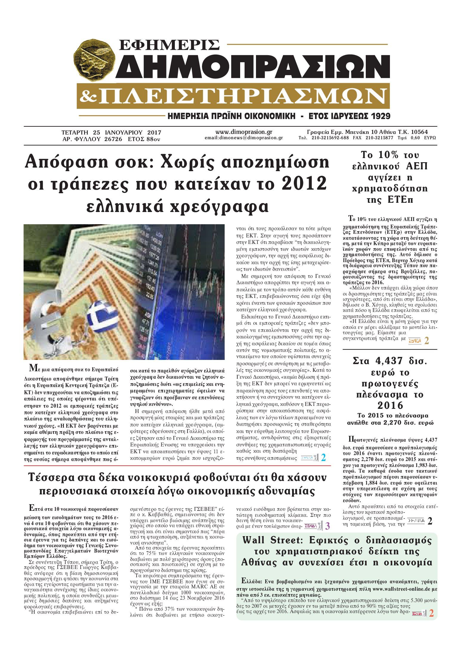 Οι οικονομικές εφημερίδες 25/1/2017 Enikos Newsroom 00:34, Τετάρτη 25 Ιανουαρίου 2017 Media Διαβάστε τα σημερινά πρωτοσέλιδα των οικονομικών εφημερίδων: ΟΙΚΟΝΟΜΙΚΕΣ ΕΦΗΜΕΡΙΔΕΣ ΠΡΩΤΟΣΕΛΙΔΑ Μοιράσου το: σχολίασε κι εσύ (0 σχόλια) Ακολουθήστε το enikos.gr στο Google News και μάθετε πρώτοι όλες τις ειδήσεις Δείτε όλες τις τελευταίες ειδήσεις από την Ελλάδα και τον Κόσμο στο enikos.gr Ειδήσεις Ροή Ειδήσεων 1 ώρα πριν Πούτιν: «Ανοησίες» και «υστερίες» οι ισχυρισμοί της Ευρώπης για πιθανή σύγκρουση με τη Ρωσία – «Κάνουν πλύση εγκεφάλου» 5 ώρες πριν Έρευνα MRB: Η πρόθεση ψήφου και τα σημαντικότερα προβλήματα – Οι «λέξεις» που εκφράζουν τους πολίτες 2 ώρες πριν Αμοργός: «Θα προσπαθήσω να το κάνω κάθε μέρα» – Ποιος είναι ο αγρότης που έστησε μόνος του το πρώτο μπλόκο στο νησί 13 λεπτά πριν Τραγωδία στην Αλεξανδρούπολη: Παιδάκι 3 ετών μεταφέρθηκε νεκρό από τη μητέρα του στο νοσοκομείο 54 λεπτά πριν Συνάντηση Μητσοτάκη με την Κ.Ο. της ΝΔ: Οι αφίξεις των βουλευτών, τα γλυκά και τα «πηγαδάκια» 5 ώρες πριν Τα 4 ζώδια που ξαναβρίσκουν τον εαυτό τους – «Μπαίνετε επιτέλους στην ουσία των πραγμάτων» 6 ώρες πριν 20 χρόνια τα Χριστούγεννα ξεκινούν στα Public με μεγάλη ποικιλία σε δώρα! 4 ώρες πριν «Δεν είχα κλάψει από τότε που διαγνώστηκα με καρκίνο, ώσπου ένα τηλεφώνημα με έκανε να λυγίσω» – Η συγκλονιστική εξομολόγηση ενός άνδρα 3 ώρες πριν Τα 7 σπάνια χαρακτηριστικά που κάνουν κάποιους ανθρώπους ακαταμάχητους 27 δευτερόλεπτα πριν Παραμένουν στα μπλόκα οι αγρότες της Μεσσηνίας – Κλειστή η εθνική οδός Καλαμάτας- Αθήνας 7 λεπτά πριν Φον ντερ Λάιεν: Επιστολή για το μεταναστευτικό ενόψει της Συνόδου Κορυφής – «Υπήρξε πρόοδος, αλλά έχουμε σημαντική δουλειά μπροστά μας» 11 λεπτά πριν Χριστουγεννιάτικη γιορτή με τον Σάκη Ρούβα στον ξενώνα «Μαριάννα Β. Βαρδινογιάννη-ΕΛΠΙΔΑ» 13 λεπτά πριν Τραγωδία στην Αλεξανδρούπολη: Παιδάκι 3 ετών μεταφέρθηκε νεκρό από τη μητέρα του στο νοσοκομείο 13 λεπτά πριν Βουλή: Άρση της ασυλίας της Ζωής Κωνσταντοπούλου για μήνυση συκοφαντικής δυσφήμισης ENIKOS NETWORK 5 πράγματα που αποφεύγει γαστρεντερολόγος για να μειώσει τον κίνδυνο καρκίνου του εντέρου Ανησυχητική αύξηση της υπέρτασης στα παιδιά – Πώς θα τα προστατέψουμε; ΕΛΕΤΑΕΝ: Πόσα χρήματα θα δοθούν σε δήμους και νοικοκυριά από τις ΑΠΕ «IRIS Παντού»: Στην κορυφή της Ευρώπης η Ελλάδα με 120 εκατ. ευρώ συναλλαγές το 2025 – Η σύγκριση με τις άλλες χώρες της Ευ... Σύγχρονος Νοστράδαμος: Προειδοποιεί για «μεγάλο γεγονός» τους επόμενους μήνες που θα συγκλονίσει τη Βρετανία και τον κόσμο Τεστ παρατηρητικότητας: Μπορείτε να βρείτε τις 3 διαφορές στις εικόνες με έναν πιγκουίνο σε 14 δευτερόλεπτα περισσότερα 12:35 , Τετάρτη 17 Δεκεμβρίου 2025 Μίρκα Παπακωνσταντίνου: «Δεν ήμουν αισιόδοξη για τα νούμερα – Είμαι ρεαλίστρια» Στα γυρίσματα του εορταστικού επεισοδίου της αγαπημένης σειράς “Το Σόι Σου”, βρέθηκε η κάμερα ... 12:12 , Τετάρτη 17 Δεκεμβρίου 2025 Ακούστε την εκπομπή του Νίκου Χατζηνικολάου 17/12/2025 Ακούστε την εκπομπή του Νίκου Χατζηνικολάου στον ραδιοφωνικό σταθμό RealFm 97,8, την Τετάρτη 1... 11:35 , Τετάρτη 17 Δεκεμβρίου 2025 Home Alone: Το σπίτι της ταινίας θα ανακαινιστεί – Επιστροφή στην αισθητική της δεκαετίας του ’90 Οι νέοι ιδιοκτήτες του πραγματικού σπιτιού που παρουσιάζεται στην κλασική ταινία του 1990 «Hom... 11:25 , Τετάρτη 17 Δεκεμβρίου 2025 Grand Hotel: Απόψε το τελευταίο επεισόδιο της χρονιάς – Όλα τα μυστικά μένουν εδώ Το τελευταίο επεισόδιο της χρονιάς της σειρά