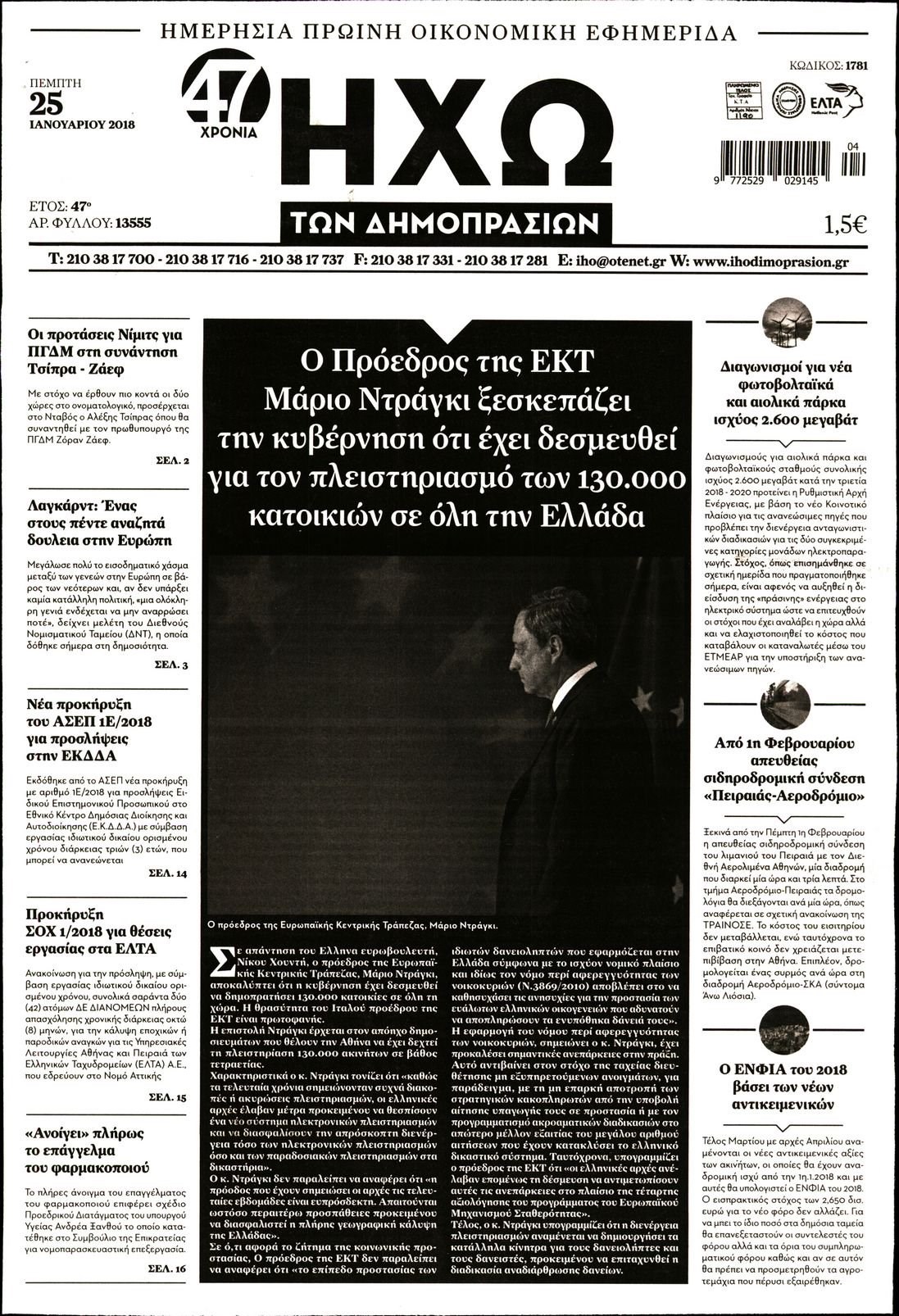 Οι οικονομικές εφημερίδες 25/1/2018 Enikos Newsroom 07:17, Πέμπτη 25 Ιανουαρίου 2018 Media Διαβάστε τα σημερινά πρωτοσέλιδα των οικονομικών εφημερίδων: ΟΙΚΟΝΟΜΙΚΕΣ ΕΦΗΜΕΡΙΔΕΣ ΠΡΩΤΟΣΕΛΙΔΑ Μοιράσου το: σχολίασε κι εσύ (0 σχόλια) Ακολουθήστε το enikos.gr στο Google News και μάθετε πρώτοι όλες τις ειδήσεις Δείτε όλες τις τελευταίες ειδήσεις από την Ελλάδα και τον Κόσμο στο enikos.gr Ειδήσεις Ροή Ειδήσεων 3 ώρες πριν Αγρότες: «Όχι στον διάλογο, μας εμπαίζει η κυβέρνηση» – Αποφάσισαν κλιμάκωση των κινητοποιήσεων, τι θα γίνει τα Χριστούγεννα 3 ώρες πριν Την πρώτη Belharra παρέλαβε η χώρα μας, υψώθηκε η ελληνική σημαία στη φρεγάτα «Κίμων» – Δένδιας: «Το ισχυρότερο Πολεμικό Ναυτικό που είχε ποτέ ο ελληνισμός» 1 ώρα πριν Γιώργος Μαζωνάκης: «Έχει υποστεί ένα σωρό εκβιαστικές πρακτικές – Του είπαν ότι θα του βάλουν τον συγκεκριμένο άνθρωπο να τον καταγγείλει» 2 ώρες πριν Μιχάλης Χουρδάκης: «Είμαι διαθέσιμος να συμβάλω στην προσωρινή κάλυψη του ιατρείου της Ψερίμου» – Η επιστολή στον Άδωνι Γεωργιάδη 3 ώρες πριν Εξώδικο Γεωργιάδη στην Κωνσταντοπούλου – «Με κατηγόρησε ότι έχω καταδικαστεί για παιδεραστία» 33 λεπτά πριν Γάμος: 11 ψυχρές αλλά ευγενικές φράσεις, που λέει ένας άνδρας όταν σκέφτεται τον χωρισμό 4 ώρες πριν Τα 5 ζώδια που θα ευνοηθούν στα οικονομικά τους το 2026 – «Τραβούν το χρήμα σαν μαγνήτες» 5 ώρες πριν Αυτό που κρύβεται κάτω από τη Γροιλανδία θα μπορούσε να ανατρέψει όσα γνωρίζουμε για την άνοδο της στάθμης των θαλασσών 1 ημέρα πριν 20 χρόνια τα Χριστούγεννα ξεκινούν στα Public με μεγάλη ποικιλία σε δώρα! 3 λεπτά πριν FIFA: Έτοιμη να… επανεντάξει τη Ρωσία από το 2026 8 λεπτά πριν Live η κίνηση: Στο «κόκκινο» Κηφισός, Κηφισίας και οι δρόμοι στο κέντρο – Καθυστερήσεις και στην Αττική Οδό 12 λεπτά πριν Εξεταστική για ΟΠΕΚΕΠΕ: Νέο επεισόδιο Κωνσταντοπούλου με Λαζαρίδη και Συρεγγέλα – ΒΙΝΤΕΟ 19 λεπτά πριν Συνάντηση Γεραπετρίτη με την Βρετανή ομόλογό του – Έθεσε και το θέμα των Γλυπτών του Παρθενώνα 24 λεπτά πριν ΗΠΑ: Συντριβή ιδιωτικού αεροσκάφους στη Βόρεια Καρολίνα – «Υπάρχουν νεκροί» ENIKOS NETWORK Ξεκίνησε η «επέλαση» της γρίπης στην Ελλάδα-Ποιοι κινδυνεύουν ΕΟΔΥ: Δωρεάν τεστ για HIV, Ηπατίτιδες, Σύφιλη, Χλαμύδια, Γονόρροια Ευλογιά αιγοπροβάτων: Νέες αποζημιώσεις ύψους 26,02 εκατ. ευρώ σε κτηνοτρόφους – Η κατανομή ανά Περιφέρεια Προσλήψεις σε Δήμο: Ποιοι μπορούν να κάνουν αίτηση έως αύριο – Οι ειδικότητες Χαρτογραφώντας το «σημείο χωρίς επιστροφή»: Για πρώτη φορά αποκαλύπτεται με λεπτομέρεια το ακανθώδες όριο της ατμόσφαιρας τ... Η Google καταργεί τη λειτουργία «dark web report» – Πώς θα μπορούν οι χρήστες να διαγράφουν τα δεδομένα τους περισσότερα 17:45 , Πέμπτη 18 Δεκεμβρίου 2025 ROUK ZOUK: Εορταστικό επεισόδιο με καλεσμένους τους πρωταγωνιστές του «Γιατί ρε πατέρα» Το Σάββατο 20 Δεκεμβρίου στις 21:00, η Ζέτα Μακρυπούλια υποδέχεται εκλεκτούς ηθοποιούς που όλο... 17:20 , Πέμπτη 18 Δεκεμβρίου 2025 Άγιος έρωτας: Η Χριστίνα εξομολογείται στον πατέρα Νικόλαο, απόψε στις 21:00 στον Alpha Η Νότα αποφασίζει να εκδικηθεί τον Πέτρο και τον Στέφανο, για χάρη του Λούη, όμως τα πράγματα ... 16:50 , Πέμπτη 18 Δεκεμβρίου 2025 Να μ’ αγαπάς: Ζωή και Φωτεινή συμφιλιώνονται ως μάνα με κόρη, απόψε στις 20:00 Η ταυτότητα του Άγγελου αποκαλύπτεται στο νέο επεισόδιο της σειράς “Να μ’ αγαπάς... 15:52 , Πέμπτη 18 Δεκεμβρίου 2025 Το Σπίτι Δίπλα Στο Ποτάμι: Το καθηλωτικό τελευταίο επεισόδιο για το 2025 απόψε στις 22:30 Καθηλώνει το σημερινό επεισόδιο της σειράς “Το Σπίτι 