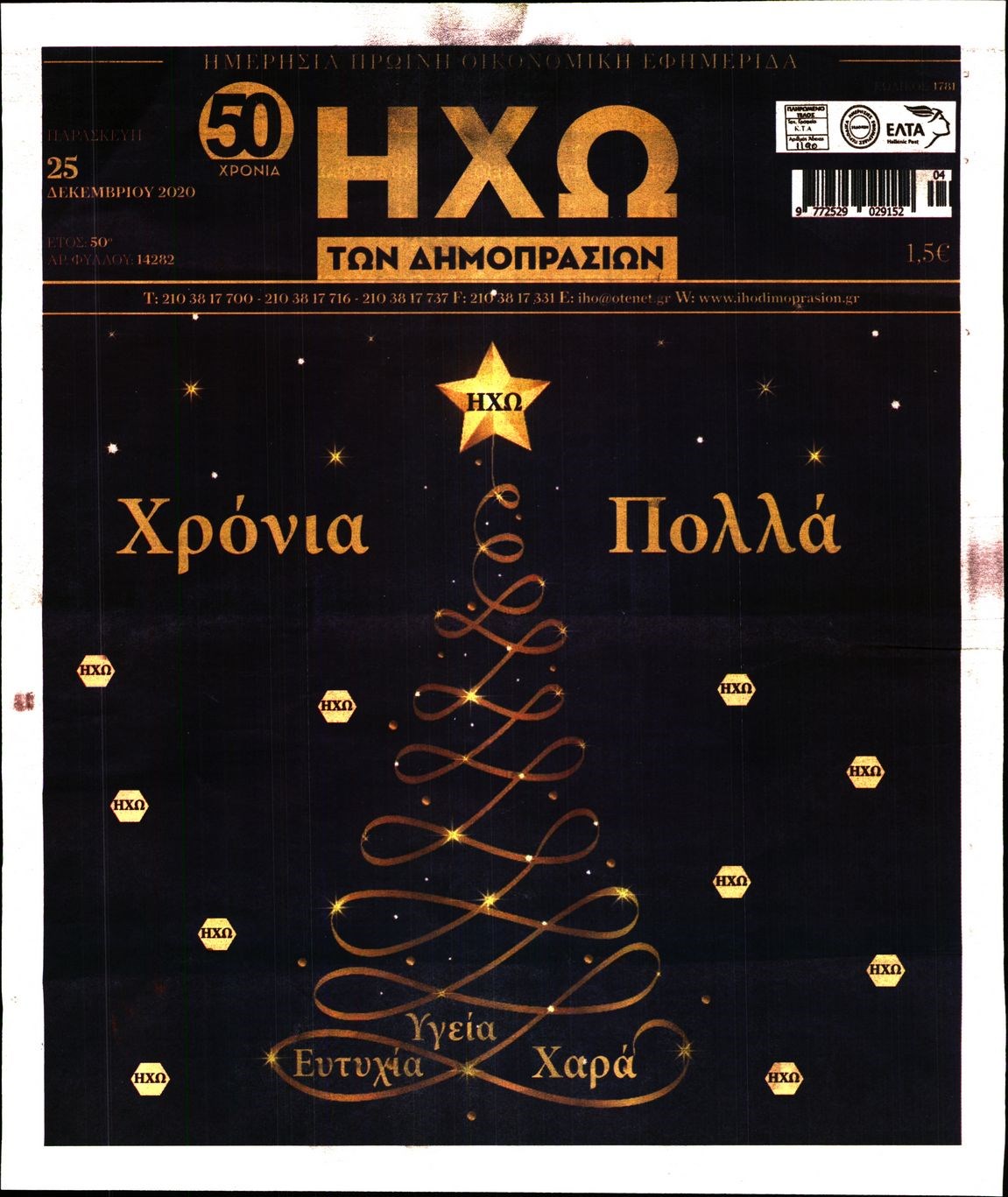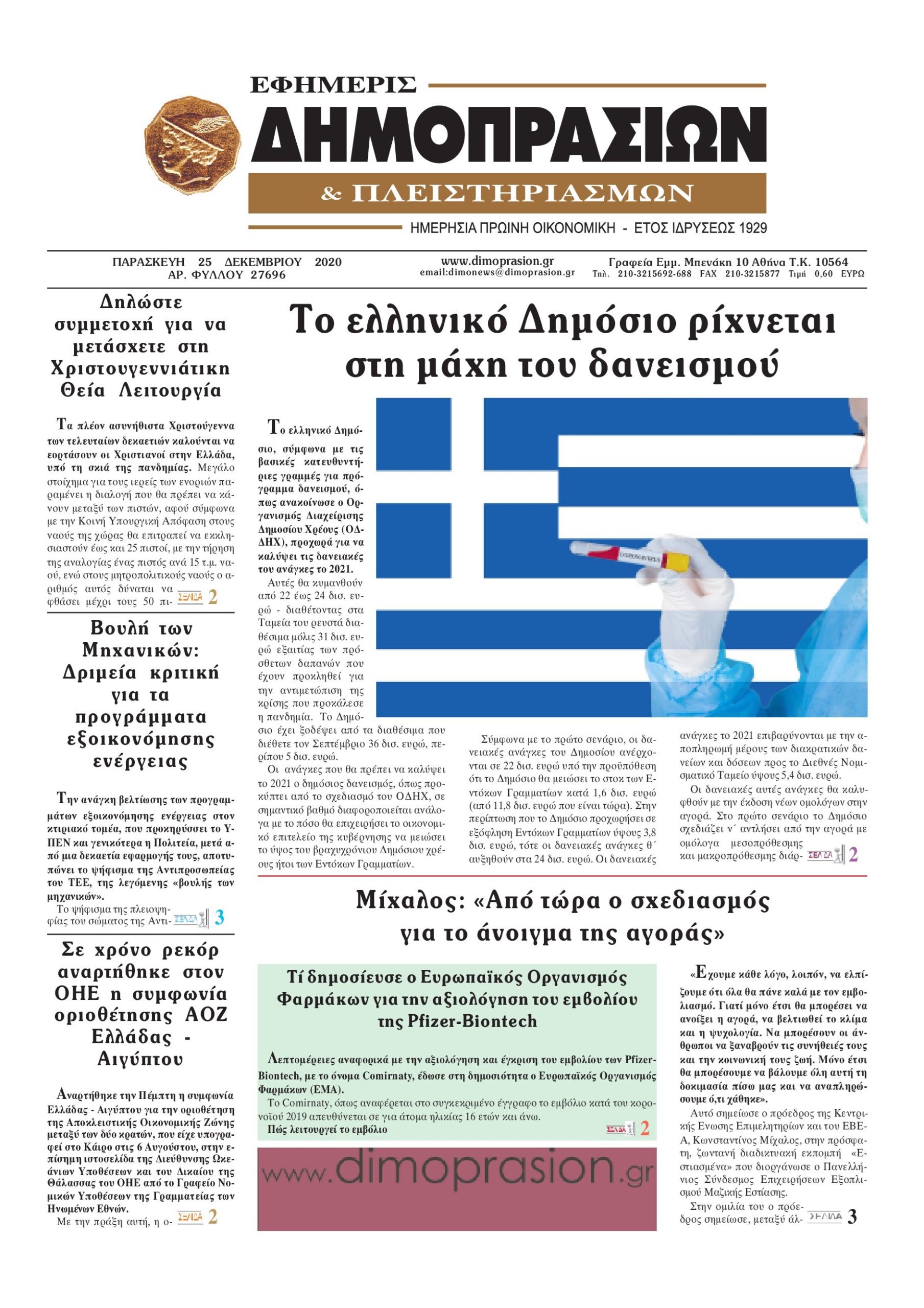 Οι οικονομικές εφημερίδες 25/12/2020 Διονύσης Νίκκας 07:44, Παρασκευή 25 Δεκεμβρίου 2020 Media Διαβάστε τα πρωτοσέλιδα των οικονομικών εφημερίδων… ΟΙΚΟΝΟΜΙΚΕΣ ΕΦΗΜΕΡΙΔΕΣ ΠΡΩΤΟΣΕΛΙΔΑ Μοιράσου το: σχολίασε κι εσύ (0 σχόλια) Ακολουθήστε το enikos.gr στο Google News και μάθετε πρώτοι όλες τις ειδήσεις Δείτε όλες τις τελευταίες ειδήσεις από την Ελλάδα και τον Κόσμο στο enikos.gr Ειδήσεις Ροή Ειδήσεων 1 ώρα πριν Μεσόγειος: Η διαδρομή του ρωσικού τάνκερ «Qendil» και η στοχευμένη επίθεση της Ουκρανίας με drone – Ο Πούτιν προειδοποίησε για αντίποινα 1 ώρα πριν Αττική: Θρίλερ με νεκρό βρέφος 5 μηνών – Κοιμόταν στο ίδιο κρεβάτι με τους γονείς του 2 ώρες πριν Από το Ορμένιο ως τα Μάλγαρα κι από τη Σιάτιστα μέχρι τη Νίκαια: Μπλόκα σε όλη την Ελλάδα – Το Σάββατο ανοίγουν τα διόδια οι αγρότες 2 ώρες πριν «Έλληνας Εσκομπάρ»: Φωτογραφίες με τους 4 τόνους κοκαΐνης που κατασχέθηκαν από το σκάφος «Ουρανία» 4 ώρες πριν Πούτιν: Σαρκαστικά μηνύματα, παράπονα και απρόοπτα στη συνέντευξη Τύπου – Η πρόταση γάμου on air και οι ερωτήσεις για τα αγγούρια και τους… εξωγήινους 3 ώρες πριν Τα 5 ζώδια που ευνοούνται στην ερωτική ζωή τους την επόμενη εβδομάδα – «Η ενέργεια του Αιγόκερου φέρνει αγάπη και σταθερότητα» 7 ώρες πριν Ειδικός μοιράζεται 6 κόλπα για να διατηρείστε σε φόρμα με πάνω από 40 ώρες εργασίας την εβδομάδα: «Προπονηθείτε πριν από τη δουλειά, όχι μετά» 4 ώρες πριν Αυτό το έξυπνο μαθηματικό κόλπο θα μπορούσε να αλλάξει τον τρόπο με τον οποίο οι επιστήμονες μελετούν τους σεισμούς 2 ώρες πριν Κουίζ για την παλιά Αθήνα: Αναγνωρίζετε την περιοχή; Έχετε περάσει 100% από εκεί 6 λεπτά πριν ΗΠΑ: Νέος γύρος συνομιλιών στο Μαϊάμι – Σήμερα συνάντηση Γουίτκοφ με Ουκρανούς και Ευρωπαίους διαπραγματευτές, το Σαββατοκύριακο με Ρώσους αξιωματούχους 11 λεπτά πριν Νέα σειρά γραμματοσήμων «ΕΛΠΙΔΑ-Μαριάννα Β. Βαρδινογιάννη» 15 λεπτά πριν Ιταλία: Με εισιτήριο από την 1η Φεβρουαρίου 2026 η πρόσβαση στη Φοντάνα ντι Τρέβι – Πόσο θα κοστίζει 23 λεπτά πριν Μήπως έχετε χάσει τον εαυτό σας στη σχέση σας; 7 «αθόρυβες» υποχωρήσεις που μάλλον κάνατε, χωρίς να το συνειδητοποιήσετε 29 λεπτά πριν Λάρισα: Ασθενοφόρο έπεσε πάνω σε κλούβα της ΕΛ.ΑΣ στον Πλατύκαμπο – Τραυματίστηκε ο συνοδηγός – ΒΙΝΤΕΟ ENIKOS NETWORK «Η σούπερ» γρίπη εξαπλώνεται στην Ευρώπη-Στοιχεία από το ECDC για την αποτελεσματικότητα του εμβολίου ΕΛΣΤΑΤ: Αύξηση κατά 1,7% των επαγγελματιών υγείας το 2024 Προκήρυξη ΑΣΕΠ για 397 μόνιμες προσλήψεις στο Δημόσιο: Βγήκαν τα προσωρινά αποτελέσματα – Πότε αρχίζει η υποβολή ενστάσεων Η απάντηση της κυβέρνησης στα αιτήματα των αγροτών: 16 έχουν ικανοποιηθεί, 4 βρίσκονται υπό επεξεργασία και 7 δεν είναι εφι... Χαρτογραφώντας το «σημείο χωρίς επιστροφή»: Για πρώτη φορά αποκαλύπτεται με λεπτομέρεια το ακανθώδες όριο της ατμόσφαιρας τ... Η Google καταργεί τη λειτουργία «dark web report» – Πώς θα μπορούν οι χρήστες να διαγράφουν τα δεδομένα τους περισσότερα 18:11 , Παρασκευή 19 Δεκεμβρίου 2025 Το σόι σου: Ο Άρης έρχεται στην Ελλάδα για τις γιορτές των Χριστουγέννων – Τι θα δούμε στο αποψινό εορταστικό επεισόδιο Ένα απολαυστικό, εορταστικό επεισόδιο της σειράς “Το σόι σου”, γεμάτο ευτράπελα αλ... 15:15 , Παρασκευή 19 Δεκεμβρίου 2025 Την Κυριακή με τη Realnews: Ό,τι και αν αγοράσεις, σκανάρεις και κερδίζεις! Την Κυριακή με τη Realnews: Ό,τι και αν αγοράσεις, σκανάρεις και κερδίζεις! Με το PADU app, το... 08:00 , Παρασκευή 19 Δεκεμβρίου 2025 Την Κυριακή με τη Realnews: Δωροεπιταγή 10€ Δωροεπιταγ