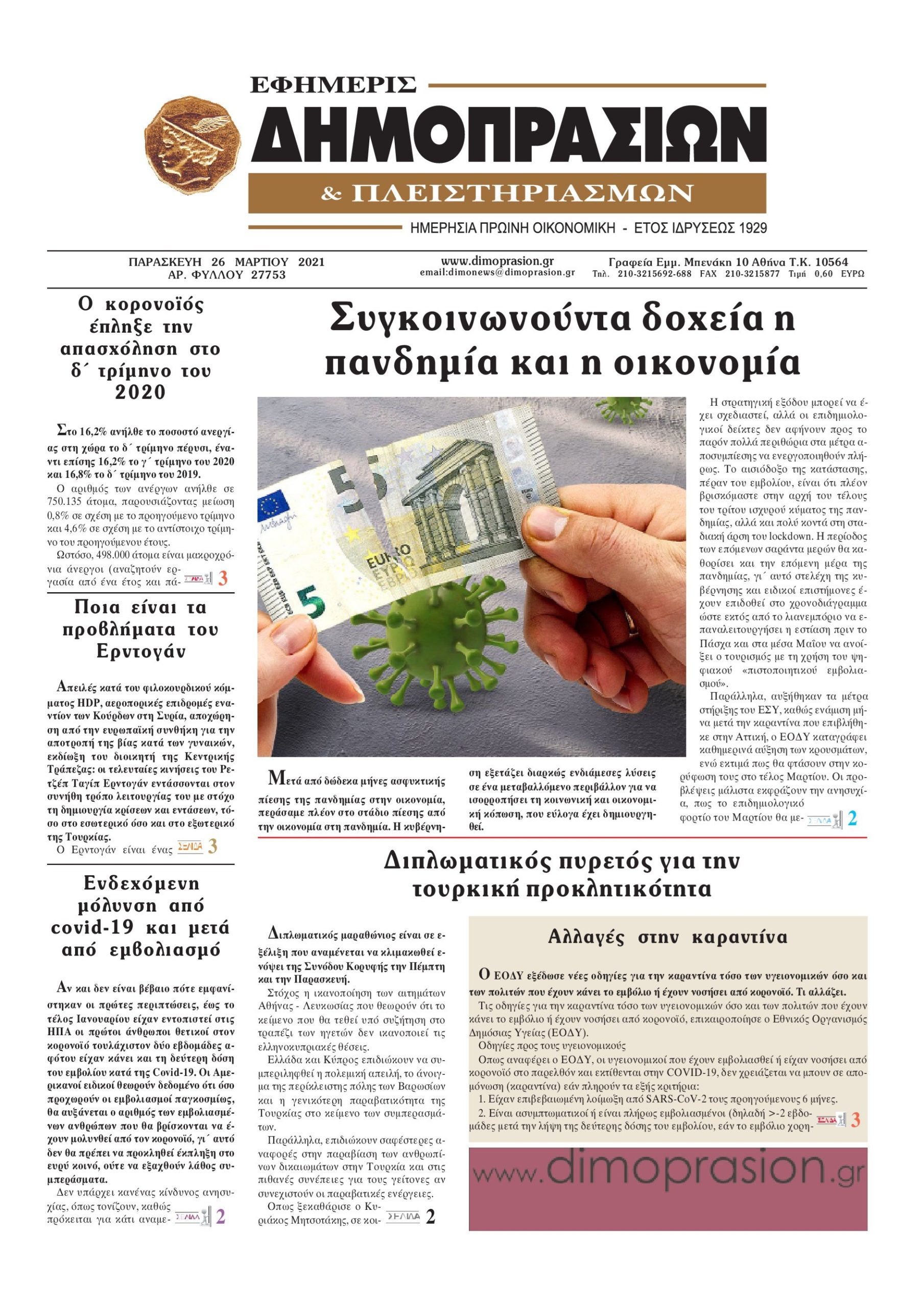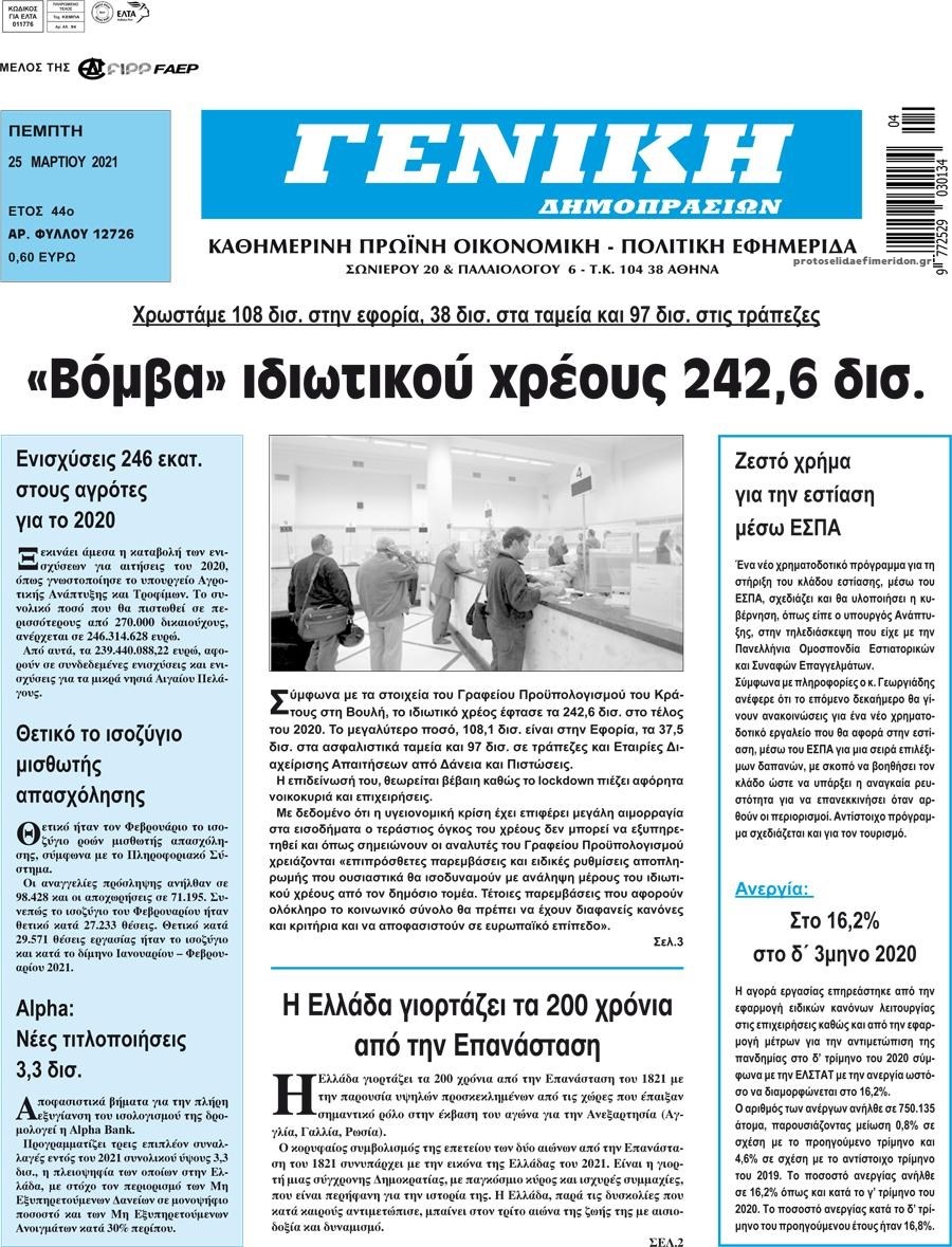 Οι οικονομικές εφημερίδες 25/3/2021 Διονύσης Νίκκας 06:33, Πέμπτη 25 Μαρτίου 2021 Media Διαβάστε τα πρωτοσέλιδα των οικονομικών εφημερίδων… ΟΙΚΟΝΟΜΙΚΕΣ ΕΦΗΜΕΡΙΔΕΣ Μοιράσου το: σχολίασε κι εσύ (0 σχόλια) Ακολουθήστε το enikos.gr στο Google News και μάθετε πρώτοι όλες τις ειδήσεις Δείτε όλες τις τελευταίες ειδήσεις από την Ελλάδα και τον Κόσμο στο enikos.gr Ειδήσεις Ροή Ειδήσεων 3 ώρες πριν Αυξάνουν την πίεση προς την κυβέρνηση οι αγρότες: Κλείνουν παρακαμπτήριους και ανοίγουν διόδια – Τι θα γίνει τις γιορτές 1 ώρα πριν ΟΠΕΚΕΠΕ: Προφυλακιστέος ο φερόμενος αρχηγός και ο λογιστής της εγκληματικής οργάνωσης 2 ώρες πριν Φοινικούντα: Το Σάββατο απολογείται ο 30χρονος γιος γνωστού επιχειρηματία της Πλάκας που παραδόθηκε – Όσα είπε στους αστυνομικούς και ο ρόλος του στο έγκλημα 2 ώρες πριν Μπορεί ο Μαδούρο να αντέξει τον αποκλεισμό του Τραμπ; Τι θα χρειαστεί η Ουάσινγκτον για να τον ανατρέψει 4 ώρες πριν Πρίγκιπας Ουίλιαμ – Κέιτ: Η νέα οικογενειακή φωτογραφία για τις Χριστουγεννιάτικες κάρτες του 2025 3 ώρες πριν Ύπνος: Η απλή βραδινή ρουτίνα για να προστατεύσετε τα μαλλιά σας από το κρύο κατά τη διάρκεια του χειμώνα 4 ώρες πριν Manifesting: Πώς να συναντήσετε τον σύντροφο της ζωής σας, ανάλογα με τον μήνα γέννησής σας 2 ημέρες πριν 20 χρόνια τα Χριστούγεννα ξεκινούν στα Public με μεγάλη ποικιλία σε δώρα! 2 ώρες πριν Αρχαιολόγοι ανακάλυψαν ρωμαϊκά τεχνουργήματα από μια πόλη που δεν υπήρξε ποτέ – Τα τρία εντυπωσιακά κτίρια και ο αμφορέας με τις… σαρδέλες 3 λεπτά πριν Νέος πρέσβης της Μεγάλης Βρετανίας στις ΗΠΑ ο Κρίστιαν Τέρνερ 6 λεπτά πριν Conference League: Με Νόα, Ντρίτα, Άλκμααρ ή Τσέλιε στους «16» η ΑΕΚ 15 λεπτά πριν Conference League: Απευθείας στους «16» η ΑΕΚ Λάρνακας και η Ρακόβ των Σβάρνα και Κωνσταντόπουλου – Τα αποτελέσματα και η βαθμολογία, 3η η ΑΕΚ 25 λεπτά πριν Σε ομάδες που συνδέονται με το ρωσικό κράτος αποδίδει η Δανία δύο κυβερνοεπιθέσεις που δέχθηκε 40 λεπτά πριν Βαθμολογία UEFA: Η Πολωνία προσπέρασε την Ελλάδα ENIKOS NETWORK Σε περίοδο αυξημένης δραστηριότητας η γρίπη στην Ελλάδα-Μέτρα προστασίας από τον ΕΟΔΥ Σκέφτεστε συνέχεια συζητήσεις που έχετε κάνει; Τι σημαίνει αυτό, σύμφωνα με ειδικό Στεγαστικό: Τι λέει η ΠΟΜΙΔΑ για τα νέα μέτρα που ανακοίνωσε ο Κυριάκος Μητσοτάκης Λαγκάρντ: Αισιόδοξη για την ανάπτυξη της Ευρωζώνης, αβέβαιη για τον πληθωρισμό Χαρτογραφώντας το «σημείο χωρίς επιστροφή»: Για πρώτη φορά αποκαλύπτεται με λεπτομέρεια το ακανθώδες όριο της ατμόσφαιρας τ... Η Google καταργεί τη λειτουργία «dark web report» – Πώς θα μπορούν οι χρήστες να διαγράφουν τα δεδομένα τους περισσότερα 17:45 , Πέμπτη 18 Δεκεμβρίου 2025 ROUK ZOUK: Εορταστικό επεισόδιο με καλεσμένους τους πρωταγωνιστές του «Γιατί ρε πατέρα» Το Σάββατο 20 Δεκεμβρίου στις 21:00, η Ζέτα Μακρυπούλια υποδέχεται εκλεκτούς ηθοποιούς που όλο... 17:20 , Πέμπτη 18 Δεκεμβρίου 2025 Άγιος έρωτας: Η Χριστίνα εξομολογείται στον πατέρα Νικόλαο, απόψε στις 21:00 στον Alpha Η Νότα αποφασίζει να εκδικηθεί τον Πέτρο και τον Στέφανο, για χάρη του Λούη, όμως τα πράγματα ... 16:50 , Πέμπτη 18 Δεκεμβρίου 2025 Να μ’ αγαπάς: Ζωή και Φωτεινή συμφιλιώνονται ως μάνα με κόρη, απόψε στις 20:00 Η ταυτότητα του Άγγελου αποκαλύπτεται στο νέο επεισόδιο της σειράς “Να μ’ αγαπάς... 15:52 , Πέμπτη 18 Δεκεμβρίου 2025 Το Σπίτι Δίπλα Στο Ποτάμι: Το καθηλωτικό τελευταίο επεισόδιο για το 2025 απόψε στις 22:30 Καθηλώνει το σημερινό επεισόδιο της σειράς “Το Σπίτι Δίπλα Στο Ποτάμι” που έρχεται... ΤΕΛΕΥΤΑΙΕΣ ΕΙΔΗΣΕΙΣ 3 λε