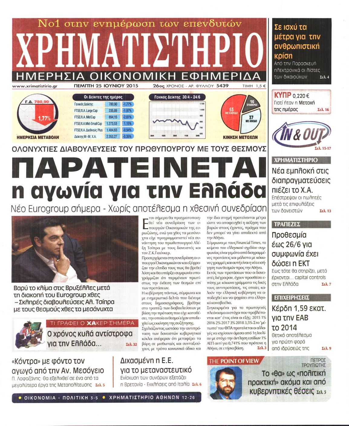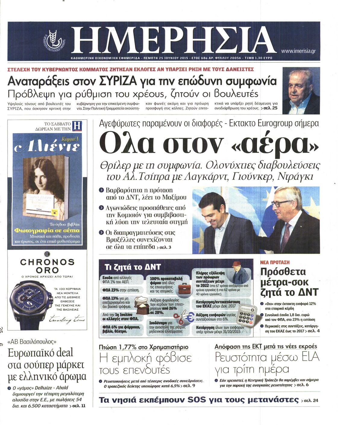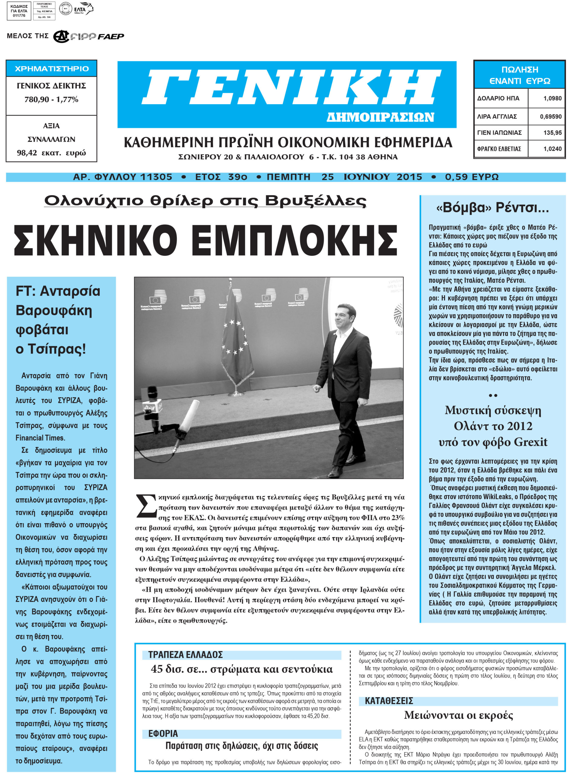 Oι οικονομικές εφημερίδες 25/6/2015 Enikos Newsroom 06:48, Πέμπτη 25 Ιουνίου 2015 Media Διαβάστε τα σημερινά πρωτοσέλιδα των οικονομικών εφημερίδων: ΟΙΚΟΝΟΜΙΚΕΣ ΕΦΗΜΕΡΙΔΕΣ ΠΡΩΤΟΣΕΛΙΔΑ Μοιράσου το: σχολίασε κι εσύ (0 σχόλια) Ακολουθήστε το enikos.gr στο Google News και μάθετε πρώτοι όλες τις ειδήσεις Δείτε όλες τις τελευταίες ειδήσεις από την Ελλάδα και τον Κόσμο στο enikos.gr Ειδήσεις Ροή Ειδήσεων 8 ώρες πριν Μητσοτάκης: Αναγκαία η μεταρρύθμιση του πρωτογενούς τομέα – Τα 6 νέα μέτρα για το στεγαστικό και οι αναφορές σε «Ιθάκη» και «πολιτικούς του καναπέ» 7 ώρες πριν Δάνεια σε ελβετικό φράγκο: Τα βασικά σημεία της ρύθμισης – ανάσας για 40.000 δανειολήπτες – Αναλυτικός οδηγός με ερωτήσεις και απαντήσεις 7 ώρες πριν Κυψέλη: Εξιτήριο πήρε η 14χρονη μαθήτρια που μαχαιρώθηκε από την 16χρονη σε σχολείο – «Θέλω να βοηθήσω το παιδί, έχει μπλέξει με κακές παρέες» 6 ώρες πριν Τραμπ: Γιατί κατέθεσε τώρα την αγωγή κατά του BBC – Πώς η κίνησή του εξυπηρετεί το νέο δόγμα του για «αντίσταση» στην Ευρώπη, υπέρ των συντηρητικών 7 ώρες πριν ΟΠΕΚΕΠΕ – Παράνομες επιδοτήσεις: Ελεύθεροι με περιοριστικούς όρους και οι 7 κατηγορούμενοι που απολογήθηκαν σήμερα 6 ώρες πριν Ανακαλύφθηκε βυθισμένη πέτρινη κατασκευή ανοιχτά της Κριμαίας – Αποτελεί μέρος αρχαίας ελληνικής αποικίας 7 ώρες πριν Ύπνος: Αυτό μπορεί να είναι το χειρότερο λάθος για το βιολογικό ρολόι σας, σύμφωνα με ειδικό 8 ώρες πριν Αριθμολογία: Οι άνθρωποι που έχουν γεννηθεί αυτές τις 3 ημερομηνίες, προσελκύουν μεγάλη τύχη πριν από το τέλος του 2025 10 ώρες πριν Οι 7 συμπεριφορές που μαρτυρούν ότι ένας άνδρας επενδύει μακροπρόθεσμα σε μια σχέση 3 λεπτά πριν Κόστα Ρίκα: Το Κογκρέσο απέρριψε το αίτημα για άρση της ασυλίας του προέδρου Τσάβες 11 λεπτά πριν Κολομβία: Νεκροί τέσσερις αστυνομικοί σε βομβιστικές επιθέσεις ανταρτών 19 λεπτά πριν Στάση εργασίας 11:00 – 17:00 σήμερα στα λεωφορεία του ΟΑΣΑ – Ποιες γραμμές θα λειτουργήσουν 35 λεπτά πριν Παλαιστινιακό: «Η λύση των δύο κρατών είναι ο μόνος βιώσιμος δρόμος», τόνισε η Ελλάδα στο Συμβούλιο Ασφαλείας του ΟΗΕ 42 λεπτά πριν Ελένη Καρακάση: «Ένιωθα πολύ αδικημένη, δεν μπορούσα να ελέγξω τον εαυτό μου σε δύσκολες στιγμές» ENIKOS NETWORK Αίτημα ΙΣΑ για την εξαίρεση των προσωπικών γιατρών από τις κατ’ οίκον επισκέψεις Η σκανδιναβική μέθοδος στον ύπνο που μπορεί να σώσει έναν γάμο Πιερρακάκης: Ο προϋπολογισμός συμβάλλει ουσιαστικά στην ενίσχυση της αγοραστικής δύναμης της πλειονότητας των εργαζομένων e-ΕΦΚΑ: Παρατείνεται η προθεσμία για την υποβολή ΑΠΔ – Ποιους αφορά Σύγχρονος Νοστράδαμος: Προειδοποιεί για «μεγάλο γεγονός» τους επόμενους μήνες που θα συγκλονίσει τη Βρετανία και τον κόσμο Τεστ παρατηρητικότητας: Μπορείτε να βρείτε τις 3 διαφορές στις εικόνες με έναν πιγκουίνο σε 14 δευτερόλεπτα περισσότερα 20:06 , Τρίτη 16 Δεκεμβρίου 2025 Ο ΣΚΑΙ καταγγέλλει τον ΕΚΚΟΜΕΔ Επιστολή με την οποία καταγράφει την έντονη διαμαρτυρία του προς τον διευθύνοντα σύμβουλο του... 17:40 , Τρίτη 16 Δεκεμβρίου 2025 Eurovision: Στις 4 Ιανουαρίου αποκαλύπτονται τα 28 τραγούδια του ελληνικού τελικού Η αγωνία τελειώνει, η γιορτή της Eurovision αρχίζει στην ΕΡΤ από τις πρώτες ημέρες της νέας χρ... 17:09 , Τρίτη 16 Δεκεμβρίου 2025 Alter Ego Media: Βαθύτατη θλίψη και ειλικρινή συλλυπητήρια για την απώλεια της Ειρήνης Μαρινάκη Τη βαθύτατη θλίψη και τα ειλικρινή συλλυπητήριά της εκφράζει η Alter Ego Media για τον θάνατο ... 13:00 , Τρίτη 16 Δεκεμβρίου 2025 «Στο Παρά Πέντε – 20 Χρόνια Μετά»