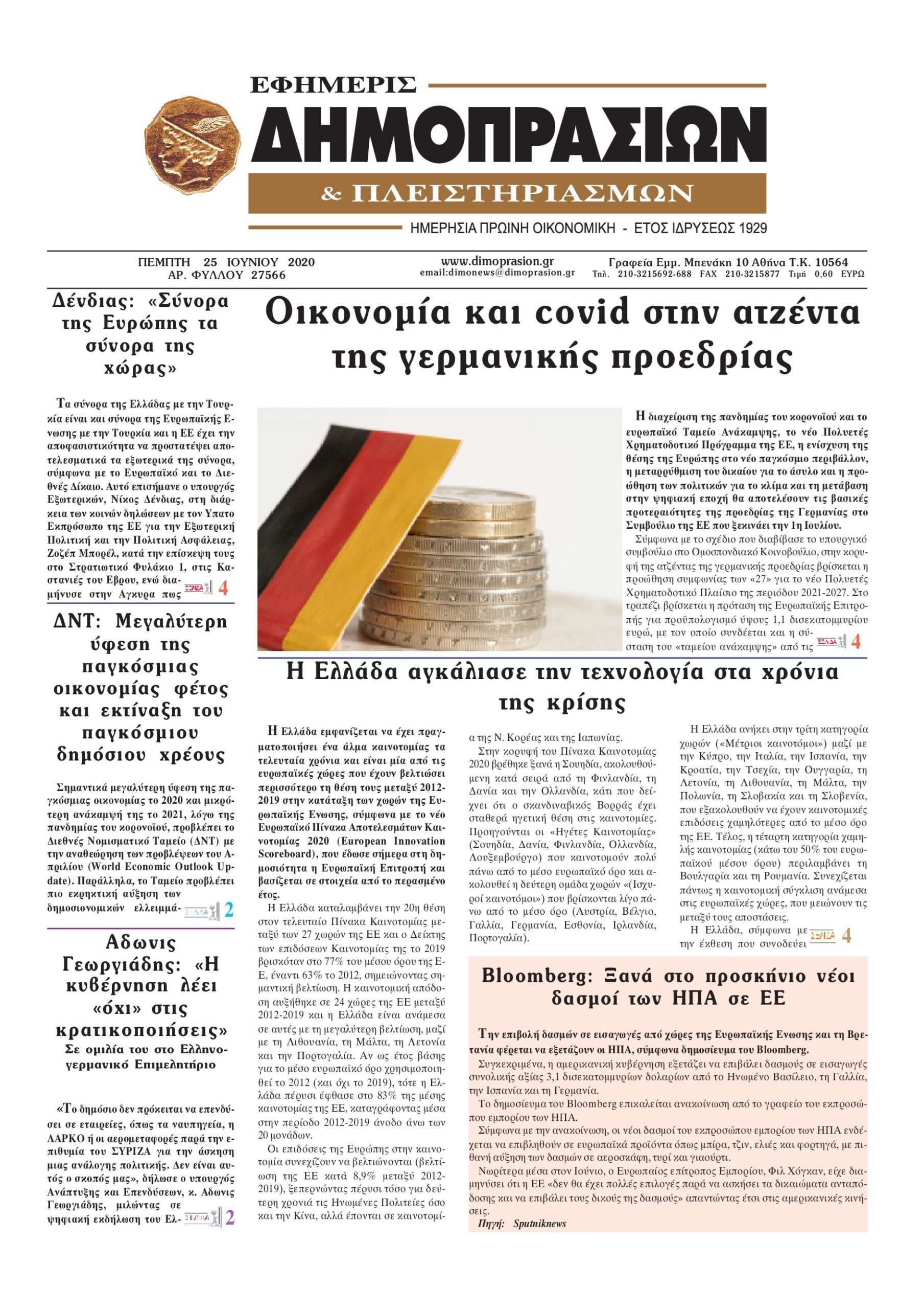 Οι οικονομικές εφημερίδες 25/6/2020 Διονύσης Νίκκας 06:42, Πέμπτη 25 Ιουνίου 2020 Media Διαβάστε τα πρωτοσέλιδα των οικονομικών εφημερίδων… ΟΙΚΟΝΟΜΙΚΕΣ ΕΦΗΜΕΡΙΔΕΣ Μοιράσου το: σχολίασε κι εσύ (0 σχόλια) Ακολουθήστε το enikos.gr στο Google News και μάθετε πρώτοι όλες τις ειδήσεις Δείτε όλες τις τελευταίες ειδήσεις από την Ελλάδα και τον Κόσμο στο enikos.gr Ειδήσεις Ροή Ειδήσεων 4 ώρες πριν Μεσόγειος: Η διαδρομή του ρωσικού τάνκερ «Qendil» και η στοχευμένη επίθεση της Ουκρανίας με drone – Ο Πούτιν προειδοποίησε για αντίποινα 54 λεπτά πριν Αγρότες: Έκλεισαν για μία ώρα την παρακαμπτήρια της Ιόνιας Οδού στη θέση Χαλίκι 2 ώρες πριν Εμπλοκή και αερομαχίες με οπλισμένα τουρκικά F-16 στο Αιγαίο 2 ώρες πριν Πούτιν: «Ναι, είμαι ερωτευμένος» – Βίντεο από τη σπάνια προσωπική παραδοχή του 58 λεπτά πριν Ανδρέας Λυκουρέντζος: Υπέβαλε την παραίτησή του ο πρόεδρος του ΕΛΓΑ, αλλά δεν έγινε δεκτή – Όλο το παρασκήνιο 1 ώρα πριν Αριθμολογία: Οι άνθρωποι που έχουν γεννηθεί αυτές τις 4 ημερομηνίες, συχνά παρεξηγούνται – «Η καλοσύνη τους κρύβει τεράστια δύναμη» 3 ώρες πριν Μήπως έχετε χάσει τον εαυτό σας στη σχέση σας; 7 «αθόρυβες» υποχωρήσεις που μάλλον κάνατε, χωρίς να το συνειδητοποιήσετε 2 ώρες πριν Ξεχάστε το καθάρισμα το Σαββατοκύριακο: Ο «κανόνας των 20 λεπτών» που θα σας λύσει τα χέρια 5 ώρες πριν Κουίζ για την παλιά Αθήνα: Αναγνωρίζετε την περιοχή; Έχετε περάσει 100% από εκεί 34 δευτερόλεπτα πριν Κηφισιά: Με πολλές απουσίες κόντρα στον Ολυμπιακό – «Last dance» για τον Τεττέη 8 λεπτά πριν Ύπνος: Μια κρυφή κατάσταση του εγκεφάλου πριν από τον ύπνο μπορεί να είναι το “κλειδί” για υψηλή ευφυΐα και δημιουργικότητα 14 λεπτά πριν ΕΕ: «Κάποια στιγμή θα χρησιμοποιήσουμε τα ρωσικά περιουσιακά στοιχεία» δήλωσε ο πρόεδρος του ΕΛΚ 18 λεπτά πριν Conference League: Καλύτερη επίθεση η ΑΕΚ στη διοργάνωση και 2η σε προσπάθειες στην εστία – Ξεχωρίζουν Πινέδα, Ελίασον και Ρότα 19 λεπτά πριν Έγκυος η Άννα Κορακάκη: «Η οικογένειά μας μεγαλώνει…» – Η αποκάλυψη για το φύλο του μωρού ENIKOS NETWORK Το ΕΚΑΒ τιμήθηκε από την Ακαδημία Αθηνών για τα 40 χρόνια προσφοράς του Έχετε πραγματικά μεγάλη καρδιά; 10 χαρακτηριστικά όσων έχουν καλοσύνη Όμιλος ΔΕΗ: Νέα ορόσημα και ενισχυμένη διαφάνεια στην ετήσια Έκθεση Βιώσιμης Ανάπτυξης Έρχονται νέες προσλήψεις σε Δήμο – Όλες οι λεπτομέρειες Χαρτογραφώντας το «σημείο χωρίς επιστροφή»: Για πρώτη φορά αποκαλύπτεται με λεπτομέρεια το ακανθώδες όριο της ατμόσφαιρας τ... Η Google καταργεί τη λειτουργία «dark web report» – Πώς θα μπορούν οι χρήστες να διαγράφουν τα δεδομένα τους περισσότερα 20:37 , Παρασκευή 19 Δεκεμβρίου 2025 Don’t Forget The Lyrics: Η Έλλη Κοκκίνου υποδέχεται 4 παίκτες που θα κάνουν τα πάντα για να μη χάσουν ούτε… μισή λέξη από τους στίχους Το «Don’t Forget The Lyrics» επιστρέφει απόψε, Παρασκευή 19 Δεκεμβρίου, στις 21:00 με νέο επει... 19:31 , Παρασκευή 19 Δεκεμβρίου 2025 GNTM: Απόψε ο μεγάλος τελικός για τους 4 φιναλίστ Έπειτα από μήνες γεμάτους μόδα, δημιουργία και έντονες αναμετρήσεις, το GNTM 2025 κορυφώνεται,... 18:11 , Παρασκευή 19 Δεκεμβρίου 2025 Το σόι σου: Ο Άρης έρχεται στην Ελλάδα για τις γιορτές των Χριστουγέννων – Τι θα δούμε στο αποψινό εορταστικό επεισόδιο Ένα απολαυστικό, εορταστικό επεισόδιο της σειράς “Το σόι σου”, γεμάτο ευτράπελα αλ... 15:15 , Παρασκευή 19 Δεκεμβρίου 2025 Την Κυριακή με τη Realnews: Ό,τι και αν αγοράσεις, σκανάρεις και κερδίζεις! Την Κυριακή με τη Realnews: Ό,τι και αν αγοράσεις, σκανάρεις και κερδίζεις! Με το PADU app, το... ΤΕΛΕ