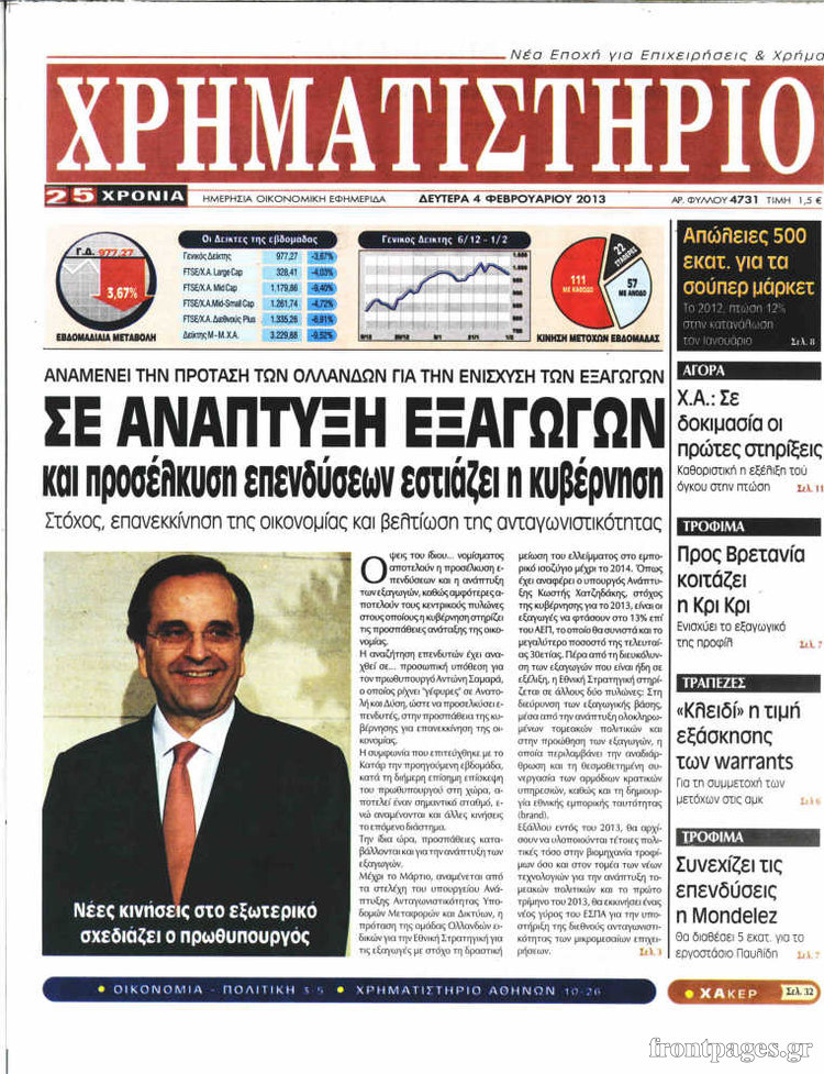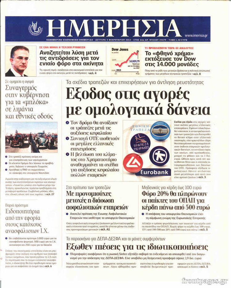 Οι οικονομικές εφημερίδες Enikos Newsroom 09:04, Δευτέρα 04 Φεβρουαρίου 2013 Media Οι οικονομικές εφημερίδες Τα πρωτοσέλιδα των οικονομικών εφημερίδων. ΕΦΗΜΕΡΙΔΕΣ ΟΙΚΟΝΟΜΙΚΕΣ ΕΦΗΜΕΡΙΔΕΣ ΠΡΩΤΟΣΕΛΙΔΑ Μοιράσου το: σχολίασε κι εσύ (0 σχόλια) Ακολουθήστε το enikos.gr στο Google News και μάθετε πρώτοι όλες τις ειδήσεις Δείτε όλες τις τελευταίες ειδήσεις από την Ελλάδα και τον Κόσμο στο enikos.gr Ειδήσεις Ροή Ειδήσεων 8 ώρες πριν Μακελειό στο Σίδνεϊ: Πατέρας και γιος οι δράστες της τρομοκρατικής επίθεσης – Γιατί η Αυστραλία βάζει στο στόχαστρο το Ιράν 9 ώρες πριν Μακελειό στην Αυστραλία: «Πέρασαν οι σφαίρες πάνω από το αυτοκίνητο» – Συγκλονίζει η μαρτυρία Έλληνα που ζει στο Σίδνεϊ 7 ώρες πριν Τρομοκρατική επίθεση στο Σίδνεϊ: «Το αναπόφευκτο συνέβη πλέον» – Πώς οι δράστες είχαν χάσει τον ανθρωπισμό τους πριν πατήσουν την σκανδάλη 7 ώρες πριν Όλα τα αιτήματα αγροτών, κτηνοτρόφων και μελισσοκόμων προς την κυβέρνηση – Παραμένουν στα μπλόκα και προαναγγέλλουν κλιμάκωση 10 ώρες πριν Λακωνία: Βίντεο ντοκουμέντο από την επιχείρηση διάσωσης της 13χρονης που έπεσε σε πηγάδι – Ποια ήταν τα πρώτα λόγια της 39 λεπτά πριν Οπτική ψευδαίσθηση: Μόνο το 1% των ανθρώπων θα βρει το ψάρι σε 12 δευτερόλεπτα 54 λεπτά πριν Διατροφή: Γιατρός προειδοποιεί για 2 απλά λάθη που αυξάνουν τον κίνδυνο χρόνιων παθήσεων 1 ώρα πριν Τα ζώδια σήμερα, Δευτέρα 15 Δεκεμβρίου: Ιχθύες, ξεκινήστε από εκεί που η παρουσία σας έχει σημασία 9 ώρες πριν Ύπνος: 5 λόγοι για τους οποίους ξυπνάτε κουρασμένοι το πρωί κατά τη διάρκεια του χειμώνα 7 λεπτά πριν ΦΠΑ: Αυξάνεται κατά 57% ο αριθμός των ελέγχων για παράνομες επιστροφές και απάτες – Πού θα δοθεί προτεραιότητα 15 λεπτά πριν Γουατεμάλα: Βίαιες συγκρούσεις με νεκρούς στην περιοχή των αυτόχθονων 23 λεπτά πριν Δημόσιο χρέος: Η Ελλάδα αποπληρώνει σήμερα πρόωρα 5,287 δισ. ευρώ από το πρώτο μνημόνιο – Στα 1,6 δισ. ευρώ η ελάφρυνση 31 λεπτά πριν Τραγωδία στην Κολομβία: Δεκαεπτά νεκροί, ανάμεσά τους 16 μαθητές λυκείου, από πτώση λεωφορείου σε χαράδρα 39 λεπτά πριν Οπτική ψευδαίσθηση: Μόνο το 1% των ανθρώπων θα βρει το ψάρι σε 12 δευτερόλεπτα ENIKOS NETWORK 8 κορυφαίες συμβουλές για άνδρες που θέλουν φλογερή σεξουαλική ζωή, σύμφωνα με ειδικό Baby botox: Ποια τα οφέλη και οι κίνδυνοι του να ξεκινήσει κάποιος τις ενέσεις πριν εμφανιστούν ρυτίδες Τέλος οι διώξεις για χρέη σε Εφορία και ΕΦΚΑ – Τι προβλέπει νέα διάταξη μετά την πτώχευση Υπουργείο Αγροτικής Ανάπτυξης: Ενισχύσεις de minimis ύψους 2,1 εκατ. ευρώ – Οι δικαιούχοι Σύγχρονος Νοστράδαμος: Προειδοποιεί για «μεγάλο γεγονός» τους επόμενους μήνες που θα συγκλονίσει τη Βρετανία και τον κόσμο Τεστ παρατηρητικότητας: Μπορείτε να βρείτε τις 3 διαφορές στις εικόνες με έναν πιγκουίνο σε 14 δευτερόλεπτα περισσότερα 05:49 , Δευτέρα 15 Δεκεμβρίου 2025 Οι οικονομικές εφημερίδες 15/12/2025 Διαβάστε τα πρωτοσέλιδα από τις οικονομικές εφημερίδες, σήμερα 15/12/2025. 05:43 , Δευτέρα 15 Δεκεμβρίου 2025 Οι αθλητικές εφημερίδες 15/12/2025 Διαβάστε τα πρωτοσέλιδα από τις αθλητικές εφημερίδες, σήμερα 15/12/2025. 05:38 , Δευτέρα 15 Δεκεμβρίου 2025 Οι πολιτικές εφημερίδες 15/12/2025 Διαβάστε τα πρωτοσέλιδα από τις πολιτικές εφημερίδες, σήμερα 15/12/2025. 21:34 , Κυριακή 14 Δεκεμβρίου 2025 Ο Δικαστής: Η Λέττα είναι αποφασισμένη να αποκαλύψει την αλήθεια για το τροχαίο, απόψε στις 21:45 στον ΑΝΤ1 Ραγδαίες οι εξελίξεις στο νέο επεισόδιο της σειράς “Ο Δικαστής” απόψε στις 21:45 σ... ΤΕΛΕΥΤΑΙΕΣ ΕΙΔΗΣΕΙΣ 7 λεπτά πριν ΦΠΑ: Αυξάνεται κατά 57% ο 