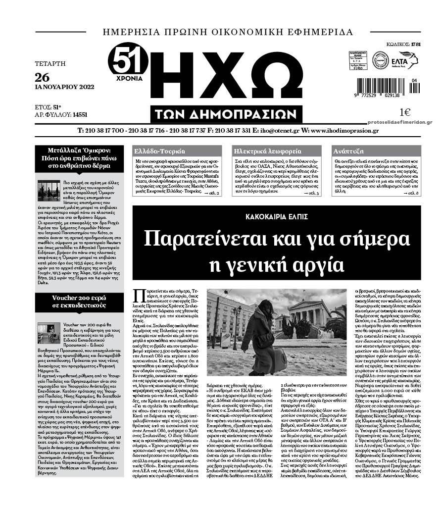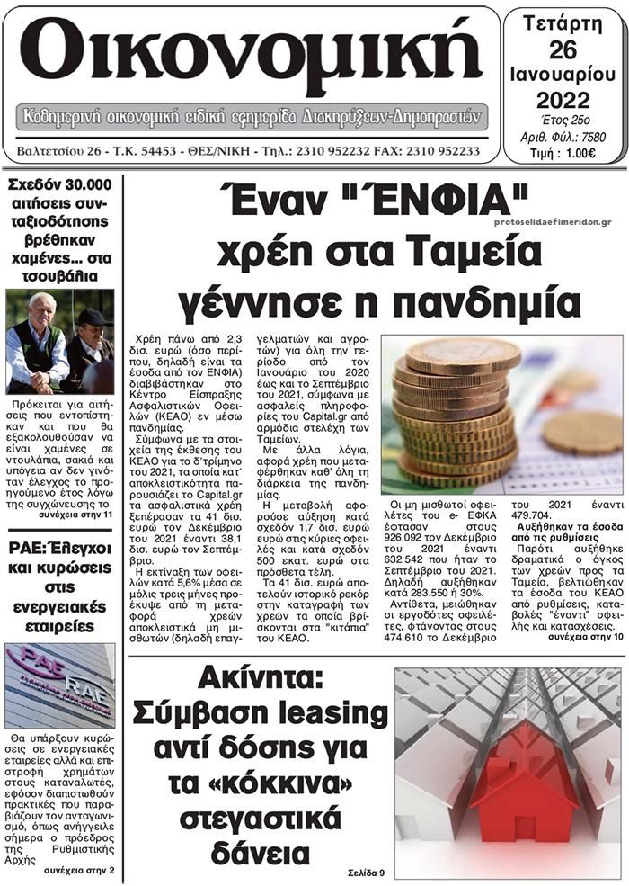 Οι οικονομικές εφημερίδες 26/1/2022 Διονύσης Νίκκας 06:54, Τετάρτη 26 Ιανουαρίου 2022 Media Διαβάστε τα πρωτοσέλιδα από τις οικονομικές εφημερίδες… ΟΙΚΟΝΟΜΙΚΕΣ ΕΦΗΜΕΡΙΔΕΣ Μοιράσου το: ΠΟΥ: Ο «παγκόσμιος κίνδυνος» εξαιτίας της Όμικρον παραμένει πολύ υψηλός Διάγγελμα Ζελένσκι για την απειλή εισβολής από τη Ρωσία – “Δεν έχουμε ψευδαισθήσεις” αλλά “υπάρχει ελπίδα” Μουσουλμάνοι Ελλάδας: Καταδικάζουμε την επίθεση στο τζαμί στα Πατήσια σχολίασε κι εσύ (0 σχόλια) Ακολουθήστε το enikos.gr στο Google News και μάθετε πρώτοι όλες τις ειδήσεις Δείτε όλες τις τελευταίες ειδήσεις από την Ελλάδα και τον Κόσμο στο enikos.gr Ειδήσεις Ροή Ειδήσεων 1 ώρα πριν LIVE από Λοριάν: Η ύψωση της ελληνικής σημαίας στην πρώτη φρεγάτα FDI Belharra ΚΙΜΩΝ 1 ώρα πριν Στην Ευελπίδων ο 22χρονος που καταγγέλλει τον Γιώργο Μαζωνάκη για ασελγείς πράξεις – «Έχουμε εμπιστοσύνη στη Δικαιοσύνη, καμία εκβίαση» λέει ο δικηγόρος του 14 λεπτά πριν Γαλλία: Η οργή των αγροτών – Αναμένεται η ομιλία του Μακρόν, τα τρακτέρ συγκεντρώνονται μαζικά στις Βρυξέλλες 3 ώρες πριν Νίκος Παππάς: Άφαντος παραμένει ο ευρωβουλευτής μετά την επίθεση στον Νίκο Γιαννόπουλο 4 ώρες πριν Συναγερμός και στην Ελλάδα για τη «σούπερ γρίπη»: Πόσο σοβαρή είναι και ποιοι θεωρούνται πιο ευάλωτοι – 3 ειδικοί μιλούν στο enikos.gr 4 ώρες πριν Τα 4 ζώδια που λαμβάνουν ένα ισχυρό σημάδι από το σύμπαν – «Αποκαλύπτεται κάτι που μπορεί να αλλάξει τη ζωή μας» 5 ώρες πριν Η σύζυγός του παραπονιέται για τα χρήματα που της δίνει για ψώνια κάθε μήνα – «Λέει ότι νιώθει φτωχή και της είπα να βρει δουλειά» 3 ώρες πριν Αν κάνετε συνεχώς αυτά τα 8 πράγματα με τα κατοικίδιά σας, σας λείπει η ανθρώπινη επαφή 1 ημέρα πριν 20 χρόνια τα Χριστούγεννα ξεκινούν στα Public με μεγάλη ποικιλία σε δώρα! 2 λεπτά πριν Βίντεο: Ένταση έξω από το Ευρωπαϊκό Κοινοβούλιο στις Βρυξέλλες – Η αστυνομία χρησιμοποιεί δακρυγόνα εναντίον των αγροτών 9 λεπτά πριν Μαρινάκης για Ζωή Κωνσταντοπούλου: Είναι η προσωποποίηση του φασισμού και του μισογυνισμού 14 λεπτά πριν Γαλλία: Η οργή των αγροτών – Αναμένεται η ομιλία του Μακρόν, τα τρακτέρ συγκεντρώνονται μαζικά στις Βρυξέλλες 20 λεπτά πριν Μπαρτζώκας: Πρέπει να διαχειριστούμε τα συναισθήματά μας, νομίζω ότι για αυτό χάσαμε το ματς με τη Βαλένθια 24 λεπτά πριν Το πιο ελπιδοφόρο χριστουγεννιάτικο δέντρο άναψε στο Ογκολογικό Νοσοκομείο Παίδων «Μαριάννα Β. Βαρδινογιάννη-ΕΛΠΙΔΑ» ENIKOS NETWORK 100 χρόνια ΠΙΣ: Ένας αιώνας προσφοράς στην Ιατρική και την κοινωνία Ένα ποτήρι την ημέρα από αυτόν τον χυμό μειώνει τη χοληστερίνη, τη φλεγμονή και την πίεση ΕΚΤ: Σήμερα η συνεδρίαση της Ευρωπαϊκής Κεντρικής Τράπεζας για τα επιτόκια – Τι λένε οι αναλυτές Χριστουγεννιάτικο τραπέζι: Πόσο θα κοστίσει φέτος – Σε ποια είδη τραβούν… την ανηφόρα οι τιμές Χαρτογραφώντας το «σημείο χωρίς επιστροφή»: Για πρώτη φορά αποκαλύπτεται με λεπτομέρεια το ακανθώδες όριο της ατμόσφαιρας τ... Η Google καταργεί τη λειτουργία «dark web report» – Πώς θα μπορούν οι χρήστες να διαγράφουν τα δεδομένα τους περισσότερα 08:00 , Πέμπτη 18 Δεκεμβρίου 2025 Την Κυριακή με τη Realnews: Δωροεπιταγή 10€ Δωροεπιταγή αξίας 10€ για αγορές άνω των 60€ από τα πολυκαταστήματα FactoryOutlet H προσφορά ι... 07:50 , Πέμπτη 18 Δεκεμβρίου 2025 «Το σόι σου»: Backstage στα γυρίσματα για το εορταστικό επεισόδιο «Το σόι σου» φορά τα γιορτινά του για τα Χριστούγεννα και η Όλγα Λαφαζάνη, με την κάμερα του «... 07:36 , Πέμπτη 18 Δεκεμβρίου 2025 Οι αθλητικές μεταδόσεις 18/1