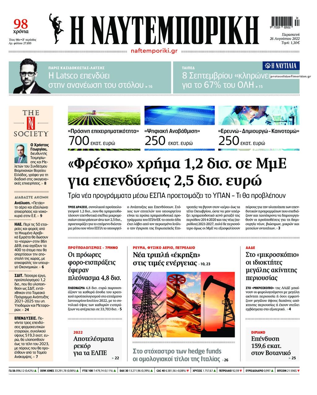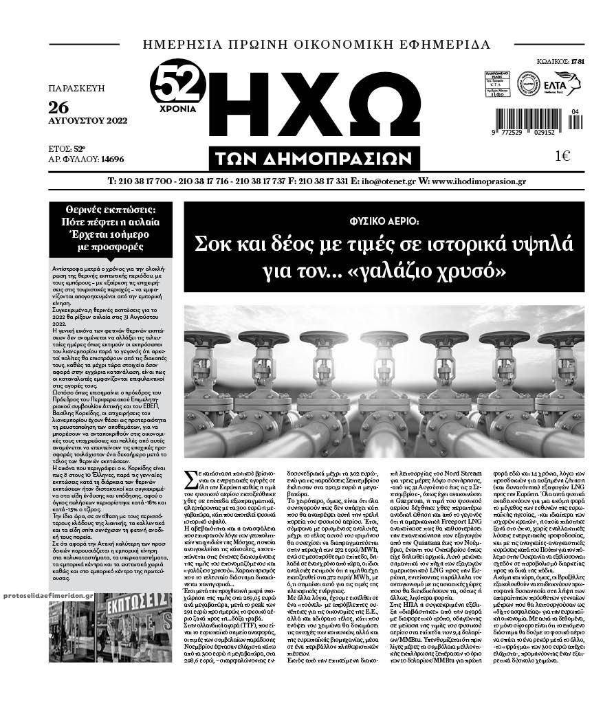 Οι οικονομικές εφημερίδες 26/8/2022 Σταύρος Ιωακείμ 06:33, Παρασκευή 26 Αυγούστου 2022 Media Διαβάστε τα πρωτοσέλιδα από τις οικονομικές εφημερίδες, σήμερα 26/8/2022. ΕΦΗΜΕΡΙΔΕΣ ΟΙΚΟΝΟΜΙΚΕΣ ΕΦΗΜΕΡΙΔΕΣ ΠΡΩΤΟΣΕΛΙΔΑ Μοιράσου το: Οι αθλητικές εφημερίδες 26/8/2022 Οι πολιτικές εφημερίδες 26/8/2022 Σαν σήμερα 26 Αυγούστου: Τα σημαντικότερα γεγονότα της ημέρας σχολίασε κι εσύ (0 σχόλια) Ακολουθήστε το enikos.gr στο Google News και μάθετε πρώτοι όλες τις ειδήσεις Δείτε όλες τις τελευταίες ειδήσεις από την Ελλάδα και τον Κόσμο στο enikos.gr Ειδήσεις Ροή Ειδήσεων 35 λεπτά πριν LIVE από Λοριάν: Η ύψωση της ελληνικής σημαίας στην πρώτη φρεγάτα FDI Belharra ΚΙΜΩΝ 47 λεπτά πριν Στην Ευελπίδων ο 22χρονος που καταγγέλλει τον Γιώργο Μαζωνάκη για ασελγείς πράξεις – «Έχουμε εμπιστοσύνη στη Δικαιοσύνη, καμία εκβίαση» λέει ο δικηγόρος του 3 ώρες πριν Νίκος Παππάς: Άφαντος παραμένει ο ευρωβουλευτής μετά την επίθεση στον Νίκο Γιαννόπουλο 1 ώρα πριν Βρυξέλλες: Ένταση με τους αγρότες – Πέταξαν πατάτες και κροτίδες 3 ώρες πριν Συναγερμός και στην Ελλάδα για τη «σούπερ γρίπη»: Πόσο σοβαρή είναι και ποιοι θεωρούνται πιο ευάλωτοι – 3 ειδικοί μιλούν στο enikos.gr 4 ώρες πριν Τα 4 ζώδια που λαμβάνουν ένα ισχυρό σημάδι από το σύμπαν – «Αποκαλύπτεται κάτι που μπορεί να αλλάξει τη ζωή μας» 5 ώρες πριν Η σύζυγός του παραπονιέται για τα χρήματα που της δίνει για ψώνια κάθε μήνα – «Λέει ότι νιώθει φτωχή και της είπα να βρει δουλειά» 3 ώρες πριν Αν κάνετε συνεχώς αυτά τα 8 πράγματα με τα κατοικίδιά σας, σας λείπει η ανθρώπινη επαφή 1 ημέρα πριν 20 χρόνια τα Χριστούγεννα ξεκινούν στα Public με μεγάλη ποικιλία σε δώρα! 30 δευτερόλεπτα πριν Γιώργος Μαζωνάκης: «Δεν ζήτησα χρήματα, παρά μόνο ηθική δικαίωση» – Οι πρώτες δηλώσεις του 22χρονου μετά την κατάθεση της μήνυσης 5 λεπτά πριν Χριστουγεννιάτικο τραπέζι: Πόσο θα κοστίσει φέτος – Σε ποια είδη τραβούν… την ανηφόρα οι τιμές 13 λεπτά πριν Σκέρτσος για Κωνσταντοπούλου: «Είναι αδίστακτη, βαθιά κυνική και ουσιαστικά αδιάφορη απέναντι στην αλήθεια και τη δικαιοσύνη» 21 λεπτά πριν Χαρίτσης: «Ο κ. Μητσοτάκης έδωσε το πράσινο φως για το λουκέτο στα ΕΛΤΑ» 26 λεπτά πριν Κατερίνα Καινούργιου για Γιώργο Μαζωνάκη: «Θεωρώ φρικτό αυτό το τσίρκο που έχει συμβεί τις τελευταίες μέρες στα Μέσα» ENIKOS NETWORK Όμιλος ΙΑΤΡΟΠΟΛΙΣ: Πρωτοπόροι στη μοριακή απεικόνιση και στην πυρηνική ιατρική Τι περιλαμβάνει το σχέδιο της ΕΕ για την καρδιαγγειακή υγεία-Οι προτάσεις της Ελληνικής Καρδιολογικής Εταιρείας Χριστουγεννιάτικο τραπέζι: Πόσο θα κοστίσει φέτος – Σε ποια είδη τραβούν… την ανηφόρα οι τιμές Ενοίκια: Τι αλλάζει με τη νέα τροπολογία στην πληρωμή Χαρτογραφώντας το «σημείο χωρίς επιστροφή»: Για πρώτη φορά αποκαλύπτεται με λεπτομέρεια το ακανθώδες όριο της ατμόσφαιρας τ... Η Google καταργεί τη λειτουργία «dark web report» – Πώς θα μπορούν οι χρήστες να διαγράφουν τα δεδομένα τους περισσότερα 08:00 , Πέμπτη 18 Δεκεμβρίου 2025 Την Κυριακή με τη Realnews: Δωροεπιταγή 10€ Δωροεπιταγή αξίας 10€ για αγορές άνω των 60€ από τα πολυκαταστήματα FactoryOutlet H προσφορά ι... 07:50 , Πέμπτη 18 Δεκεμβρίου 2025 «Το σόι σου»: Backstage στα γυρίσματα για το εορταστικό επεισόδιο «Το σόι σου» φορά τα γιορτινά του για τα Χριστούγεννα και η Όλγα Λαφαζάνη, με την κάμερα του «... 07:36 , Πέμπτη 18 Δεκεμβρίου 2025 Οι αθλητικές μεταδόσεις 18/12/2025 – Πού θα δείτε τον αγώνα της ΑΕΚ με την Κραϊόβα για το Conference League Τα ματς ΑΕΚ – Ουνιβερσιτάτεα Κραϊόβα για το Conference League και Παναθηναϊκός – Χάπ