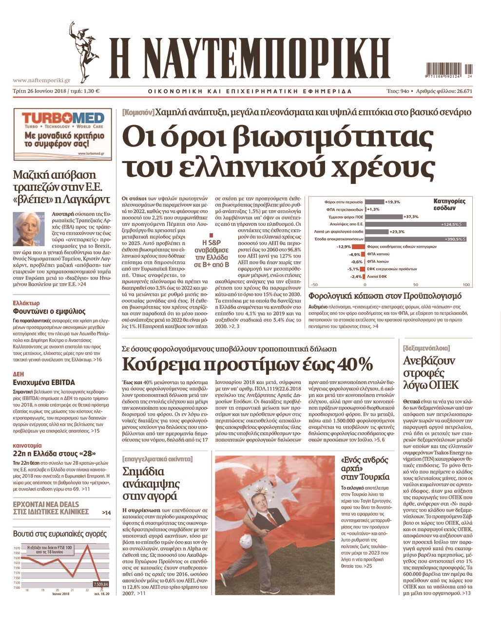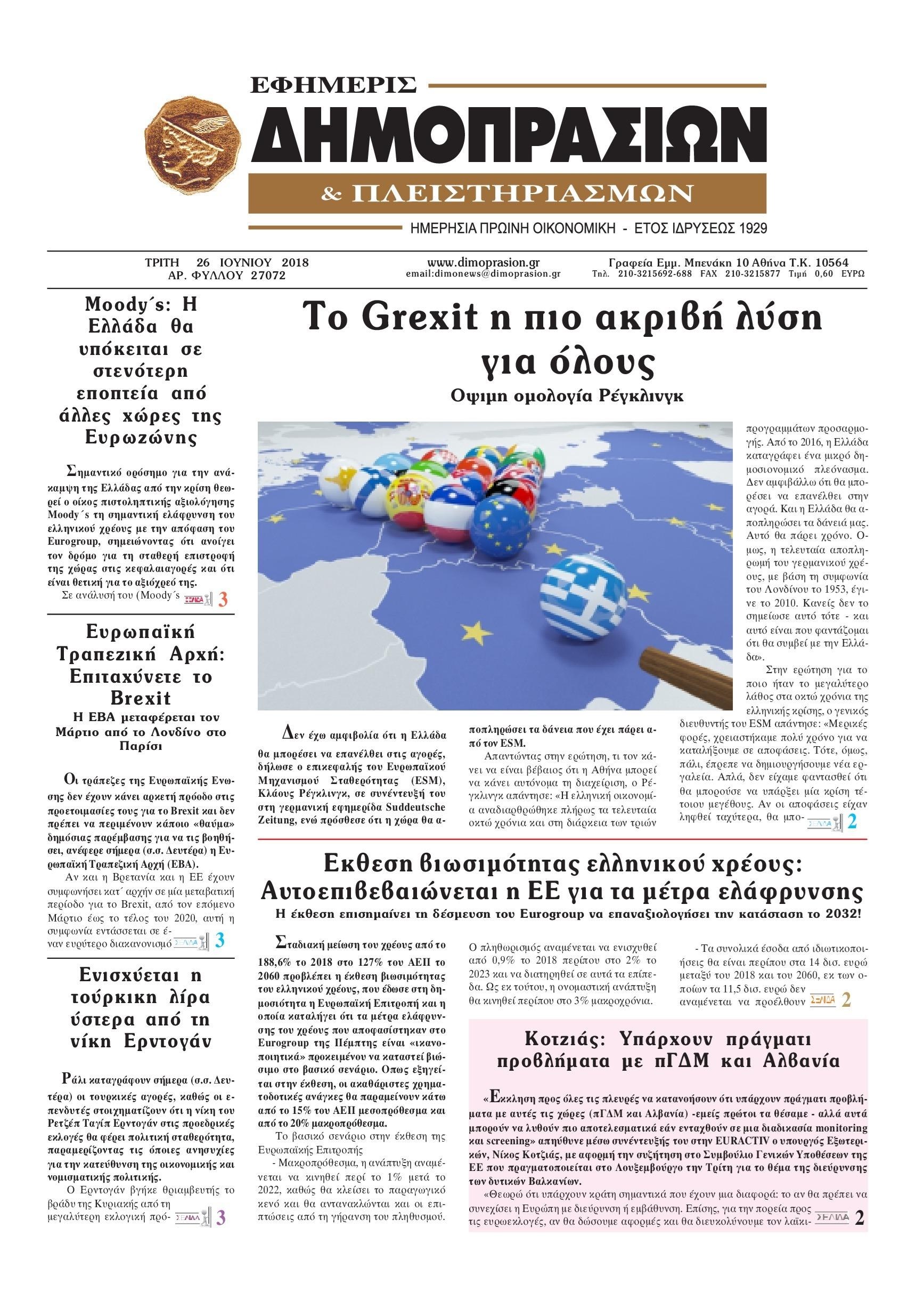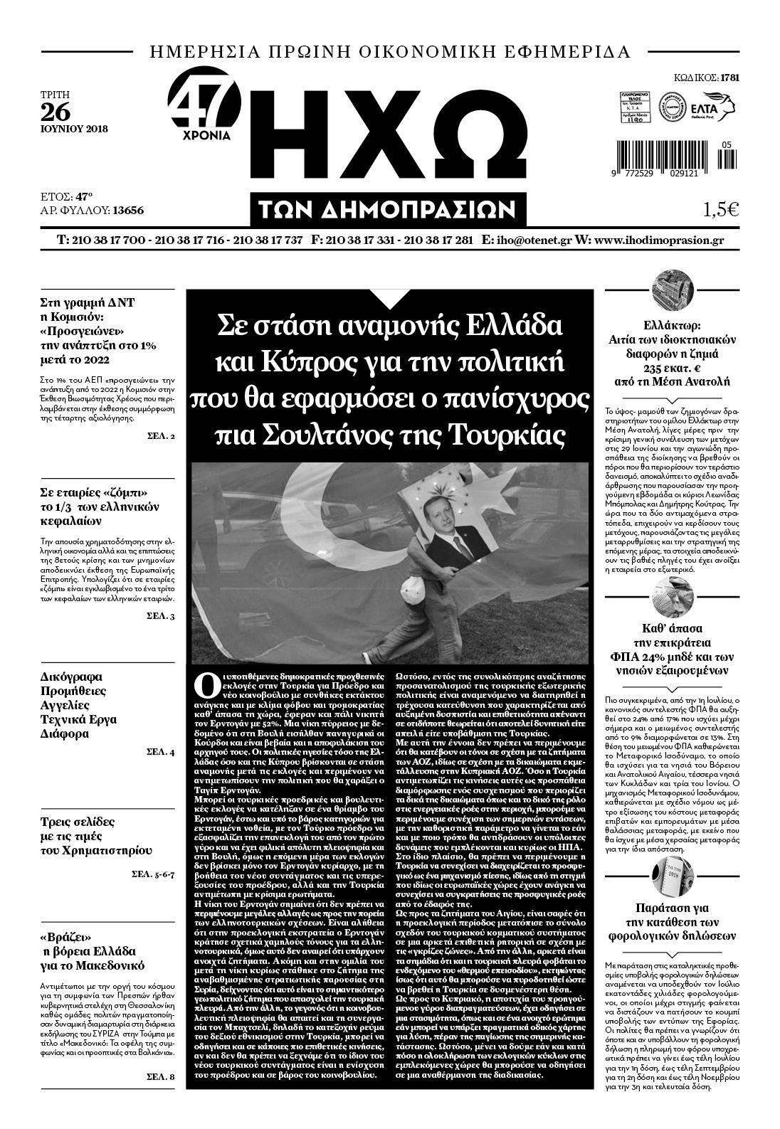 Οι οικονομικές εφημερίδες 26/6/2018 Enikos Newsroom 06:46, Τρίτη 26 Ιουνίου 2018 Media Διαβάστε τα πρωτοσέλιδα ΟΙΚΟΝΟΜΙΚΕΣ ΕΦΗΜΕΡΙΔΕΣ Μοιράσου το: σχολίασε κι εσύ (0 σχόλια) Ακολουθήστε το enikos.gr στο Google News και μάθετε πρώτοι όλες τις ειδήσεις Δείτε όλες τις τελευταίες ειδήσεις από την Ελλάδα και τον Κόσμο στο enikos.gr Ειδήσεις Ροή Ειδήσεων 2 ώρες πριν Αγρότες: «Όχι στον διάλογο, μας εμπαίζει η κυβέρνηση» – Αποφάσισαν κλιμάκωση των κινητοποιήσεων, τι θα γίνει τα Χριστούγεννα 2 ώρες πριν Την πρώτη Belharra παρέλαβε η χώρα μας, υψώθηκε η ελληνική σημαία στη φρεγάτα «Κίμων» – Δένδιας: «Το ισχυρότερο Πολεμικό Ναυτικό που είχε ποτέ ο ελληνισμός» 5 ώρες πριν Γιώργος Μαζωνάκης: «Δεν ζήτησα χρήματα, παρά μόνο ηθική δικαίωση» – Οι πρώτες δηλώσεις του 21χρονου μετά την κατάθεση της μήνυσης 1 ώρα πριν Μιχάλης Χουρδάκης: «Είμαι διαθέσιμος να συμβάλω στην προσωρινή κάλυψη του ιατρείου της Ψερίμου» – Η επιστολή στον Άδωνι Γεωργιάδη 2 ώρες πριν Εξώδικο Γεωργιάδη στην Κωνσταντοπούλου – «Με κατηγόρησε ότι έχω καταδικαστεί για παιδεραστία» 3 ώρες πριν Τα 5 ζώδια που θα ευνοηθούν στα οικονομικά τους το 2026 – «Τραβούν το χρήμα σαν μαγνήτες» 8 ώρες πριν Αν κάνετε συνεχώς αυτά τα 8 πράγματα με τα κατοικίδιά σας, σας λείπει η ανθρώπινη επαφή 4 ώρες πριν Αυτό που κρύβεται κάτω από τη Γροιλανδία θα μπορούσε να ανατρέψει όσα γνωρίζουμε για την άνοδο της στάθμης των θαλασσών 1 ημέρα πριν 20 χρόνια τα Χριστούγεννα ξεκινούν στα Public με μεγάλη ποικιλία σε δώρα! 2 λεπτά πριν Γιώργος Μαζωνάκης: «Έχει υποστεί ένα σωρό εκβιαστικές πρακτικές – Του είπαν ότι θα του βάλουν τον συγκεκριμένο άνθρωπο να τον καταγγείλει» 7 λεπτά πριν Μητσοτάκης: Η φρεγάτα «Κίμων» είναι η καλύτερη απόδειξη ότι οι Ένοπλες Δυνάμεις μας περνούν πια σε μια νέα εποχή – ΒΙΝΤΕΟ 12 λεπτά πριν Πάμε Στοίχημα: Περισσότερα από 29 εκατομμύρια ευρώ σε κέρδη μοίρασε την προηγούμενη εβδομάδα 17 λεπτά πριν Το Ισλαμικό Κράτος αποκαλεί τις δολοφονίες στην Αυστραλία «πηγή υπερηφάνειας» – Δεν αναλαμβάνει την ευθύνη για την επίθεση 22 λεπτά πριν Εύβοια: Πτώμα άνδρα εντοπίστηκε σε πυλωτή ENIKOS NETWORK ΕΟΔΥ: Δωρεάν τεστ για HIV, Ηπατίτιδες, Σύφιλη, Χλαμύδια, Γονόρροια 100 χρόνια ΠΙΣ: Ένας αιώνας προσφοράς στην Ιατρική και την κοινωνία Αμετάβλητα για τέταρτη συνεχόμενη φορά τα επιτόκια της ΕΚΤ – Ποιες είναι οι προβλέψεις για τον πληθωρισμό και την οικονομία... Χριστούγεννα και Πρωτοχρονιά: Δείτε πόσα χρήματα θα πάρουν ως αμοιβή όσοι εργαστούν Χαρτογραφώντας το «σημείο χωρίς επιστροφή»: Για πρώτη φορά αποκαλύπτεται με λεπτομέρεια το ακανθώδες όριο της ατμόσφαιρας τ... Η Google καταργεί τη λειτουργία «dark web report» – Πώς θα μπορούν οι χρήστες να διαγράφουν τα δεδομένα τους περισσότερα 17:45 , Πέμπτη 18 Δεκεμβρίου 2025 ROUK ZOUK: Εορταστικό επεισόδιο με καλεσμένους τους πρωταγωνιστές του «Γιατί ρε πατέρα» Το Σάββατο 20 Δεκεμβρίου στις 21:00, η Ζέτα Μακρυπούλια υποδέχεται εκλεκτούς ηθοποιούς που όλο... 17:20 , Πέμπτη 18 Δεκεμβρίου 2025 Άγιος έρωτας: Η Χριστίνα εξομολογείται στον πατέρα Νικόλαο, απόψε στις 21:00 στον Alpha Η Νότα αποφασίζει να εκδικηθεί τον Πέτρο και τον Στέφανο, για χάρη του Λούη, όμως τα πράγματα ... 16:50 , Πέμπτη 18 Δεκεμβρίου 2025 Να μ’ αγαπάς: Ζωή και Φωτεινή συμφιλιώνονται ως μάνα με κόρη, απόψε στις 20:00 Η ταυτότητα του Άγγελου αποκαλύπτεται στο νέο επεισόδιο της σειράς “Να μ’ αγαπάς... 15:52 , Πέμπτη 18 Δεκεμβρίου 2025 Το Σπίτι Δίπλα Στο Ποτάμι: Το καθηλωτικό τελευταίο επεισόδιο για το 2