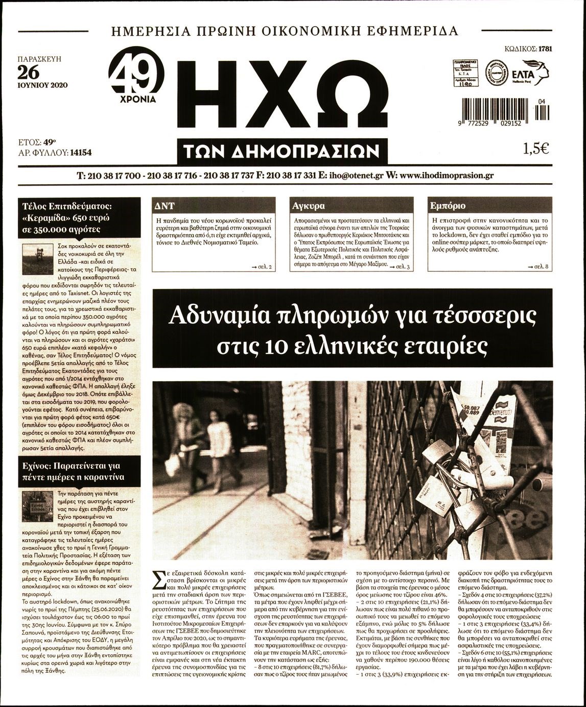 Οι οικονομικές εφημερίδες 26/6/2020 Διονύσης Νίκκας 06:33, Παρασκευή 26 Ιουνίου 2020 Media Διαβάστε τα πρωτοσέλιδα των οικονομικών εφημερίδων… ΟΙΚΟΝΟΜΙΚΕΣ ΕΦΗΜΕΡΙΔΕΣ Μοιράσου το: σχολίασε κι εσύ (0 σχόλια) Ακολουθήστε το enikos.gr στο Google News και μάθετε πρώτοι όλες τις ειδήσεις Δείτε όλες τις τελευταίες ειδήσεις από την Ελλάδα και τον Κόσμο στο enikos.gr Ειδήσεις Ροή Ειδήσεων 1 ώρα πριν Αγρότες: Σήκωσαν τις μπάρες στα διόδια των Αφιδνών – ΦΩΤΟ και ΒΙΝΤΕΟ 5 ώρες πριν Διάλογοι-σοκ από το κύκλωμα που διακινούσε ναρκωτικά σε σχολεία – «Αν δεν είσαι εκεί σε 5 λεπτά, θα φας πολύ ξύλο μπρο» 2 ώρες πριν Κωνσταντίνος Ανεστίδης: «Είμαι αθώος, είμαι καθαρός σαν αστραπή και η αστραπή θα πέσει στο κεφάλι τους» – ΒΙΝΤΕΟ 2 ώρες πριν Εγκαινιάστηκε ο αρχαιολογικός χώρος του Ανακτόρου της Πέλλας – Παρουσιάστηκαν για πρώτη φορά δύο ελληνιστικά αγάλματα 3 ώρες πριν Δήμος Αθηναίων: Ξεκινά τη Δευτέρα η επιστροφή πινακίδων οχημάτων από τη Δημοτική Αστυνομία 4 ώρες πριν Αν ανήκετε σε ένα από αυτά τα 3 ζώδια, το 2026 θα είναι η χρονιά σας – «Η ζωή σας βελτιώνεται σε όλους τους τομείς» 1 ώρα πριν Είσοδος σπιτιού: Πώς να οργανώσετε το χώρο πριν έρθουν οι καλεσμένοι σας – Η ρουτίνα 3 βημάτων 5 ώρες πριν Ένα πλάσμα στα βάθη της θάλασσας απορροφά άνθρακα από την ατμόσφαιρα – «Δεν είχαμε ιδέα για την ύπαρξή του» 1 ημέρα πριν Enerwave: Το νέο «ρεύμα» στη λιανική ενέργειας που αλλάζει την εμπειρία του καταναλωτή 8 λεπτά πριν Δύο σεισμοί μέσα σε λίγα λεπτά ανοιχτά της Ραφήνας – Έγιναν αισθητοί σε πολλές περιοχές της Αττικής 9 λεπτά πριν Οι άνθρωποι που βιώνουν χρόνια μοναξιά, κάνουν αυτά τα 7 πράγματα τα Χριστούγεννα, χωρίς να το καταλαβαίνουν 15 λεπτά πριν Ρώσοι απήγαγαν 50 Ουκρανούς από χωριό στην περιφέρεια Σούμι καταγγέλλει το Κίεβο 23 λεπτά πριν ΗΠΑ: Αναχαίτισαν ένα ακόμη πλοίο κοντά στη Βενεζουέλα 32 λεπτά πριν Πέθανε ο πρωτοπόρος οινοποιός Νίκος Λαζαρίδης ENIKOS NETWORK Οι γυναίκες έχουν βρει μια νέα απόλαυση στην κρεβατοκάμαρα που οι περισσότεροι άνδρες αγνοούν Christmas glow: 5 χρυσές συμβουλές για επιδερμίδα που λάμπει από ομορφιά τα Χριστούγεννα Ηλεκτρονικές πληρωμές: Δεύτερη η Ελλάδα στην Ε.Ε. στην εξάπλωση της χρήσης καρτών τη δεκαετία 2015-2024 – Τα στοιχεία ανά κ... Νέα έρευνα: Οκτώ στους δέκα Έλληνες αγοράζουν από online πλατφόρμες χωρών εκτός ΕΕ – Temu και Shein οι κορυφαίες επιλογές Χαρτογραφώντας το «σημείο χωρίς επιστροφή»: Για πρώτη φορά αποκαλύπτεται με λεπτομέρεια το ακανθώδες όριο της ατμόσφαιρας τ... Η Google καταργεί τη λειτουργία «dark web report» – Πώς θα μπορούν οι χρήστες να διαγράφουν τα δεδομένα τους περισσότερα 17:18 , Κυριακή 21 Δεκεμβρίου 2025 «Η Μεγάλη Χίμαιρα»: Μάγεψε το κοινό κατά την avant-première της προβολής της Την Πρωτοχρονιά (Πέμπτη 1η Ιανουαρίου 2026) στο ERTFLIX θα γίνει η πρεμιέρα της πολυαναμενόμεν... 15:08 , Κυριακή 21 Δεκεμβρίου 2025 Μια νύχτα μόνο: Η Αρετή και ο Οδυσσέας έρχονται και πάλι κοντά Το νέο επεισόδιο της δραματικής σειράς του MEGA «Μια νύχτα μόνο», θα προβληθεί απόψε Κυριακή 2... 14:24 , Κυριακή 21 Δεκεμβρίου 2025 IQ 160: Ο φάκελος με το τεστ πατρότητας ανοίγει, απόψε στις 21:00 στο Star Ανατρεπτικό το νέο διπλό επεισόδιο της σειράς “IQ 160” στις 21:00 στο Star. Ο Τηλέ... 09:43 , Κυριακή 21 Δεκεμβρίου 2025 Το λάθος στην ταινία Die Hard που άφησε άναυδους τους θαυμαστές του Μπρους Γουίλις Ένας φανατικός των ταινιών άφησε άναυδους τους θαυμαστές του Die Hard, επισημαίνοντας τρία βασ... ΤΕΛΕΥΤΑΙΕΣ ΕΙΔΗΣΕΙΣ 8 λεπτά πριν Δύο σεισμοί μέσα σε λίγα λεπ