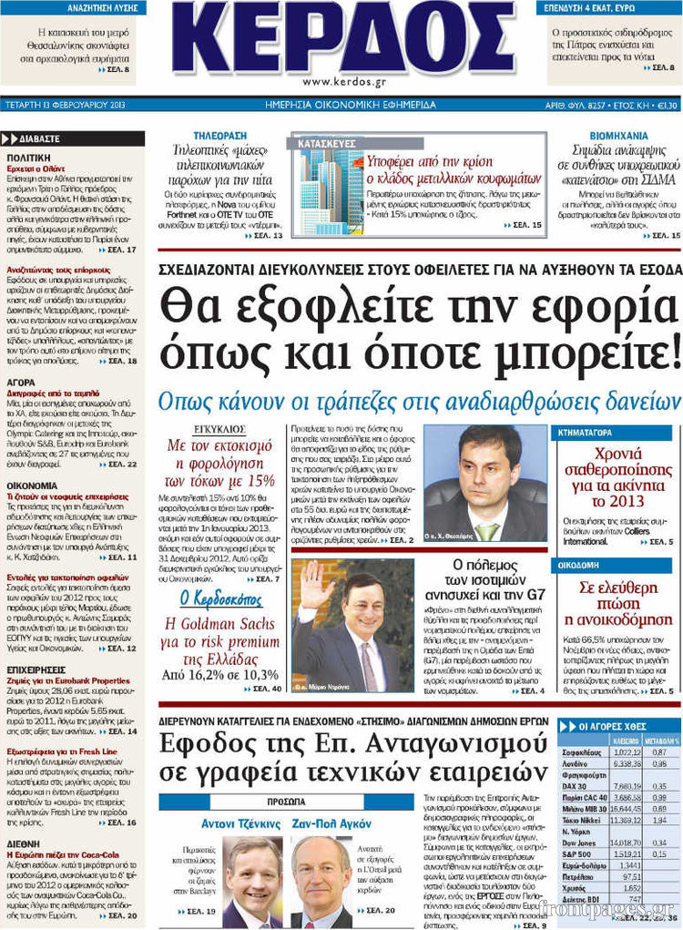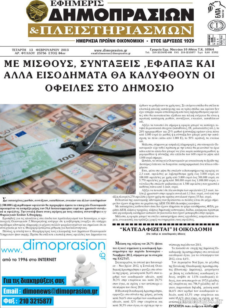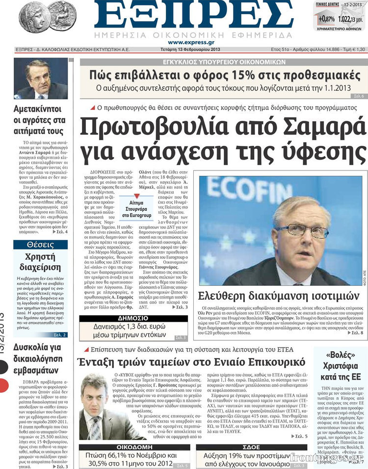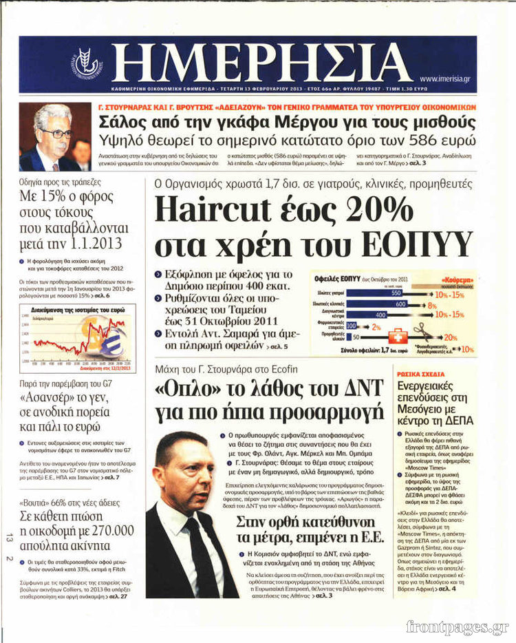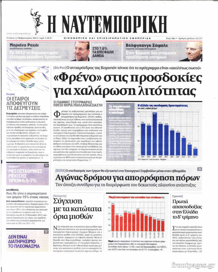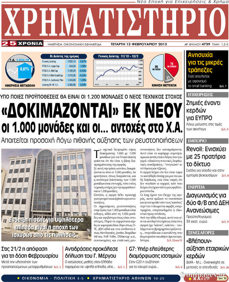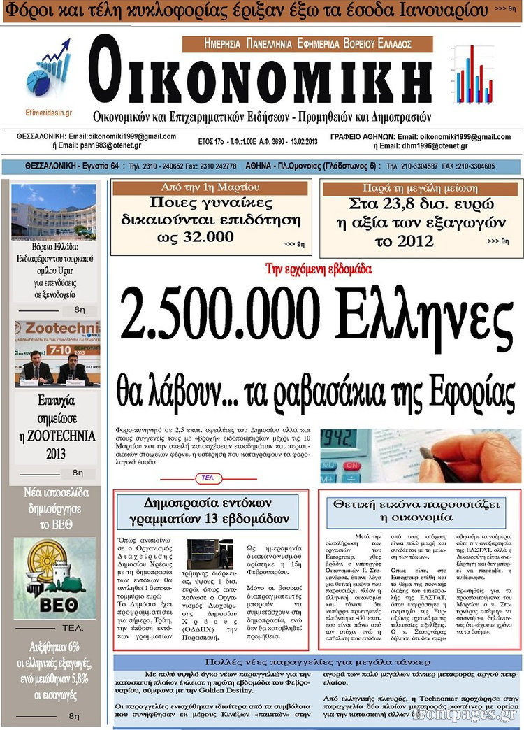 Οι οικονομικές εφημερίδες Enikos Newsroom 08:25, Τετάρτη 13 Φεβρουαρίου 2013 Media Οι οικονομικές εφημερίδες ΕΦΗΜΕΡΙΔΕΣ ΟΙΚΟΝΟΜΙΚΕΣ ΕΦΗΜΕΡΙΔΕΣ ΠΡΩΤΟΣΕΛΙΔΑ Μοιράσου το: σχολίασε κι εσύ (0 σχόλια) Ακολουθήστε το enikos.gr στο Google News και μάθετε πρώτοι όλες τις ειδήσεις Δείτε όλες τις τελευταίες ειδήσεις από την Ελλάδα και τον Κόσμο στο enikos.gr Ειδήσεις Ροή Ειδήσεων 8 ώρες πριν Μακελειό στο Σίδνεϊ: Πατέρας και γιος οι δράστες της τρομοκρατικής επίθεσης – Γιατί η Αυστραλία βάζει στο στόχαστρο το Ιράν 9 ώρες πριν Μακελειό στην Αυστραλία: «Πέρασαν οι σφαίρες πάνω από το αυτοκίνητο» – Συγκλονίζει η μαρτυρία Έλληνα που ζει στο Σίδνεϊ 7 ώρες πριν Τρομοκρατική επίθεση στο Σίδνεϊ: «Το αναπόφευκτο συνέβη πλέον» – Πώς οι δράστες είχαν χάσει τον ανθρωπισμό τους πριν πατήσουν την σκανδάλη 7 ώρες πριν Όλα τα αιτήματα αγροτών, κτηνοτρόφων και μελισσοκόμων προς την κυβέρνηση – Παραμένουν στα μπλόκα και προαναγγέλλουν κλιμάκωση 11 ώρες πριν Λακωνία: Βίντεο ντοκουμέντο από την επιχείρηση διάσωσης της 13χρονης που έπεσε σε πηγάδι – Ποια ήταν τα πρώτα λόγια της 55 λεπτά πριν Οπτική ψευδαίσθηση: Μόνο το 1% των ανθρώπων θα βρει το ψάρι σε 12 δευτερόλεπτα 1 ώρα πριν Διατροφή: Γιατρός προειδοποιεί για 2 απλά λάθη που αυξάνουν τον κίνδυνο χρόνιων παθήσεων 2 ώρες πριν Τα ζώδια σήμερα, Δευτέρα 15 Δεκεμβρίου: Ιχθύες, ξεκινήστε από εκεί που η παρουσία σας έχει σημασία 9 ώρες πριν Ύπνος: 5 λόγοι για τους οποίους ξυπνάτε κουρασμένοι το πρωί κατά τη διάρκεια του χειμώνα 5 λεπτά πριν Εορτολόγιο: Ποιοι γιορτάζουν σήμερα 15 Δεκεμβρίου 11 λεπτά πριν ΔΕΔΔΗΕ: Διακοπές ρεύματος σήμερα (15/12) στην Αθήνα και σε άλλες 9 περιοχές της Αττικής 17 λεπτά πριν Λος Άντζελες: Νεκροί στο σπίτι τους εντοπίστηκαν ο σκηνοθέτης, Ρομπ Ράινερ και η σύζυγός του 23 λεπτά πριν ΦΠΑ: Αυξάνεται κατά 57% ο αριθμός των ελέγχων για παράνομες επιστροφές και απάτες – Πού θα δοθεί προτεραιότητα 32 λεπτά πριν Γουατεμάλα: Βίαιες συγκρούσεις με νεκρούς στην περιοχή των αυτόχθονων ENIKOS NETWORK Την Κυριακή με τη Realnews: Δωροεπιταγή 10€ Μόνο το 5% με όραση 20/20 μπορεί να βρει το σκουλήκι ανάμεσα στα πουλιά μέσα σε 7 δευτερόλεπτα Τέλος οι διώξεις για χρέη σε Εφορία και ΕΦΚΑ – Τι προβλέπει νέα διάταξη μετά την πτώχευση Υπουργείο Αγροτικής Ανάπτυξης: Ενισχύσεις de minimis ύψους 2,1 εκατ. ευρώ – Οι δικαιούχοι Σύγχρονος Νοστράδαμος: Προειδοποιεί για «μεγάλο γεγονός» τους επόμενους μήνες που θα συγκλονίσει τη Βρετανία και τον κόσμο Τεστ παρατηρητικότητας: Μπορείτε να βρείτε τις 3 διαφορές στις εικόνες με έναν πιγκουίνο σε 14 δευτερόλεπτα περισσότερα 05:49 , Δευτέρα 15 Δεκεμβρίου 2025 Οι οικονομικές εφημερίδες 15/12/2025 Διαβάστε τα πρωτοσέλιδα από τις οικονομικές εφημερίδες, σήμερα 15/12/2025. 05:43 , Δευτέρα 15 Δεκεμβρίου 2025 Οι αθλητικές εφημερίδες 15/12/2025 Διαβάστε τα πρωτοσέλιδα από τις αθλητικές εφημερίδες, σήμερα 15/12/2025. 05:38 , Δευτέρα 15 Δεκεμβρίου 2025 Οι πολιτικές εφημερίδες 15/12/2025 Διαβάστε τα πρωτοσέλιδα από τις πολιτικές εφημερίδες, σήμερα 15/12/2025. 21:34 , Κυριακή 14 Δεκεμβρίου 2025 Ο Δικαστής: Η Λέττα είναι αποφασισμένη να αποκαλύψει την αλήθεια για το τροχαίο, απόψε στις 21:45 στον ΑΝΤ1 Ραγδαίες οι εξελίξεις στο νέο επεισόδιο της σειράς “Ο Δικαστής” απόψε στις 21:45 σ... ΤΕΛΕΥΤΑΙΕΣ ΕΙΔΗΣΕΙΣ 5 λεπτά πριν Εορτολόγιο: Ποιοι γιορτάζουν σήμερα 15 Δεκεμβρίου 11 λεπτά πριν ΔΕΔΔΗΕ: Διακοπές ρεύματος σήμερα (15/12) στην Αθήνα και... 17 λεπτά πριν Λος Άντζελες: Νεκροί στο σπίτι τους εντοπίστηκαν ο... 23 λεπτά πριν Φ