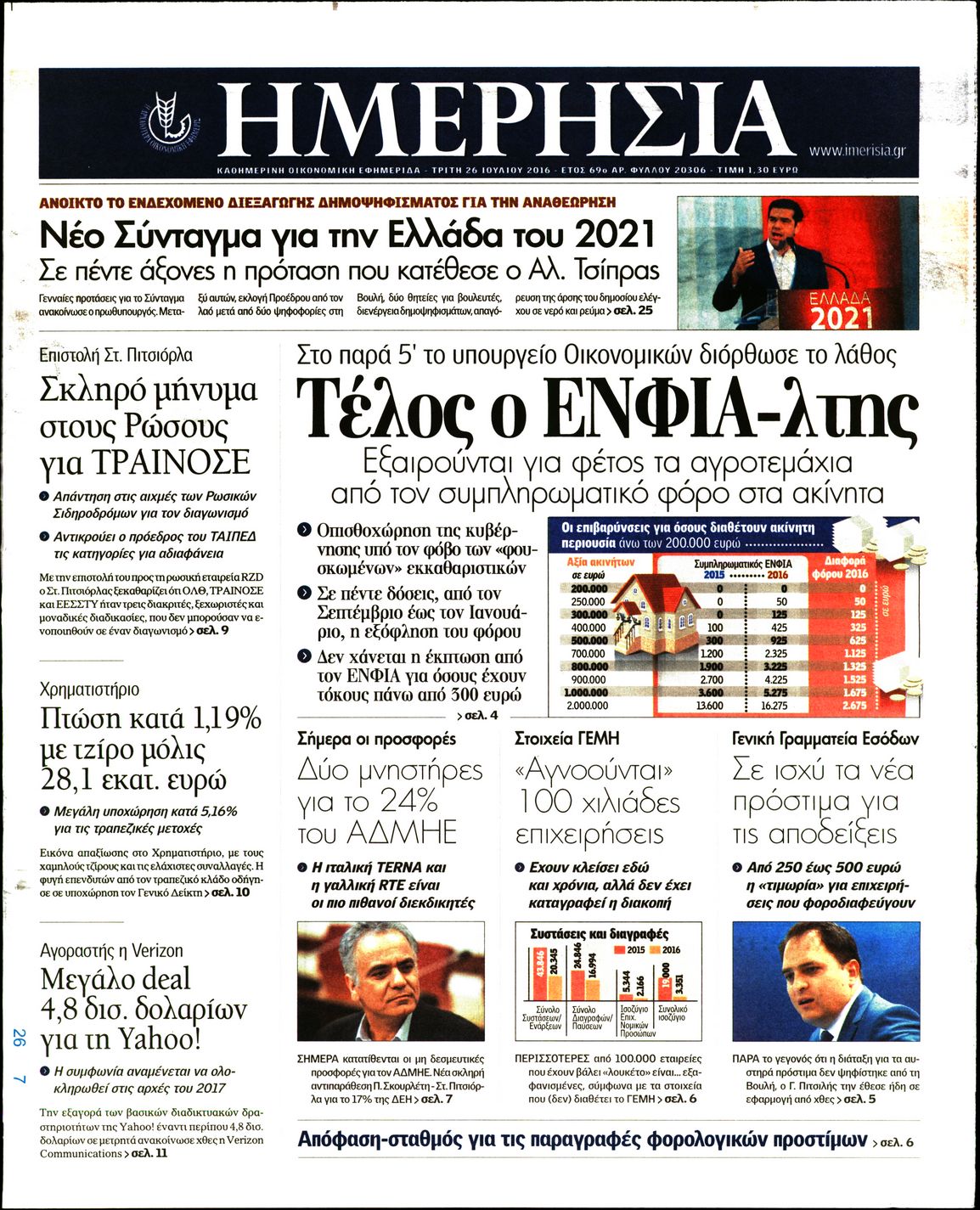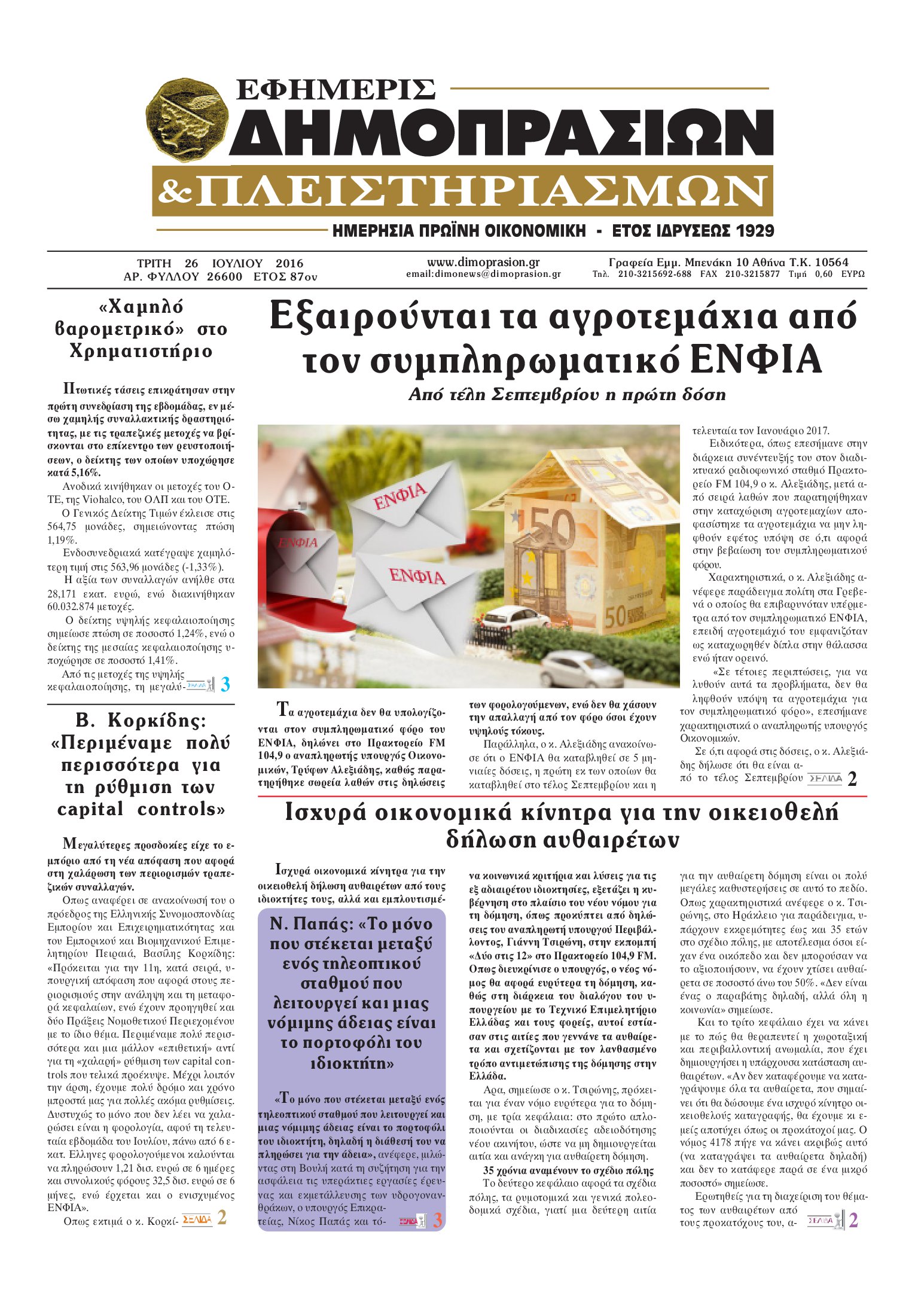 Oι οικονομικές εφημερίδες 26/7/2016 Enikos Newsroom 06:07, Τρίτη 26 Ιουλίου 2016 Media Διαβάστε τα σημερινά πρωτοσέλιδα των οικονομικών εφημερίδων: ΟΙΚΟΝΟΜΙΚΕΣ ΕΦΗΜΕΡΙΔΕΣ ΠΡΩΤΟΣΕΛΙΔΑ Μοιράσου το: σχολίασε κι εσύ (0 σχόλια) Ακολουθήστε το enikos.gr στο Google News και μάθετε πρώτοι όλες τις ειδήσεις Δείτε όλες τις τελευταίες ειδήσεις από την Ελλάδα και τον Κόσμο στο enikos.gr Ειδήσεις Ροή Ειδήσεων 59 λεπτά πριν Φοροδιαφυγή: Ποιοι φορολογούμενοι κινδυνεύουν να πληρώσουν «τσουχτερά» πρόστιμα 21 λεπτά πριν Φοινικούντα: Παραδόθηκε 30χρονος στην Καλαμάτα για τη διπλή δολοφονία 37 λεπτά πριν Αγρότες: Ανυποχώρητοι στα μπλόκα – Στις Σέρρες σήμερα η κρίσιμη συνεδρίαση της Πανελλαδικής Επιτροπής 49 λεπτά πριν Τα επίσημα χρονοδιαγράμματα που η Τουρκία θα παραλάβει τα Eurofighter 9 ώρες πριν «Θύελλα» αντιδράσεων για τον Νίκο Παππά μετά την επίθεση στον δημοσιογράφο Νίκο Γιαννόπουλο – Η μήνυση, οι δηλώσεις και η έξοδος από την ευρωομάδα του ΣΥΡΙΖΑ 2 ώρες πριν Καούρα: Το μπαχαρικό που είναι «εξίσου αποτελεσματικό» με την ομεπραζόλη, σύμφωνα με ειδικούς 3 ώρες πριν Τα ζώδια σήμερα, Πέμπτη 18 Δεκεμβρίου: Λέοντες, η καρδιά σας θέλει να εκφραστεί 2 ώρες πριν Οπτική ψευδαίσθηση: Μόνο οι πιο έξυπνοι άνθρωποι θα βρουν 7 ξωτικά 15 δευτερόλεπτα 23 ώρες πριν 20 χρόνια τα Χριστούγεννα ξεκινούν στα Public με μεγάλη ποικιλία σε δώρα! 3 λεπτά πριν Αλμπέρτο Εσκενάζυ: Το μεσημέρι το «τελευταίο αντίο» στο αποτεφρωτήριο της Ριτσώνας – Η απόφαση της οικογένειάς του 8 λεπτά πριν Τραγωδία στη Θεσσαλονίκη: Νεκρή η 57χρονη που παρασύρθηκε από αυτοκίνητο στον Εύοσμο 12 λεπτά πριν Ανακαλύφθηκαν σπάνια λυχνία λαδιού και μια γραφίδα 2.000 ετών 18 λεπτά πριν Την Κυριακή με τη Realnews: Δωροεπιταγή 10€ 21 λεπτά πριν Φοινικούντα: Παραδόθηκε 30χρονος στην Καλαμάτα για τη διπλή δολοφονία ENIKOS NETWORK Ουρική αρθρίτιδα: Μεγάλη μελέτη αποκαλύπτει τι μπορεί να προκαλεί τη νόσο Τι σημαίνει όταν ο σκύλος σας σάς φέρνει τυχαία αντικείμενα, σύμφωνα με εκπαιδεύτρια Οφειλές προς το Δημόσιο: «Φρένο» στα σενάρια για νέα ρύθμιση – Τι απαντά το υπουργείο Εθνικής Οικονομίας και Οικονομικών Φοροδιαφυγή: Ποιοι φορολογούμενοι κινδυνεύουν να πληρώσουν «τσουχτερά» πρόστιμα Χαρτογραφώντας το «σημείο χωρίς επιστροφή»: Για πρώτη φορά αποκαλύπτεται με λεπτομέρεια το ακανθώδες όριο της ατμόσφαιρας τ... Η Google καταργεί τη λειτουργία «dark web report» – Πώς θα μπορούν οι χρήστες να διαγράφουν τα δεδομένα τους περισσότερα 08:00 , Πέμπτη 18 Δεκεμβρίου 2025 Την Κυριακή με τη Realnews: Δωροεπιταγή 10€ Δωροεπιταγή αξίας 10€ για αγορές άνω των 60€ από τα πολυκαταστήματα FactoryOutlet H προσφορά ι... 07:50 , Πέμπτη 18 Δεκεμβρίου 2025 «Το σόι σου»: Backstage στα γυρίσματα για το εορταστικό επεισόδιο «Το σόι σου» φορά τα γιορτινά του για τα Χριστούγεννα και η Όλγα Λαφαζάνη, με την κάμερα του «... 07:36 , Πέμπτη 18 Δεκεμβρίου 2025 Οι αθλητικές μεταδόσεις 18/12/2025 – Πού θα δείτε τον αγώνα της ΑΕΚ με την Κραϊόβα για το Conference League Τα ματς ΑΕΚ – Ουνιβερσιτάτεα Κραϊόβα για το Conference League και Παναθηναϊκός – Χάποελ Τελ Αβ... 05:48 , Πέμπτη 18 Δεκεμβρίου 2025 Οι οικονομικές εφημερίδες 18/12/2025 Διαβάστε τα πρωτοσέλιδα από τις οικονομικές εφημερίδες, σήμερα 18/12/2025. ΤΕΛΕΥΤΑΙΕΣ ΕΙΔΗΣΕΙΣ 8 λεπτά πριν Τραγωδία στη Θεσσαλονίκη: Νεκρή η 57χρονη που... 12 λεπτά πριν Ανακαλύφθηκαν σπάνια λυχνία λαδιού και μια γραφίδα... 18 λεπτά πριν Την Κυριακή με τη Realnews: Δωροεπιταγή 10€ 21 λεπτά πριν Φοινικούντα: Παραδόθηκε 30χρονος στην Καλαμάτα για τη... 23 λεπτά πριν Έδεσσα